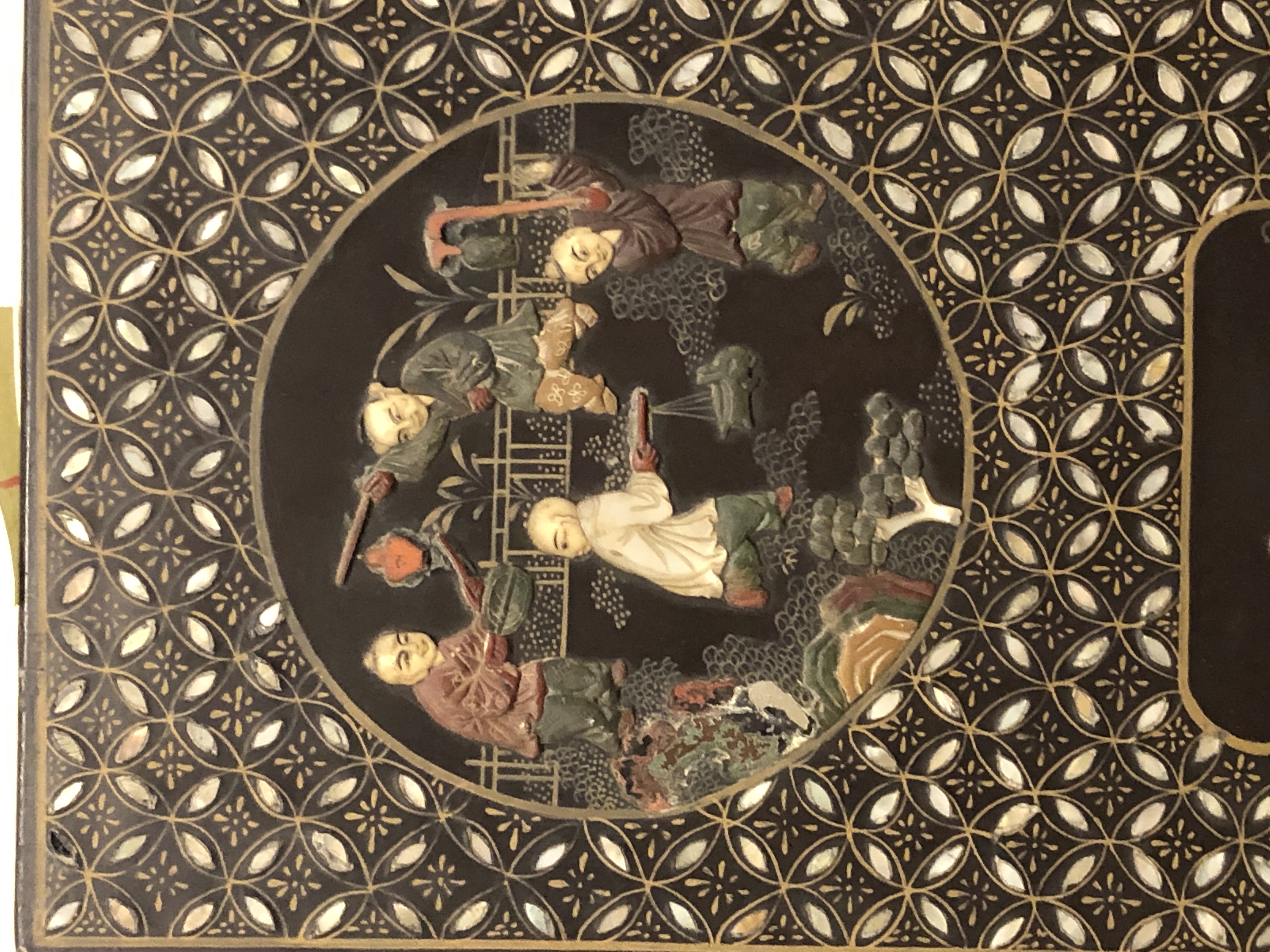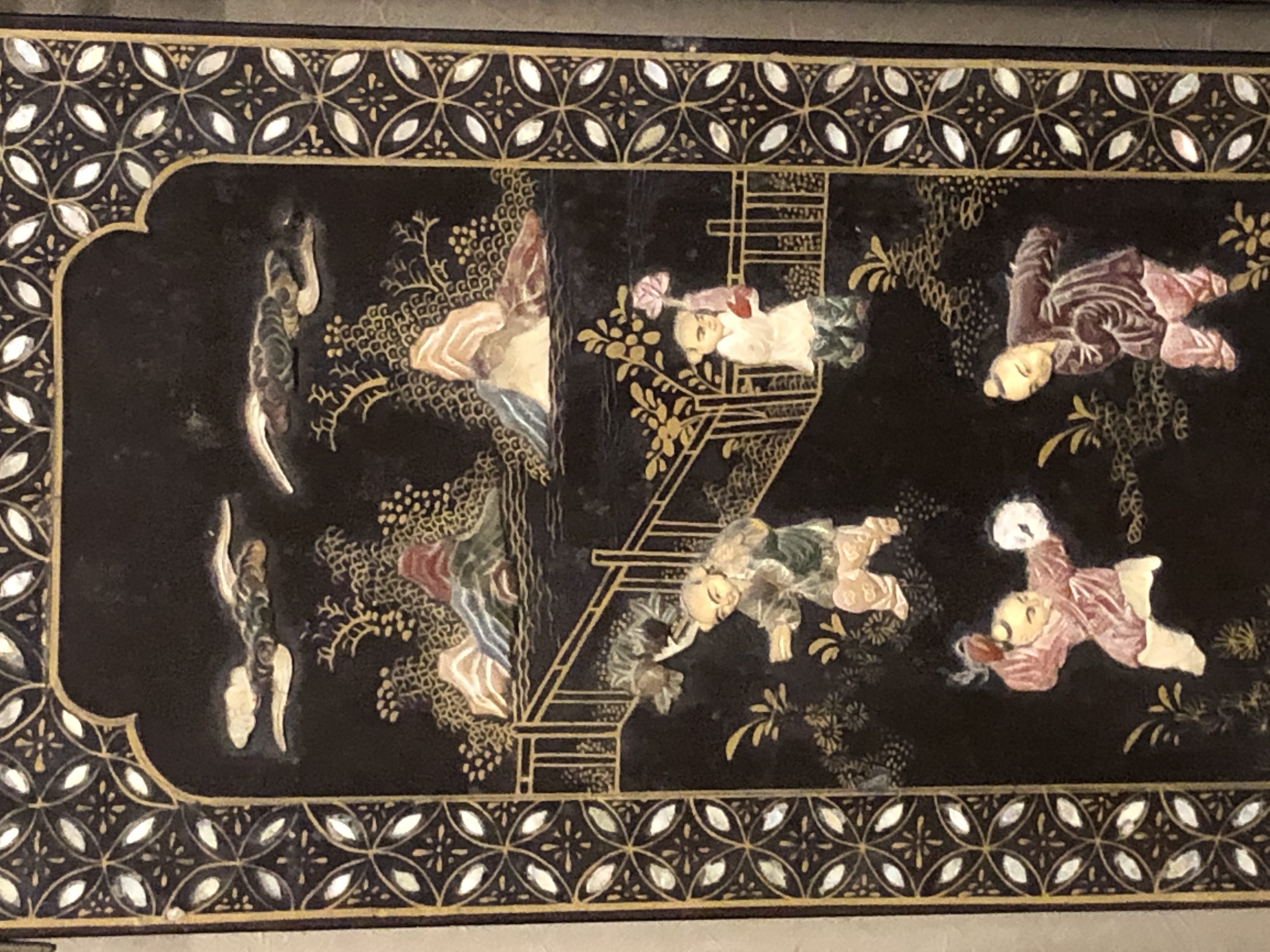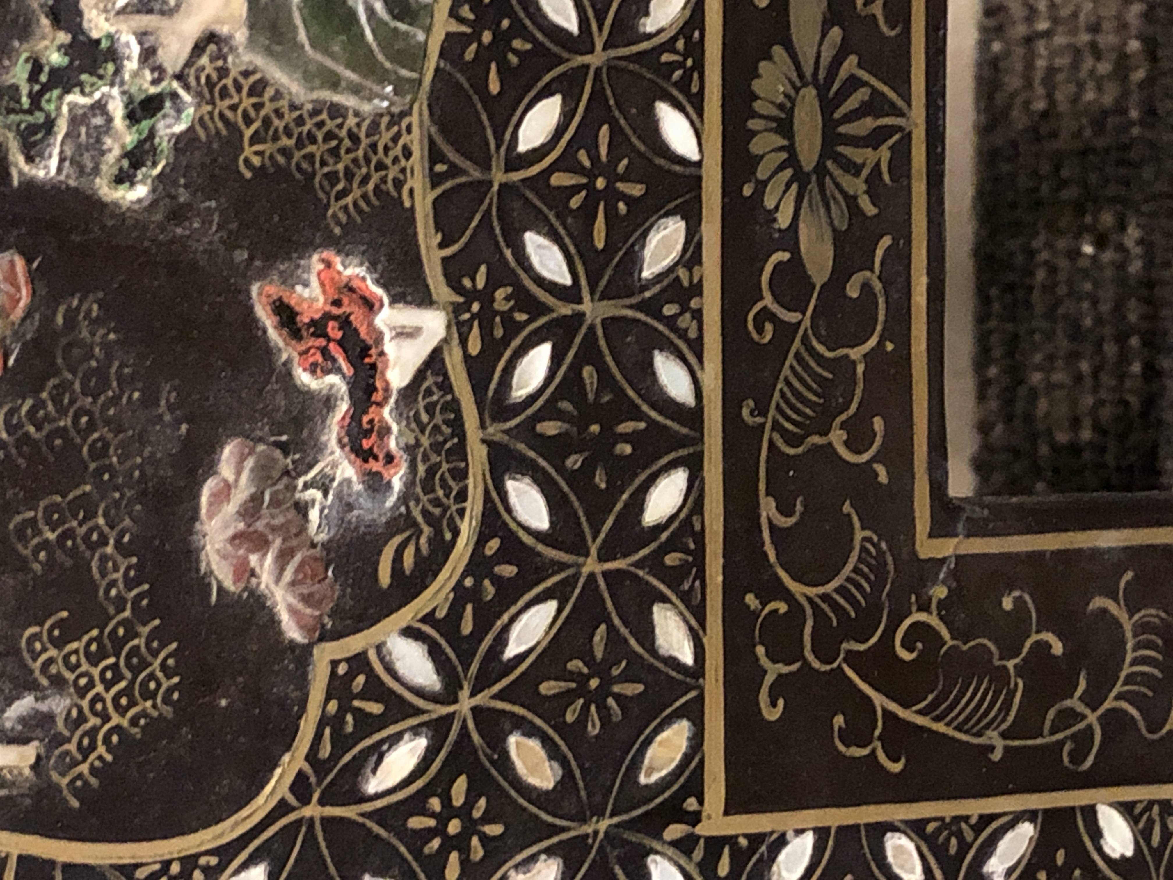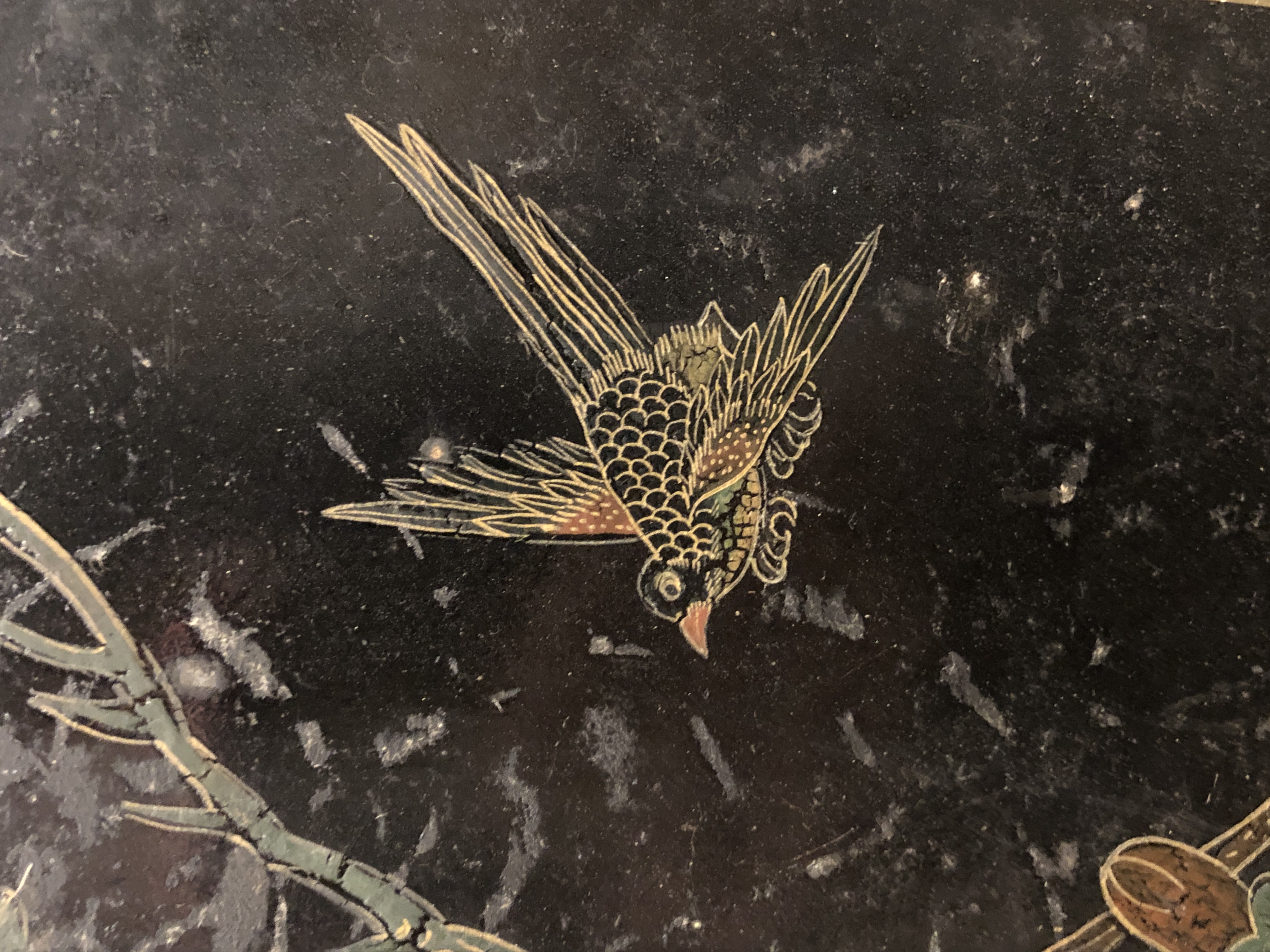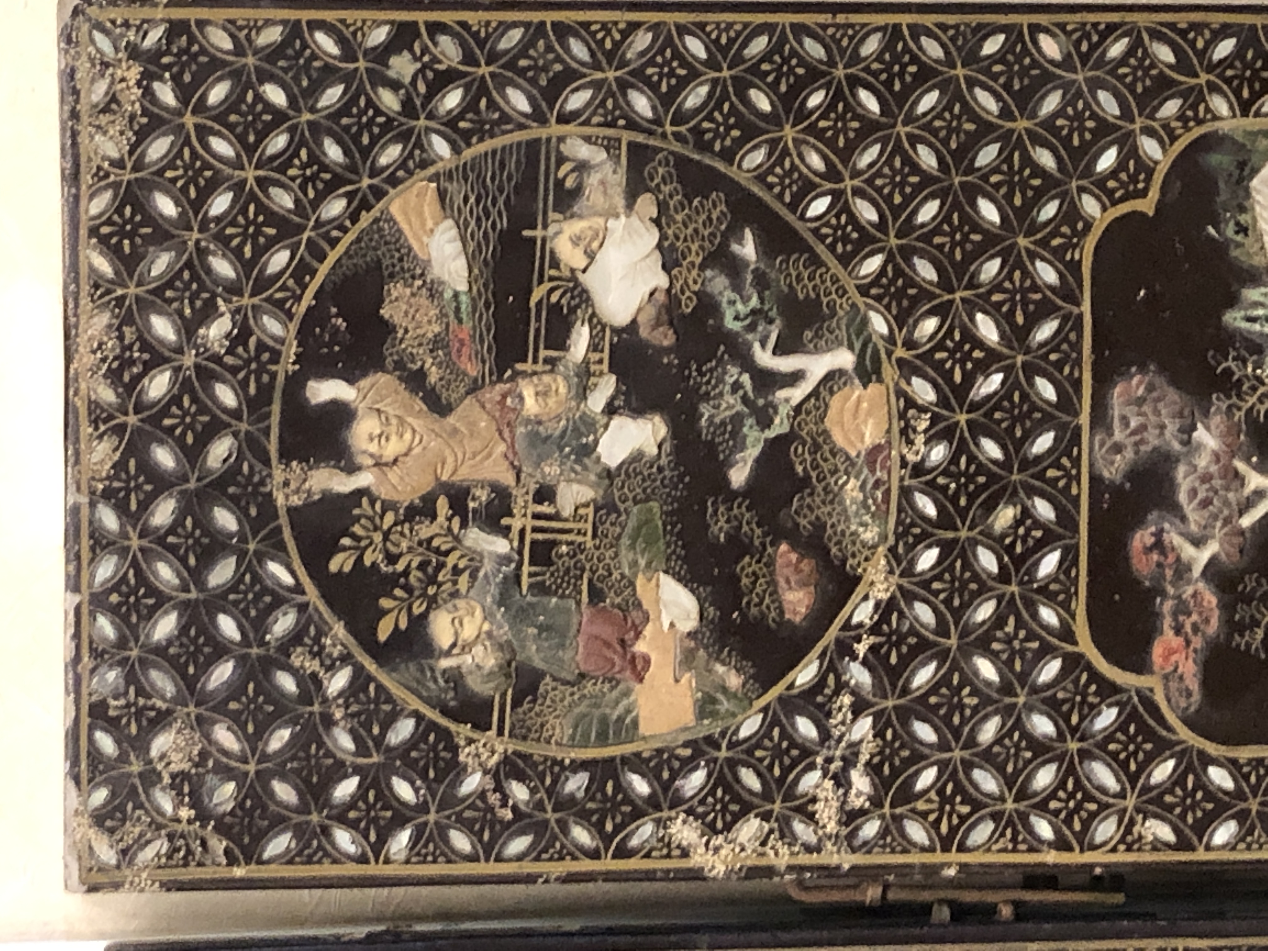 清代大漆彩绘描金十二扇桌瓶,屏风底漆为黑色打底用运彩绘花卉,金漆套边的画法,展现出各种花卉争奇斗艳的形态,画法娴熟,笔画流畅,颜色鲜艳夺目,两边框镶嵌彩贝,桌屏为晚清作品,可惜有些部位脱彩严重,从而影响了整个作品的品相,尽图片看这件作品还是有一定的观赏和收藏价值,