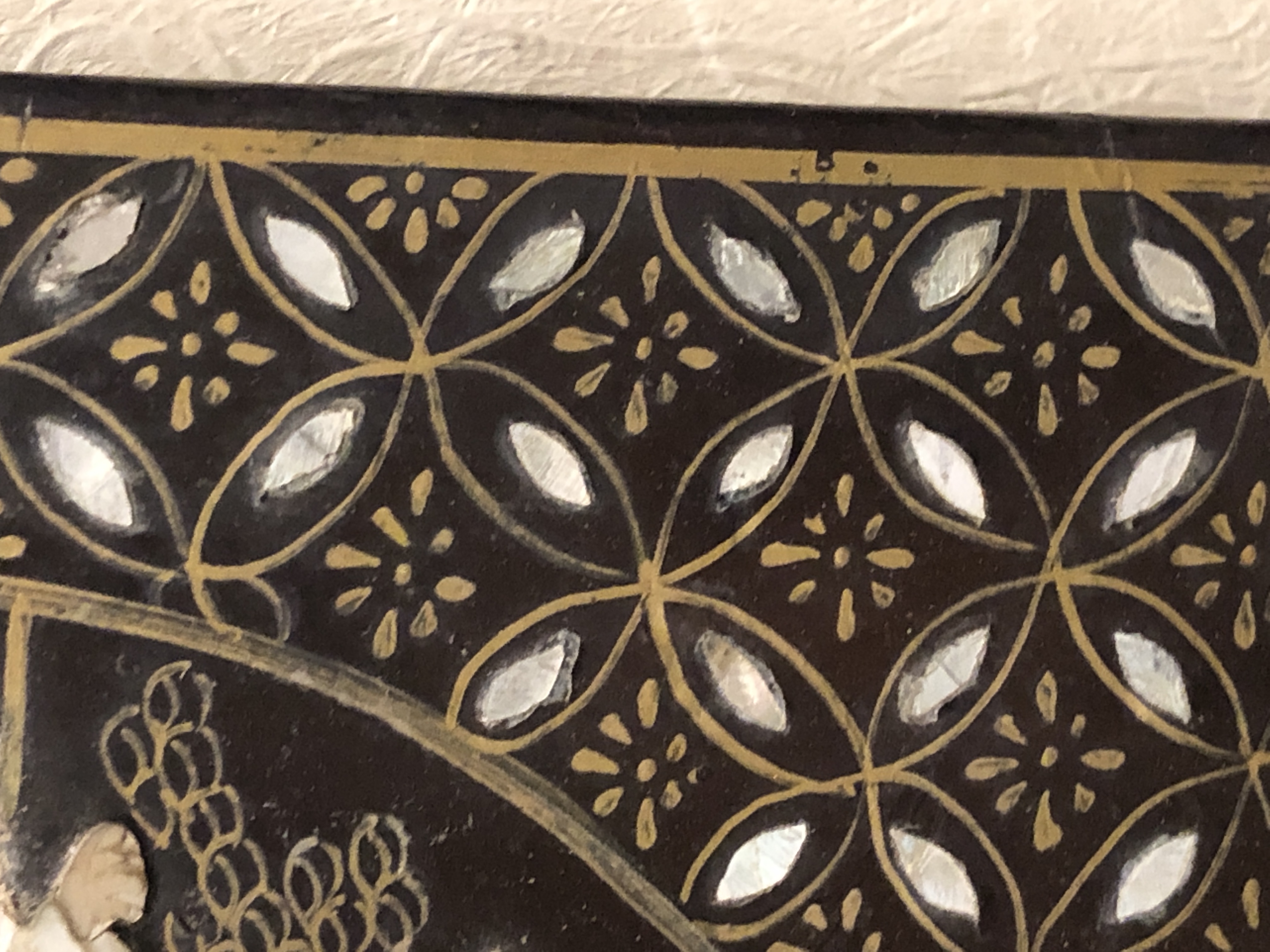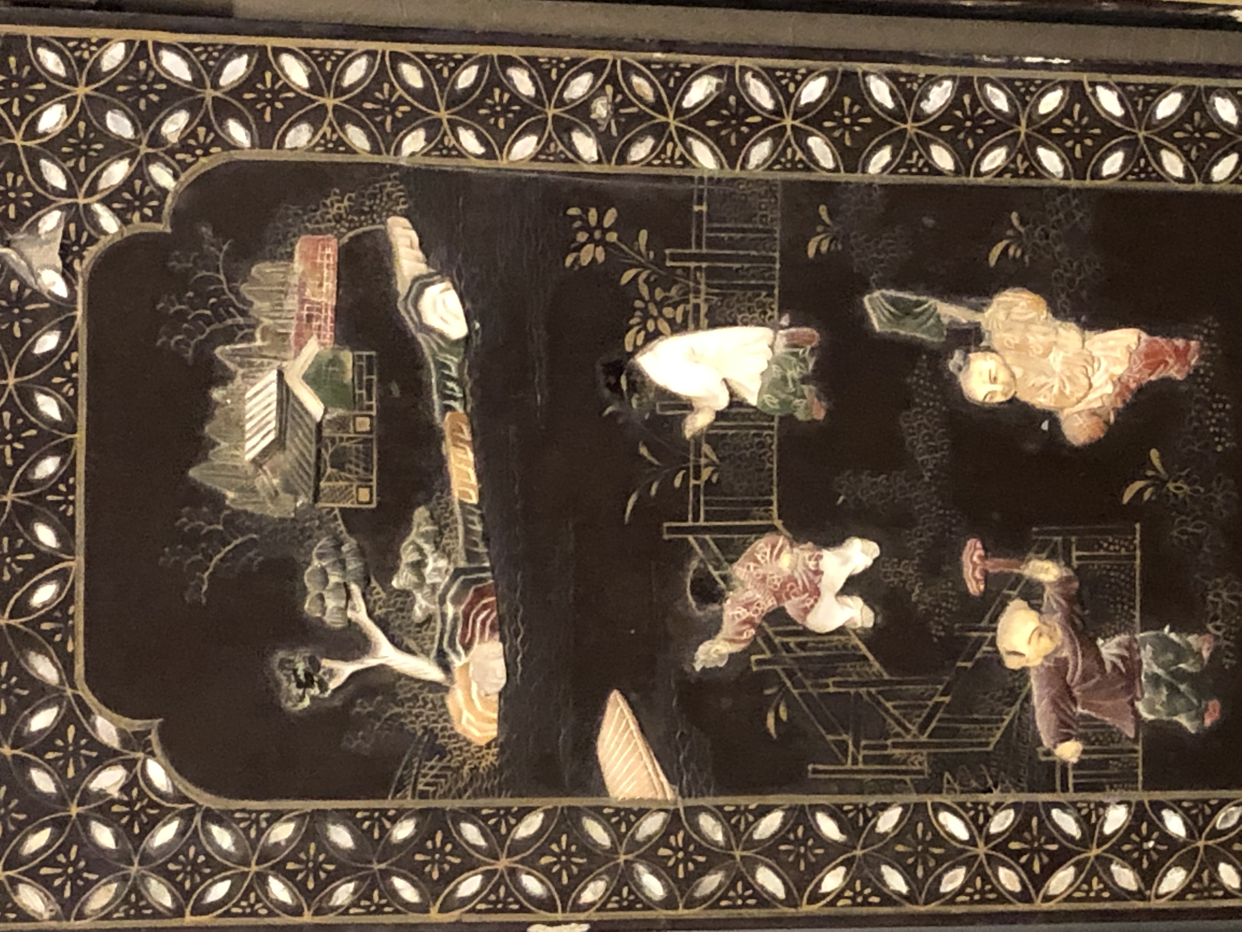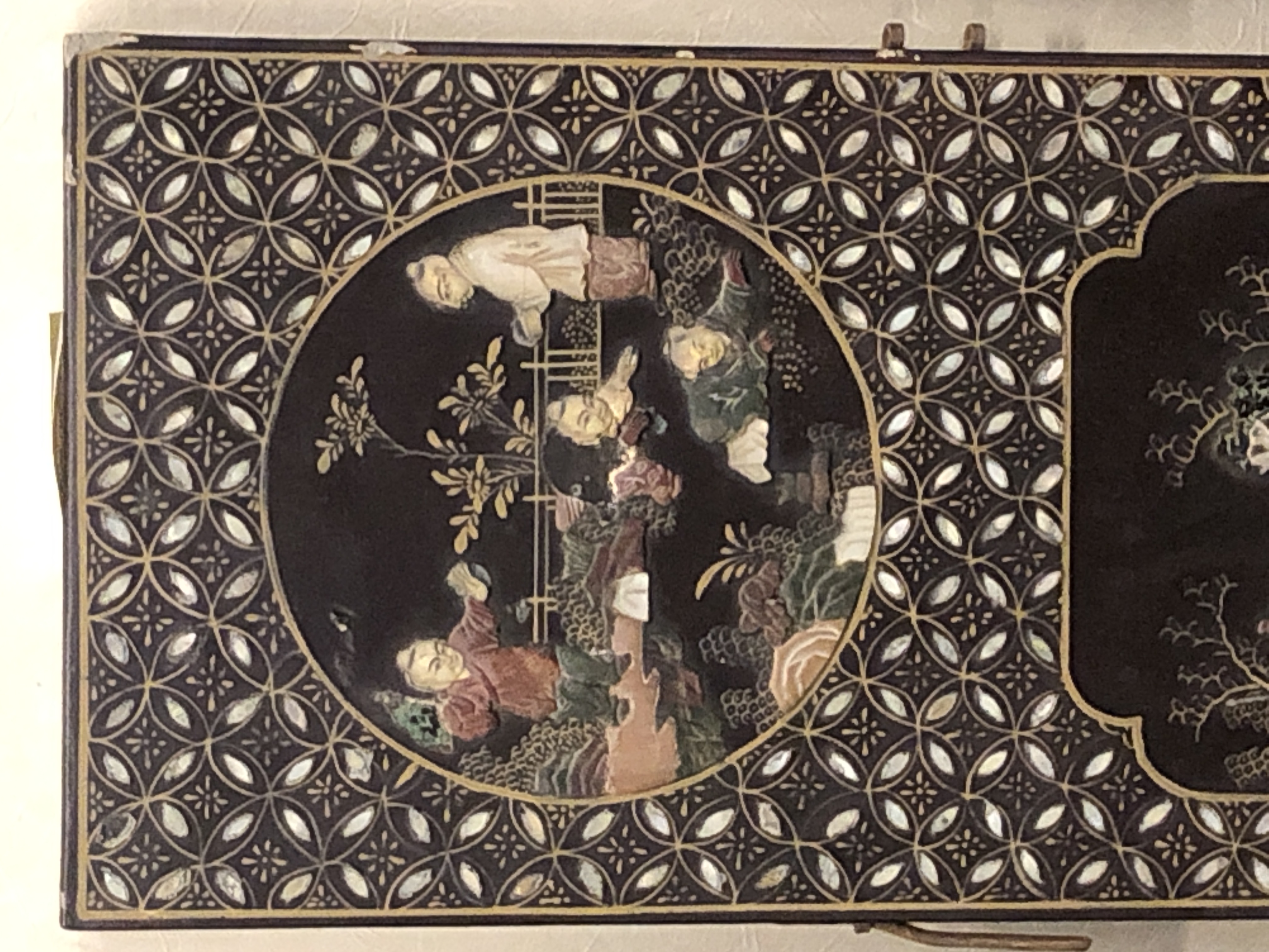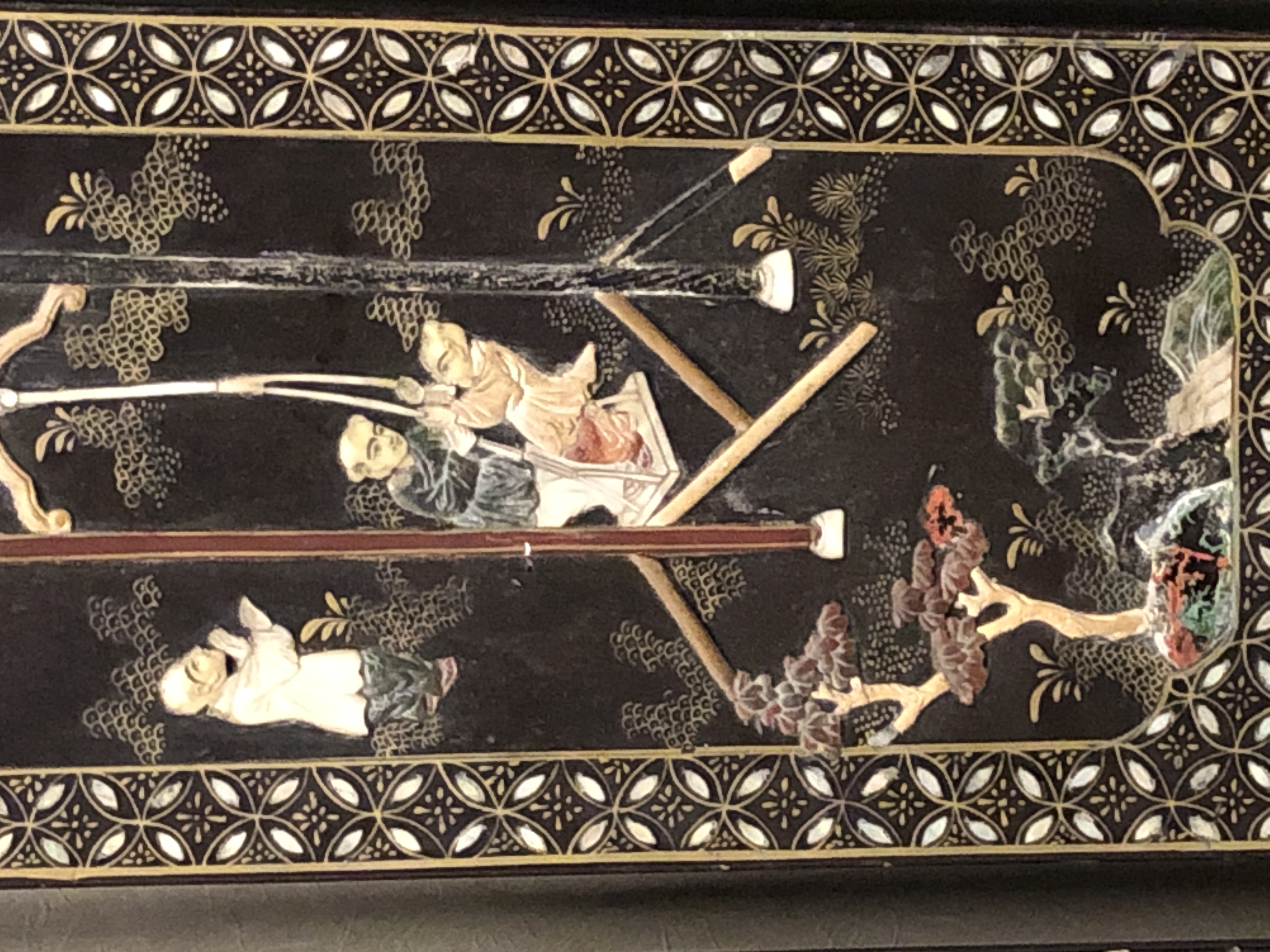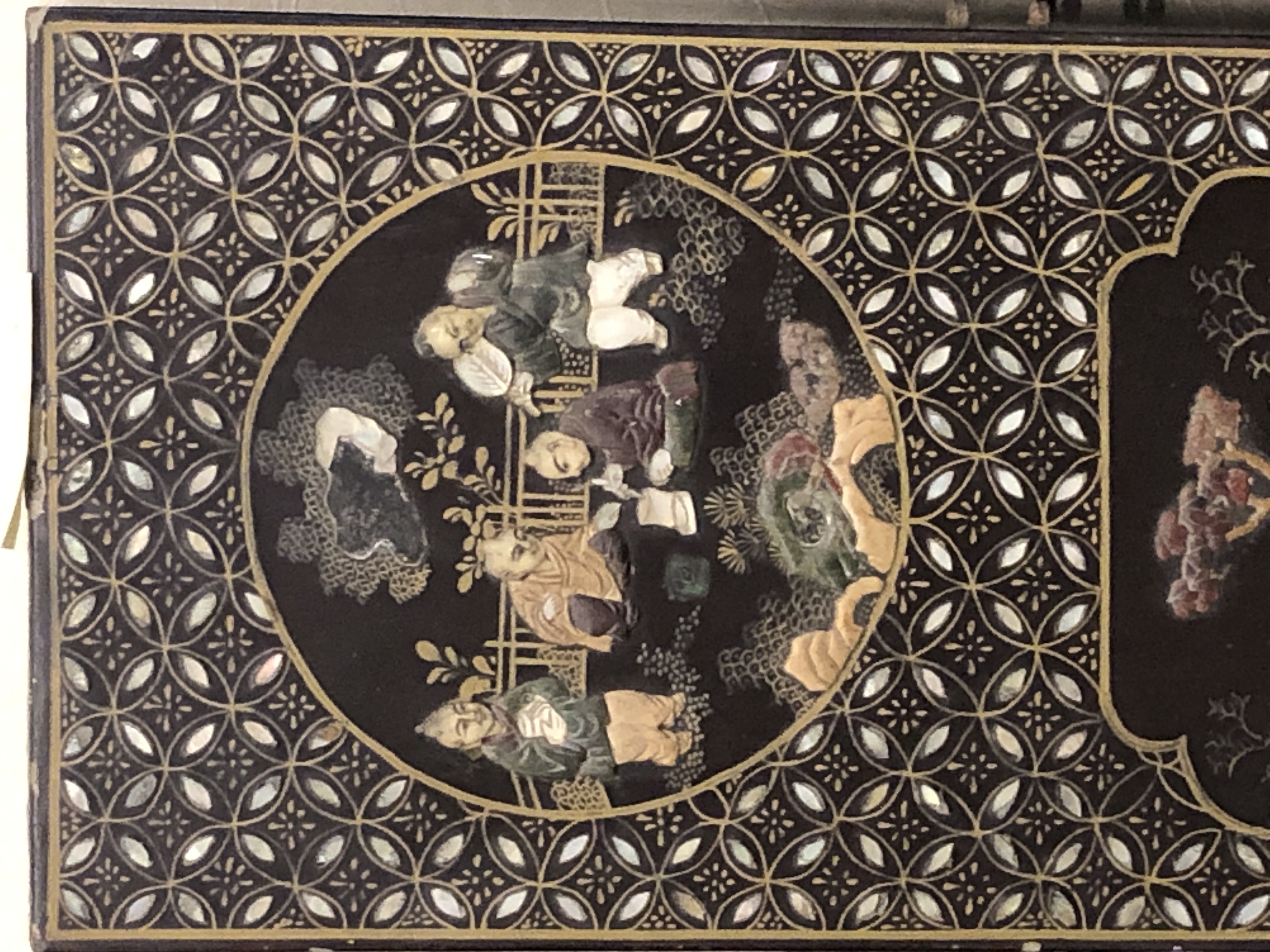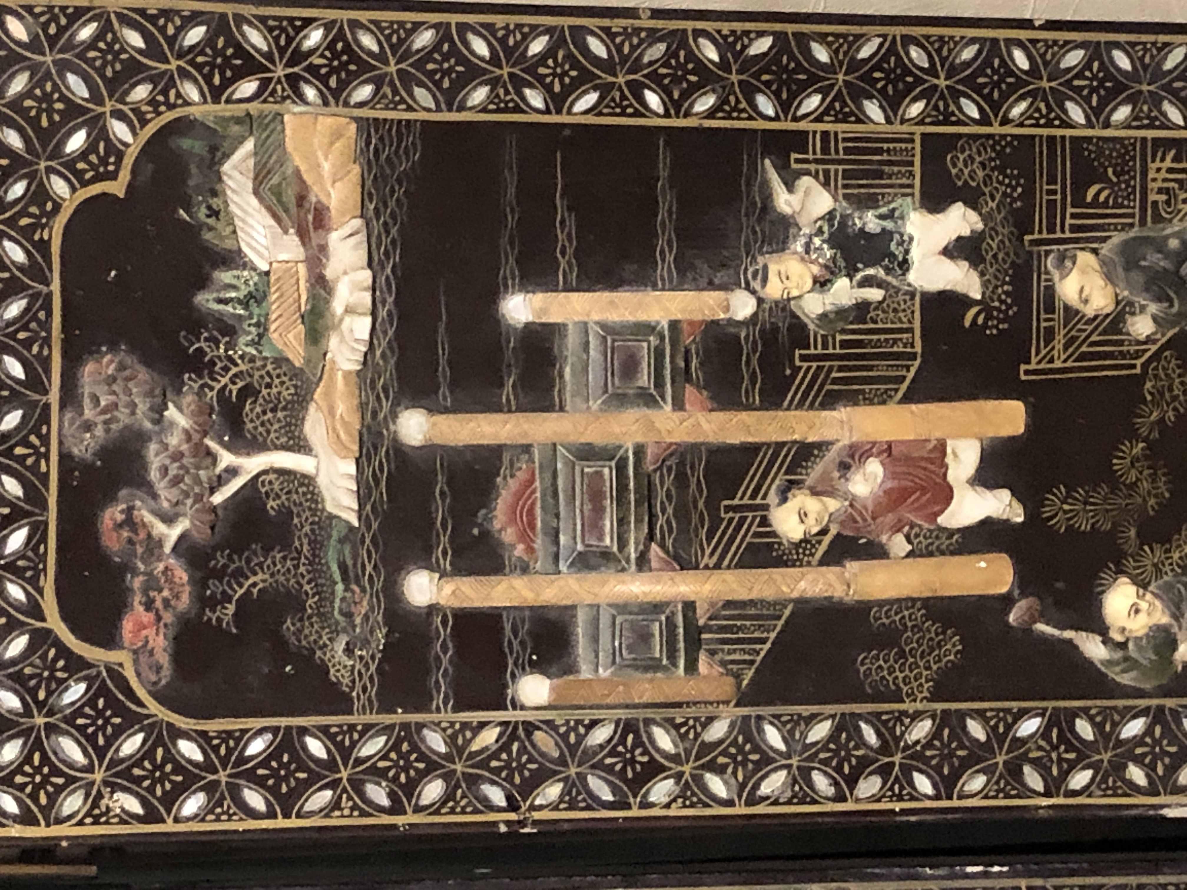 清代大漆彩绘描金十二扇桌瓶,屏风底漆为黑色打底用运彩绘花卉,金漆套边的画法,展现出各种花卉争奇斗艳的形态,画法娴熟,笔画流畅,颜色鲜艳夺目,两边框镶嵌彩贝,桌屏为晚清作品,可惜有些部位脱彩严重,从而影响了整个作品的品相,尽图片看这件作品还是有一定的观赏和收藏价值,