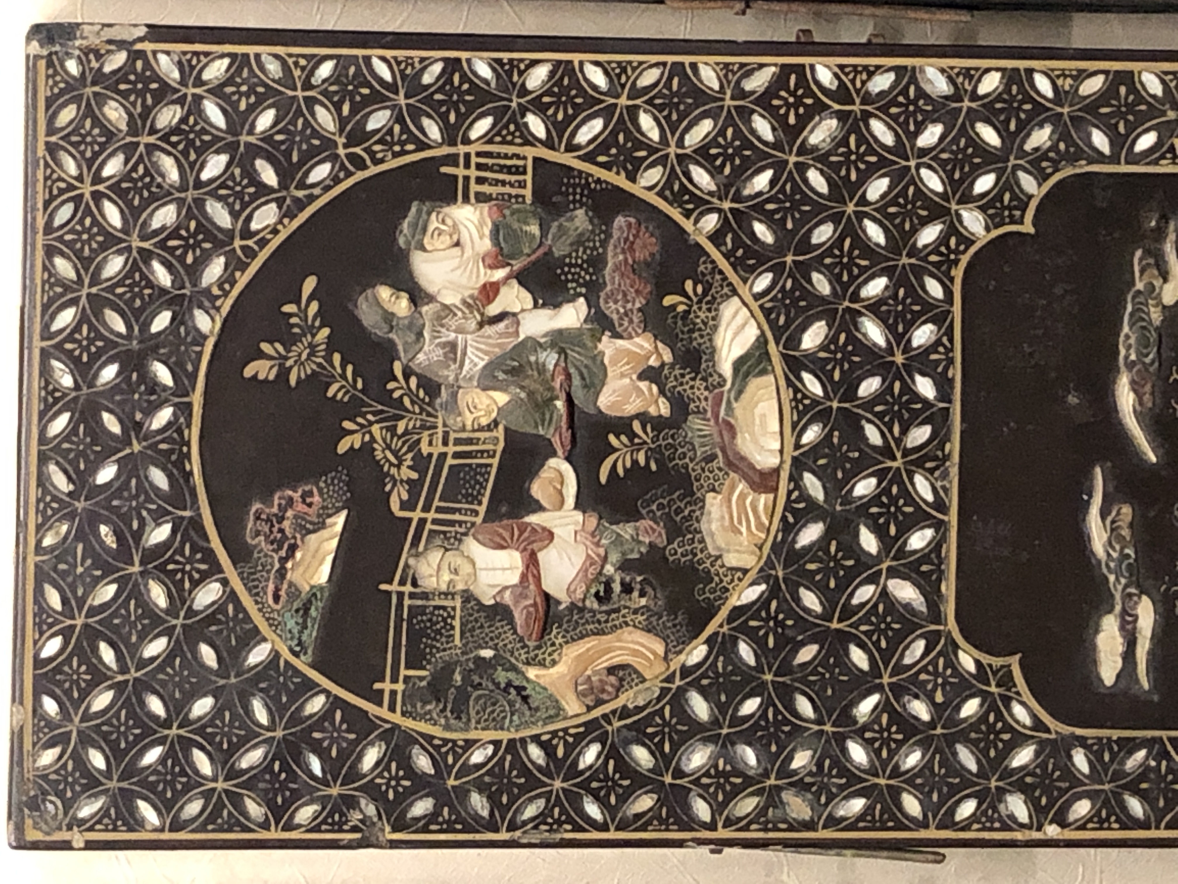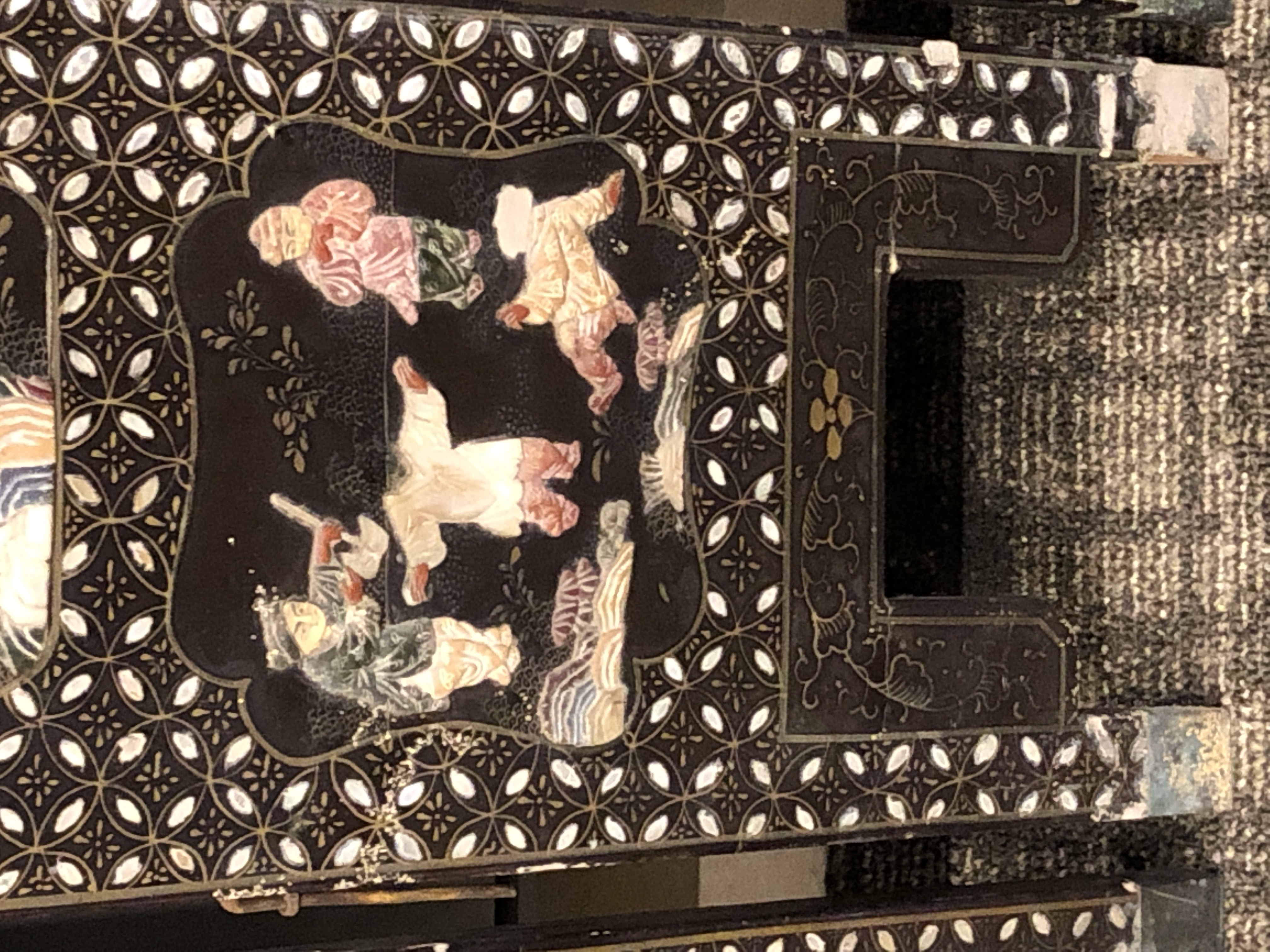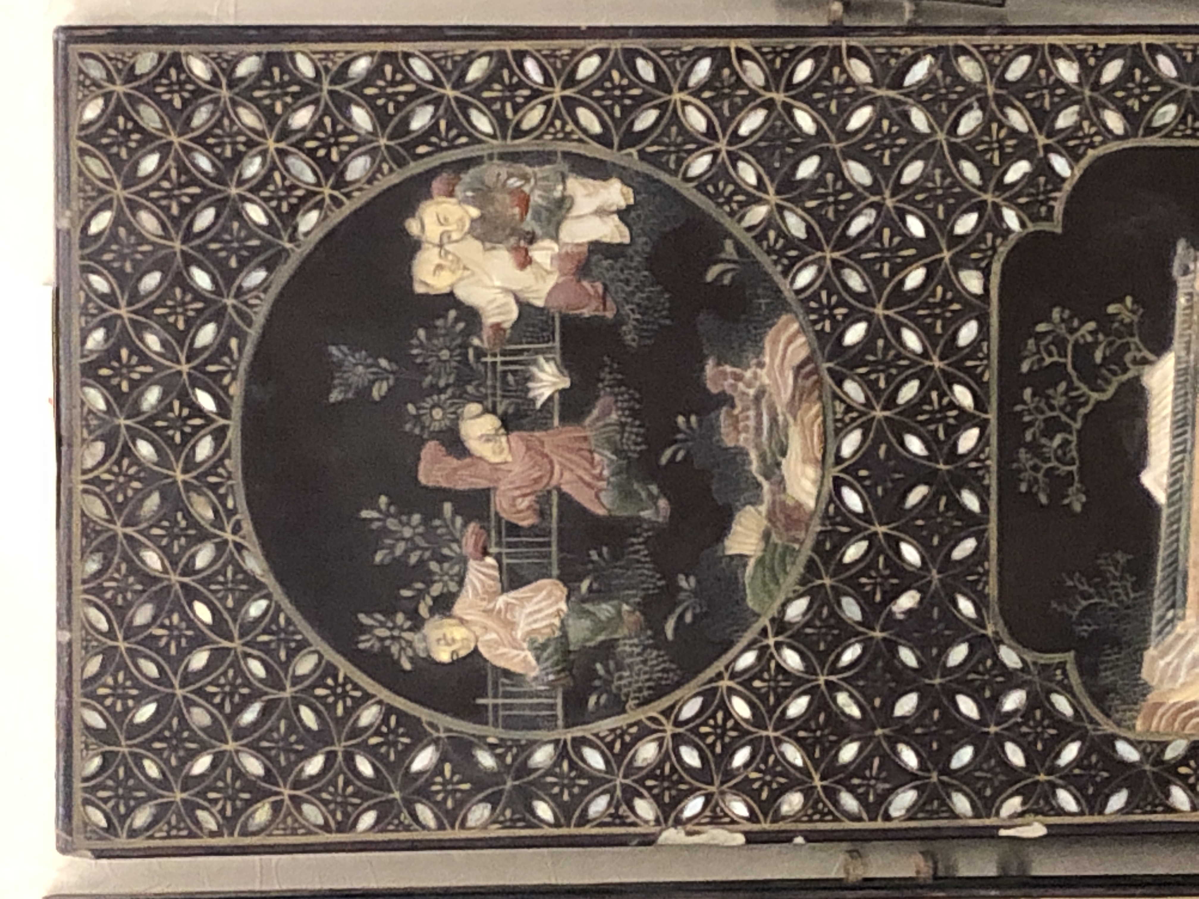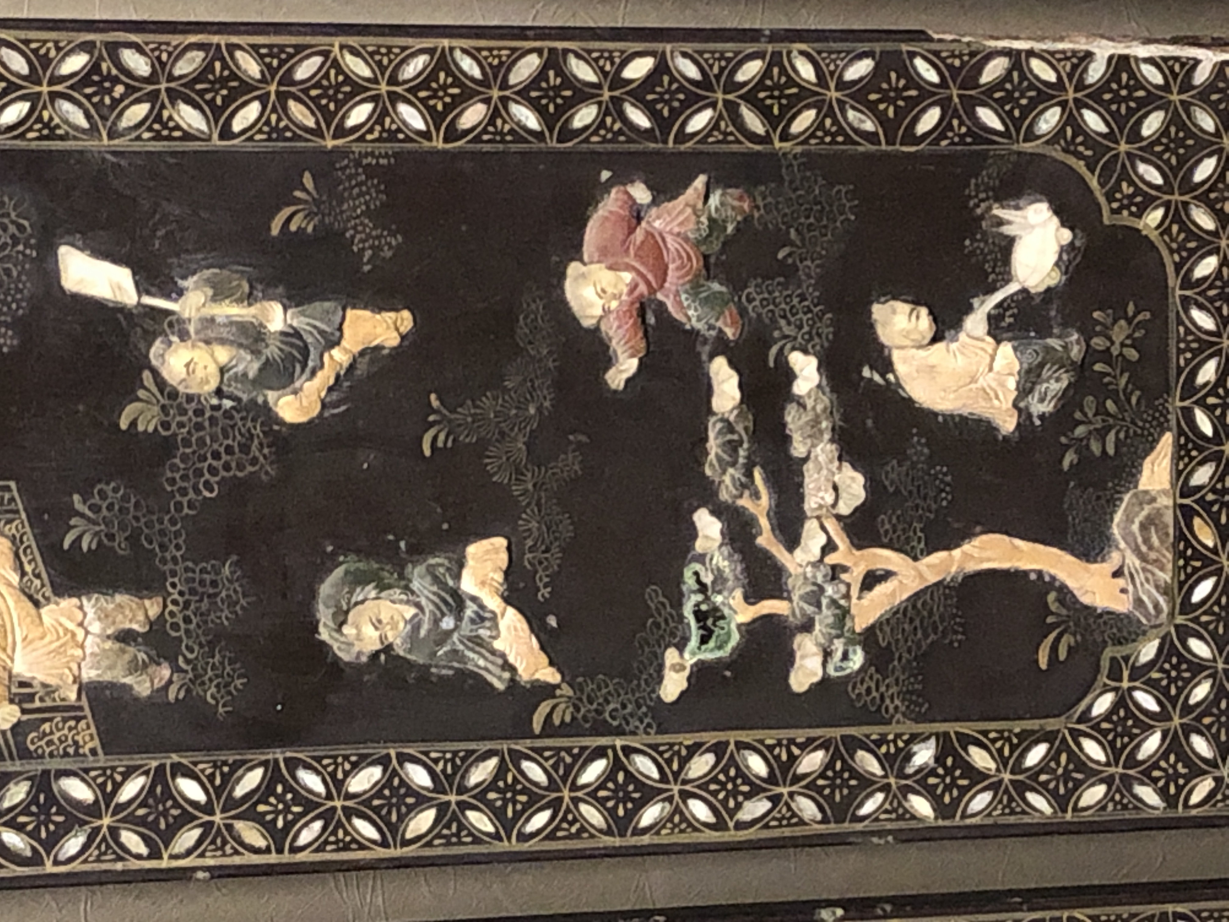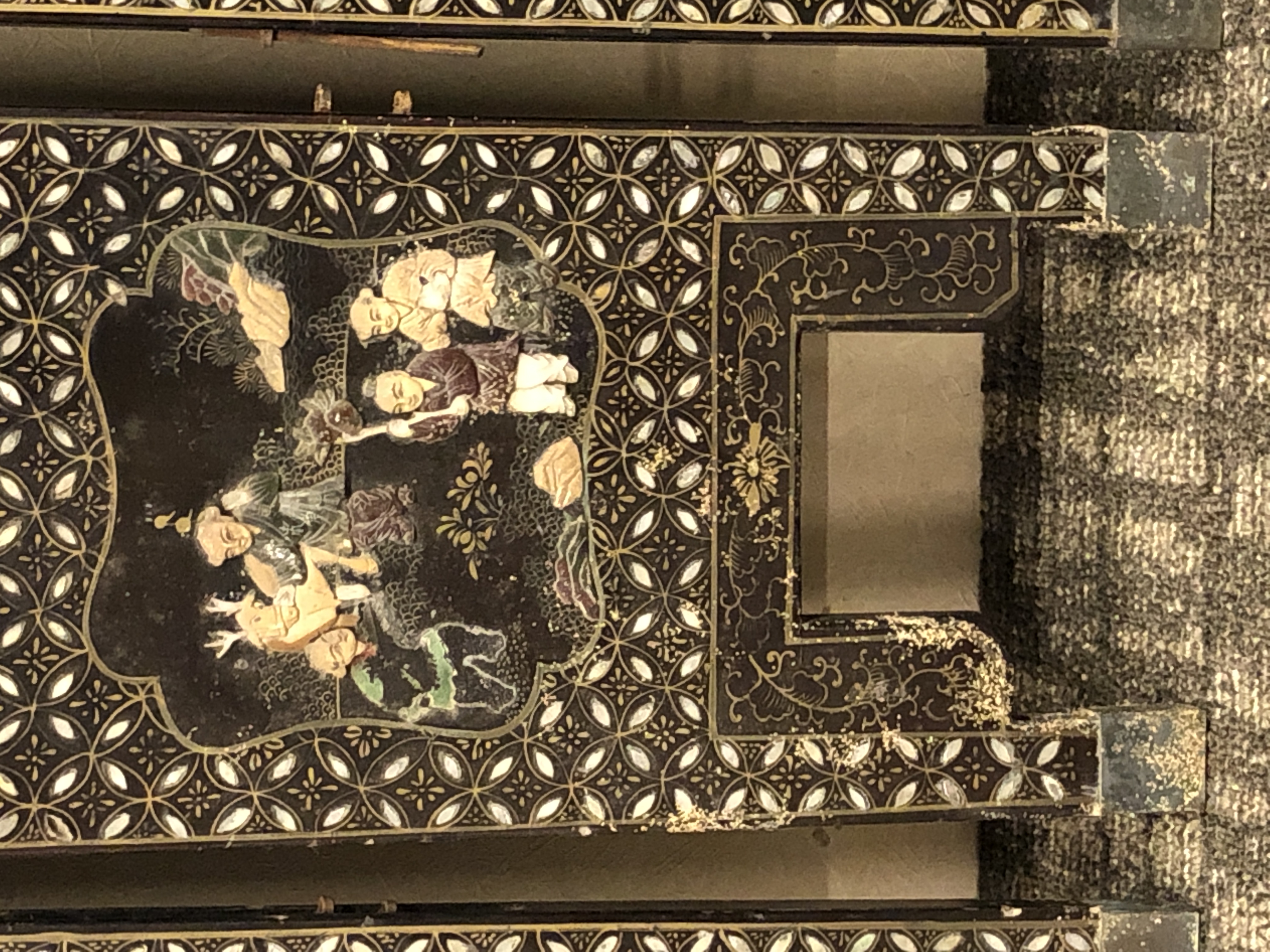 清代大漆彩绘描金十二扇桌瓶,屏风底漆为黑色打底用运彩绘花卉,金漆套边的画法,展现出各种花卉争奇斗艳的形态,画法娴熟,笔画流畅,颜色鲜艳夺目,两边框镶嵌彩贝,桌屏为晚清作品,可惜有些部位脱彩严重,从而影响了整个作品的品相,尽图片看这件作品还是有一定的观赏和收藏价值,