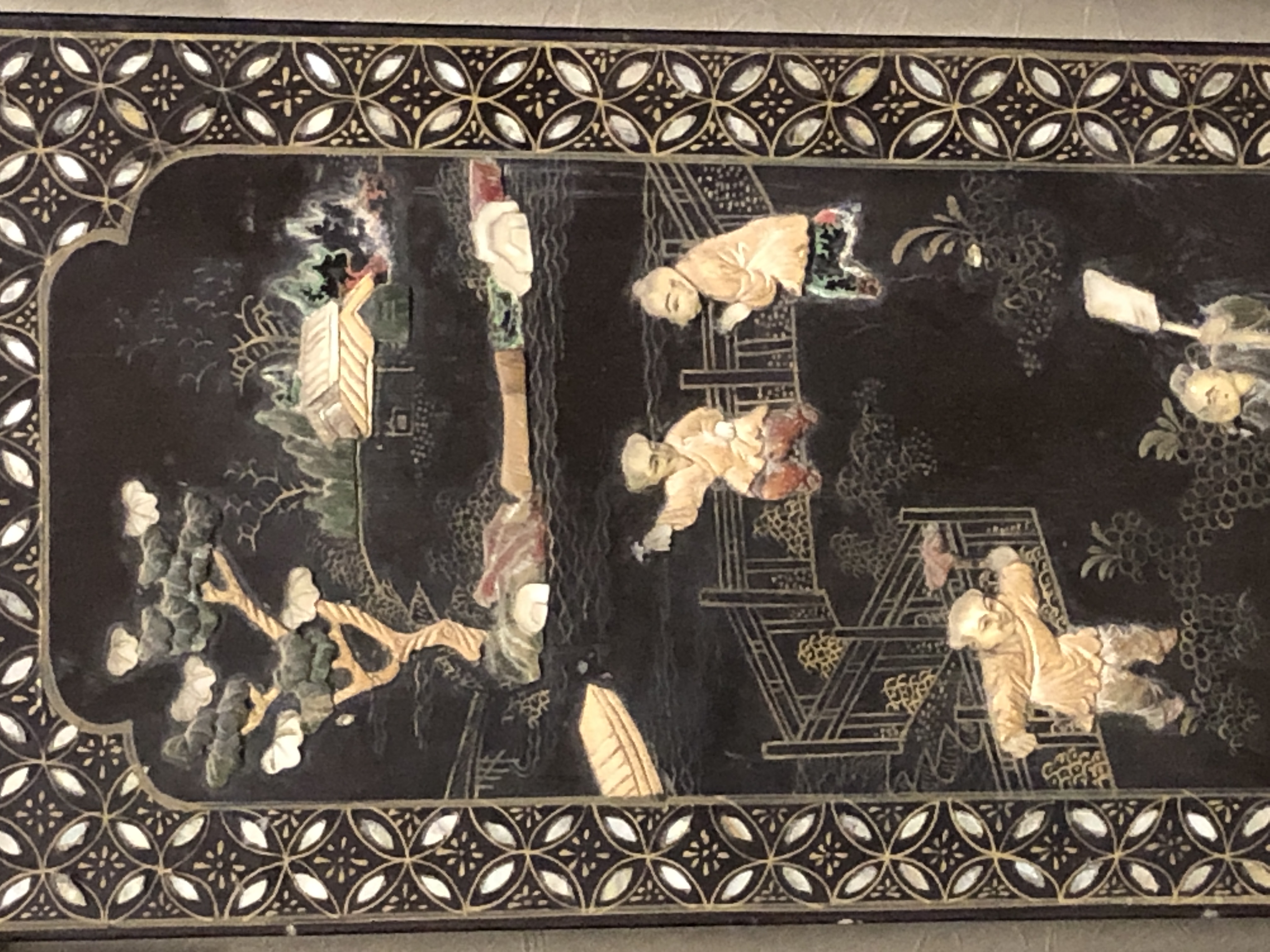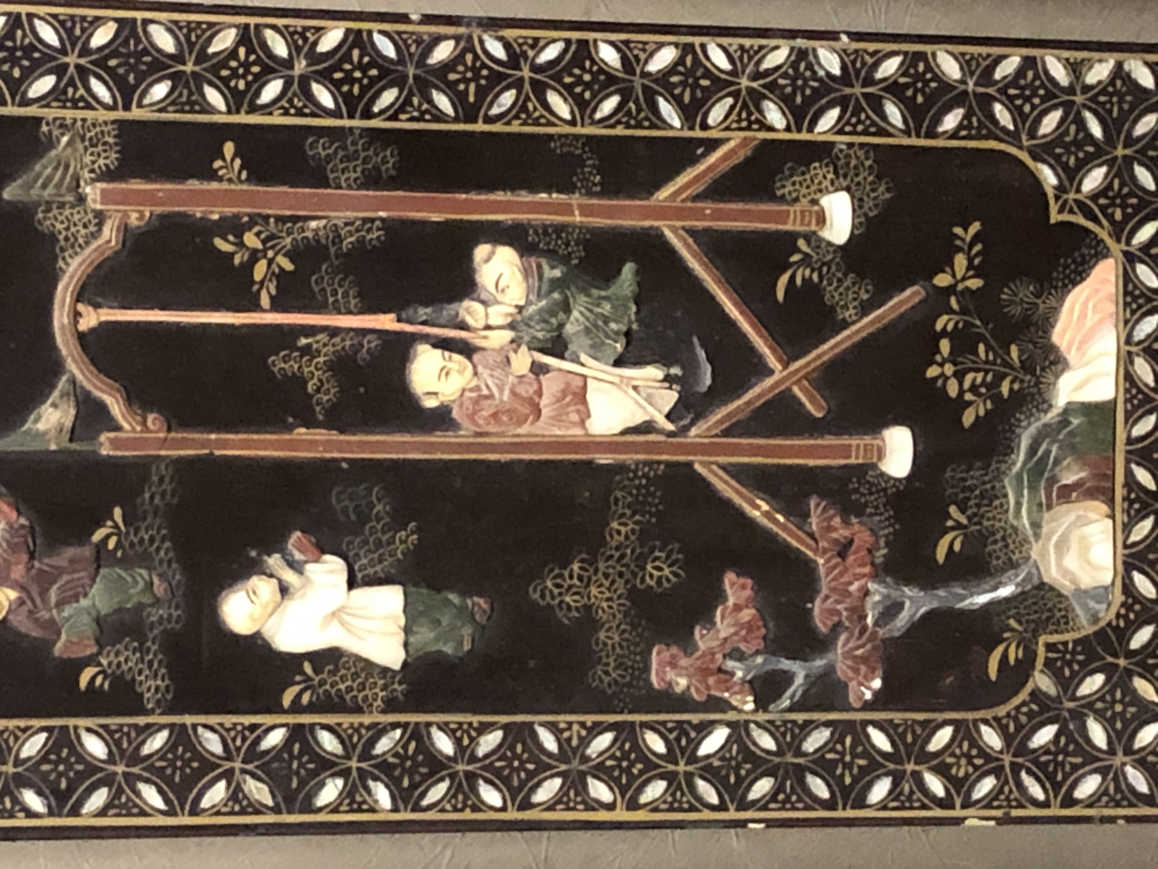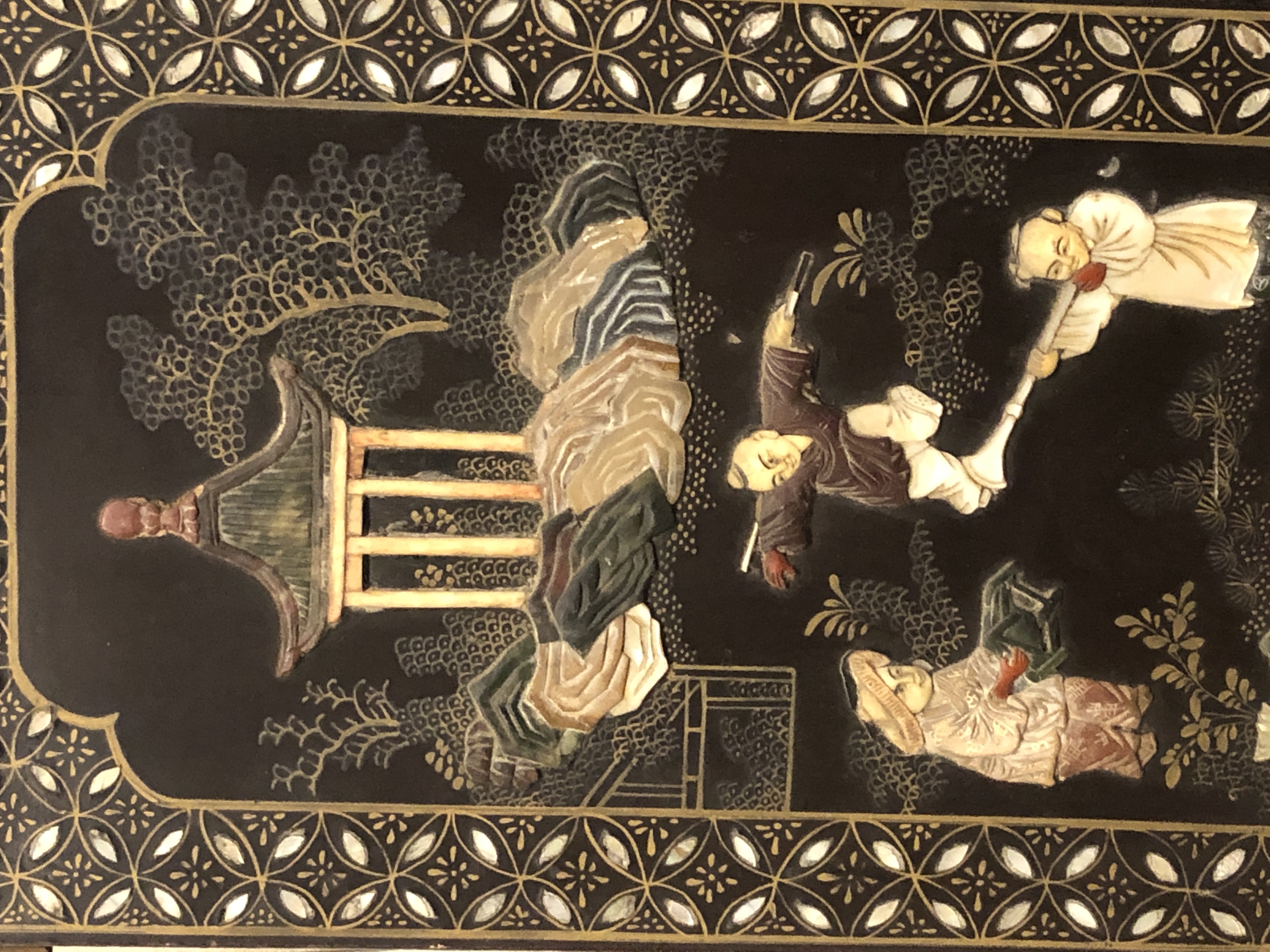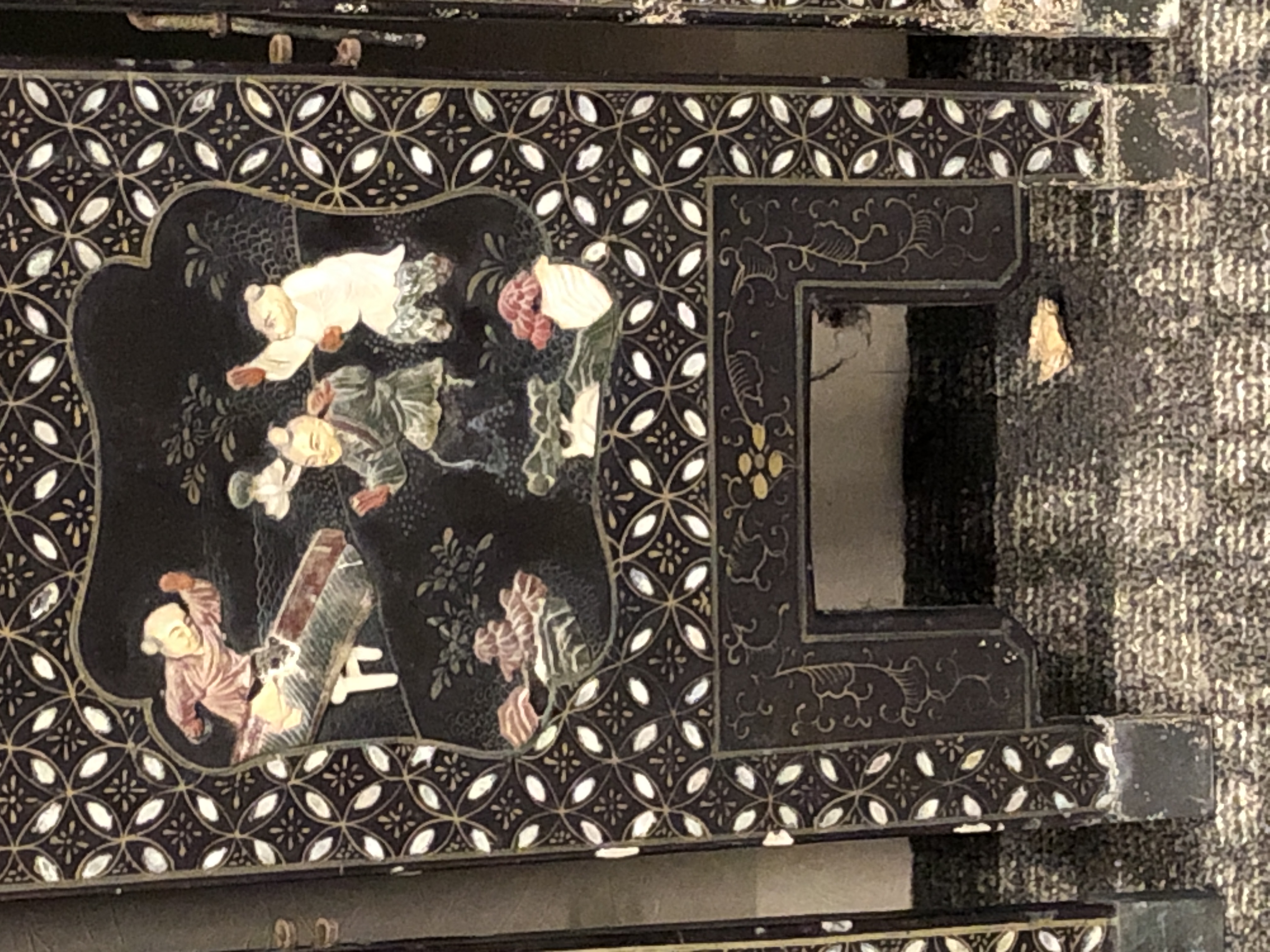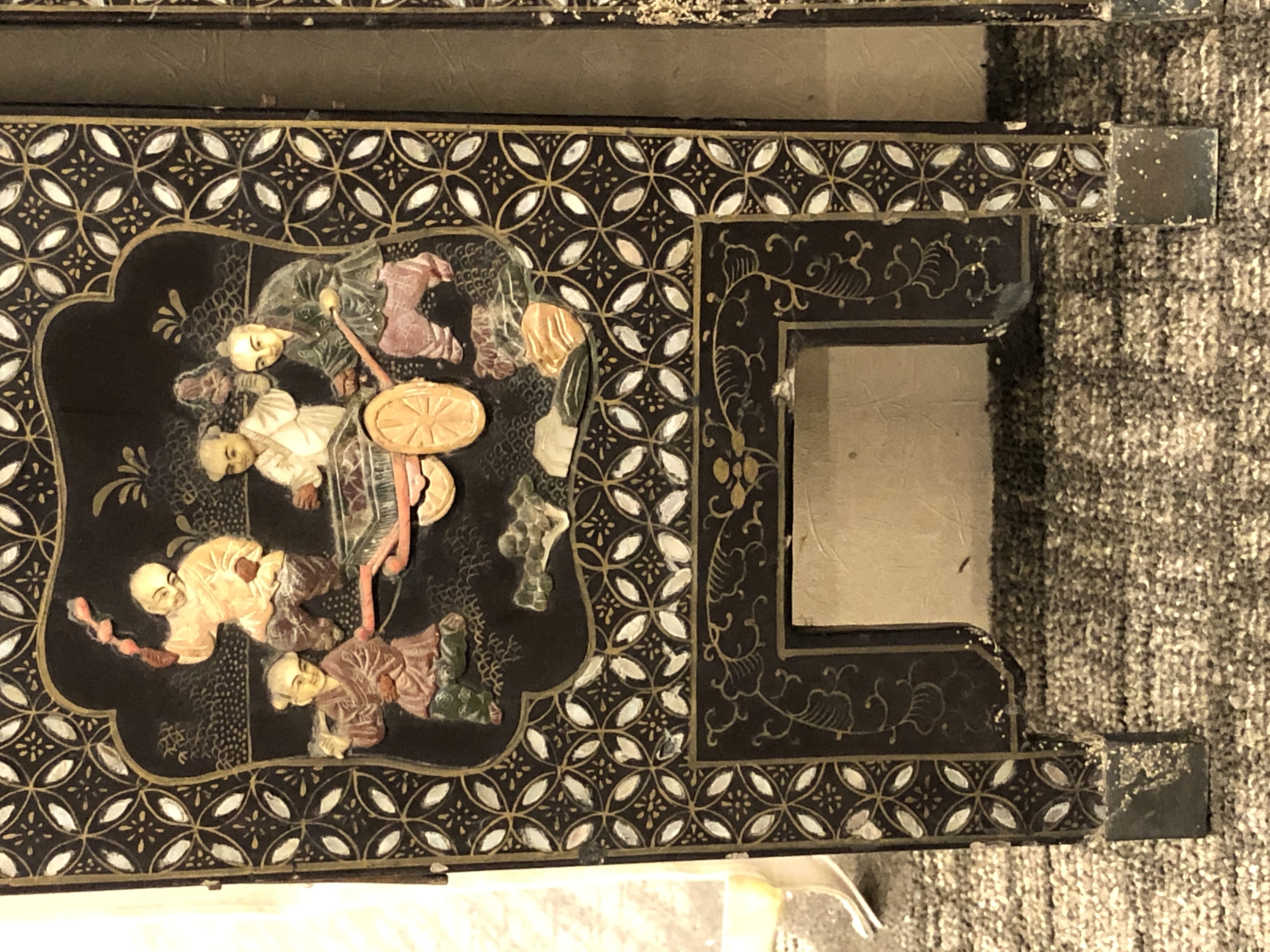 清代大漆彩绘描金十二扇桌瓶,屏风底漆为黑色打底用运彩绘花卉,金漆套边的画法,展现出各种花卉争奇斗艳的形态,画法娴熟,笔画流畅,颜色鲜艳夺目,两边框镶嵌彩贝,桌屏为晚清作品,可惜有些部位脱彩严重,从而影响了整个作品的品相,尽图片看这件作品还是有一定的观赏和收藏价值,