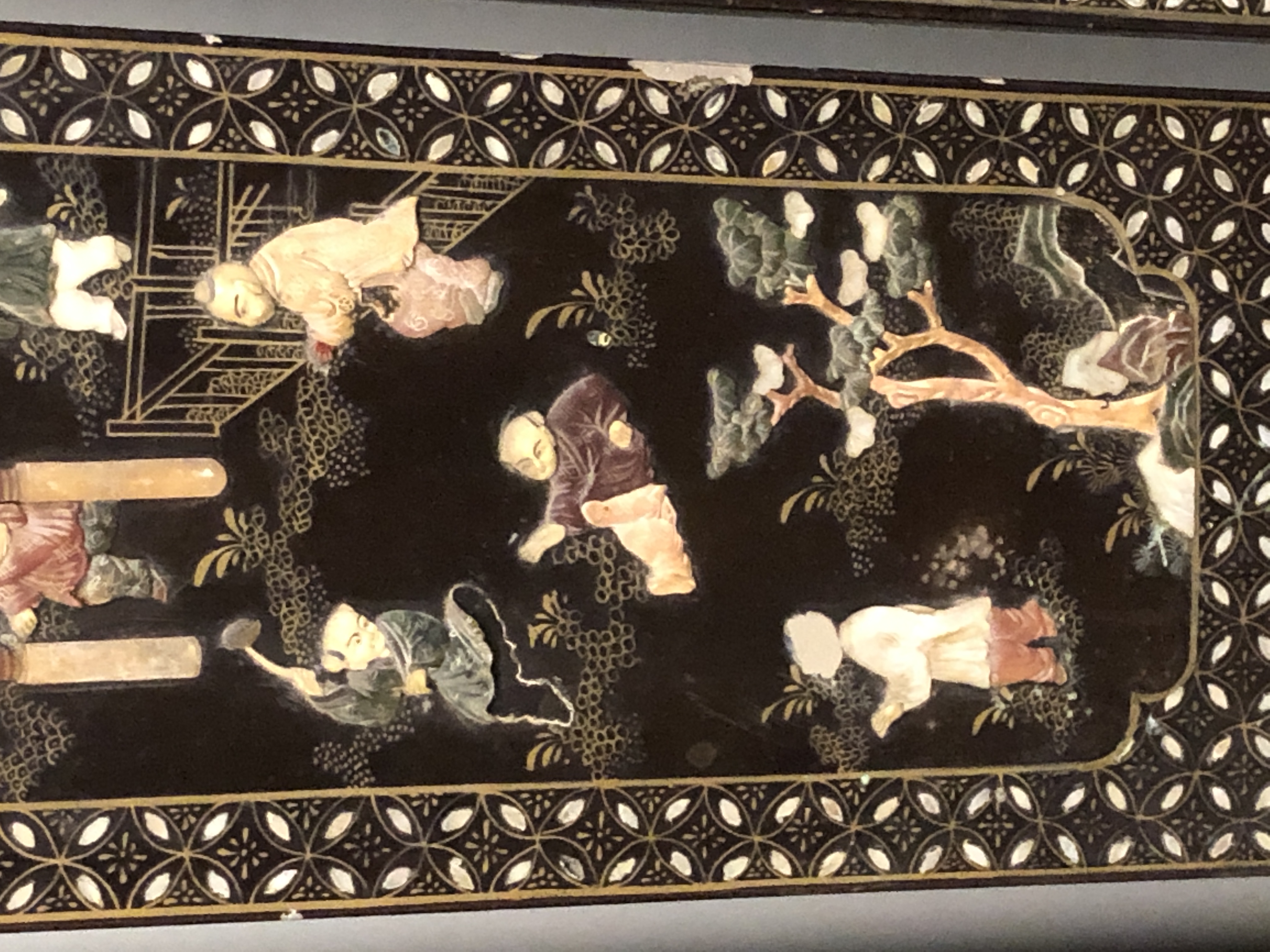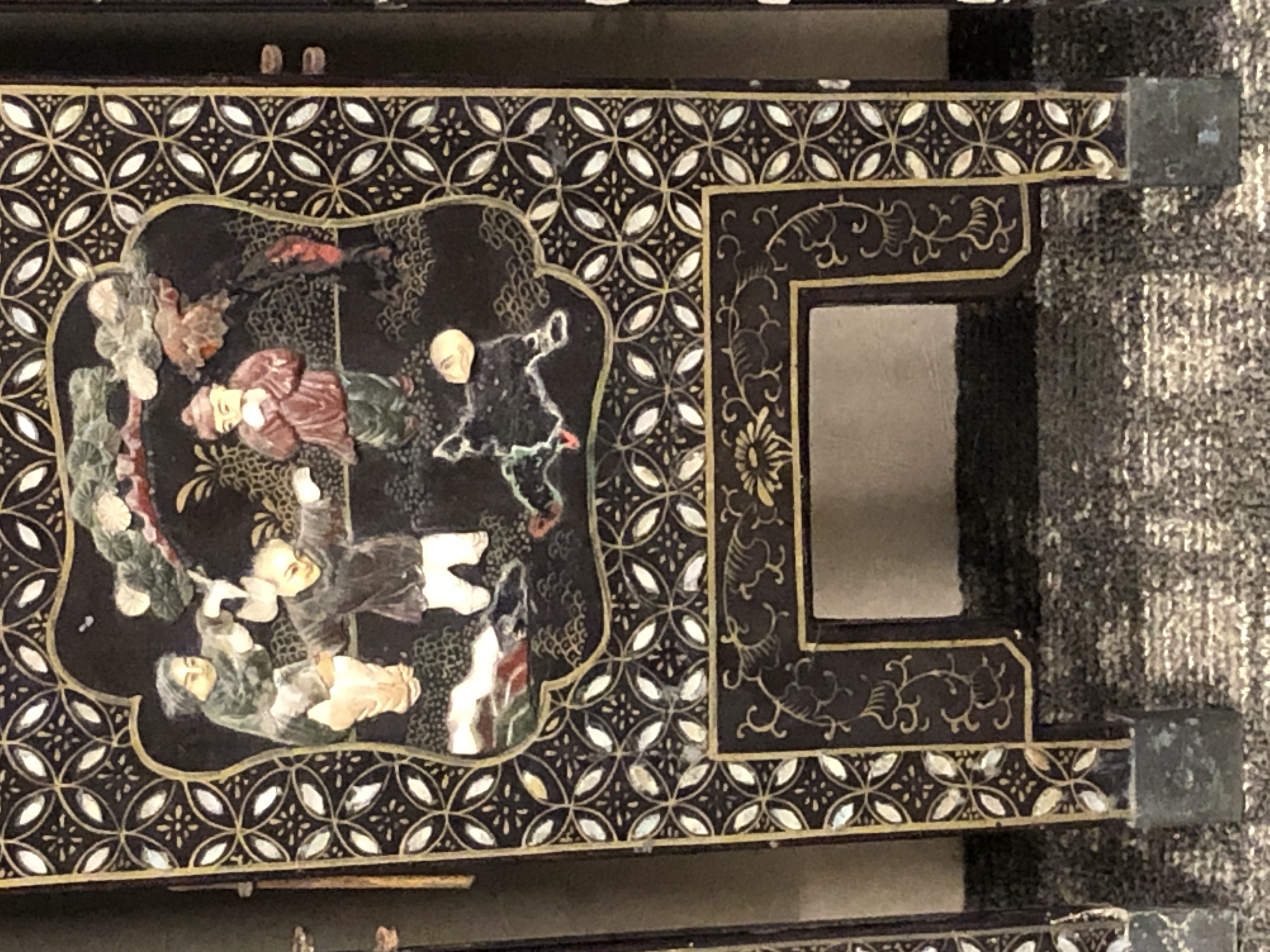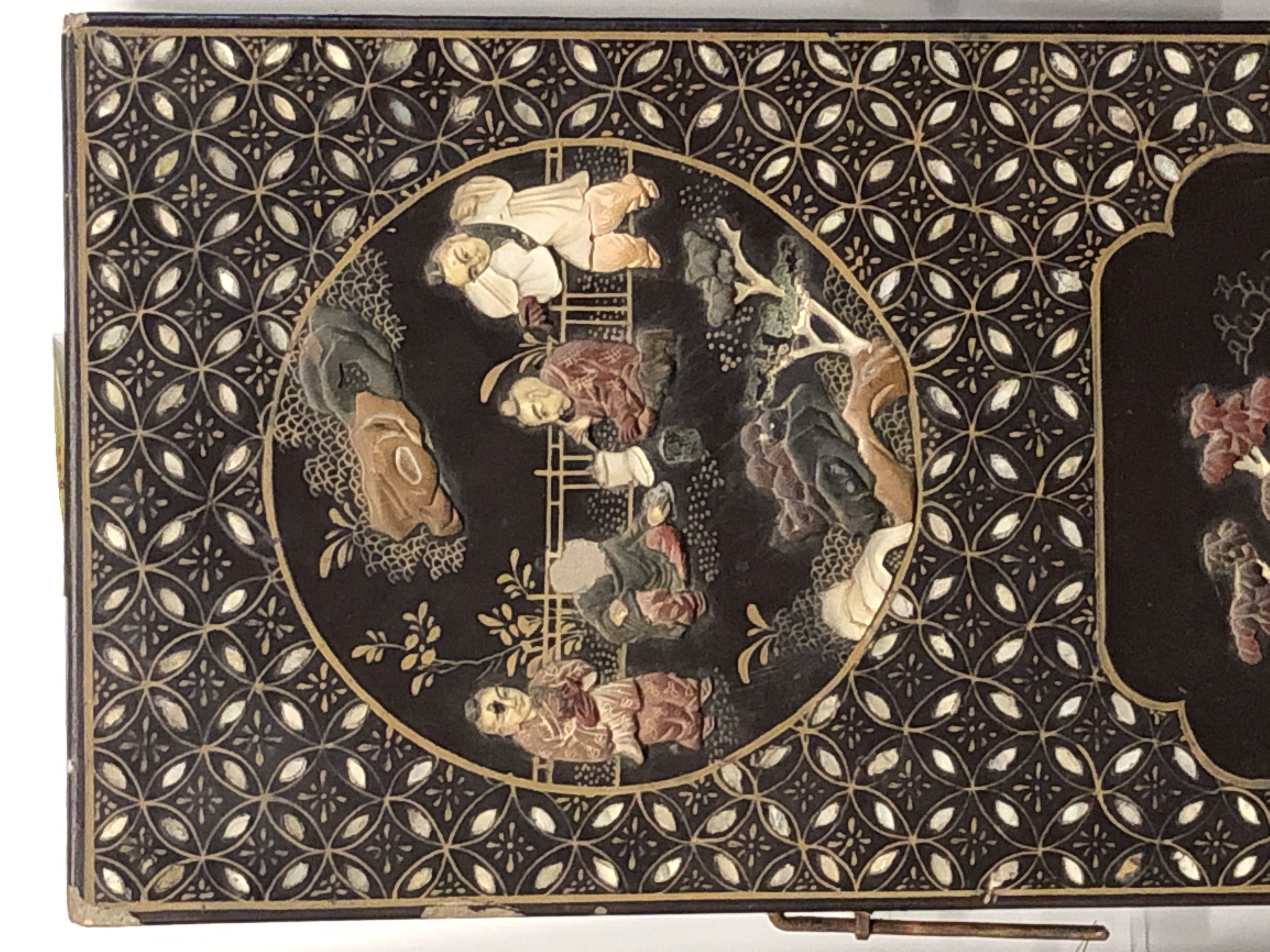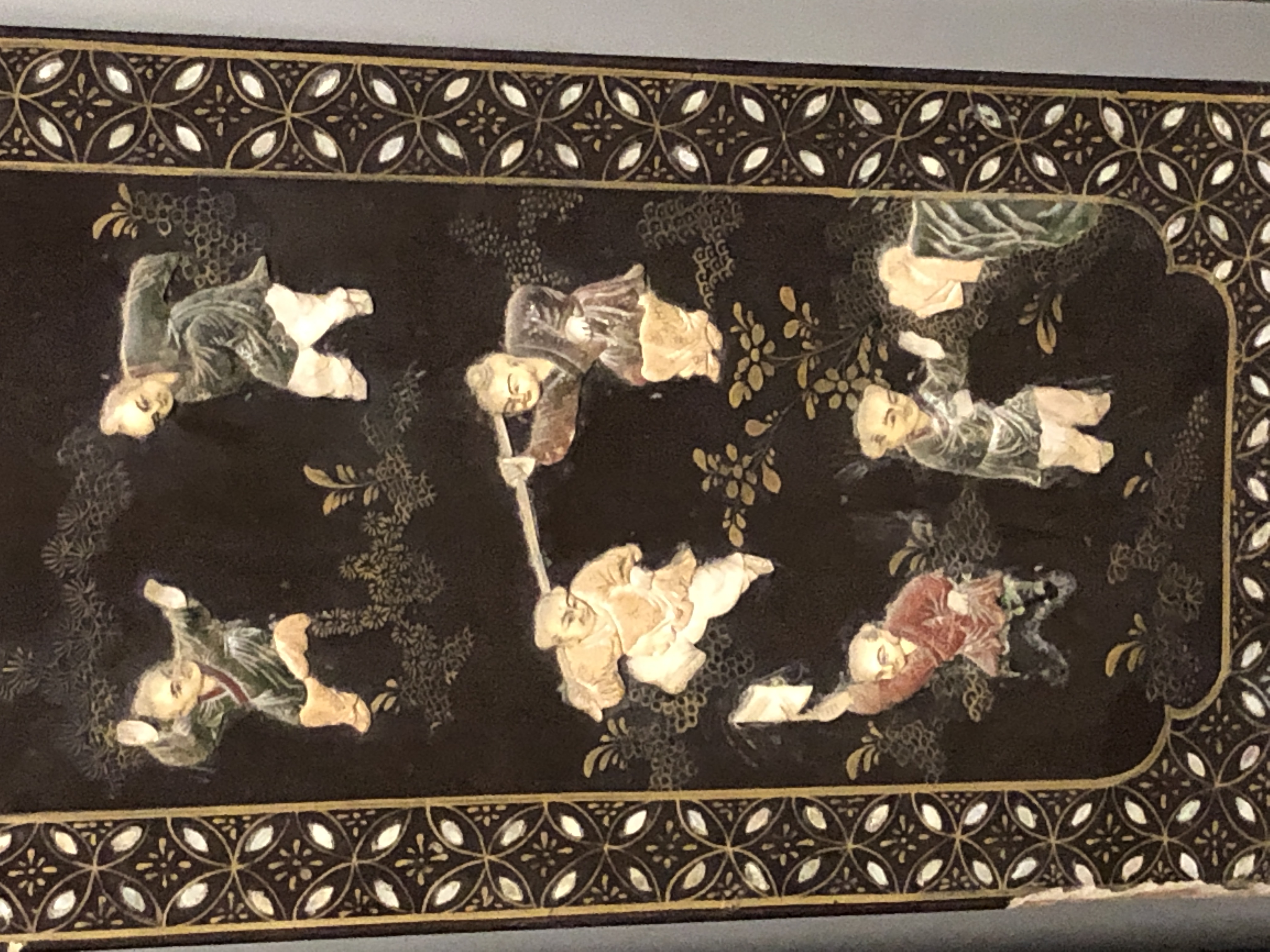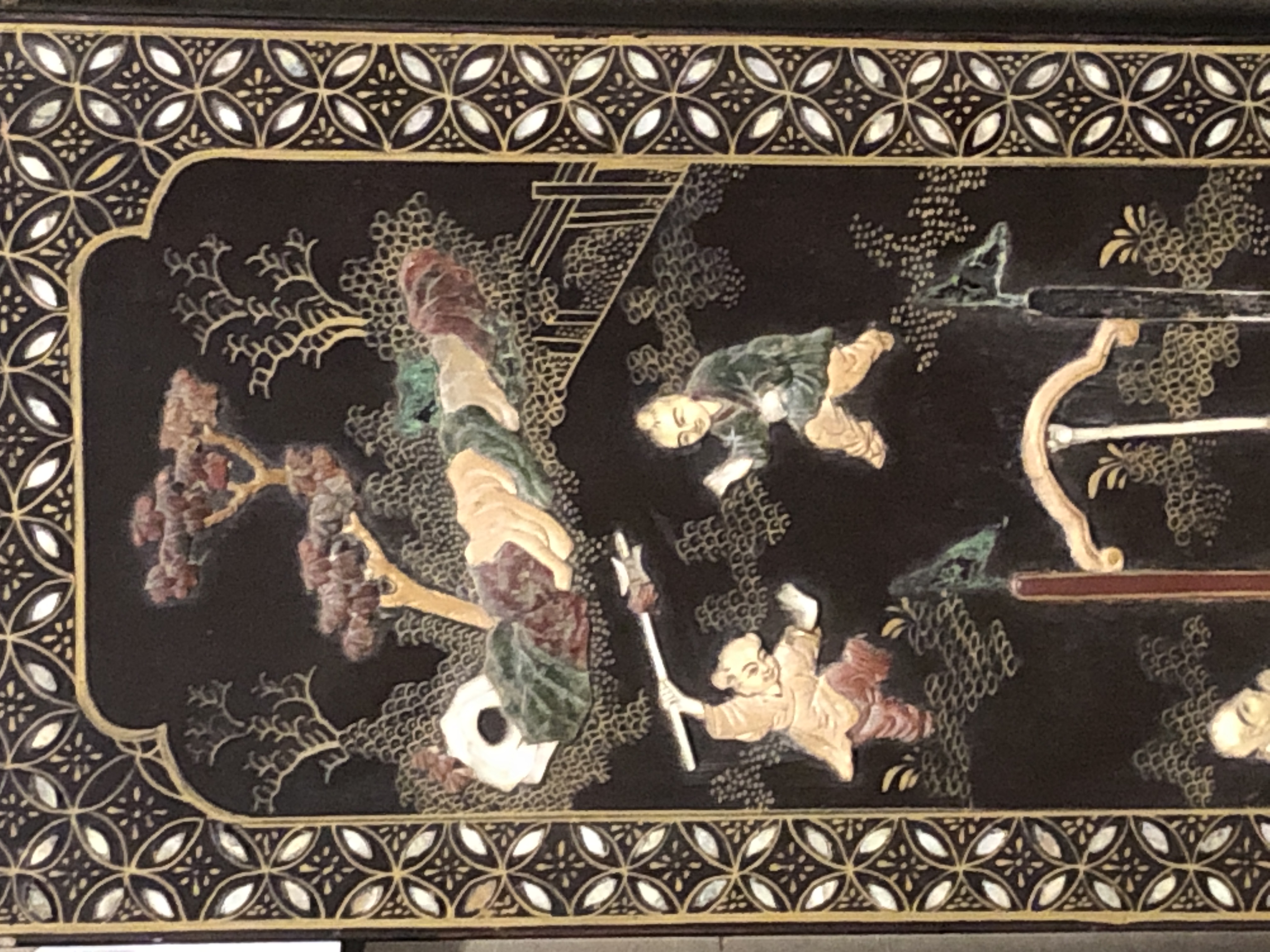 清代大漆彩绘描金十二扇桌瓶,屏风底漆为黑色打底用运彩绘花卉,金漆套边的画法,展现出各种花卉争奇斗艳的形态,画法娴熟,笔画流畅,颜色鲜艳夺目,两边框镶嵌彩贝,桌屏为晚清作品,可惜有些部位脱彩严重,从而影响了整个作品的品相,尽图片看这件作品还是有一定的观赏和收藏价值,