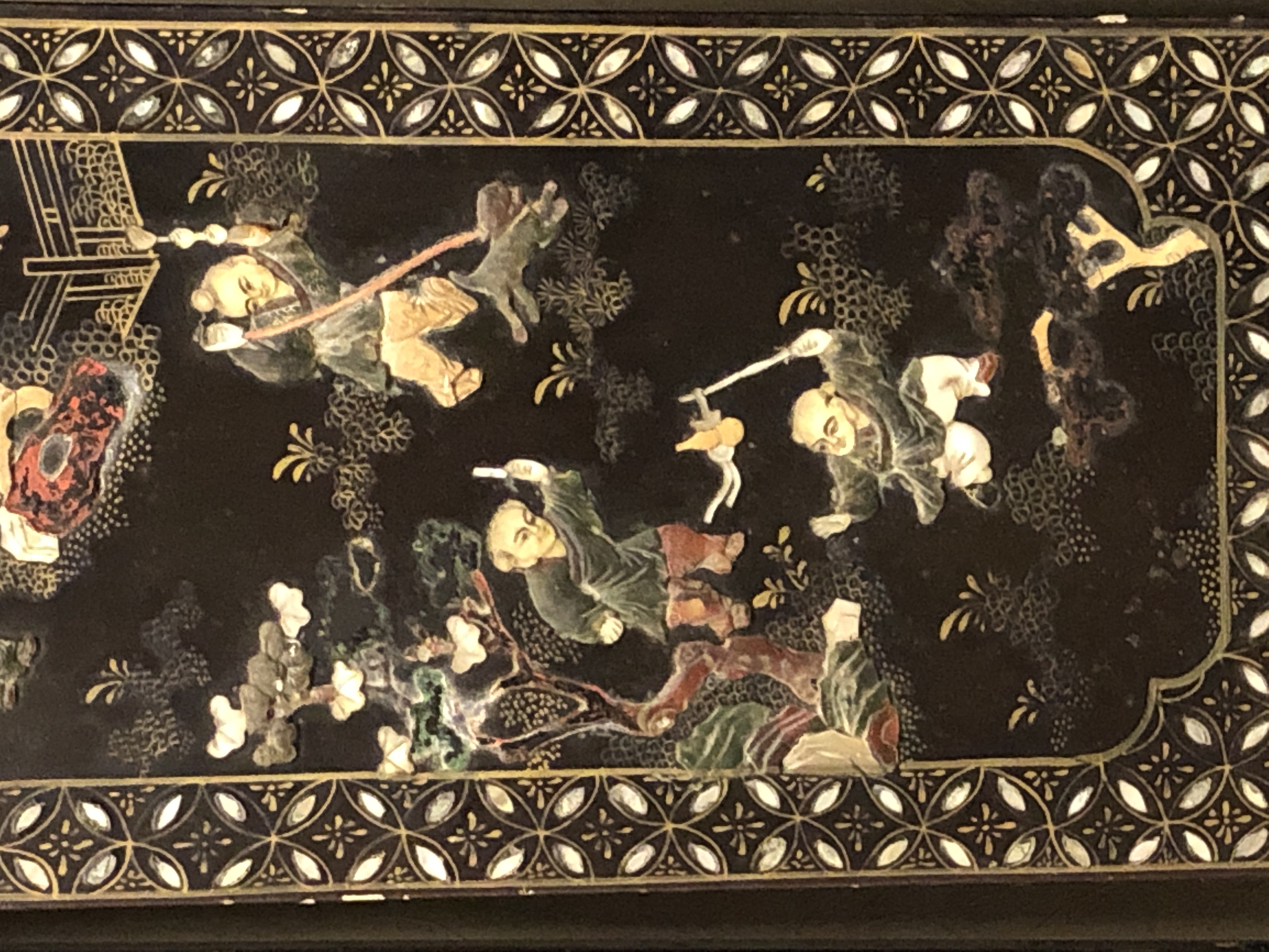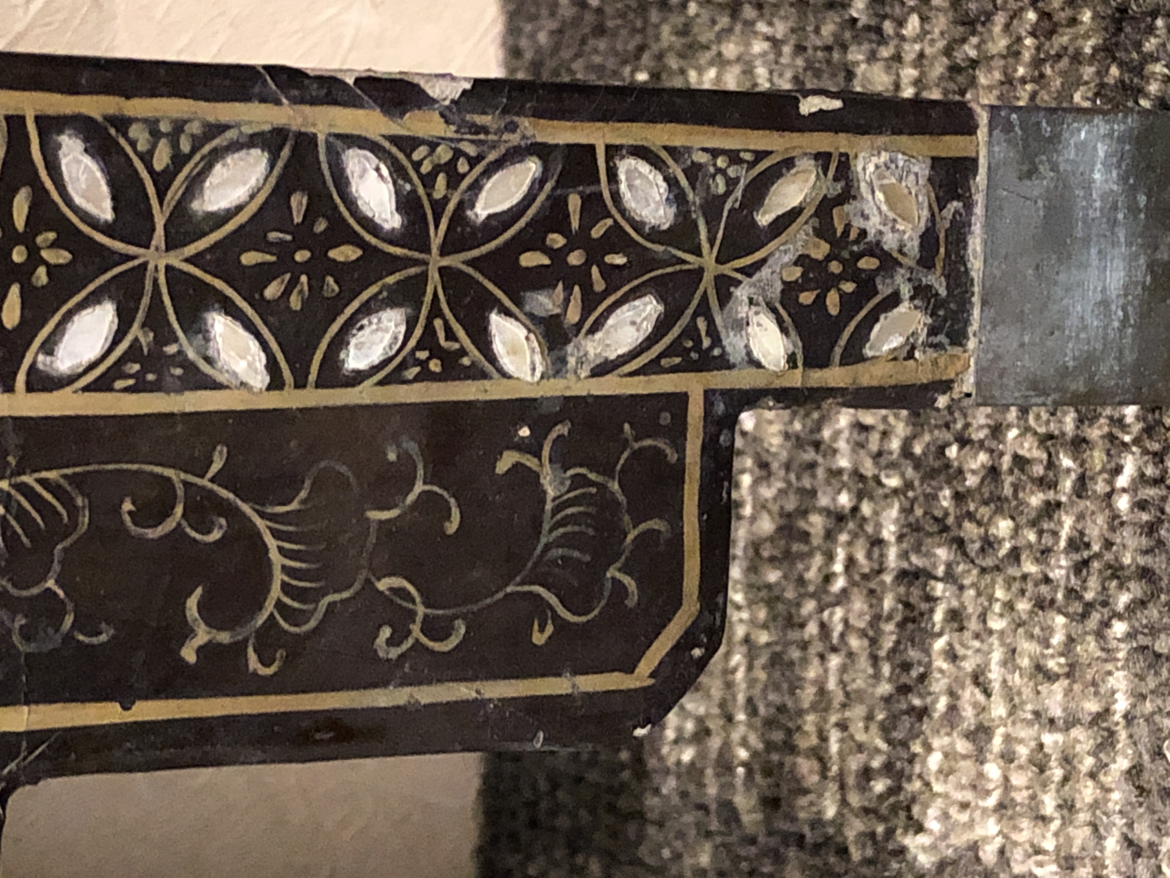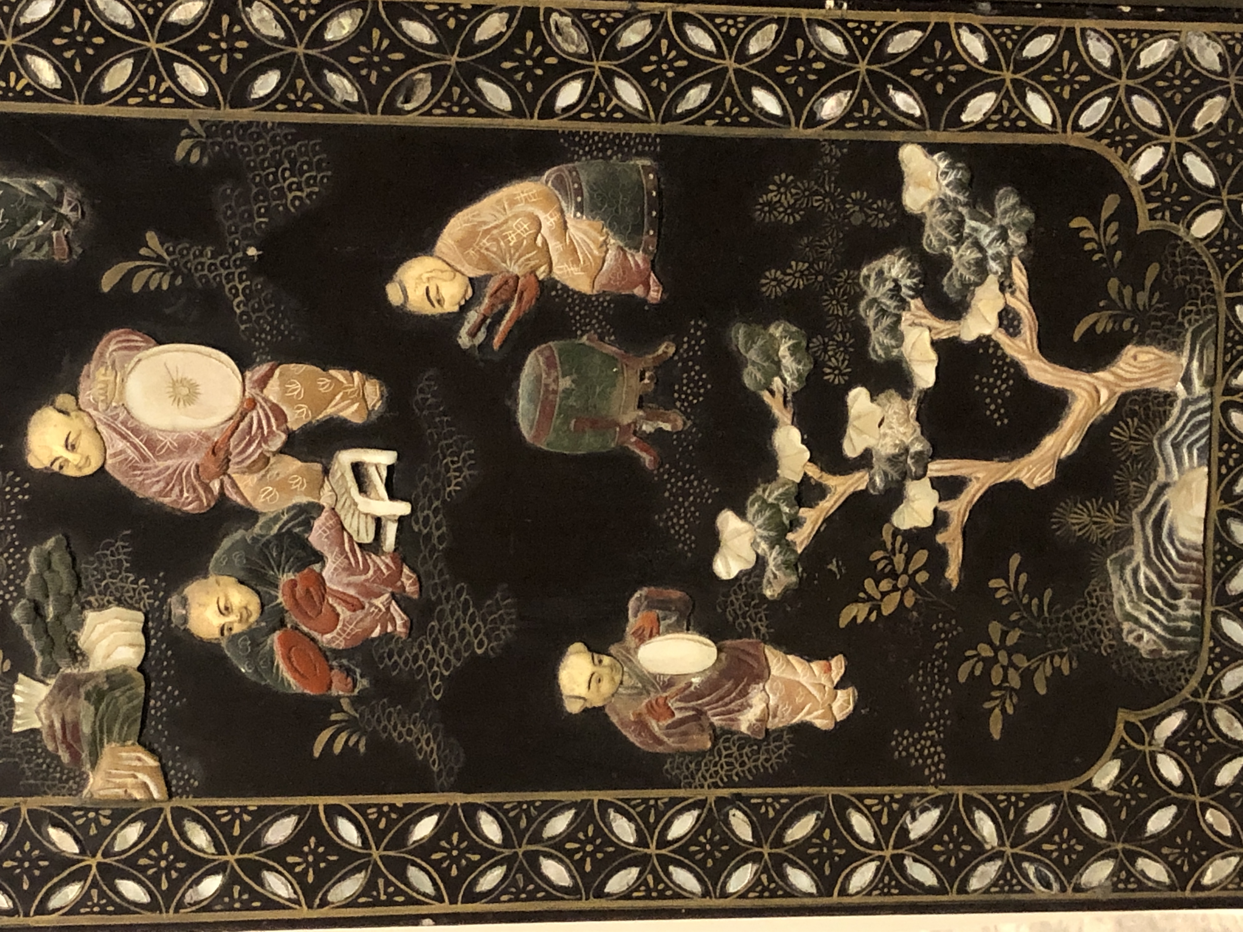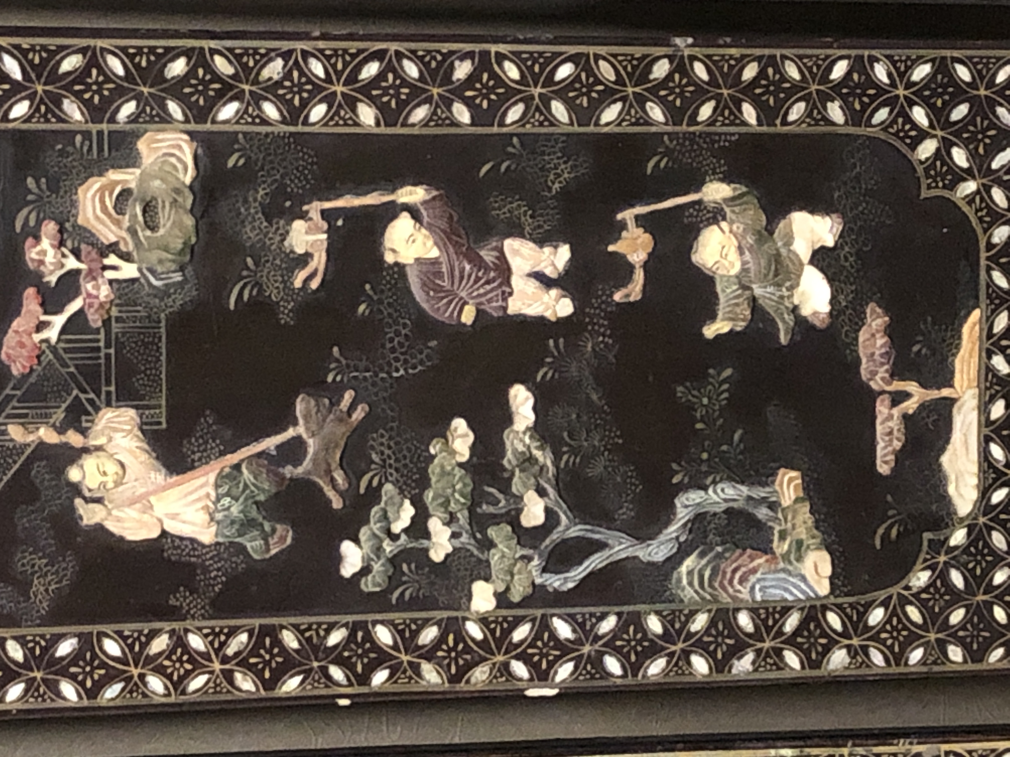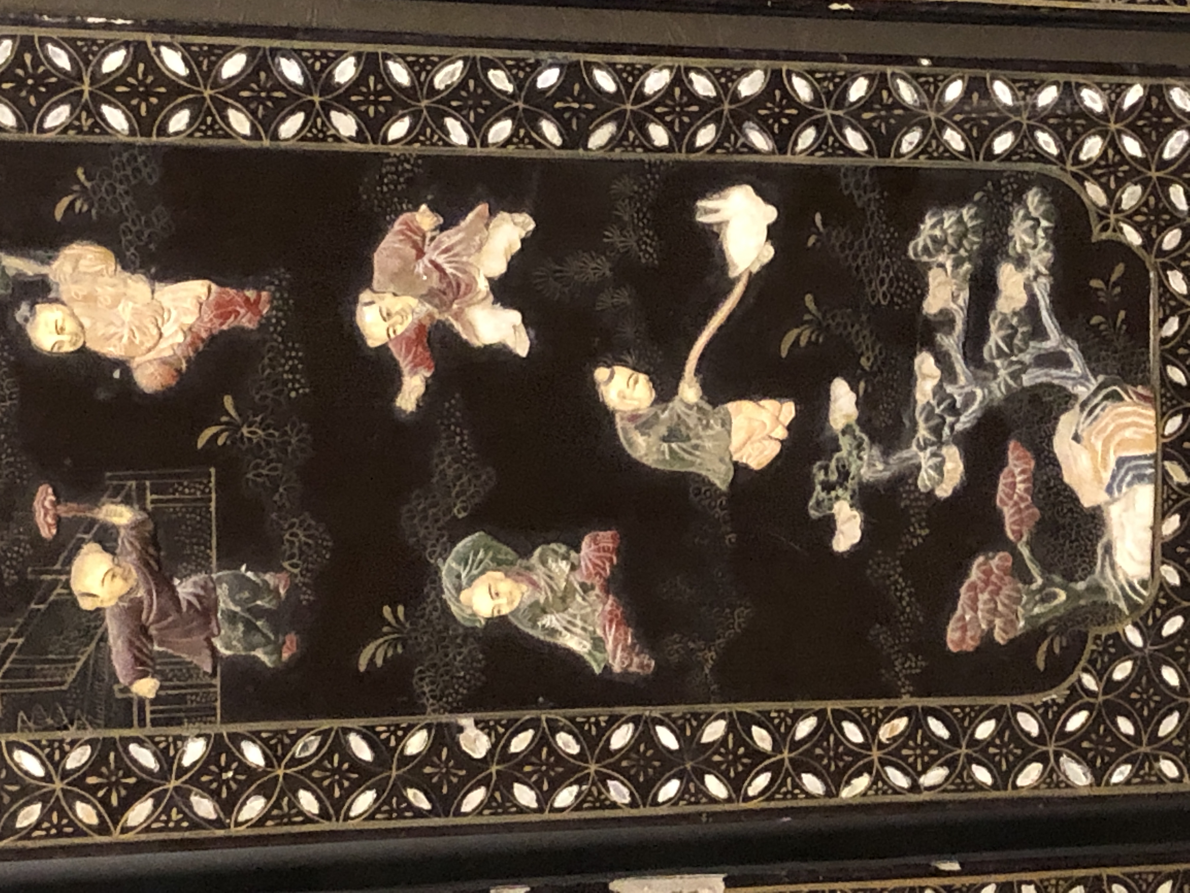 清代大漆彩绘描金十二扇桌瓶,屏风底漆为黑色打底用运彩绘花卉,金漆套边的画法,展现出各种花卉争奇斗艳的形态,画法娴熟,笔画流畅,颜色鲜艳夺目,两边框镶嵌彩贝,桌屏为晚清作品,可惜有些部位脱彩严重,从而影响了整个作品的品相,尽图片看这件作品还是有一定的观赏和收藏价值,