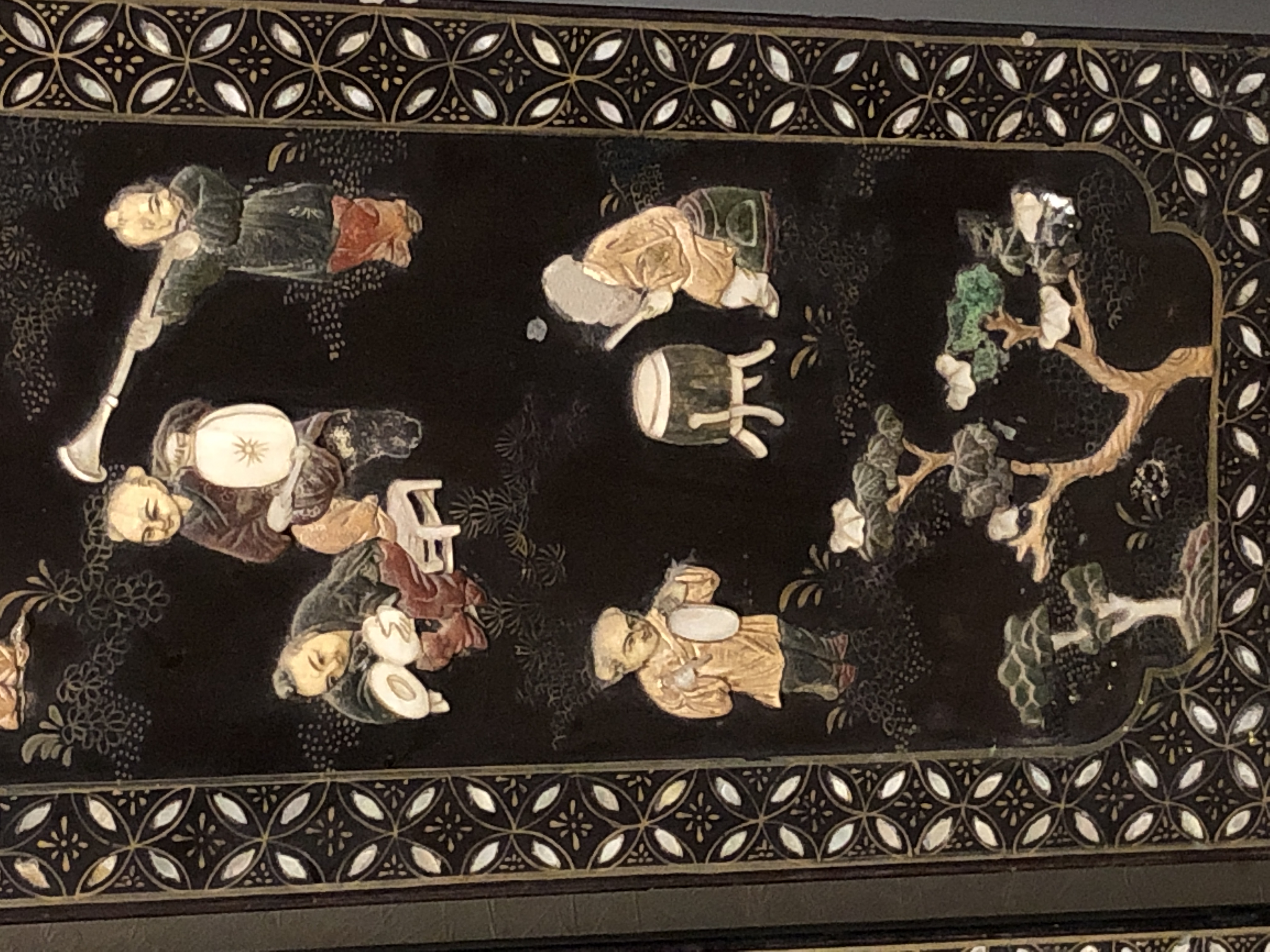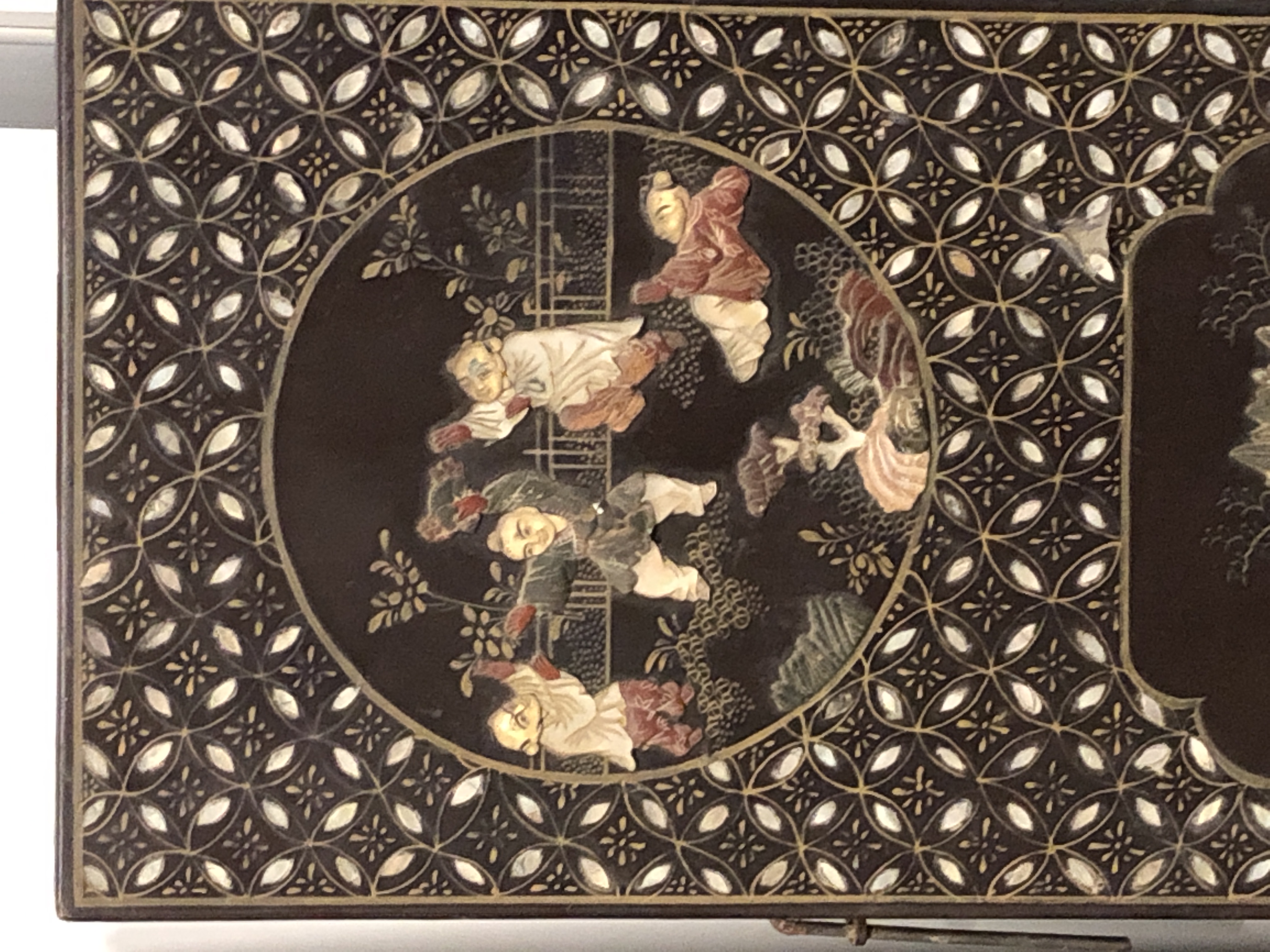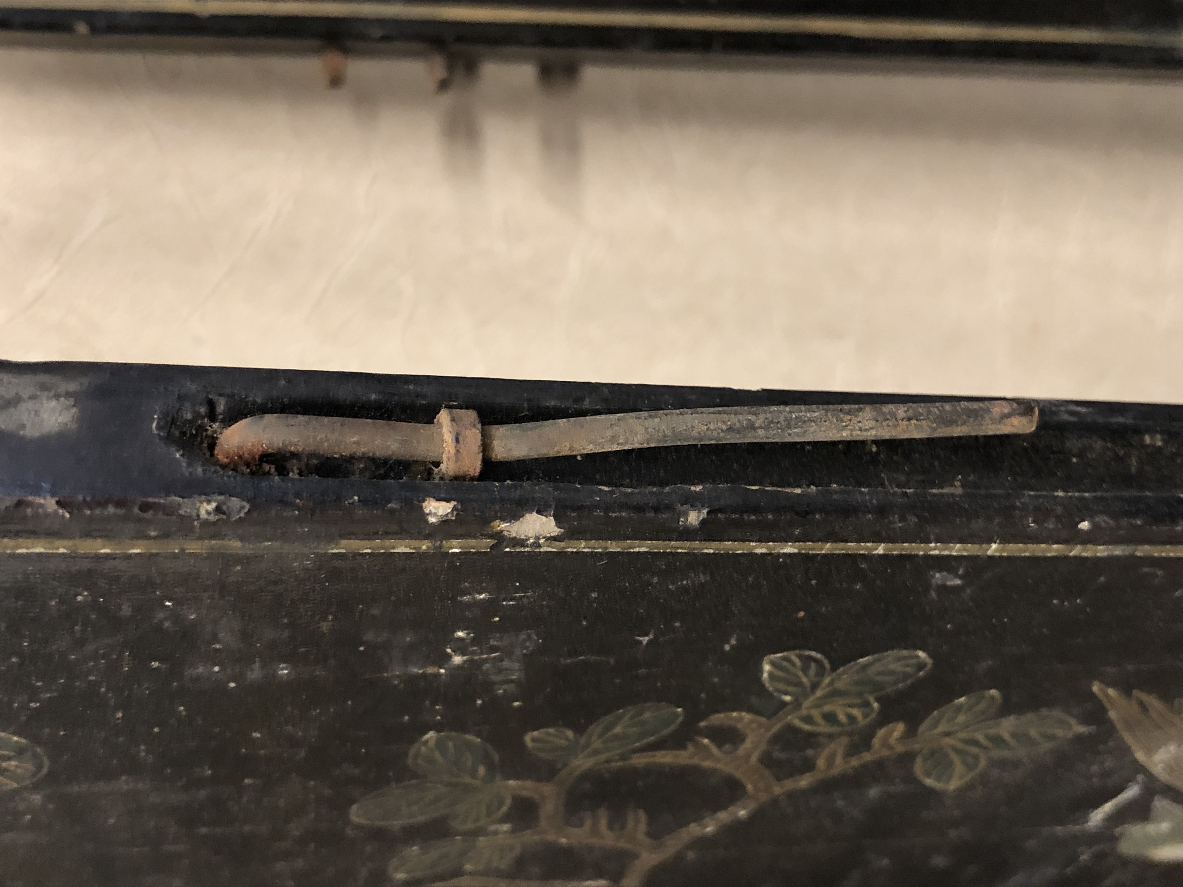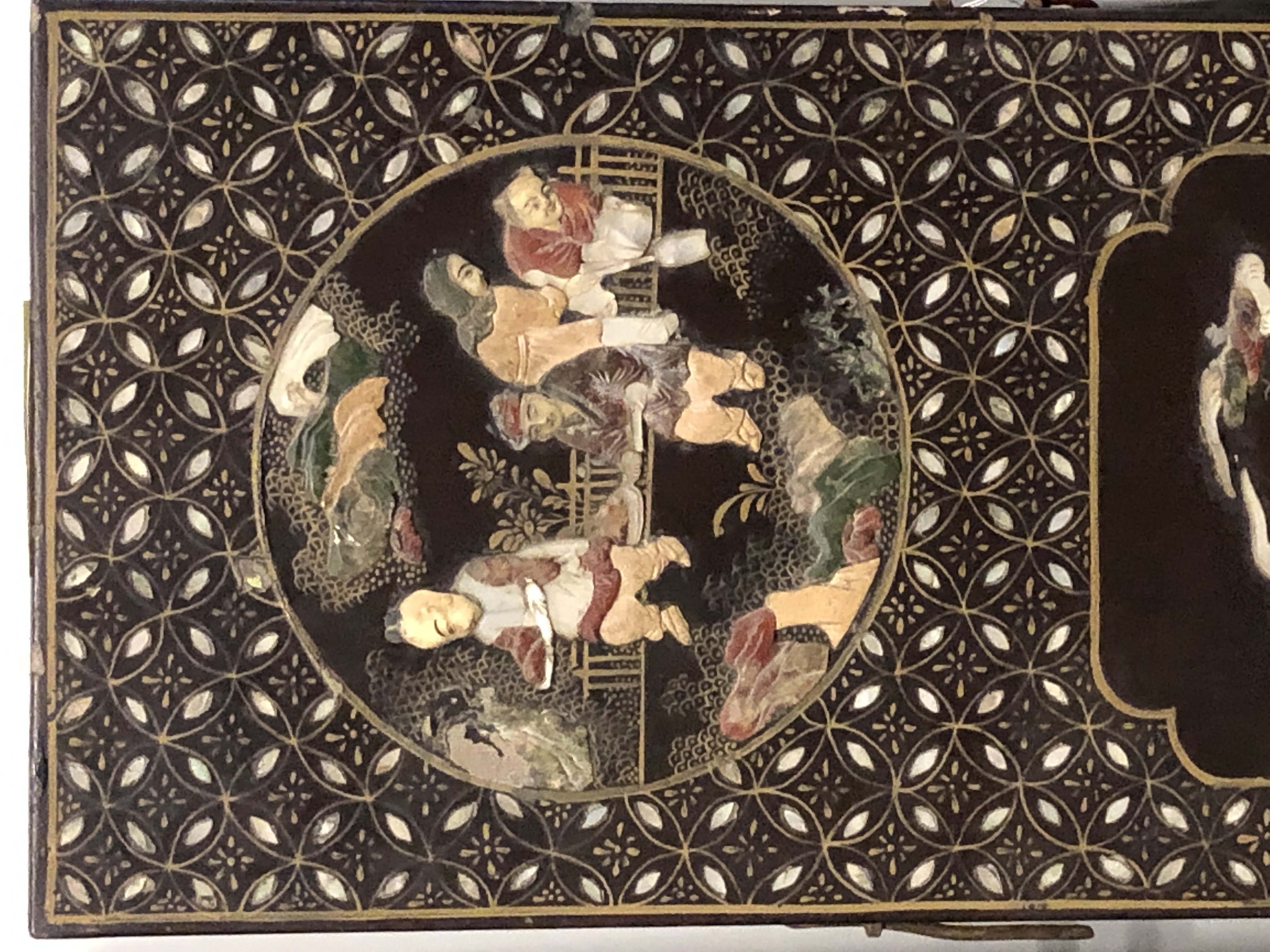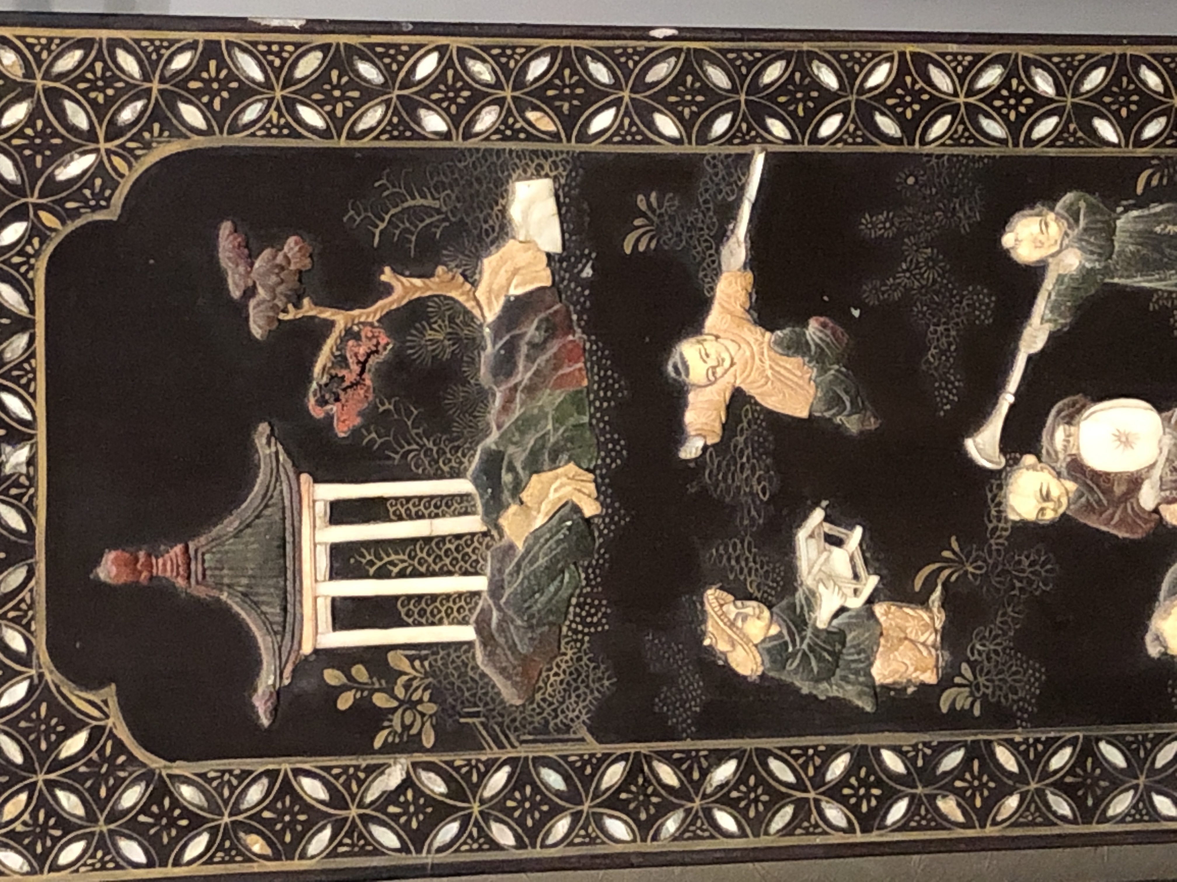 清代大漆彩绘描金十二扇桌瓶,屏风底漆为黑色打底用运彩绘花卉,金漆套边的画法,展现出各种花卉争奇斗艳的形态,画法娴熟,笔画流畅,颜色鲜艳夺目,两边框镶嵌彩贝,桌屏为晚清作品,可惜有些部位脱彩严重,从而影响了整个作品的品相,尽图片看这件作品还是有一定的观赏和收藏价值,