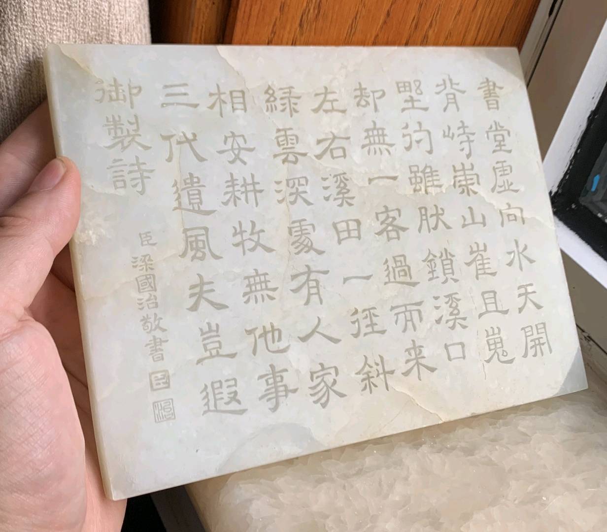 这个属于砚屏,因为是放在书桌上面,挡着砚台或者放在砚台的后面,那么称为砚屏。东西不错,上面雕人物、山水,工挺好的,是一个老工。那最重要的一点就是后面的字,说是梁国治写的乾隆皇帝的御诗。我们在研究玉器的时候,尤其是把它断在清中期乾隆时期时,那么工就最重要的看它的书法,这个书法是隶书,可以很明显的看这种雕法不是太像用坨锯坨出来的,而是用拨划工艺,楷书也有,草书也有,就是一般的工匠是没有这个水平的,所以这件屏风不错,是没问题的。