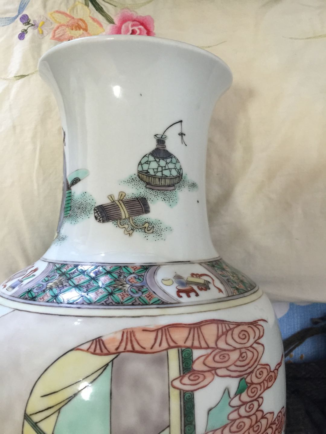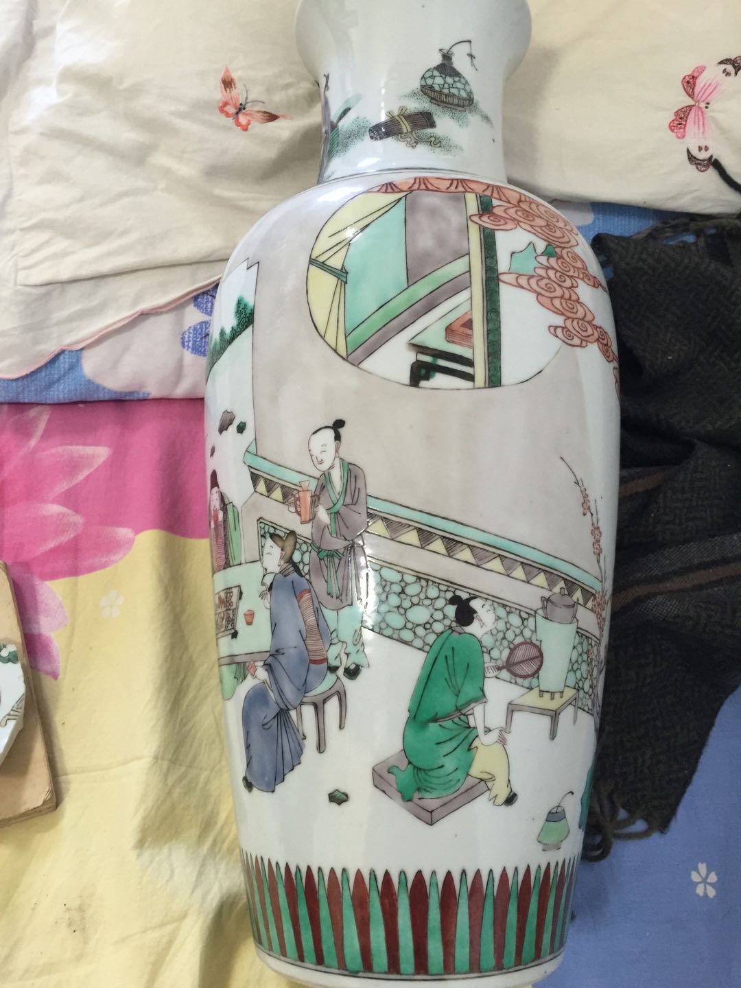 时代:康熙晚期 五彩人物故事图软棒槌瓶,造型稳重,符合康熙晚期的标准。人物故事图案细腻,形态逼真,施彩准确,画法是康熙时期的风格。胎釉致密属于康熙晚期的工艺。从照片上看,这是一件康熙晚期的作品。遗憾的是底有一道大㼂,失去它的完美性。市场估价在6~8万左右。