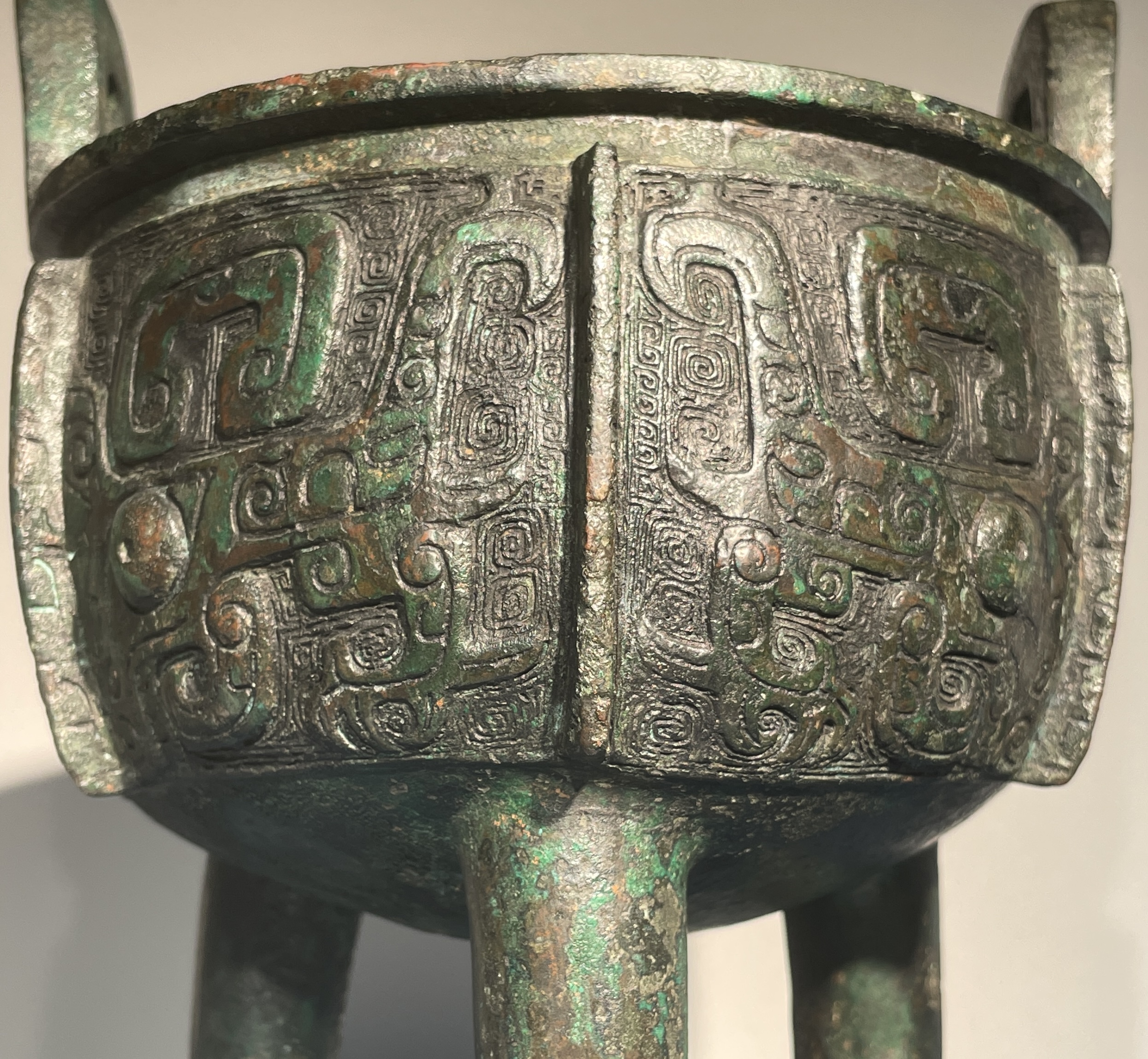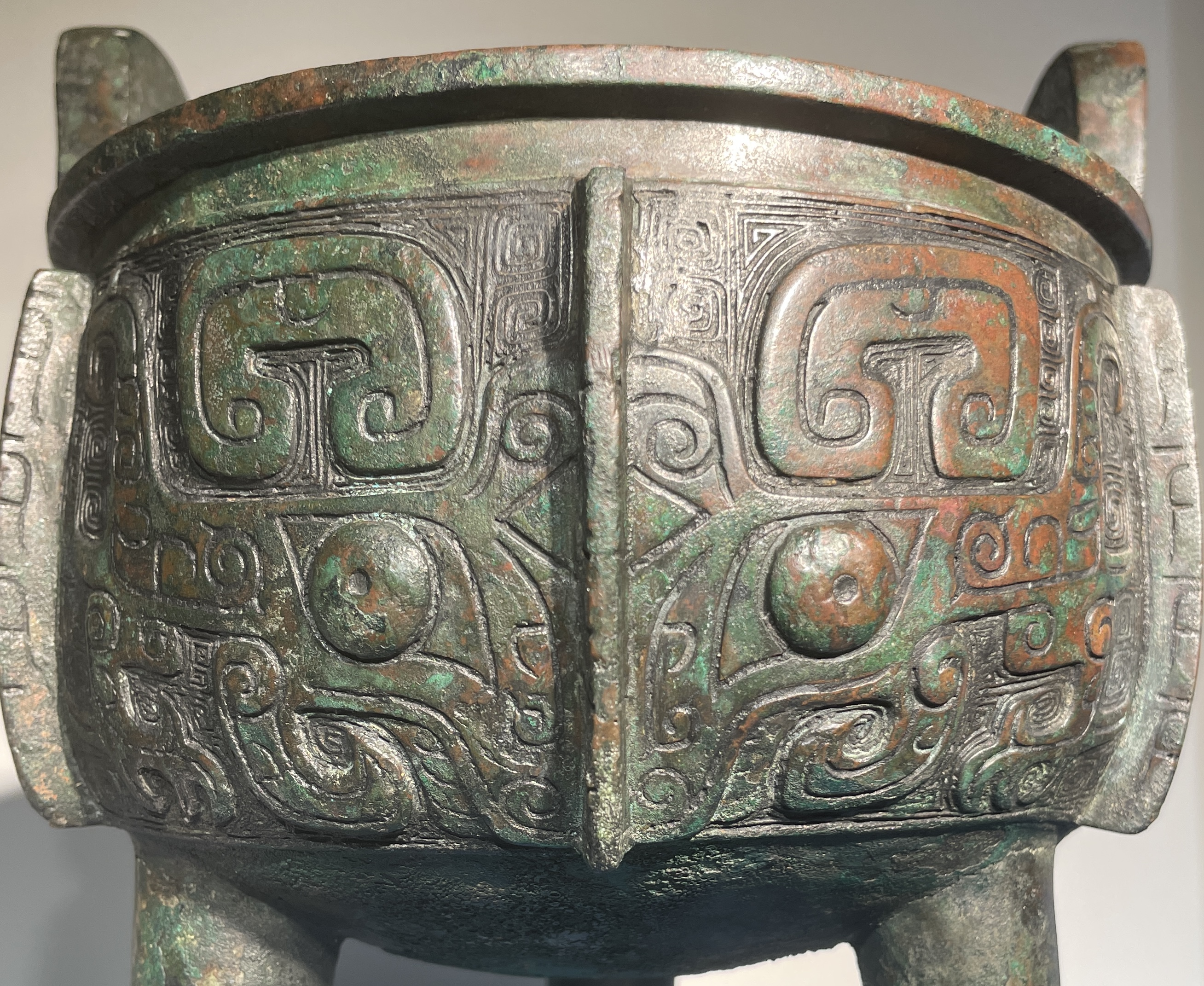 藏友好,首先这是一件非常开门到代的器物:商晚周早圆足饕餮纹立耳青铜鼎,北方坑,典型的红斑绿锈。因为北方土质干燥、土里水分较南方少,而且不像南方的土质带弱酸性,所以对器物的腐蚀较轻,锈蚀就没那么的深入。锈的结晶从器物表面是看不了的,如果剔一块锈下来再放大看就能看到锈的结晶体了。而您说的底部和内堂的锈其实是原汁原味的结晶锈层,没有经过人为刮磨除锈的痕迹。至于这些纹饰和垫片的痕迹能不能看到已经不重要了,因为每一件器物铸造出来后还要经过人工精细的打磨,很多器物已经看不到铸造痕迹和垫片了。所以这件器物的工艺是原装的,不存在加刻和拼接的作假。以上是我个人观点、仅作参考。