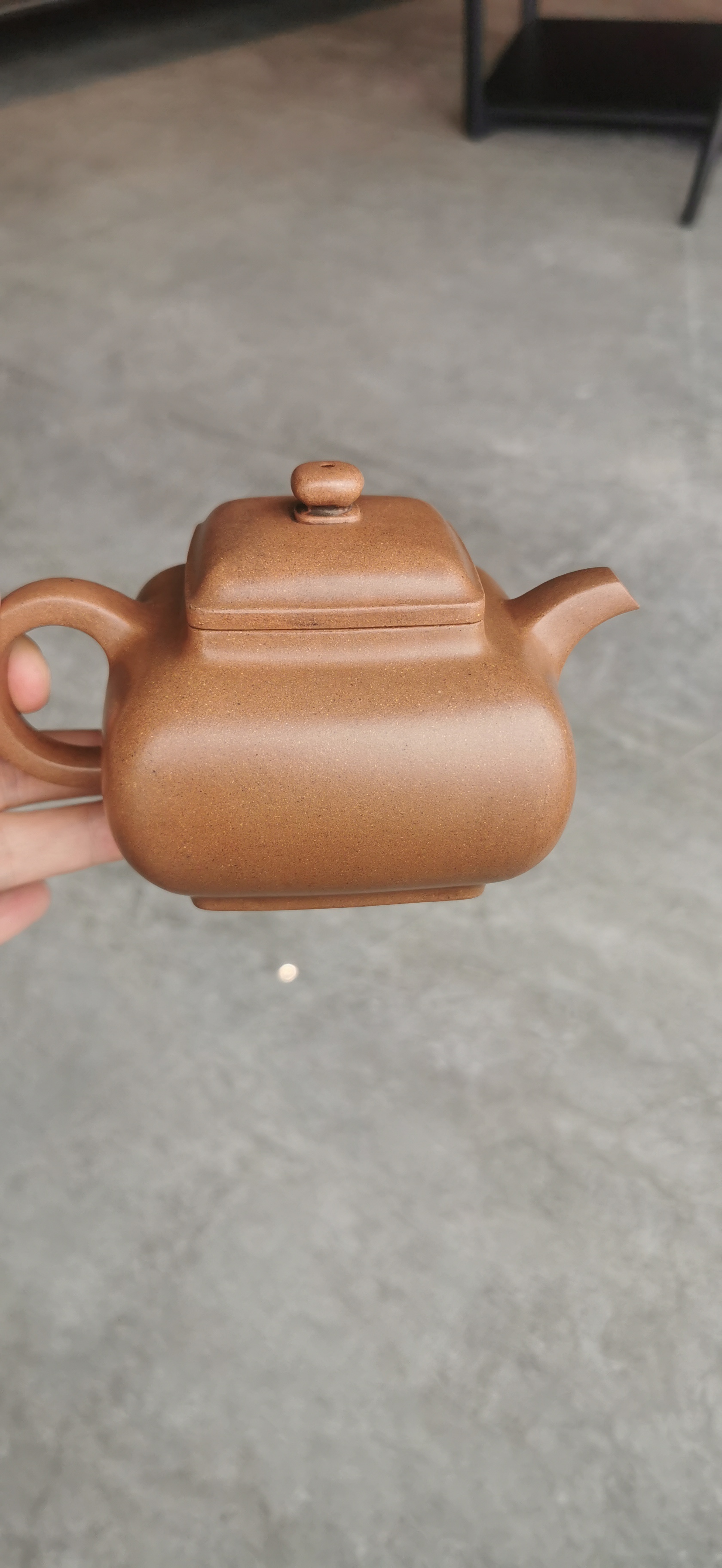 1,陈觐候是清乾隆年间人。工治壶者宫廷工匠,亦作碟盆等器。2,此扁圆四方壶。工艺规正,材料团紫很好。3。作品到代,仍为真品。但底部落款姓名,可見不在宫廷造办所内制。壶价位有买客来定,无法估价,但有收藏价值,因承世不多。真品。
