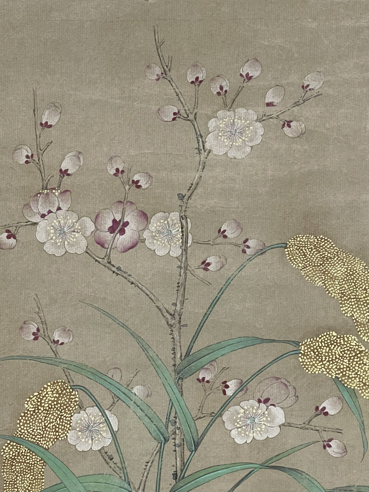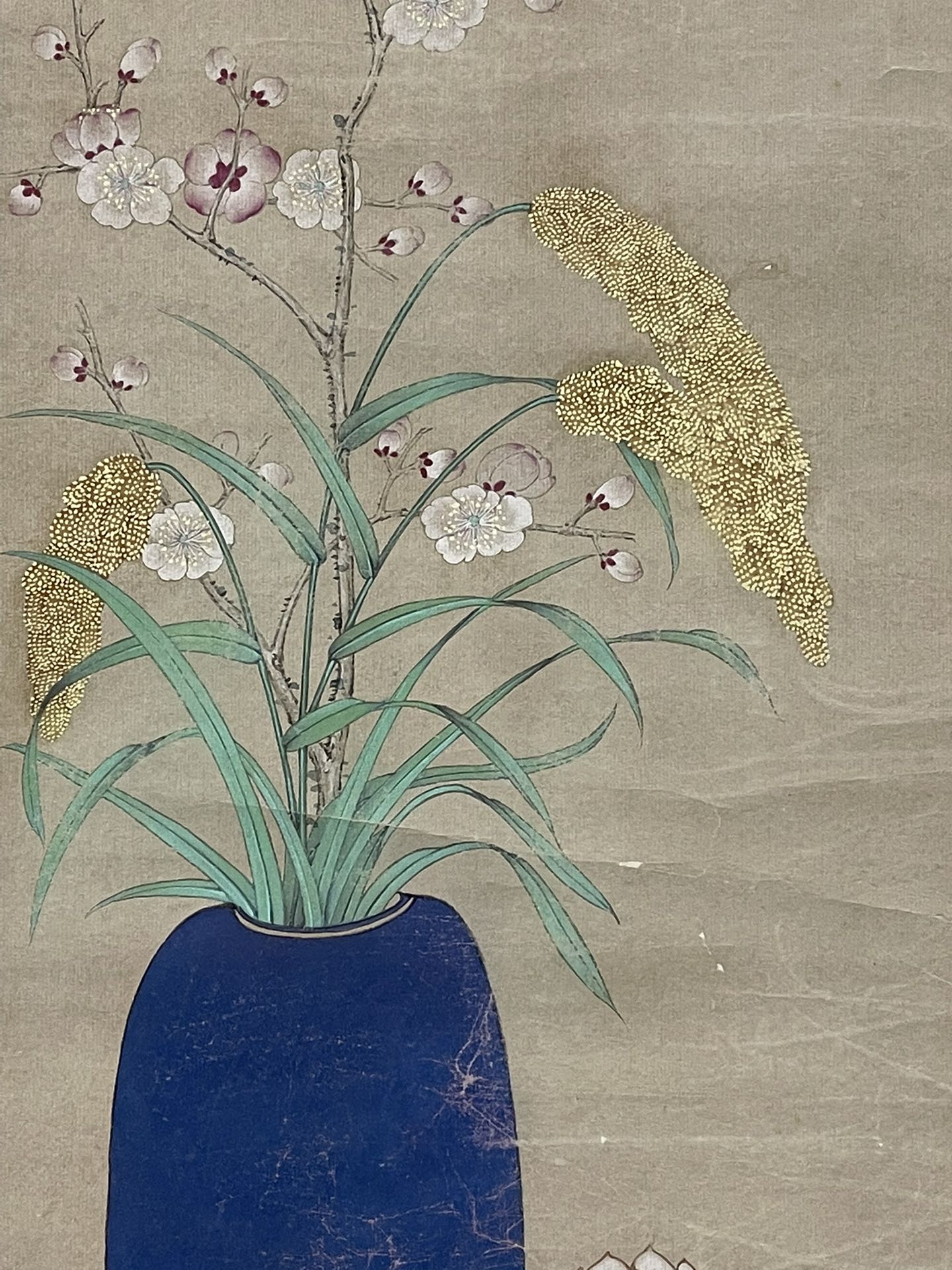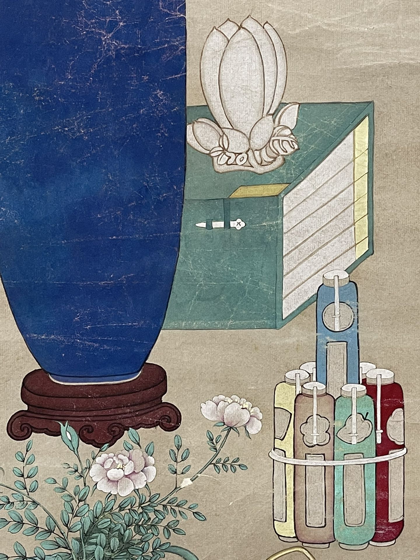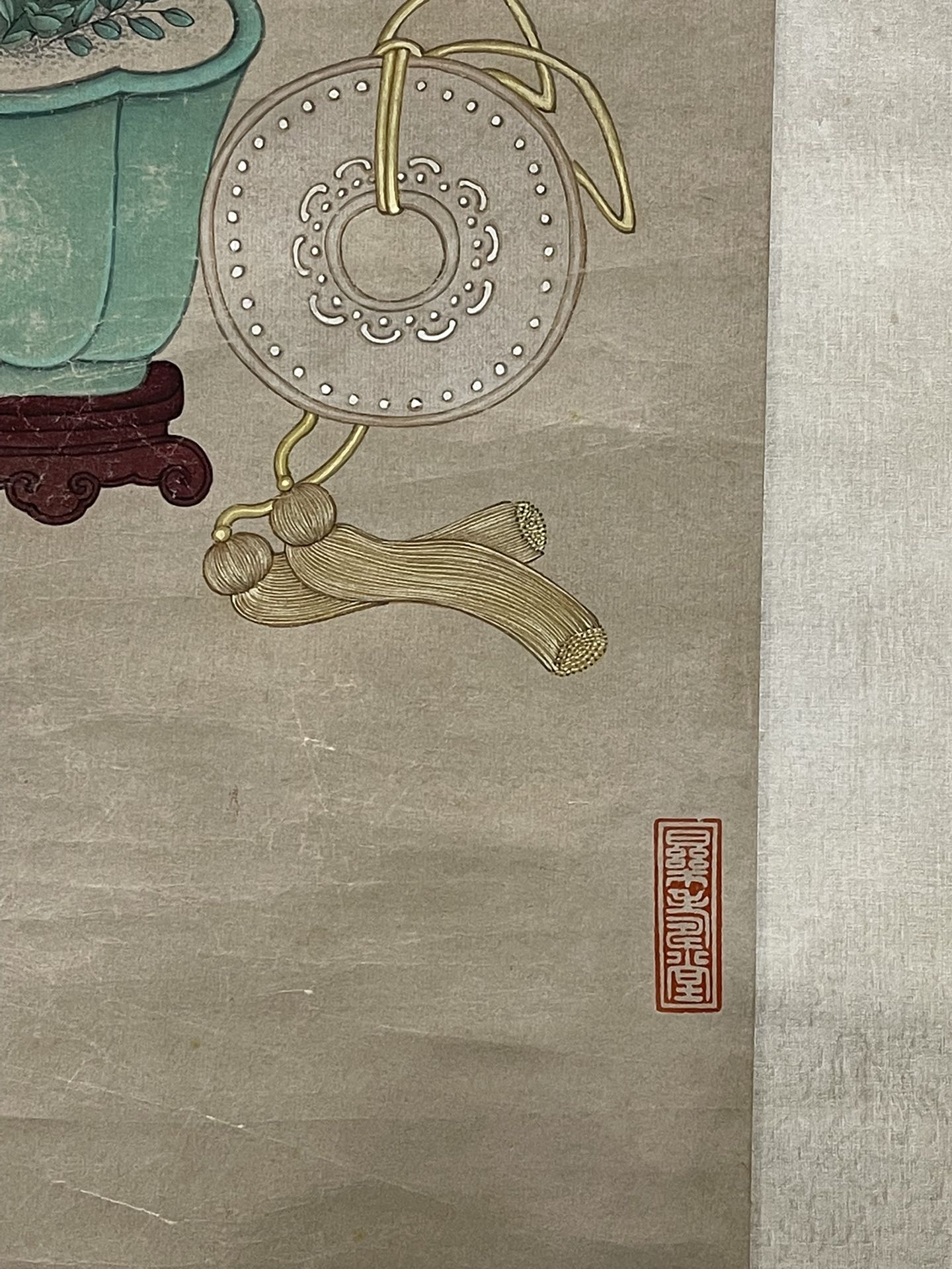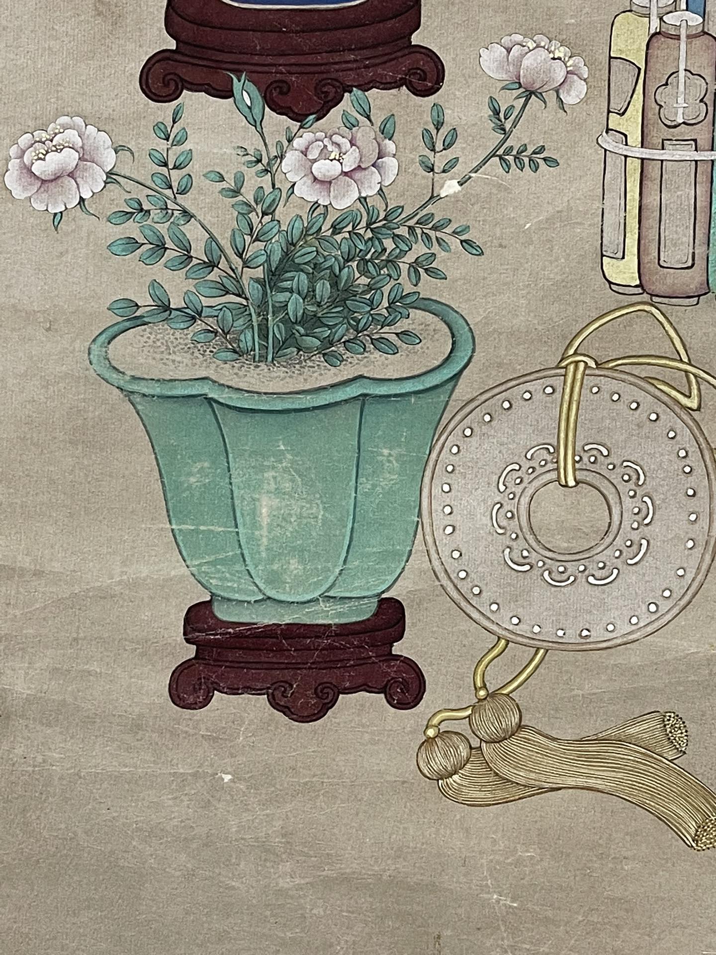 藏家朋友您好,感谢您对我们的信任。此件慈禧清供图,从图片上看,画的很好,有宫廷味道的,但款识疑为后添款,印章也是疑似新打的,个人认为此件应为清末民国画作后改的,谢谢。