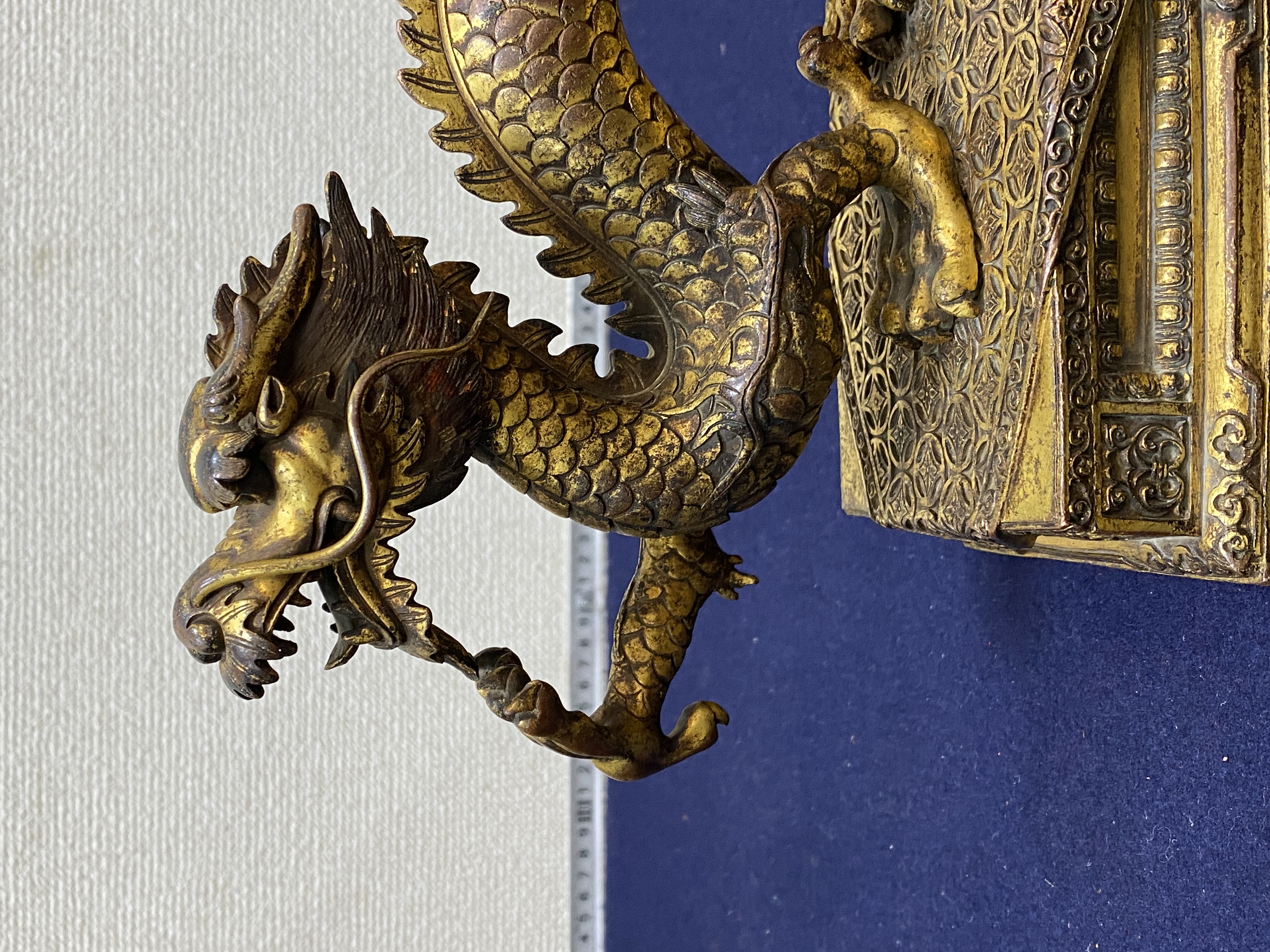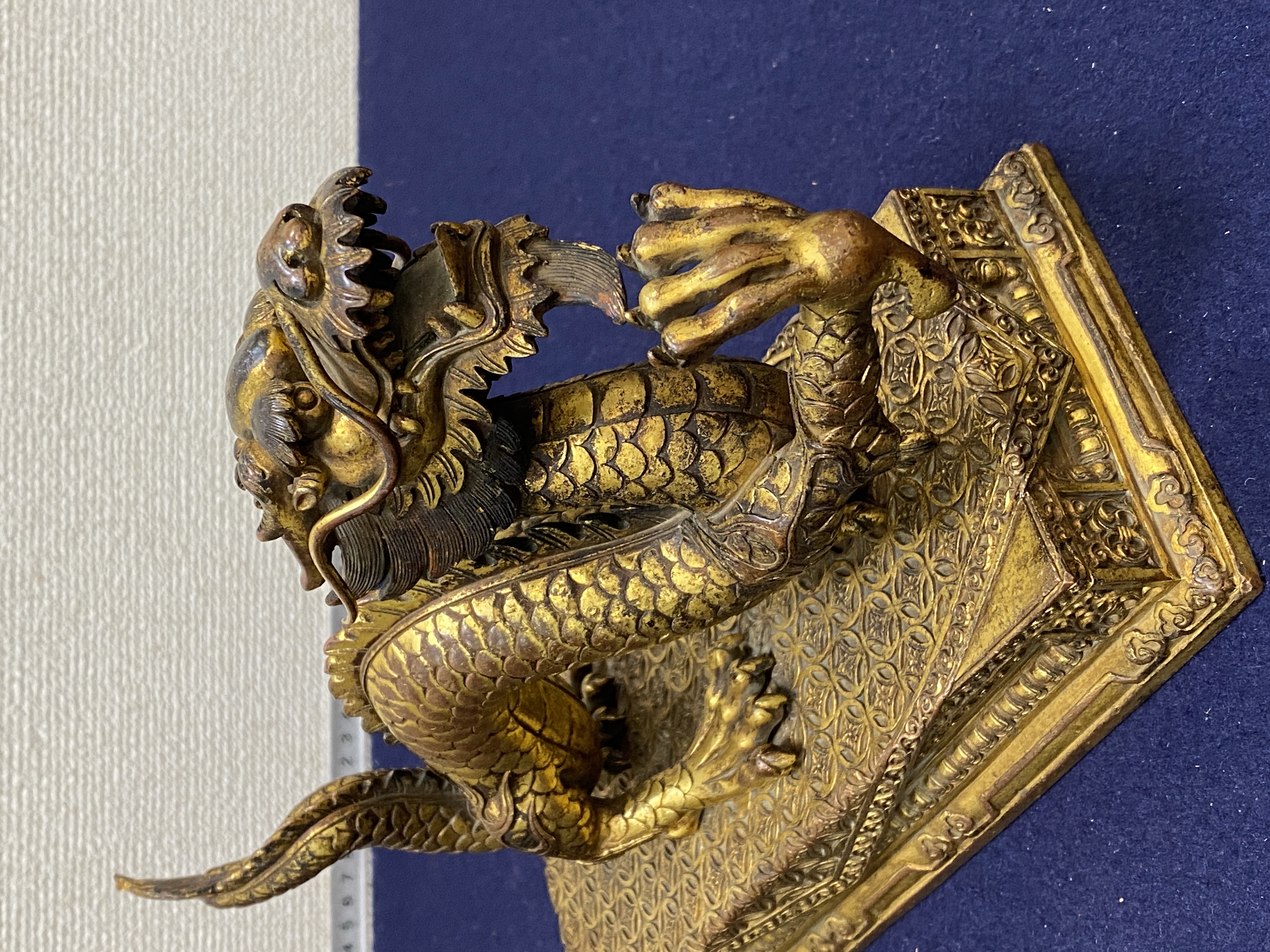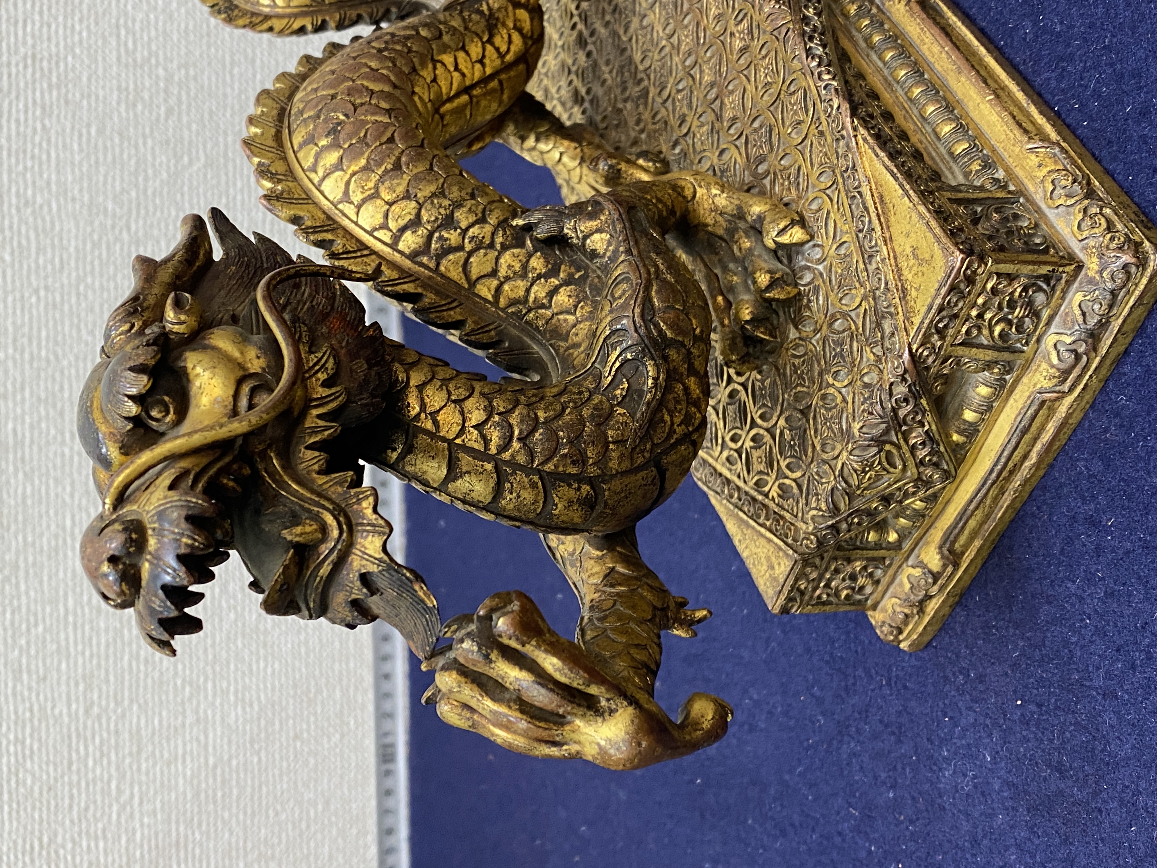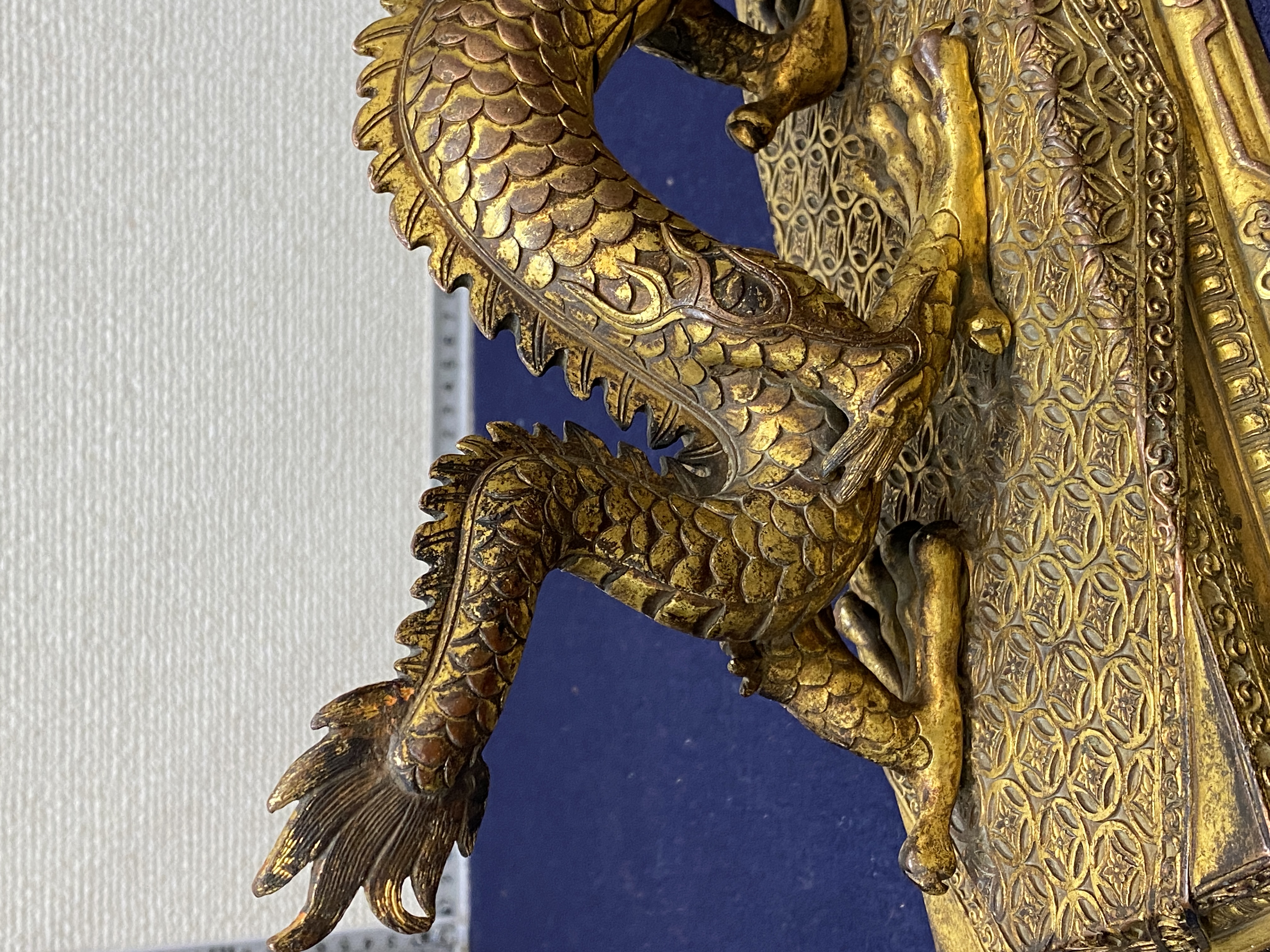 照片上这件藏品作工厚重,纹饰清晰,特别是龙下面的须弥坐作工细致,皮壳自然老旧,局部有磨损,与故宫或圆明园里的铜摆件十分接近,底部封底也是淸中风格,款錾刻工整,照片看东西对,是清代乾隆.