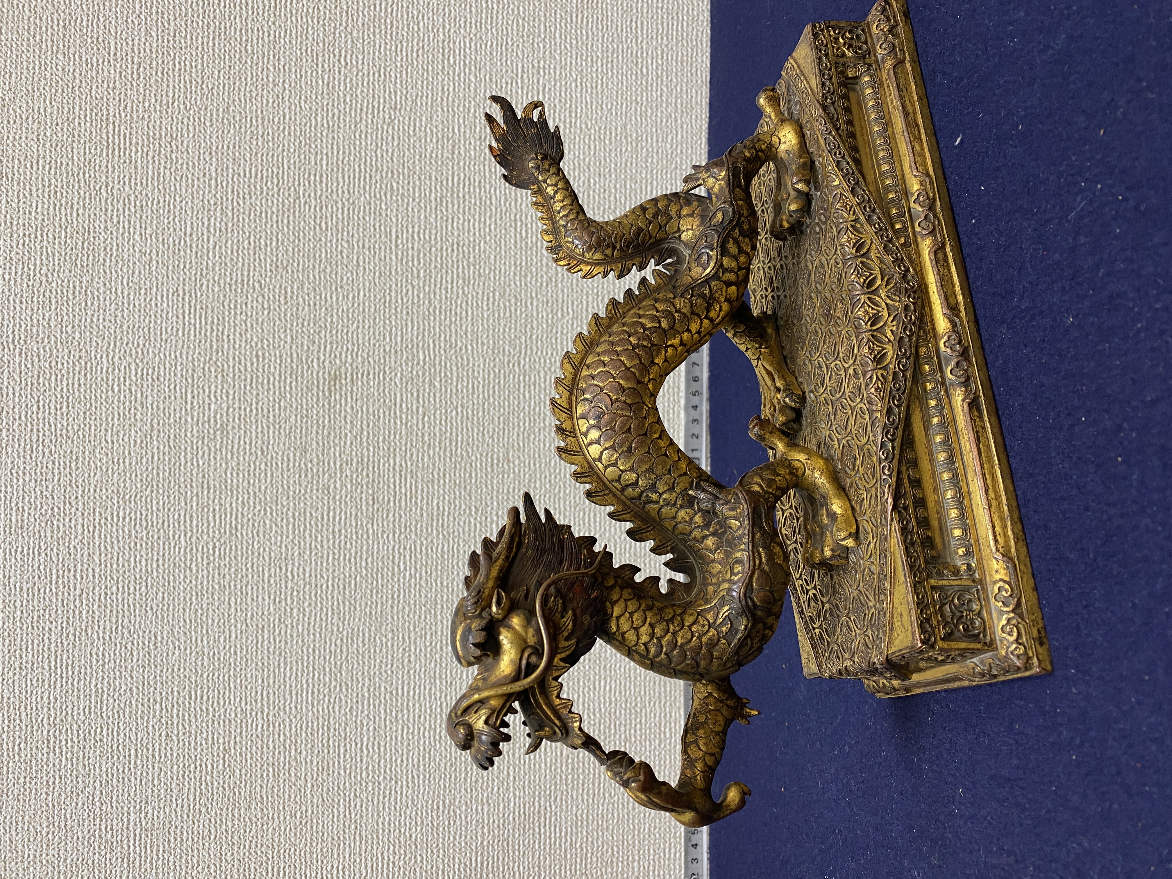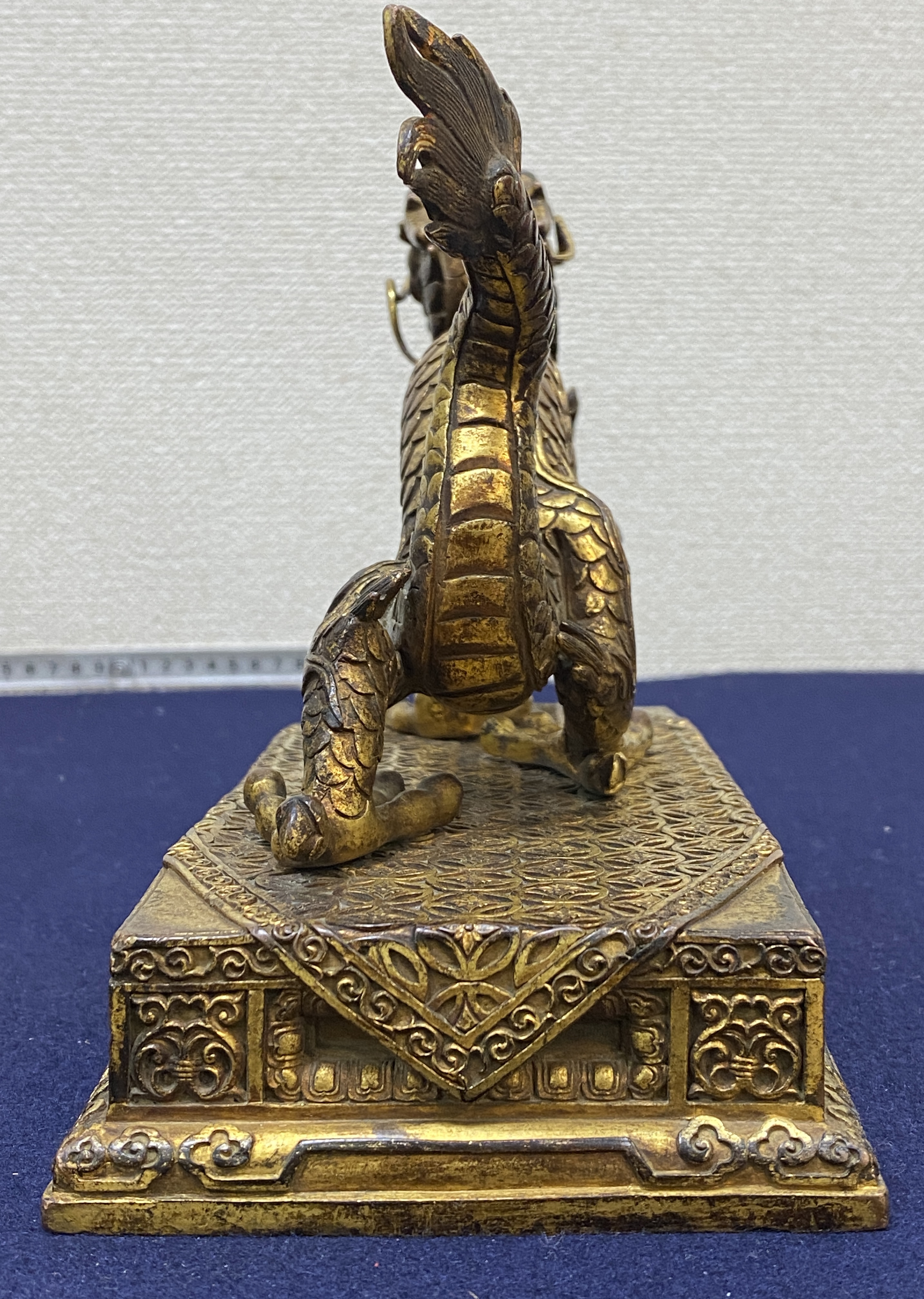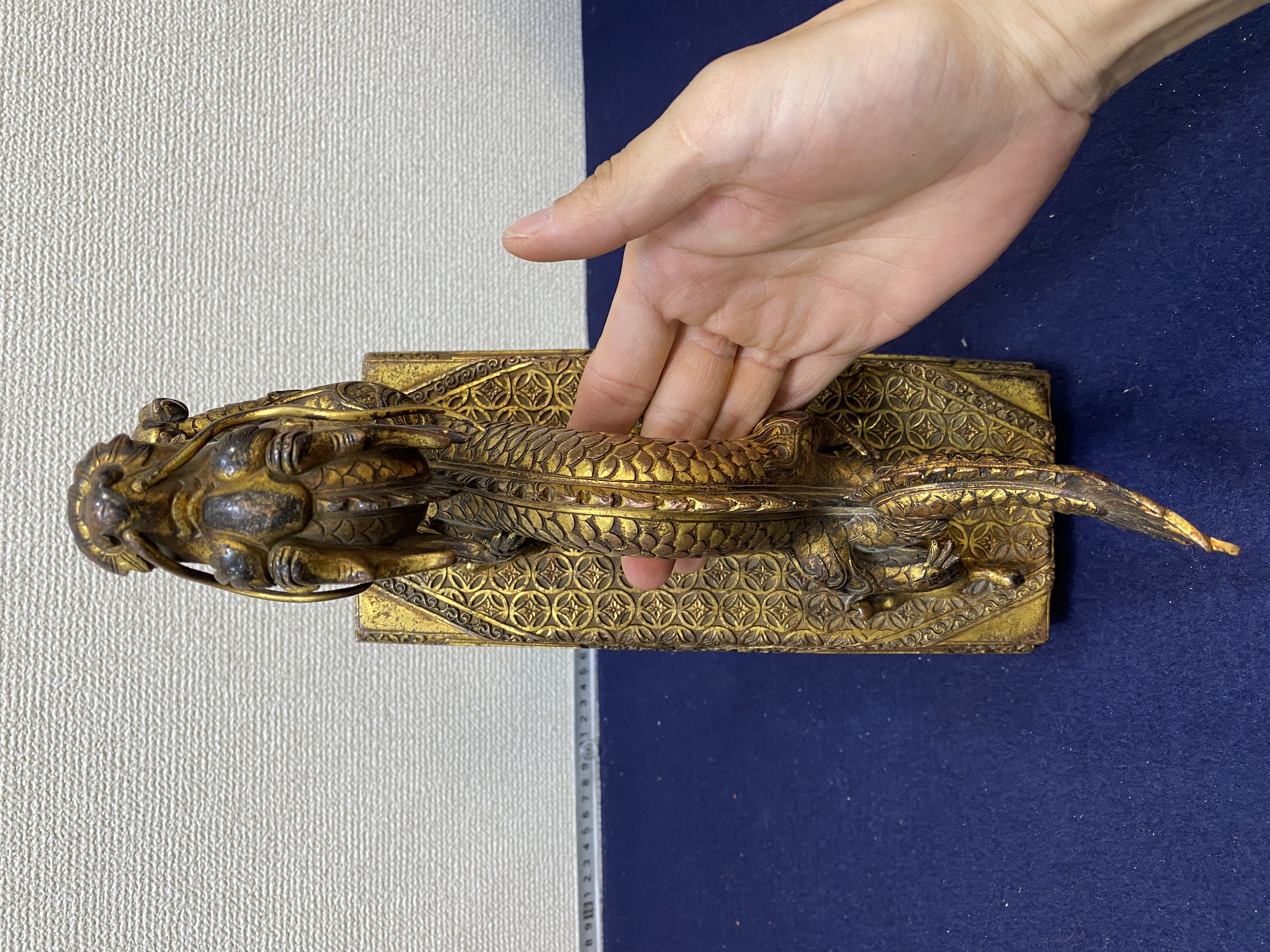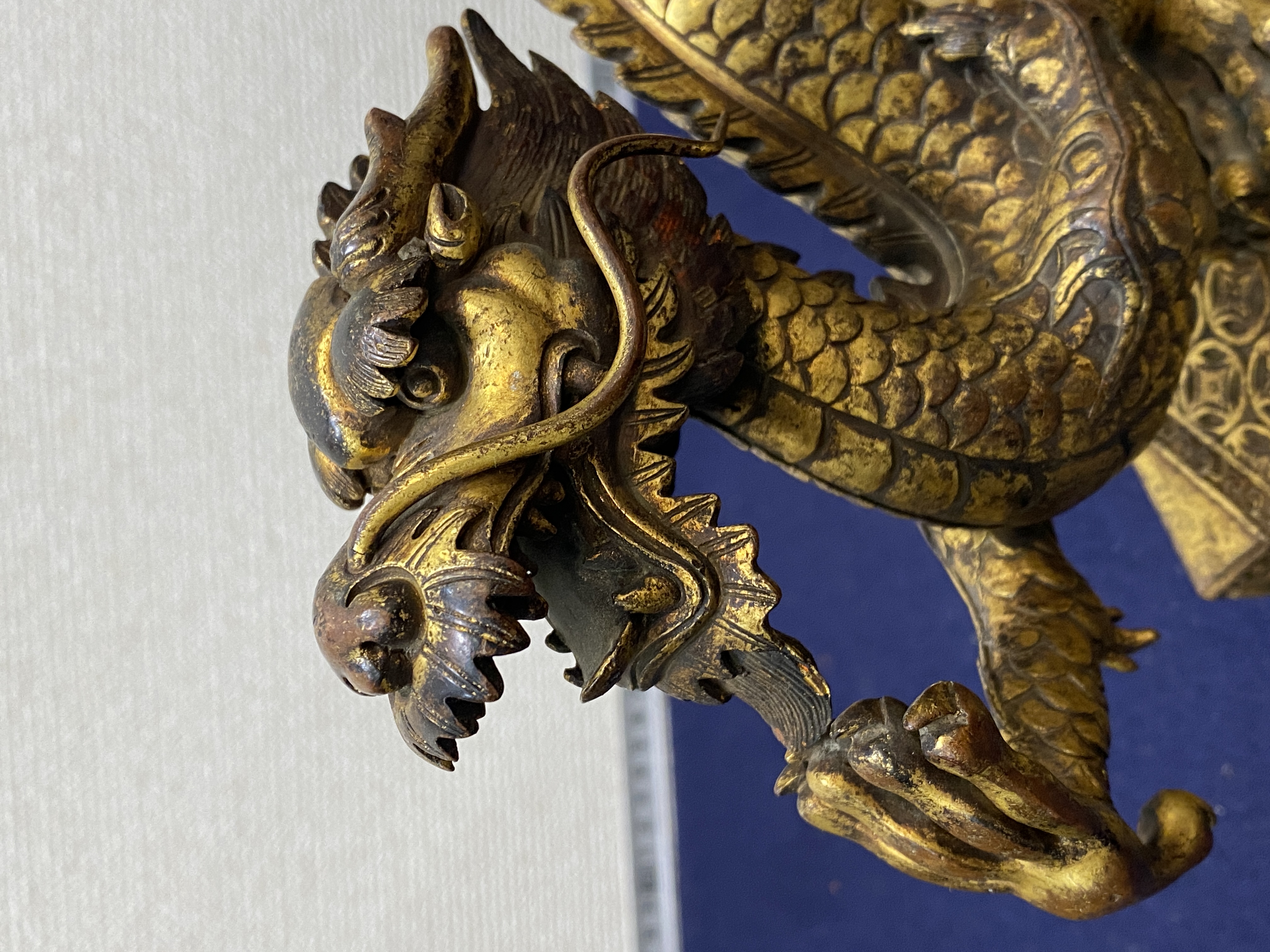 照片上这件藏品作工厚重,纹饰清晰,特别是龙下面的须弥坐作工细致,皮壳自然老旧,局部有磨损,与故宫或圆明园里的铜摆件十分接近,底部封底也是淸中风格,款錾刻工整,照片看东西对,是清代乾隆.