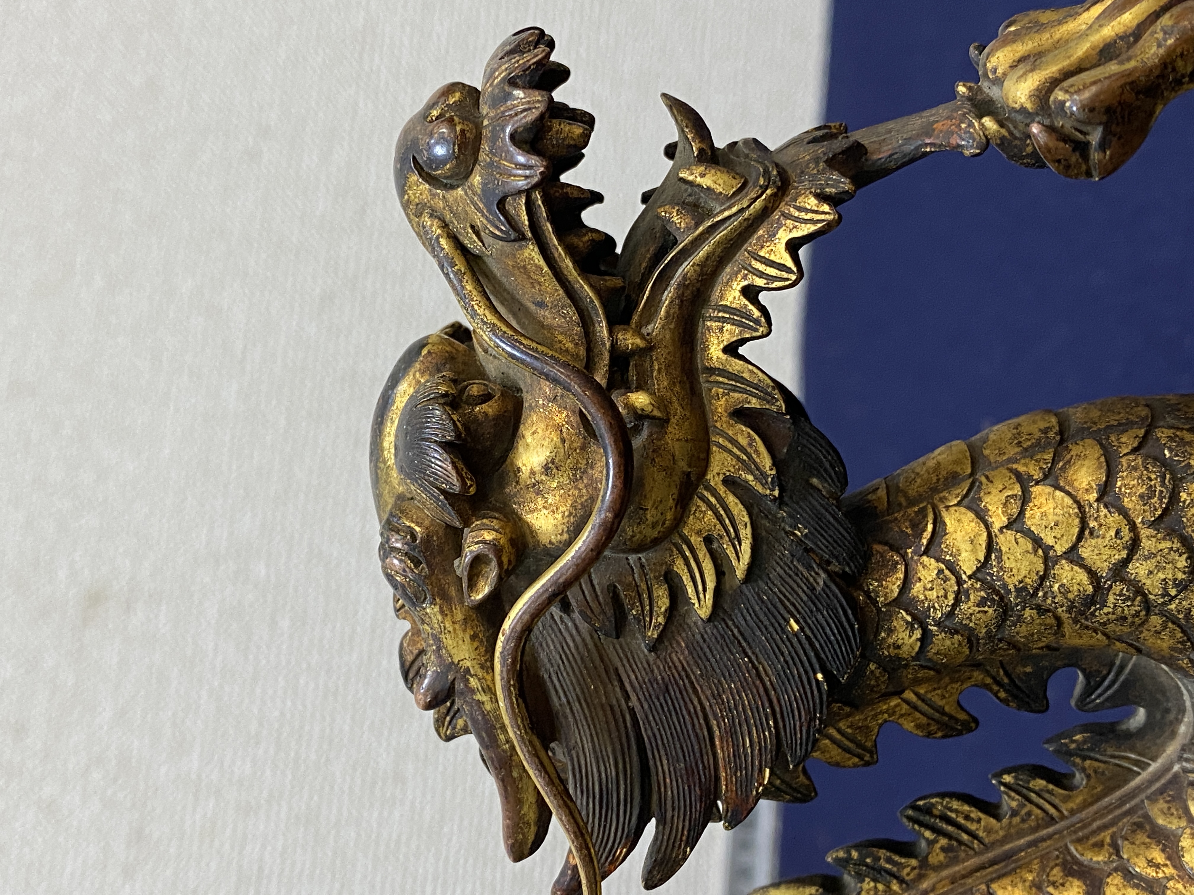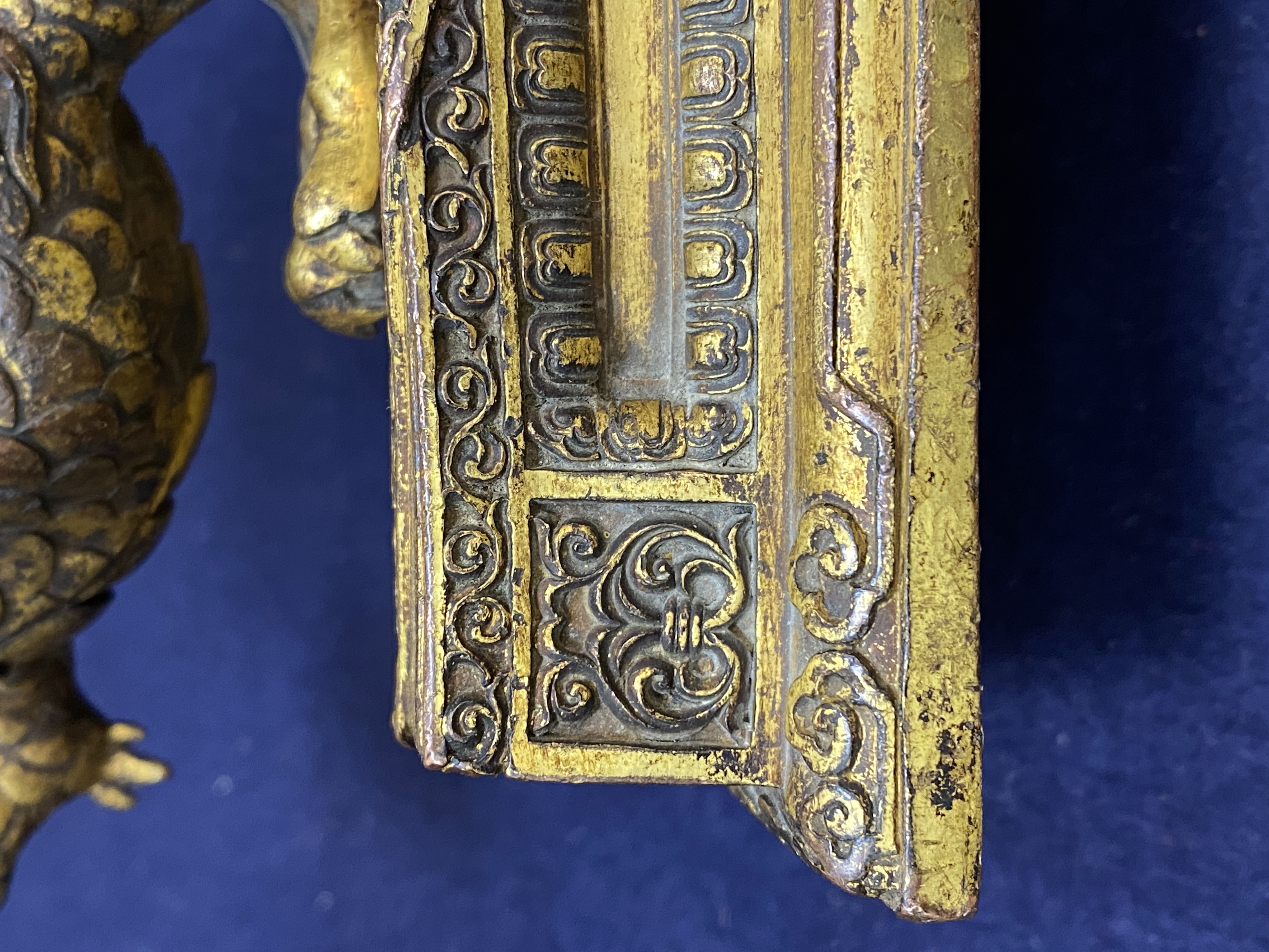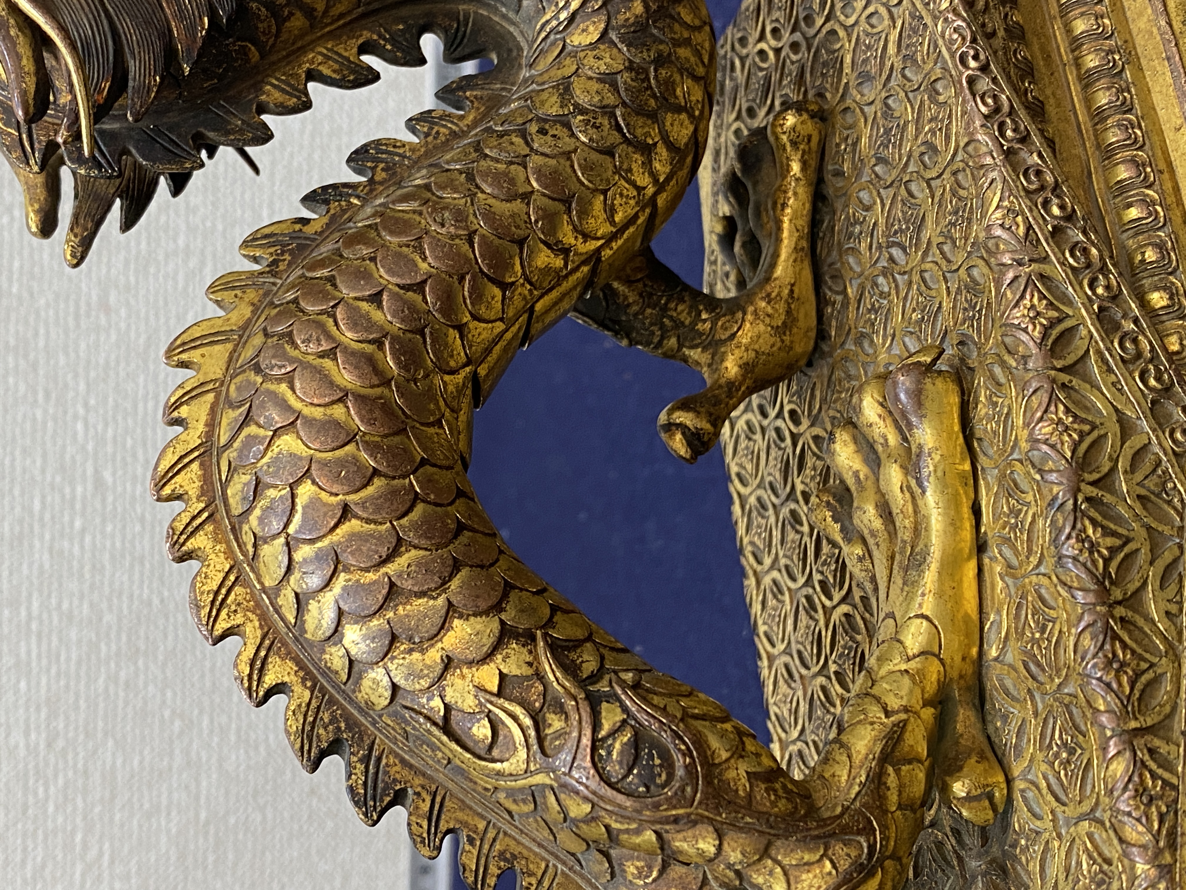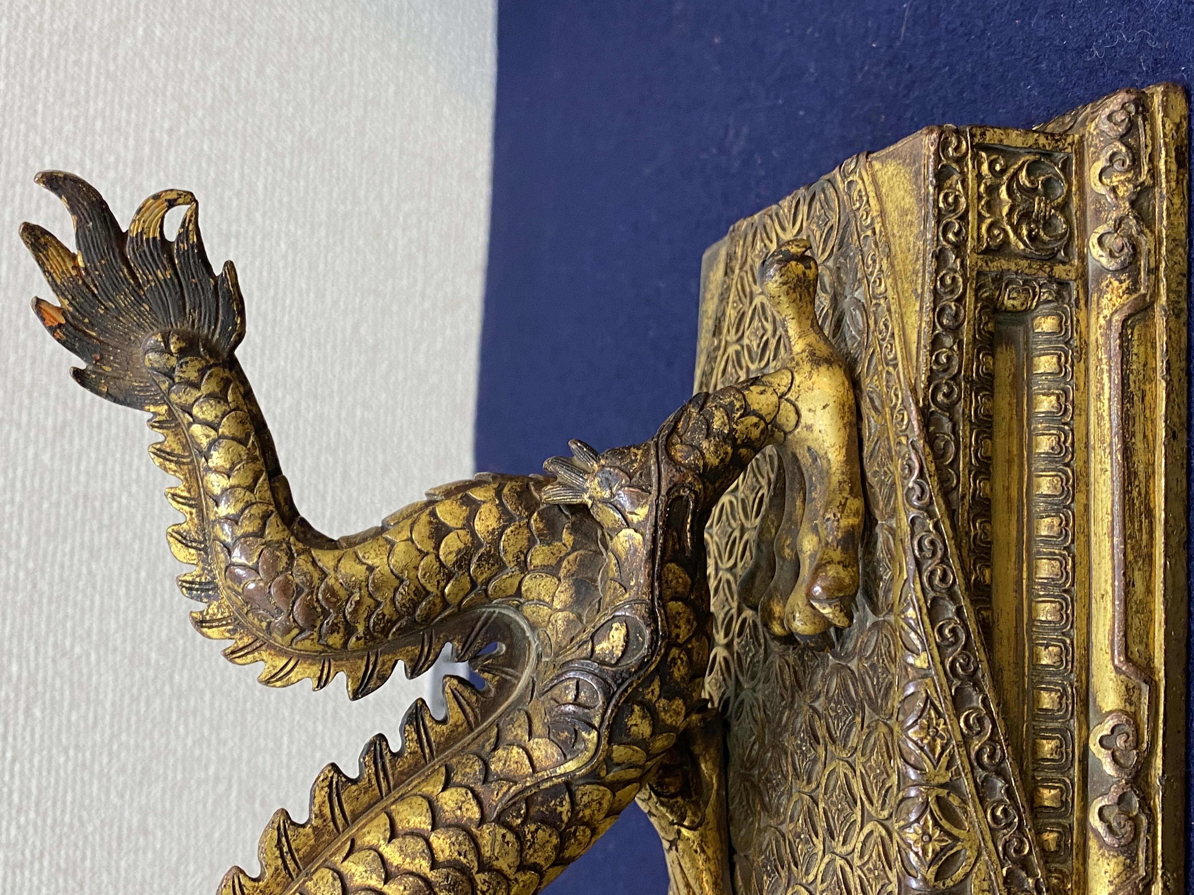 照片上这件藏品作工厚重,纹饰清晰,特别是龙下面的须弥坐作工细致,皮壳自然老旧,局部有磨损,与故宫或圆明园里的铜摆件十分接近,底部封底也是淸中风格,款錾刻工整,照片看东西对,是清代乾隆.
