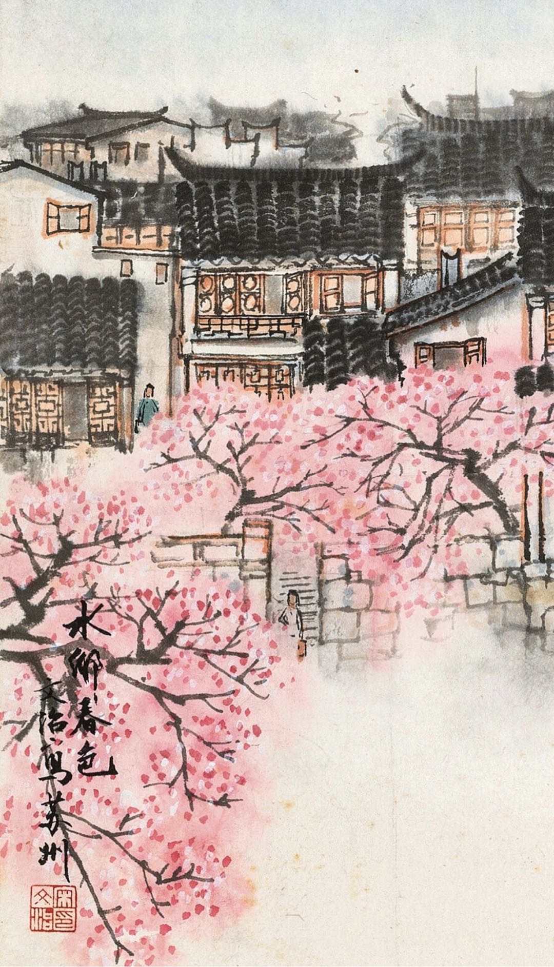 这张作品款写的是文治,印章也是宋文治。宋文治是新金陵画派的著名代表性画家,他习惯于从高视角画俯瞰的山水,湖边的景象,这张画的是苏州这种典型的建筑和小拱桥,画的春天的景色,春天桃花的这个渲染,也是浓淡相宜,画法没问题,也非常干净利落,个人看真。