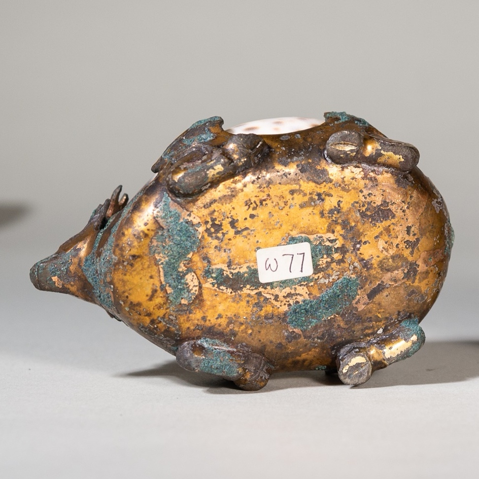 图片看真,看战汉时期,小鹿表情可爱喜人,后背海螺没有自然沁色,疑似后装,有一对鹿角疑似有修请仔细上手端详,器物底部鎏金成麻窝状是跟出土环境有关,这样的器物出土量较少所以也较为珍贵、价位国内国外不同我也不太了解、万分抱歉!
