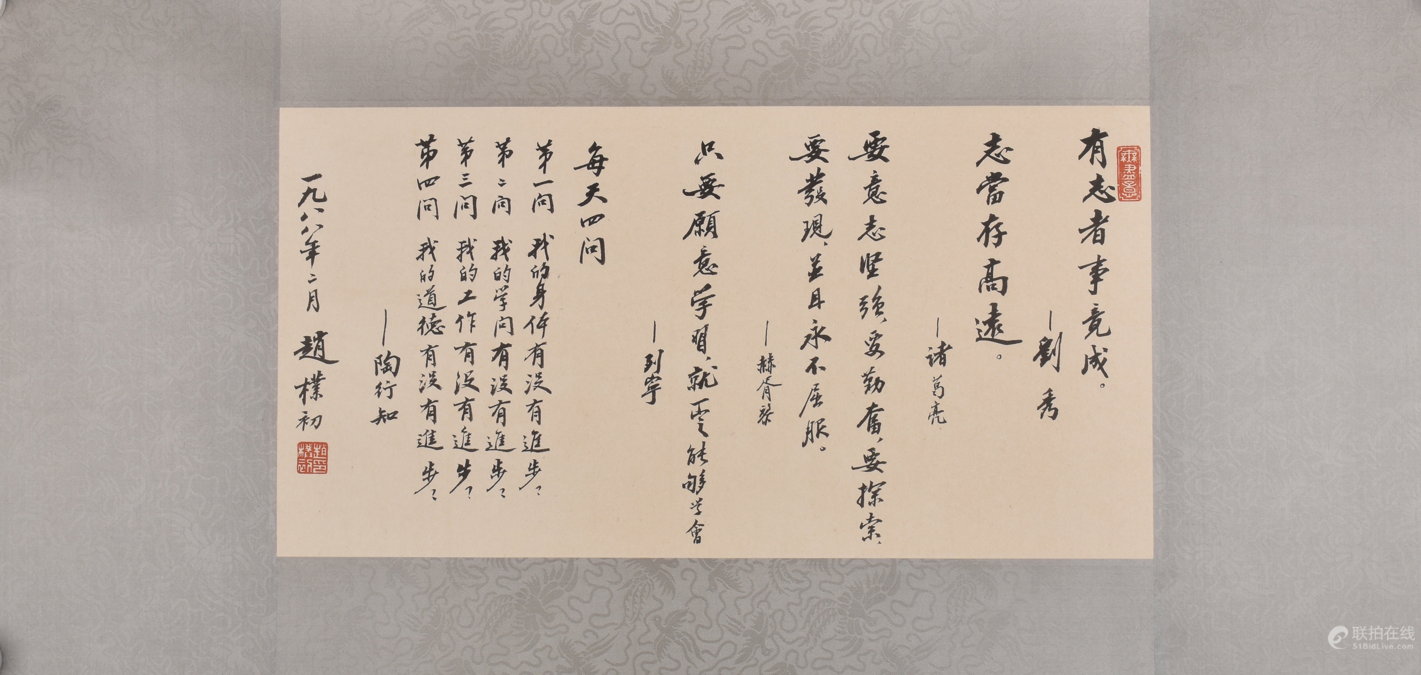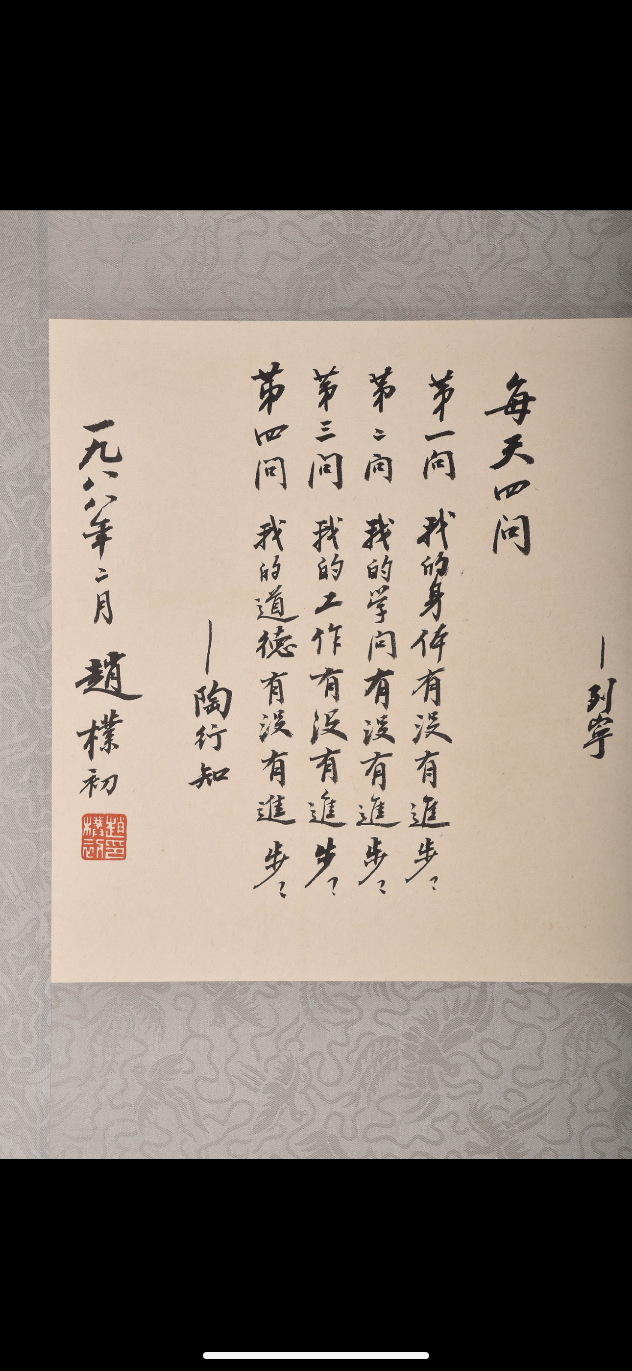 此幅作品不是赵朴初的真迹,是仿品:虽然书写认真,整体效果不错,但此作线条,力量,流畅不够,赵老的书法俊朗洒脱,豪迈凝重,在一波一碟、一提一转之间,仿佛妙手点化,神韵毕现。可谓集众家之长,形成了自家风范,在书法界久负盛名,世人称之为“赵体”,有自己的风格,所以是仿品