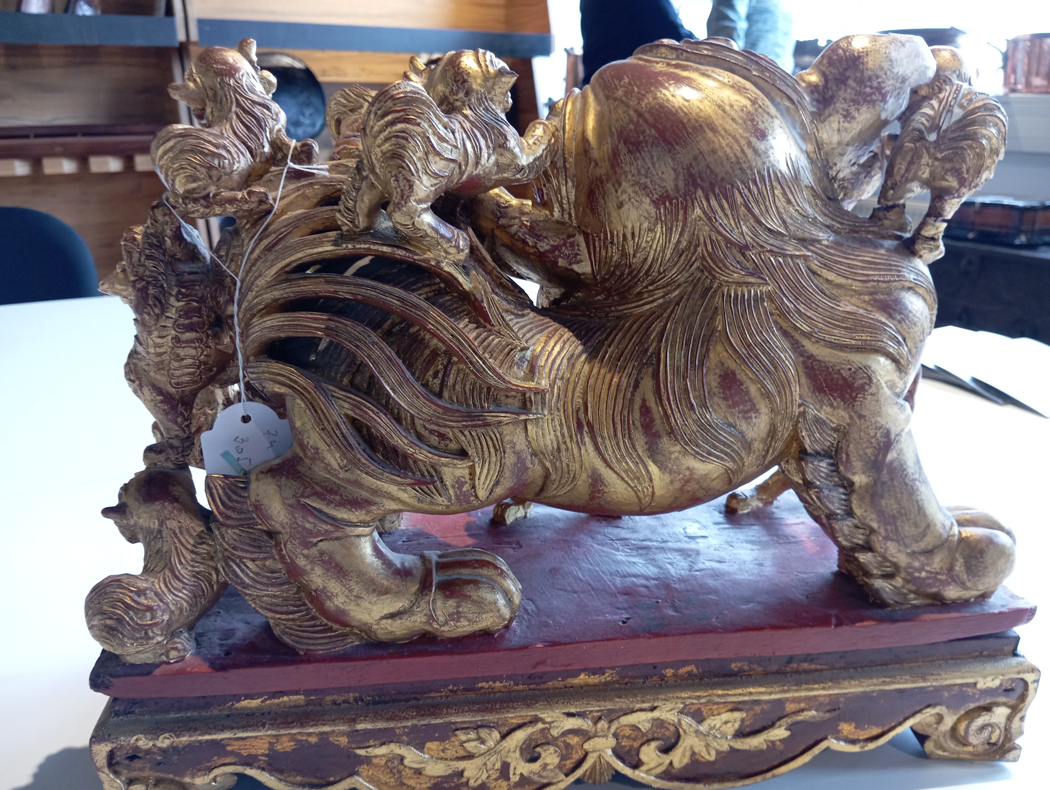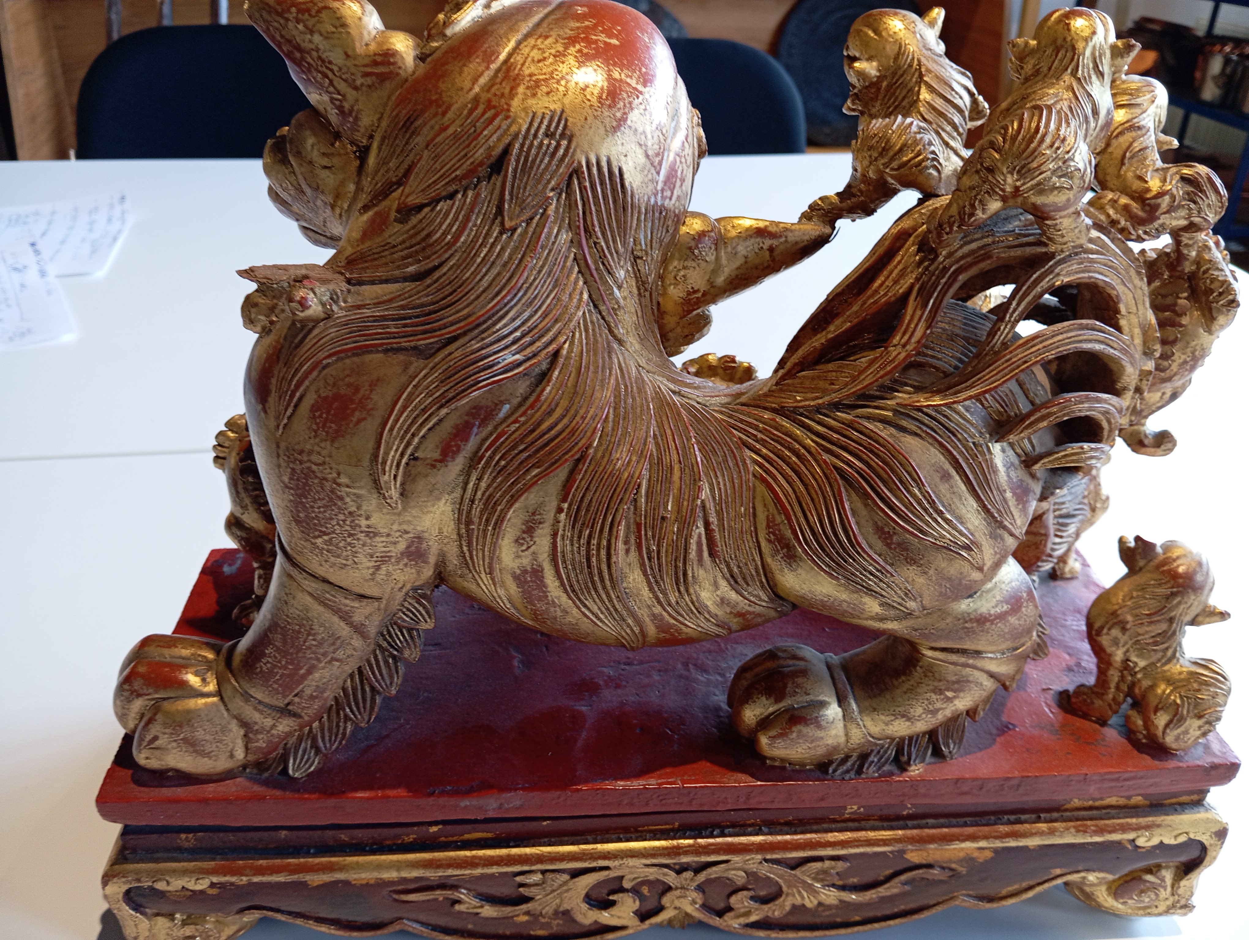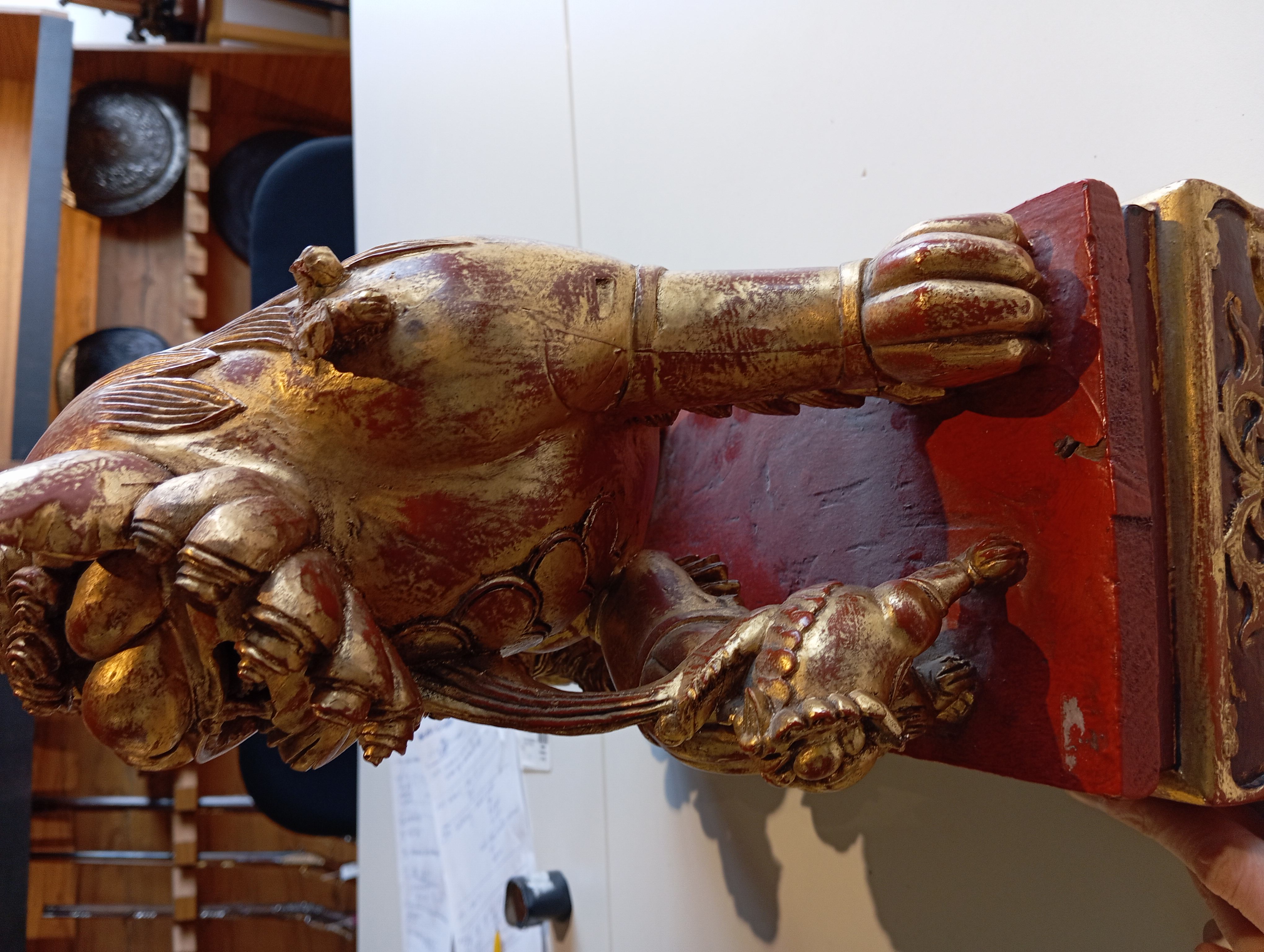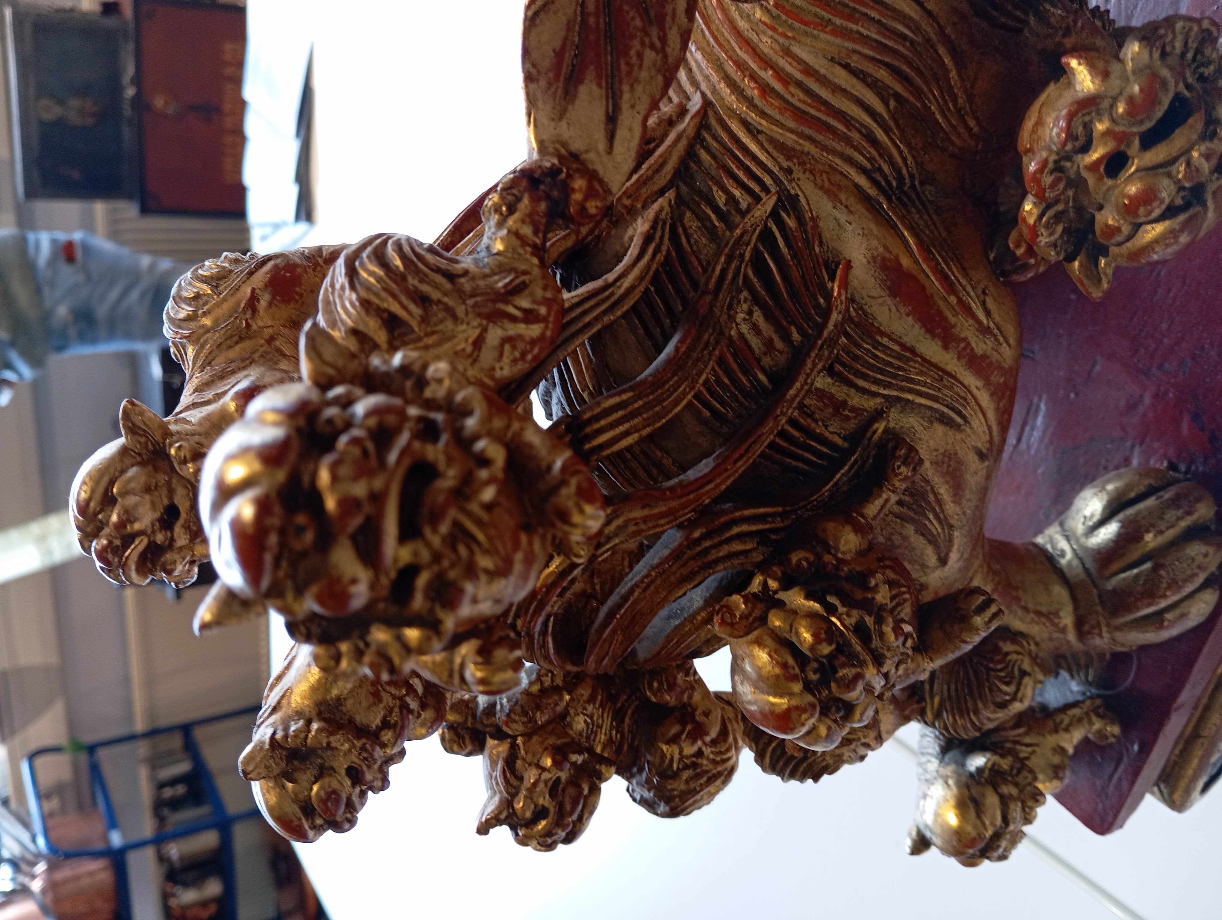 藏友你好,欢迎来到鉴宝平台,从图片上看,这是一只狮子,狮子从古至今都是一种吉祥的瑞兽。图片中狮子做工精湛,线条儿流畅。威武雄壮,从母狮到幼狮彰显活力;这种狮子雕刻工艺在清早期到民国在潮州木雕中非常盛行,并且整体罩金漆,这种罩金漆的工艺更符合潮州木雕的工艺;而且寓意吉祥有母狮、小狮寓意太师少保之称,通过图片儿具体情况,还有图片中显示老化痕迹、综合上述应该是清代中晚期潮州木雕工艺。(根据您发的尺寸单个应该在2万元左右,以此类推,因为我不知道您这一共几支。)(图片鉴定 仅供参考)
