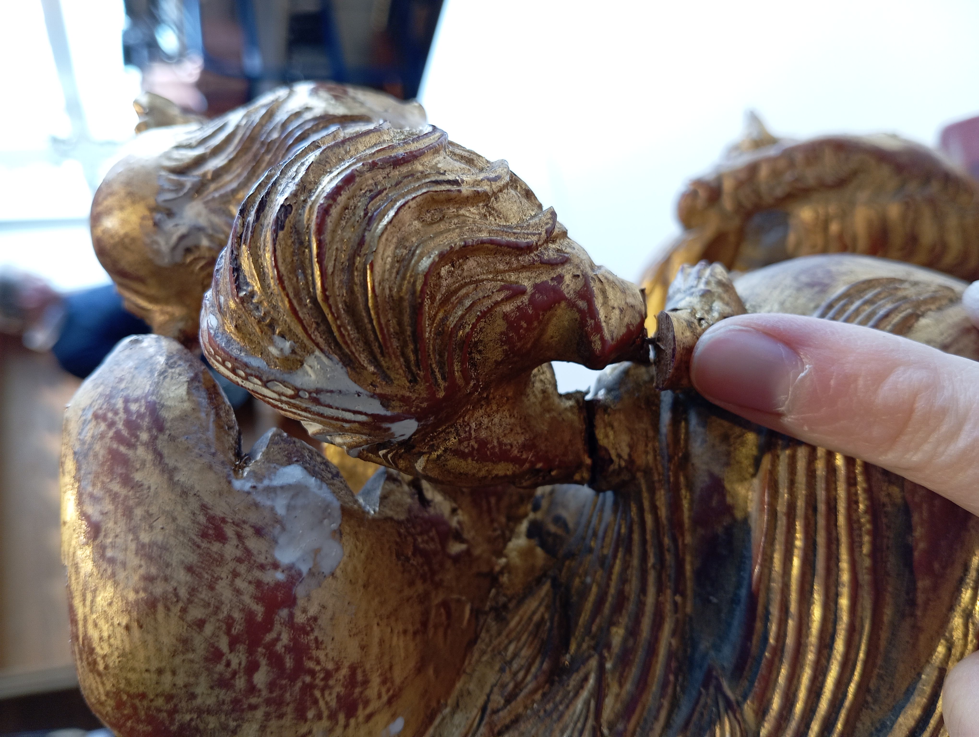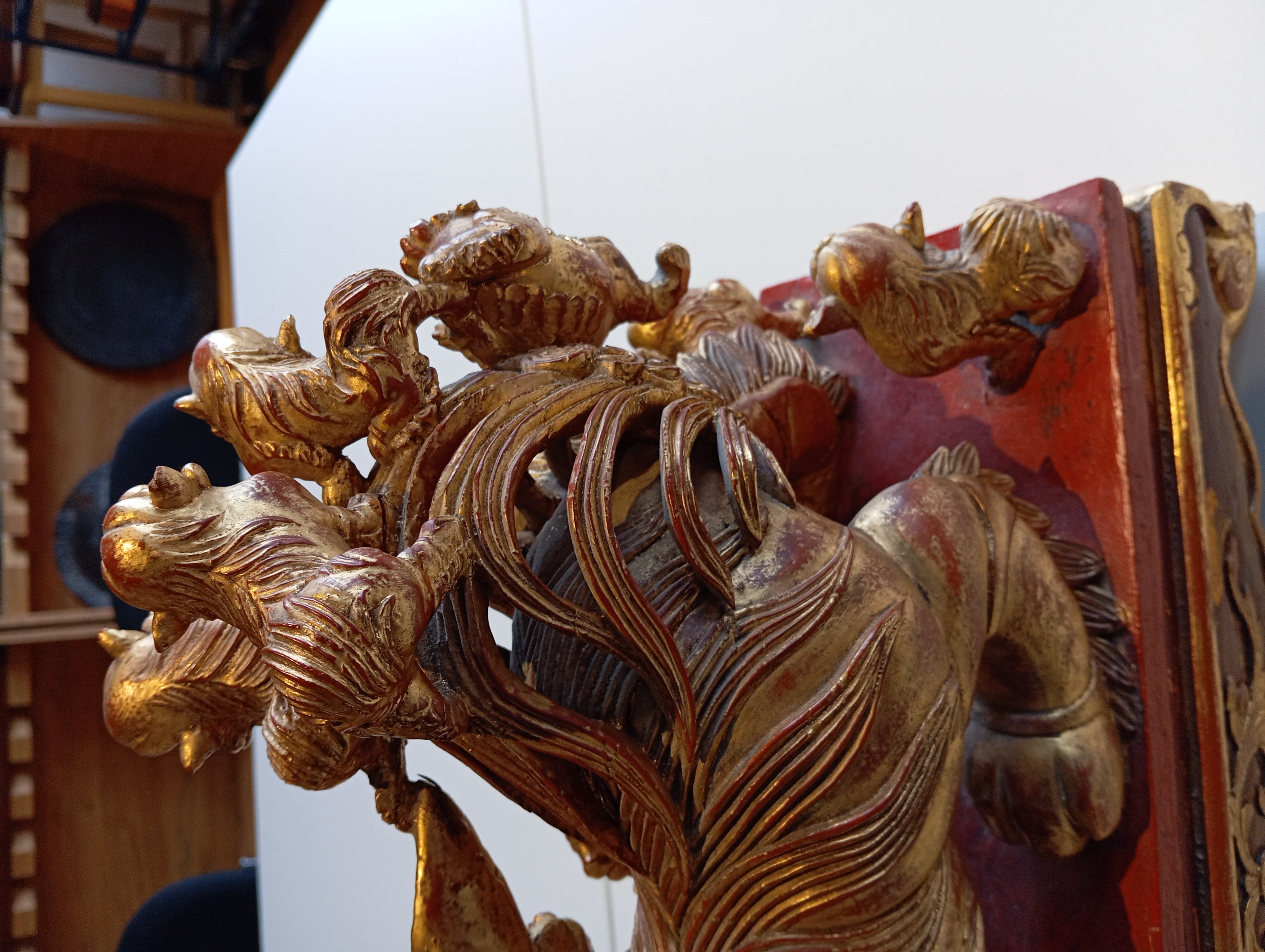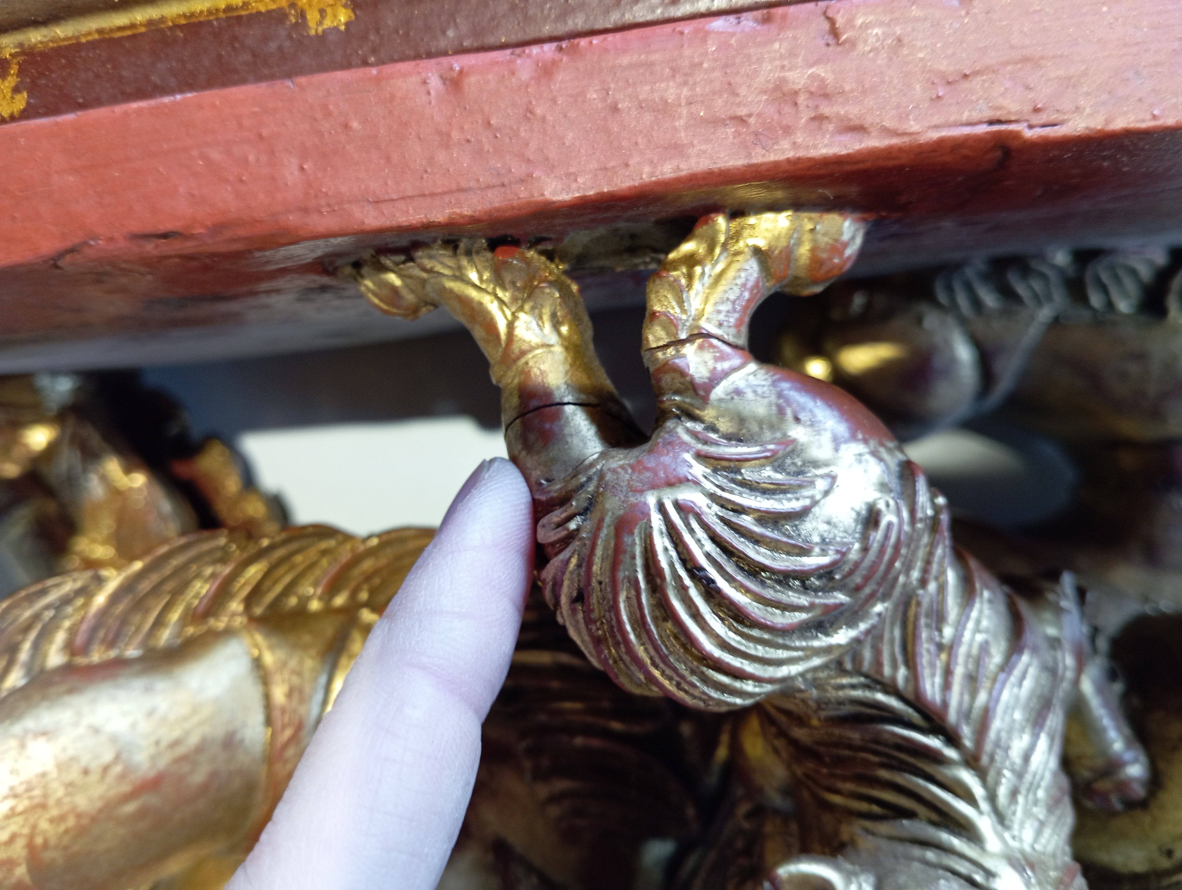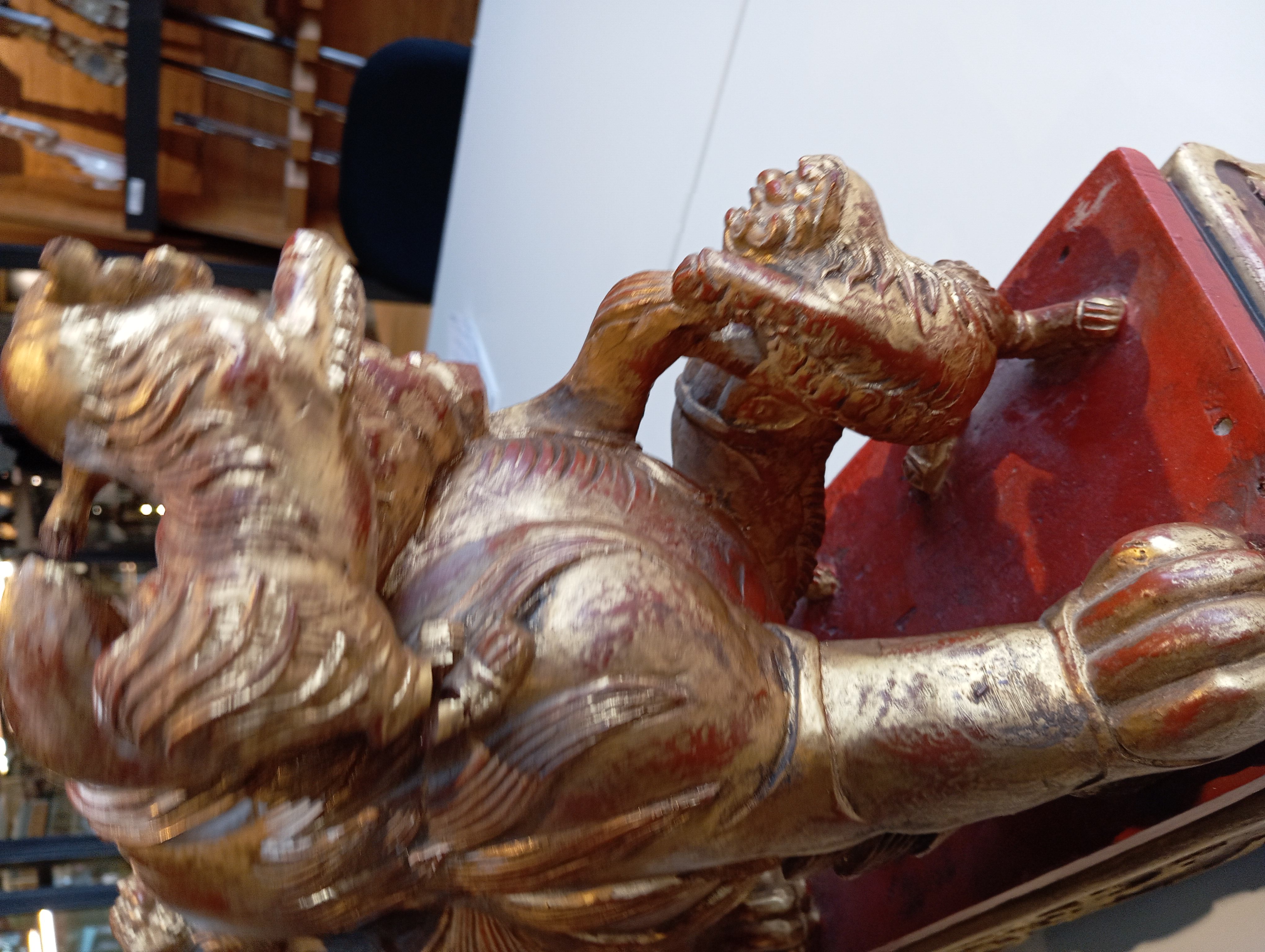 藏友你好,欢迎来到鉴宝平台,从图片上看,这是一只狮子,狮子从古至今都是一种吉祥的瑞兽。图片中狮子做工精湛,线条儿流畅。威武雄壮,从母狮到幼狮彰显活力;这种狮子雕刻工艺在清早期到民国在潮州木雕中非常盛行,并且整体罩金漆,这种罩金漆的工艺更符合潮州木雕的工艺;而且寓意吉祥有母狮、小狮寓意太师少保之称,通过图片儿具体情况,还有图片中显示老化痕迹、综合上述应该是清代中晚期潮州木雕工艺。(根据您发的尺寸单个应该在2万元左右,以此类推,因为我不知道您这一共几支。)(图片鉴定 仅供参考)