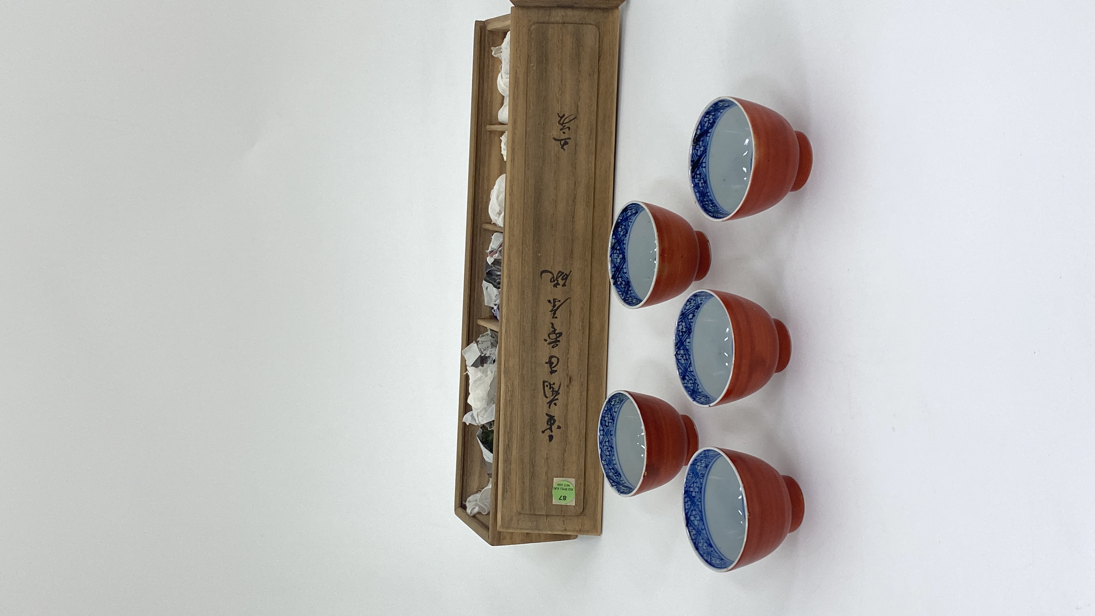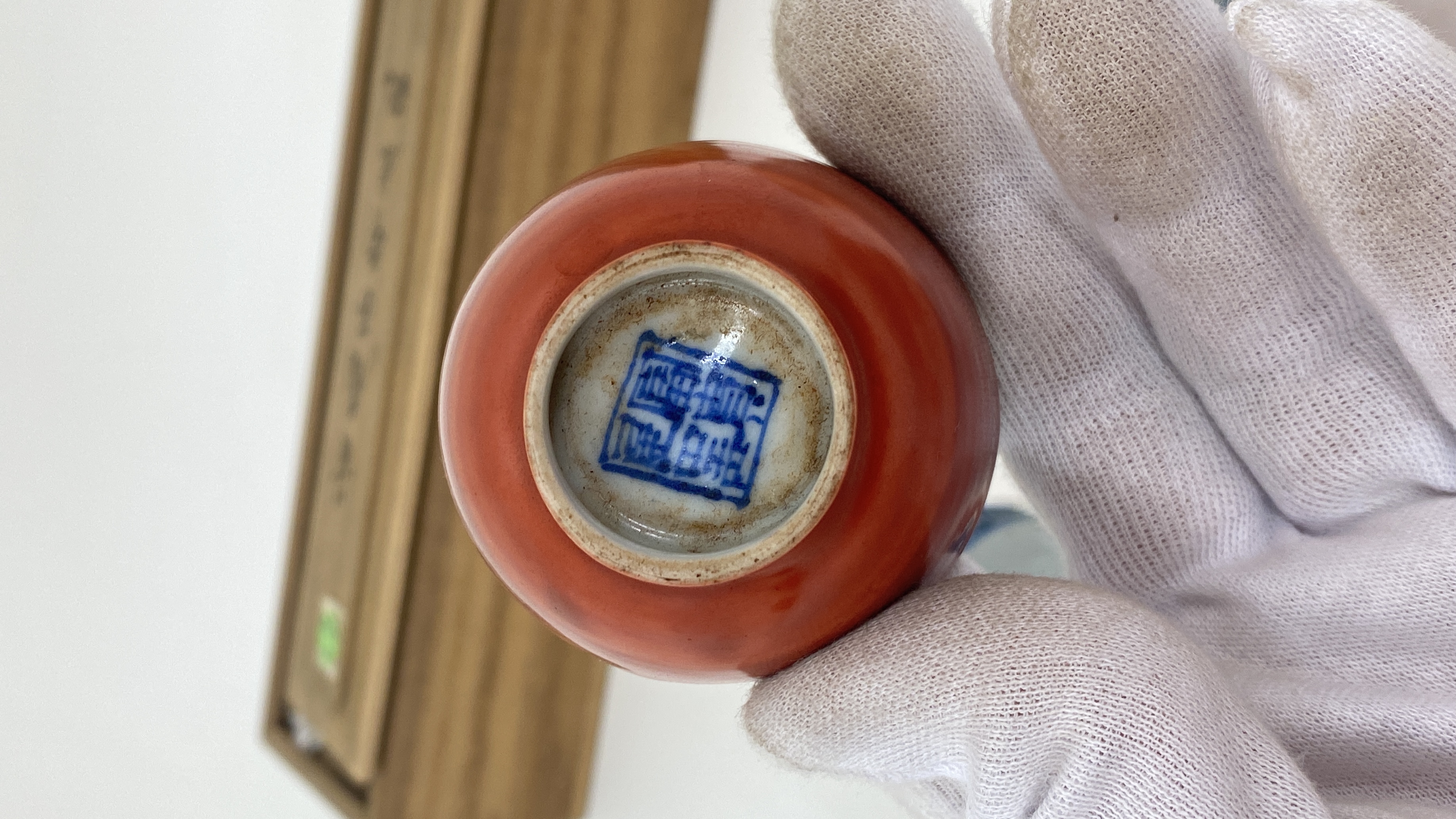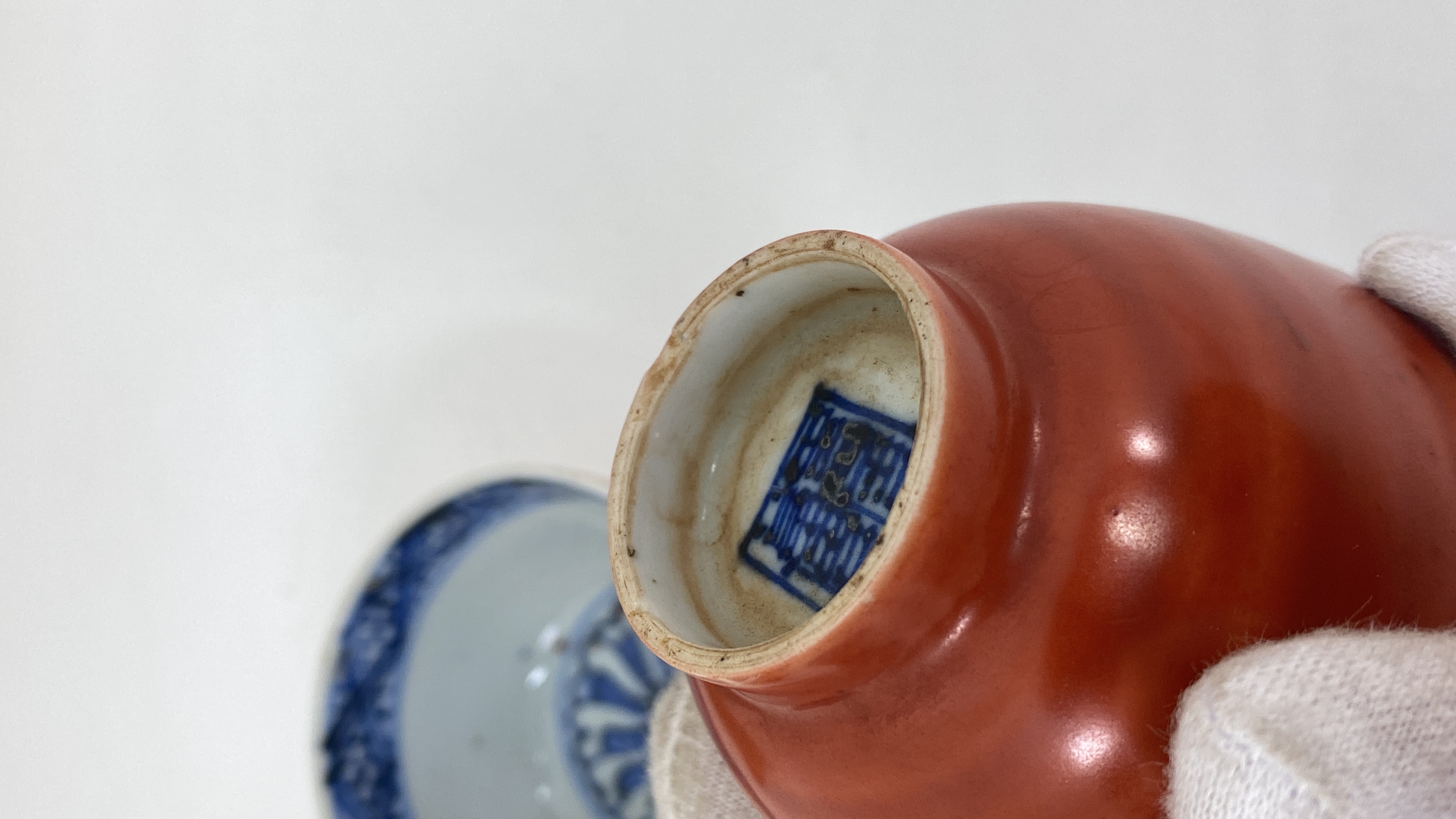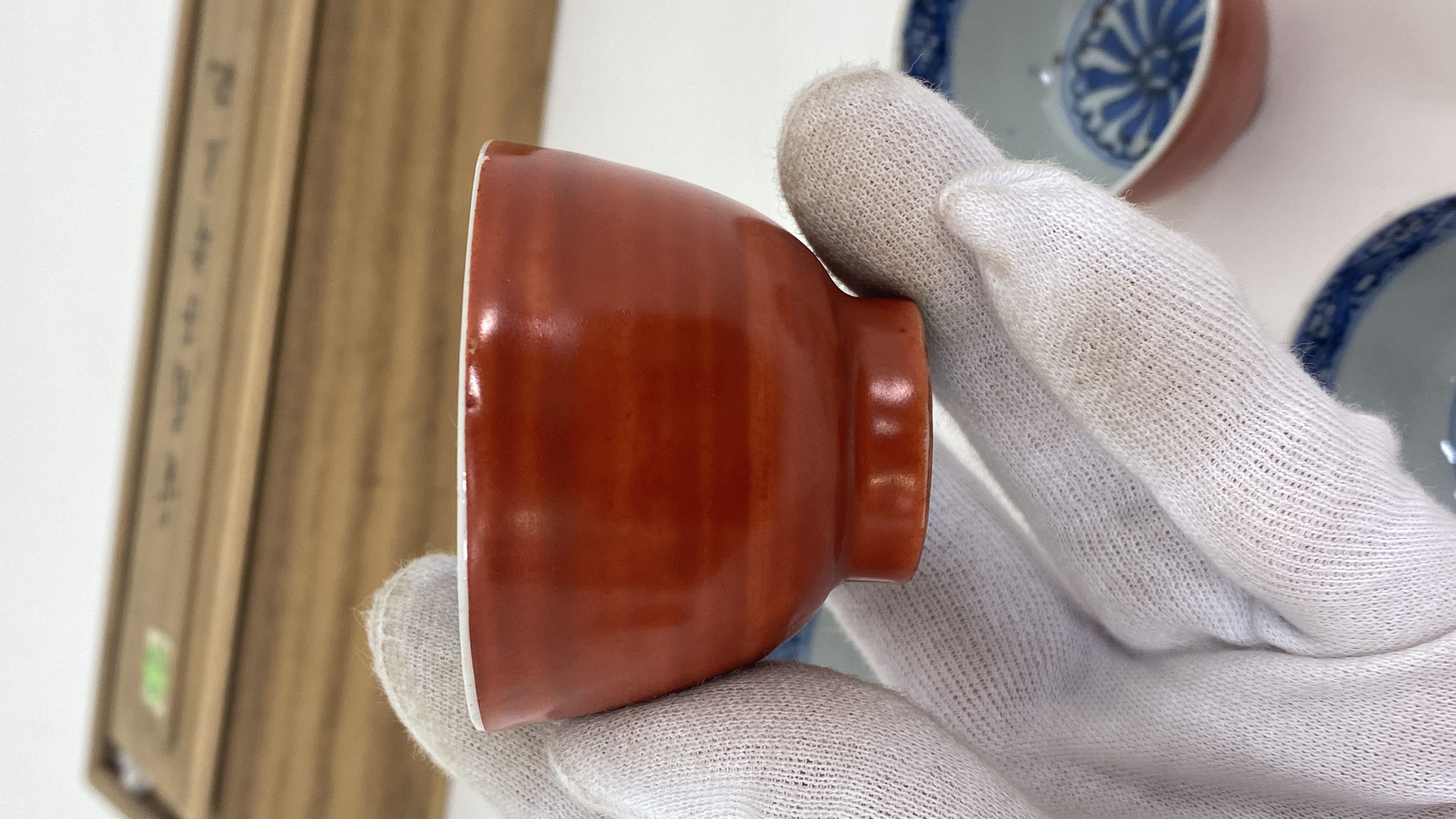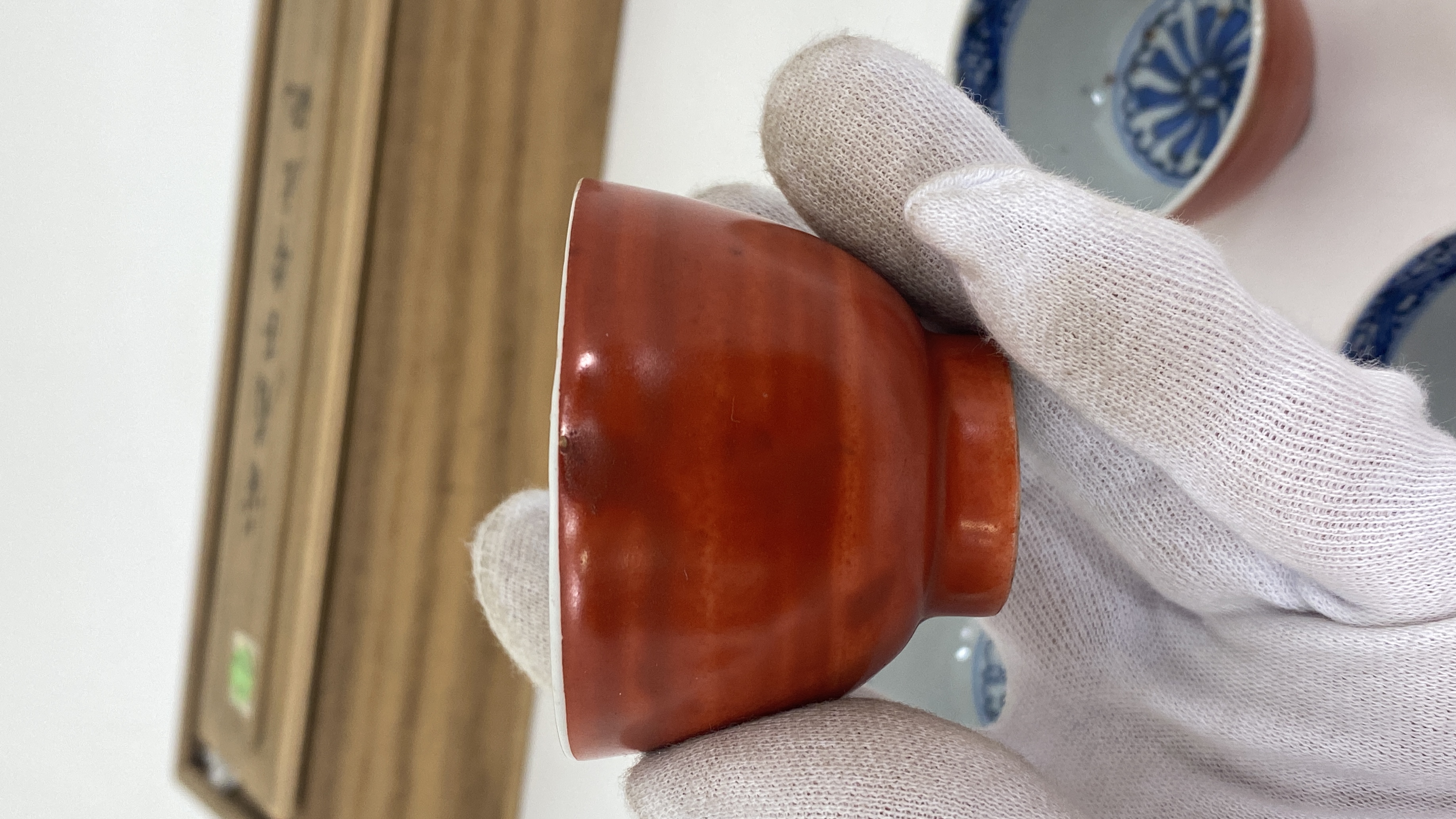 藏友您好,感谢信任,图片我仔细看过,首先我认为这一组茶杯都是老的,其次我认为年份是清代晚期为了迎合日本人的喜好,或者日本人在景德镇定制的,日本藏家很喜欢嘉万风格的制品,从这组杯子上的青花上看是有意加重渲染,缺少嘉靖时期的浓艳带紫的颜色,青花明显漂浮,釉面不平整,偏软,这都是清代晚期的特征,其外侧矾红颜色偏淡,施彩偏薄,并不均匀,个人认为价格便宜才可玩。