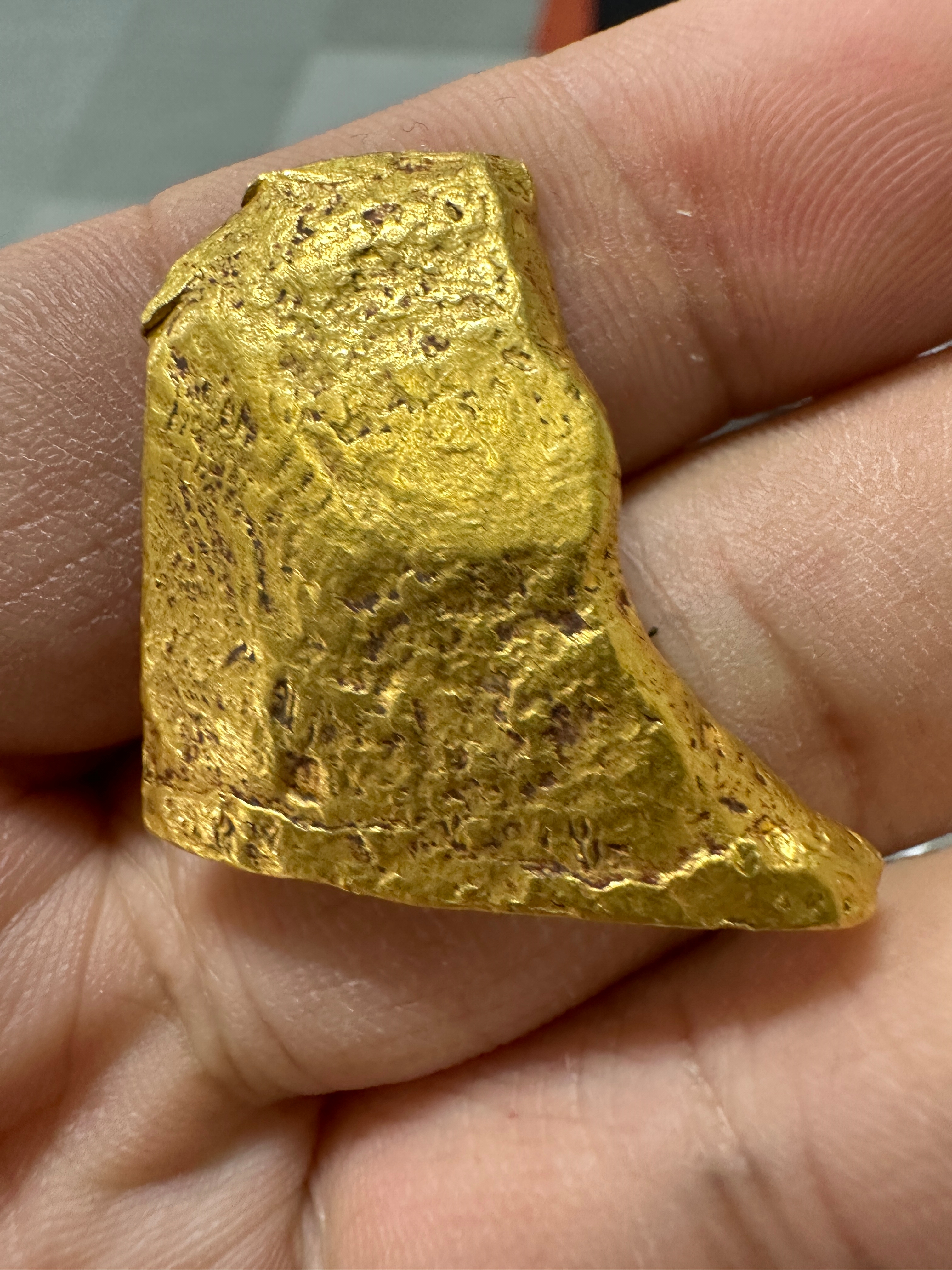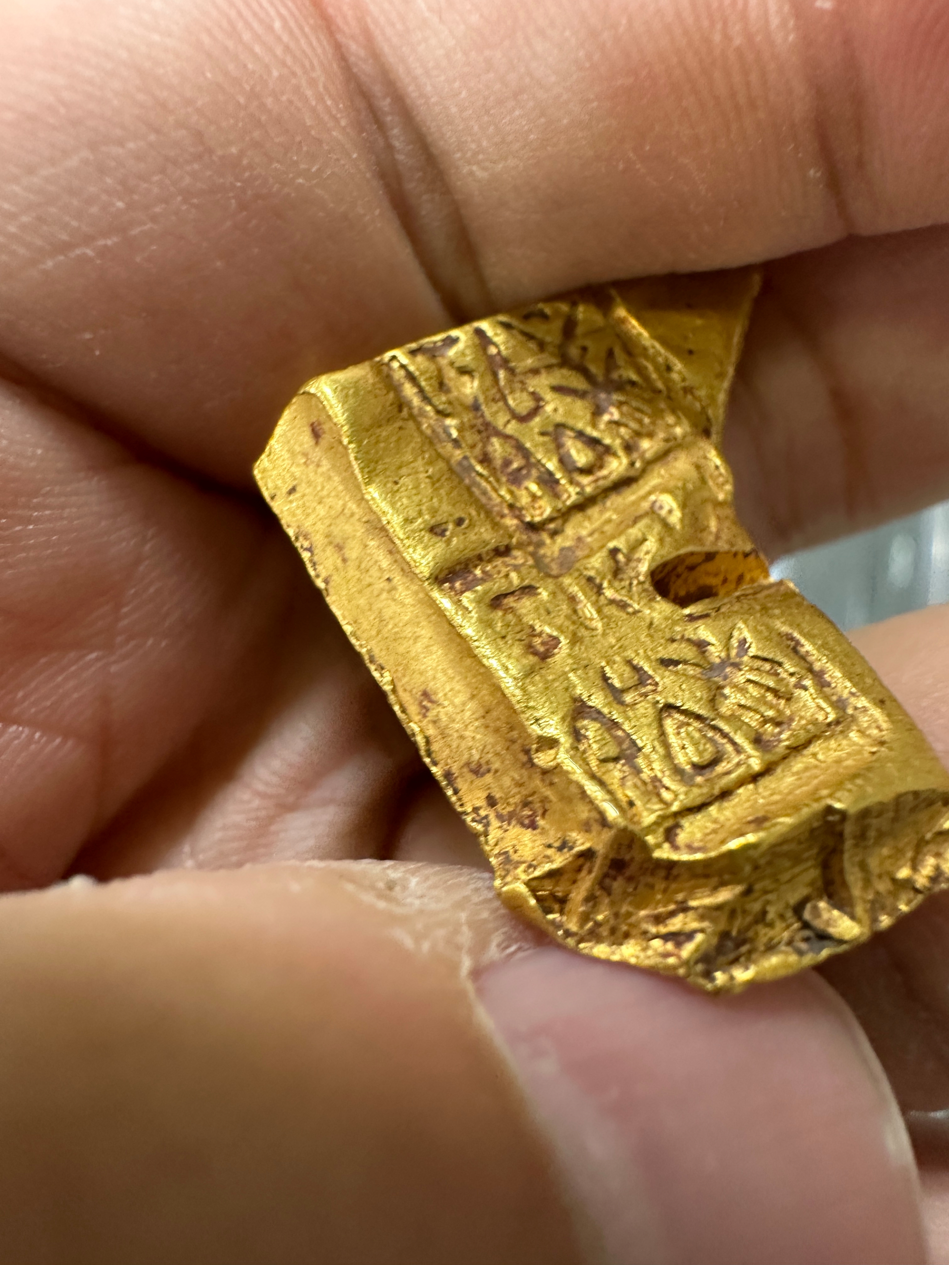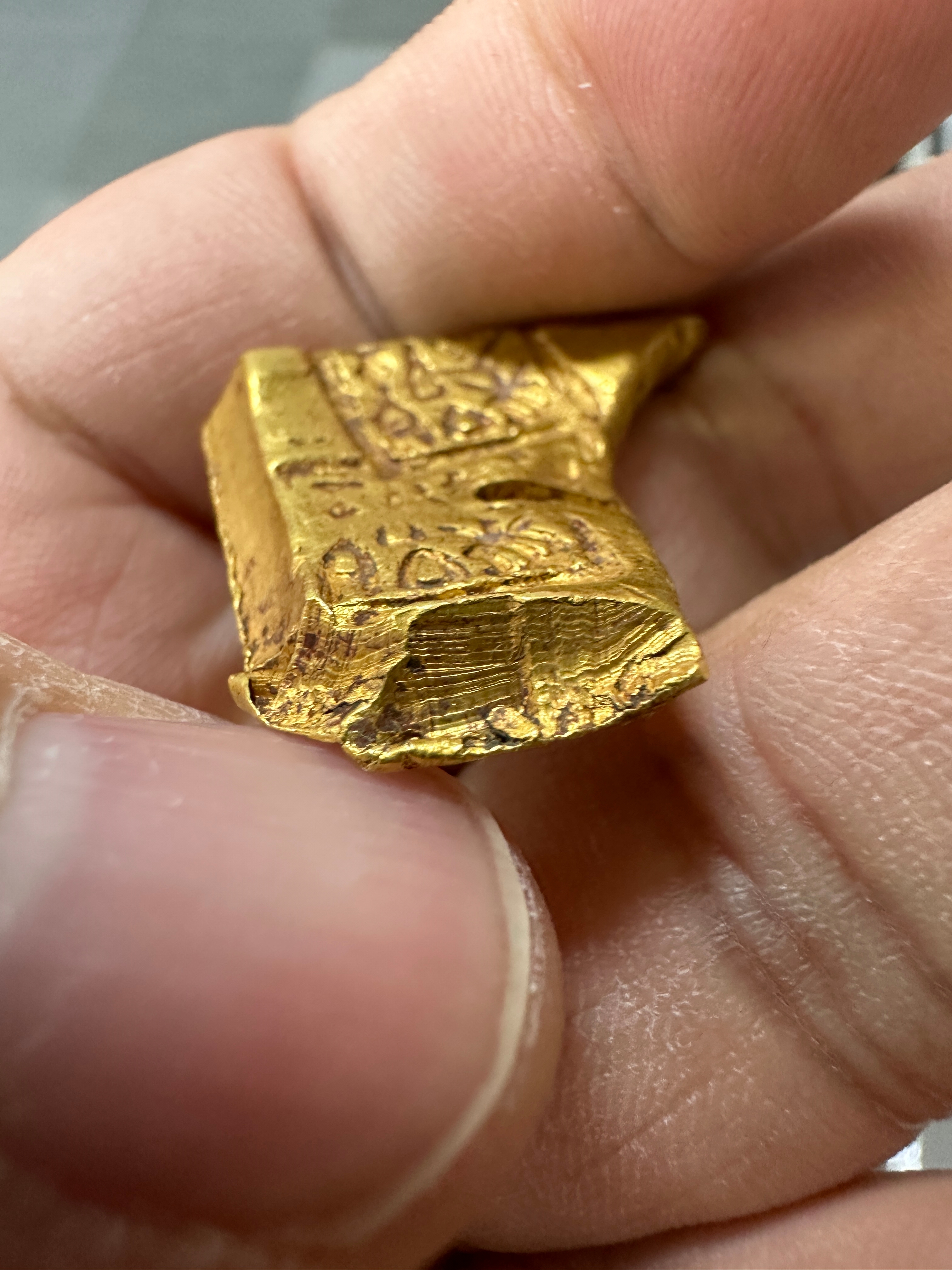 藏友您好!见图,看此金锭的工艺特征,文饰图案,皮壳包浆,磨损氧化,这是战国时期铸造的楚金,此金锭较稀少,品相尚可,具有一定历史经济及收藏价值,供您参考,谢谢!