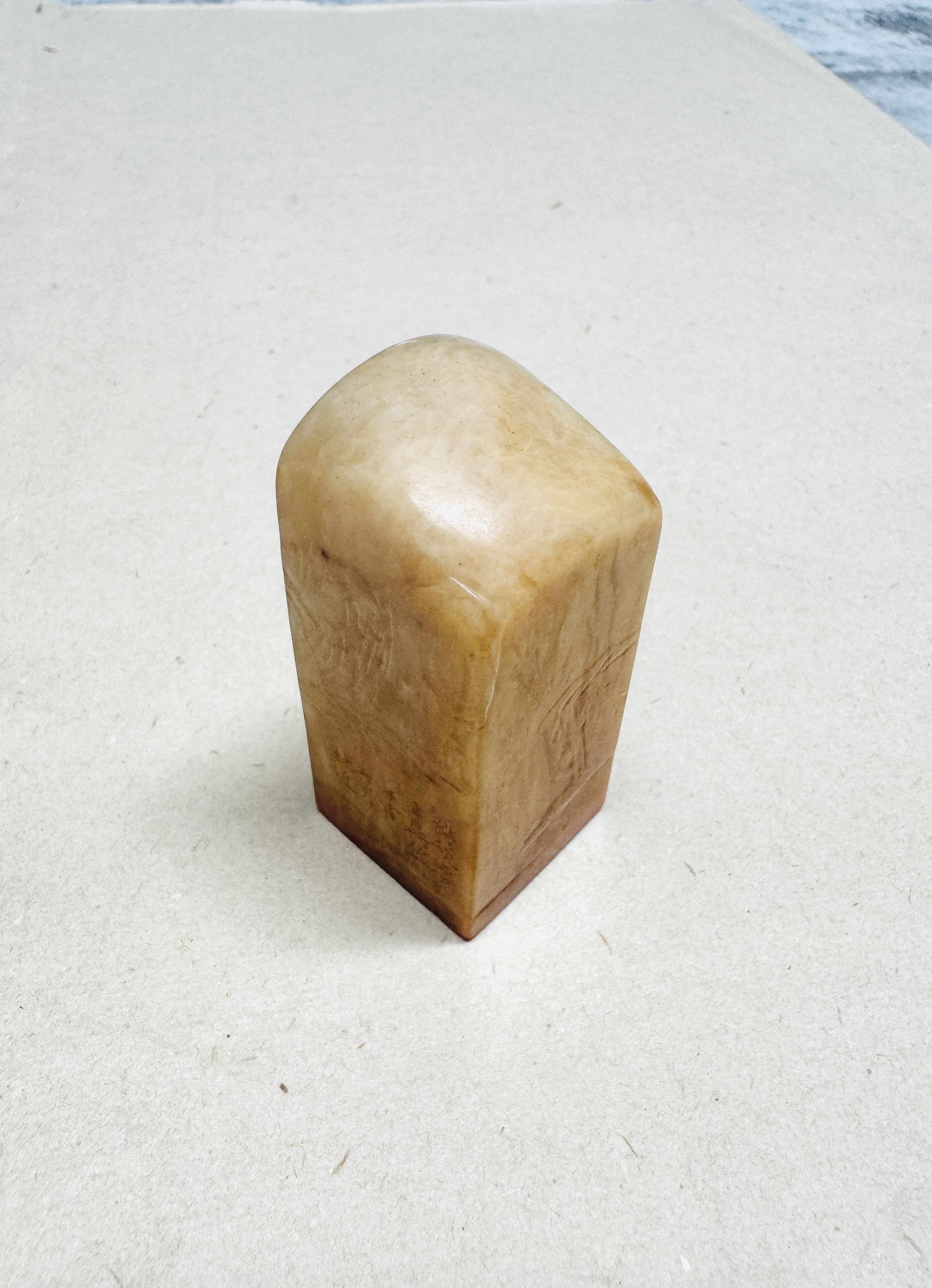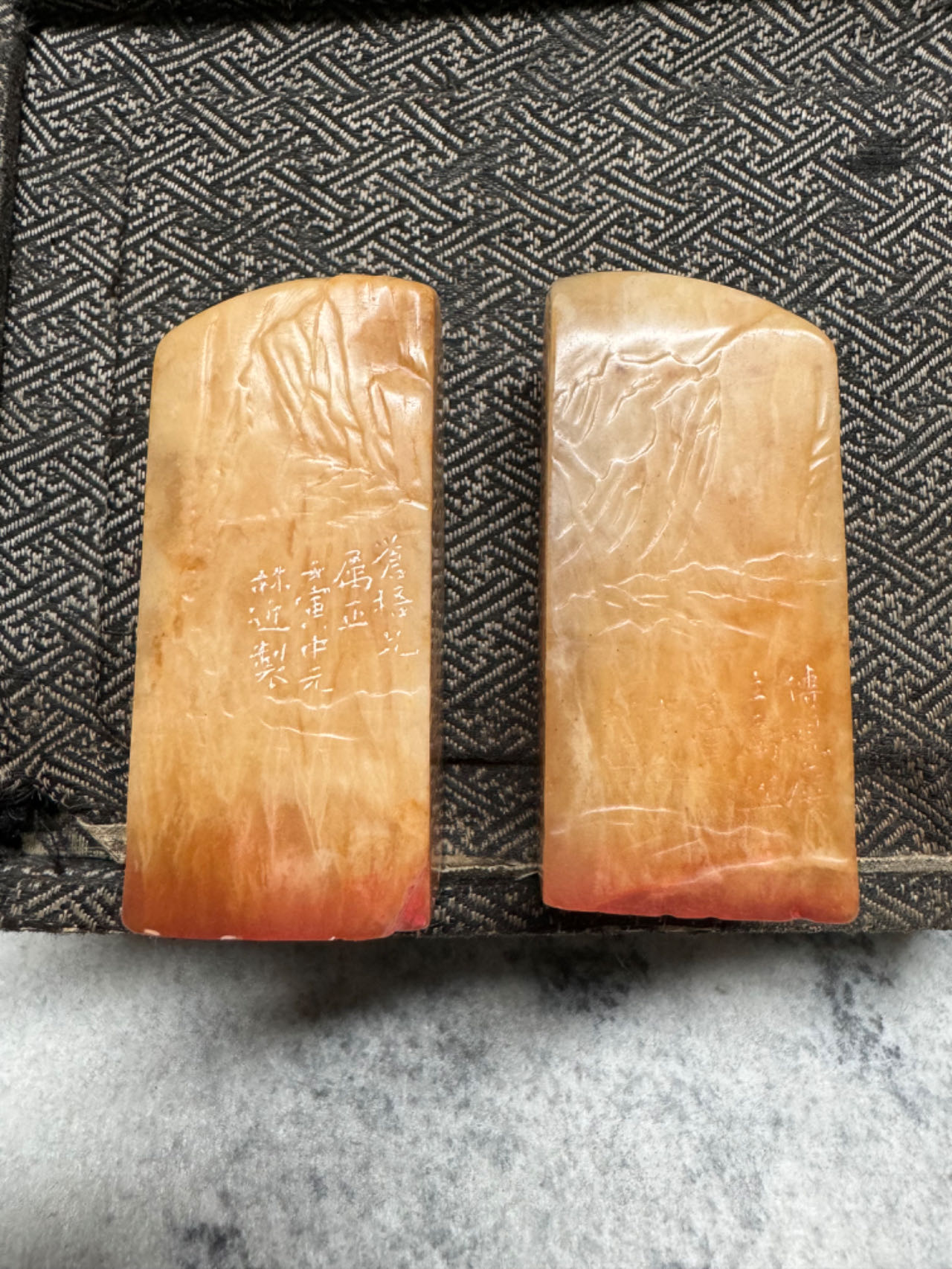 白田黄石薄意雕山水对章收藏价值颇高。其石质温润细腻、纯净通透,萝卜纹明显,灯光下淡黄色柔和自然,品质优良。雕刻采用薄意雕山水,风格古朴厚重,注重意境营造,线条简洁,对章工艺一致,整体和谐,彰显高超技艺。印文“邓国傅砚楼藏”“邓昌梧印”指明所有者或收藏者,边款“昌捂兄属正壬寅中元林近製”提供制作时间和作者林近(原名林崇拭,是澳门书画会理事长、篆刻协会会长、同善堂董事长、颐园书画会会长,在港澳书画艺术界声誉极高),为其增添文化艺术价值。对章尺寸规整,确为值得收藏的艺术品。