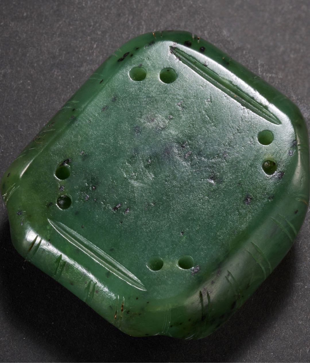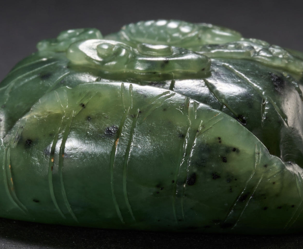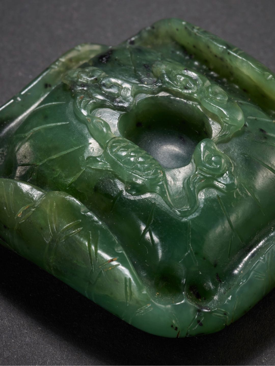 玉雕龟巢荷叶纹嵌饰 从照片看,材质为和田碧玉,玉质温润细腻。方形,荷叶四边向上翻卷,中部以浅浮雕技法琢出小龟,以单阴线琢出龟甲、荷叶的叶脉。凸雕小龟,颈长伸,作爬行状,中间雕一圆形凹槽,器底部光素有四对穿孔,可用于镶嵌。此题材多在金元时期流行。从制作工艺、雕刻技法来看,应为创汇期时期。