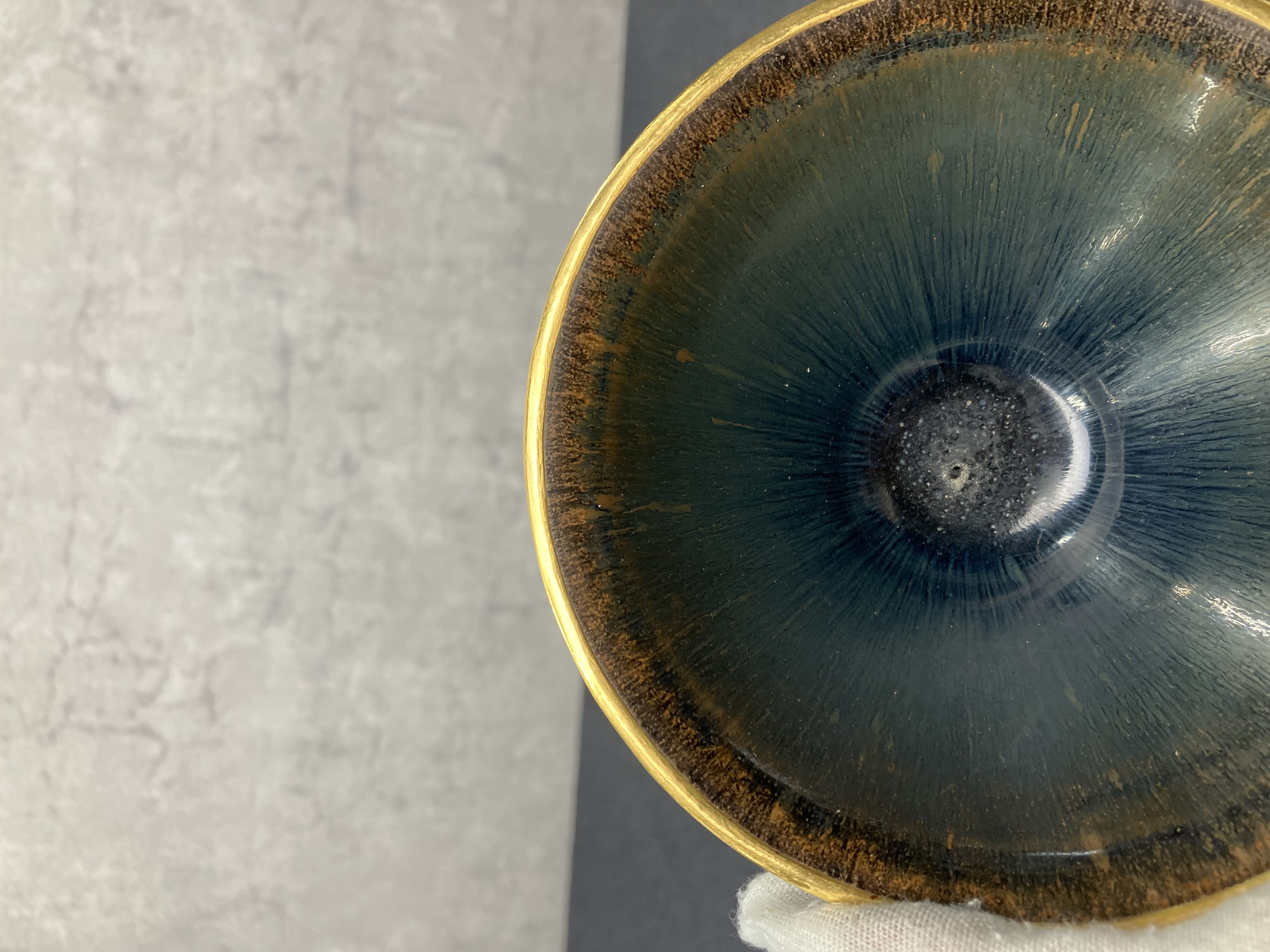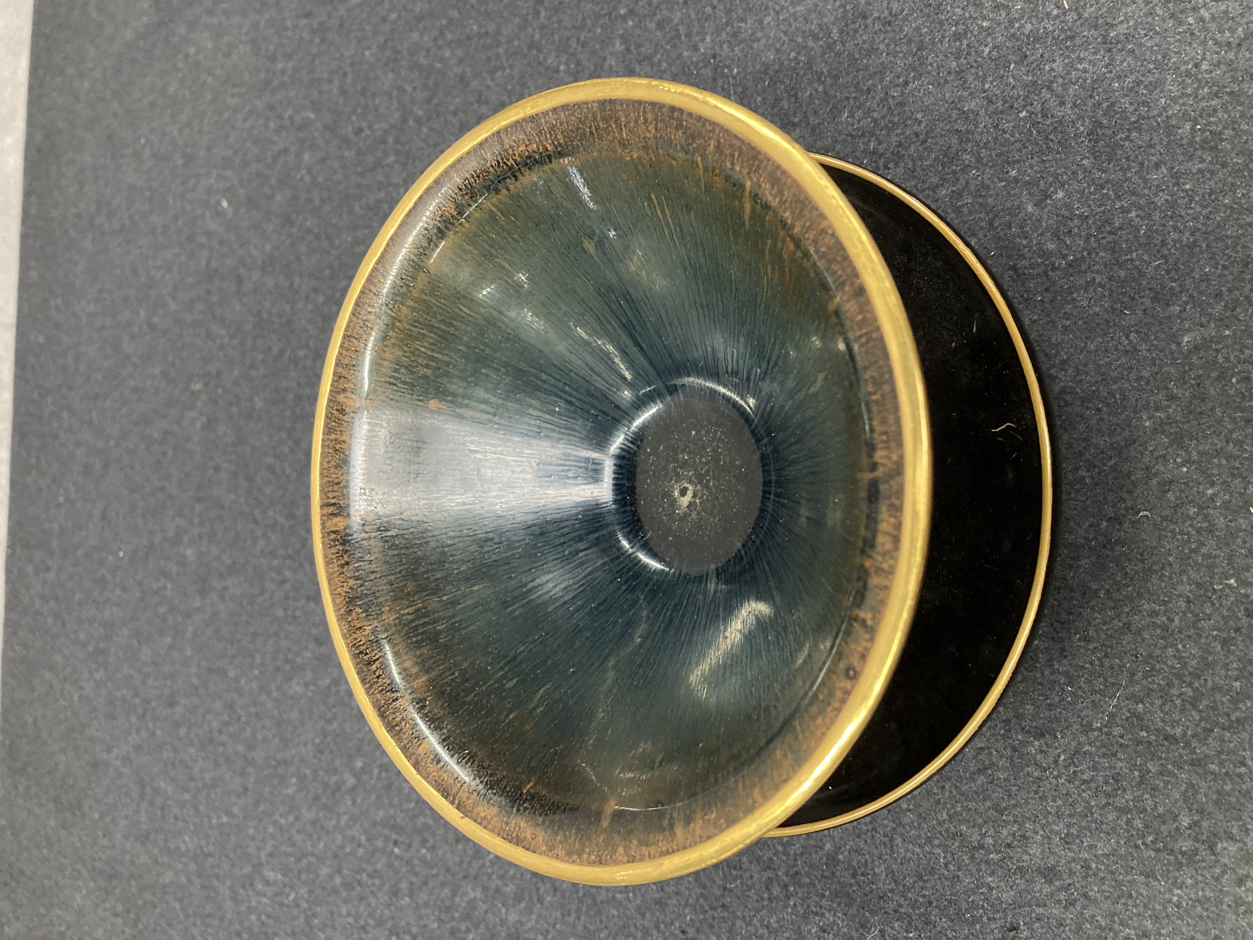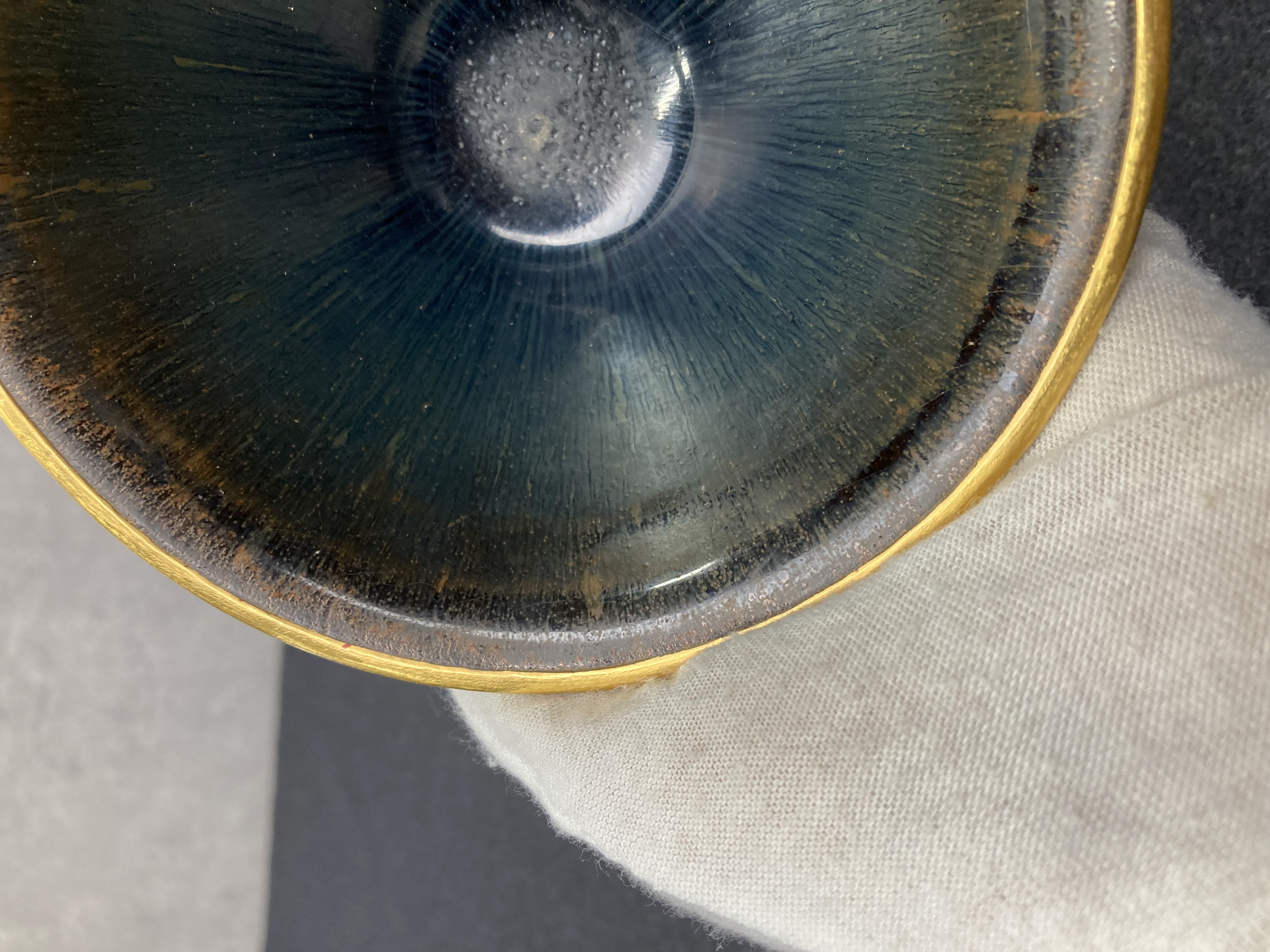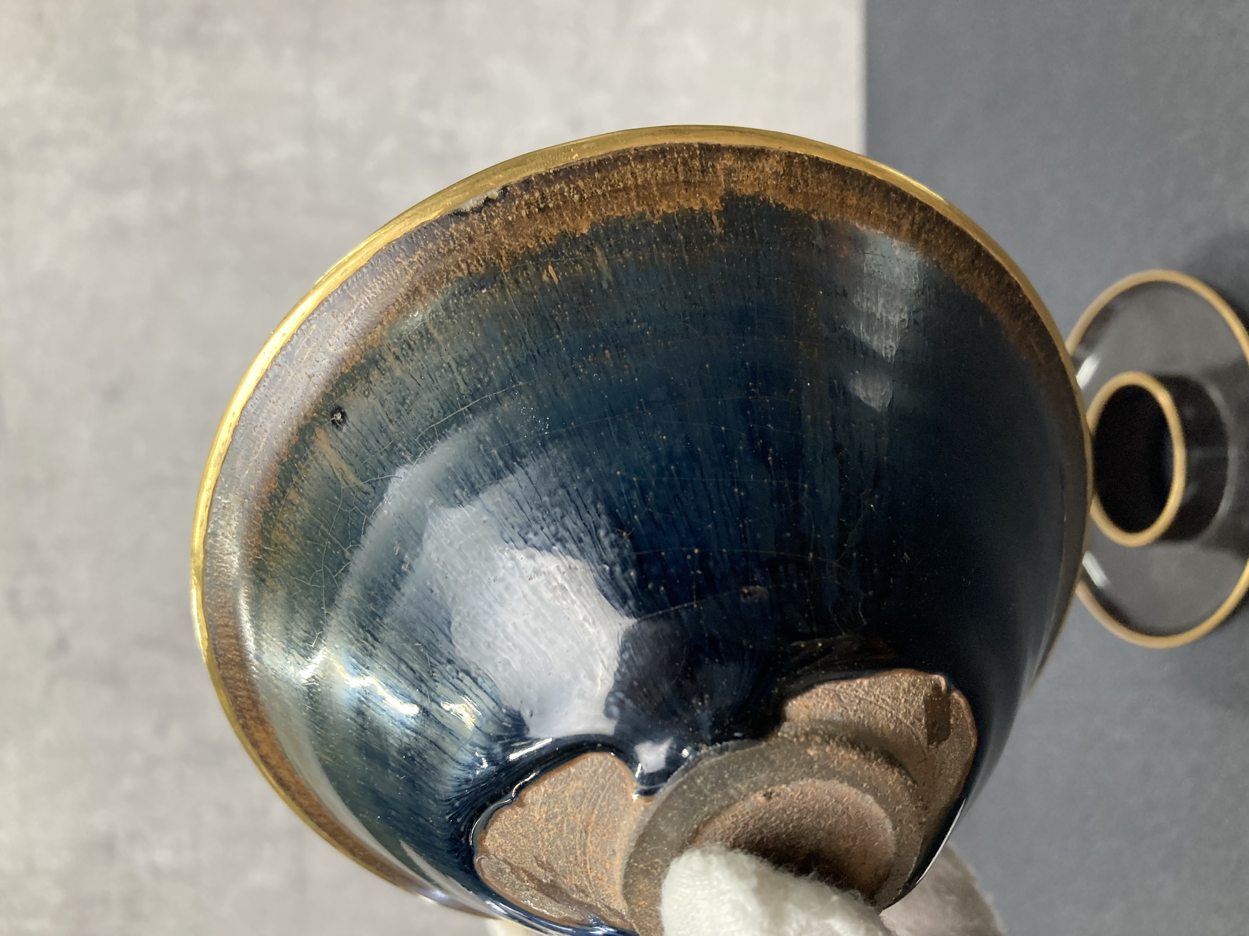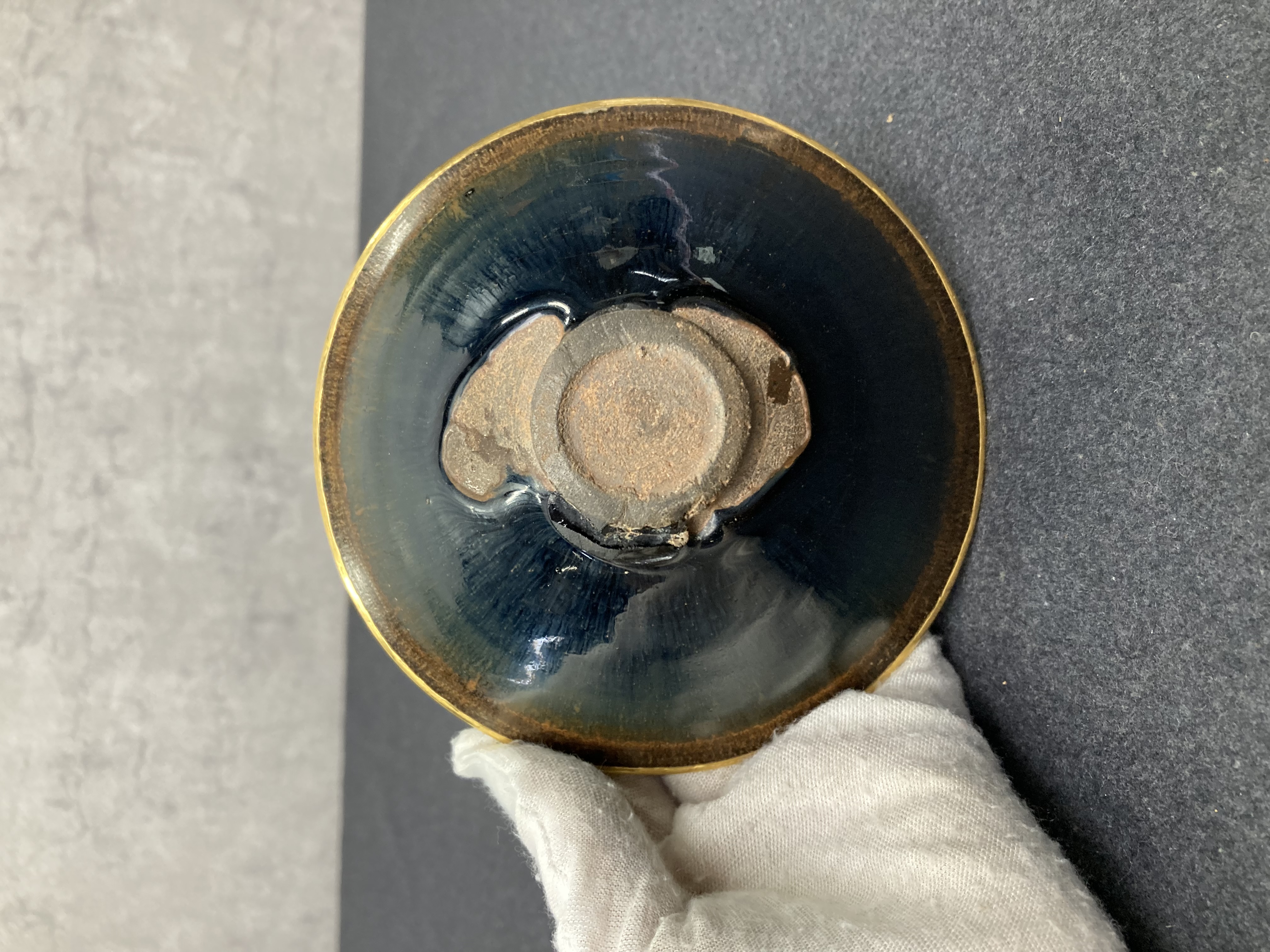 藏友好,这是一件黑釉斗笠盏,器型古朴,釉层肥厚,内部有窑变兔毫,底部胎体颜色深沉,整体看符合古代的特征,是一件宋代建盏,依据品相品级,市场价二至三万。