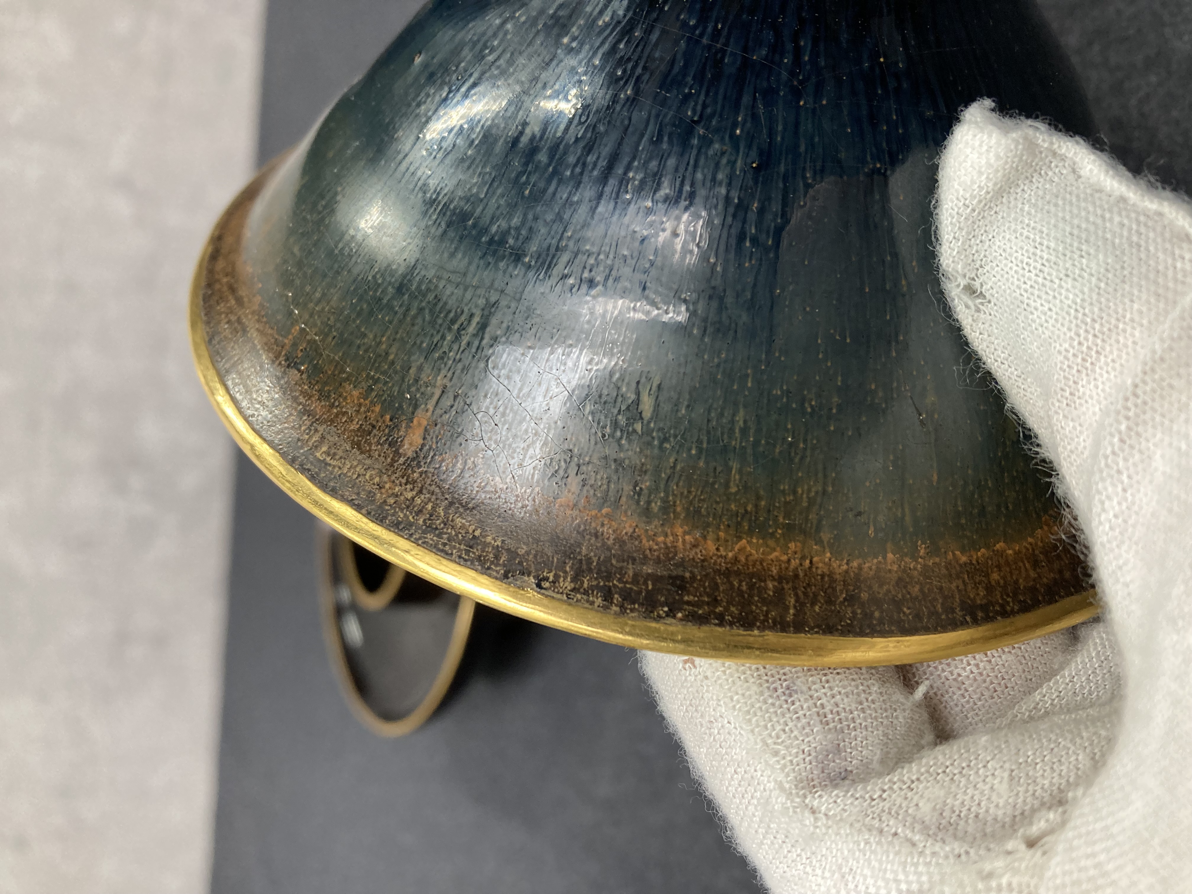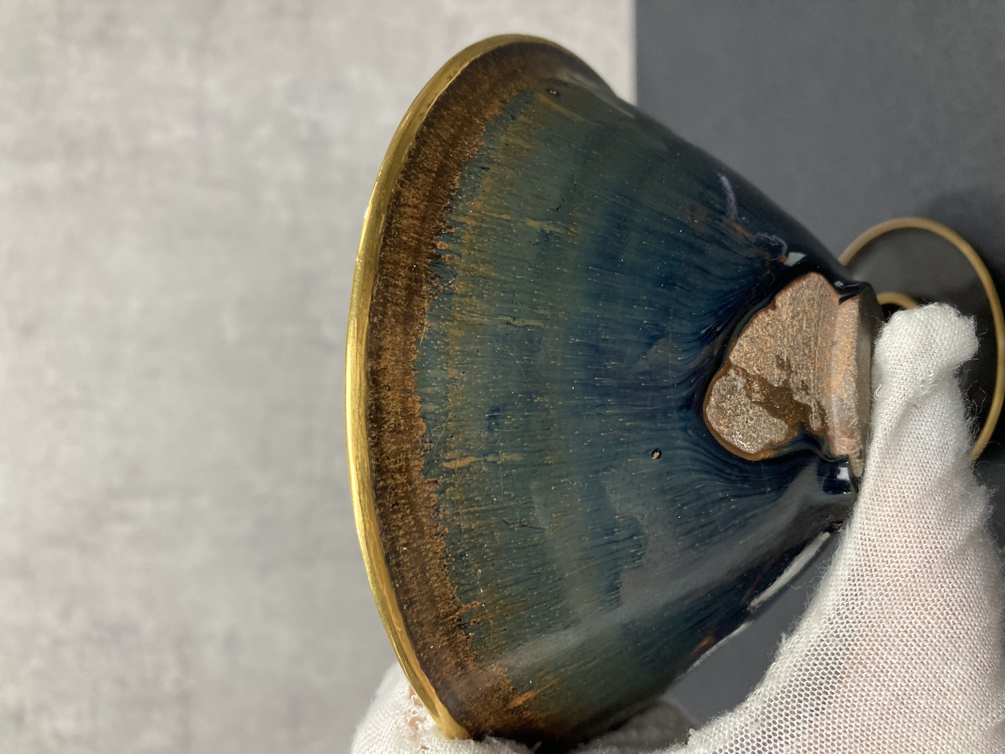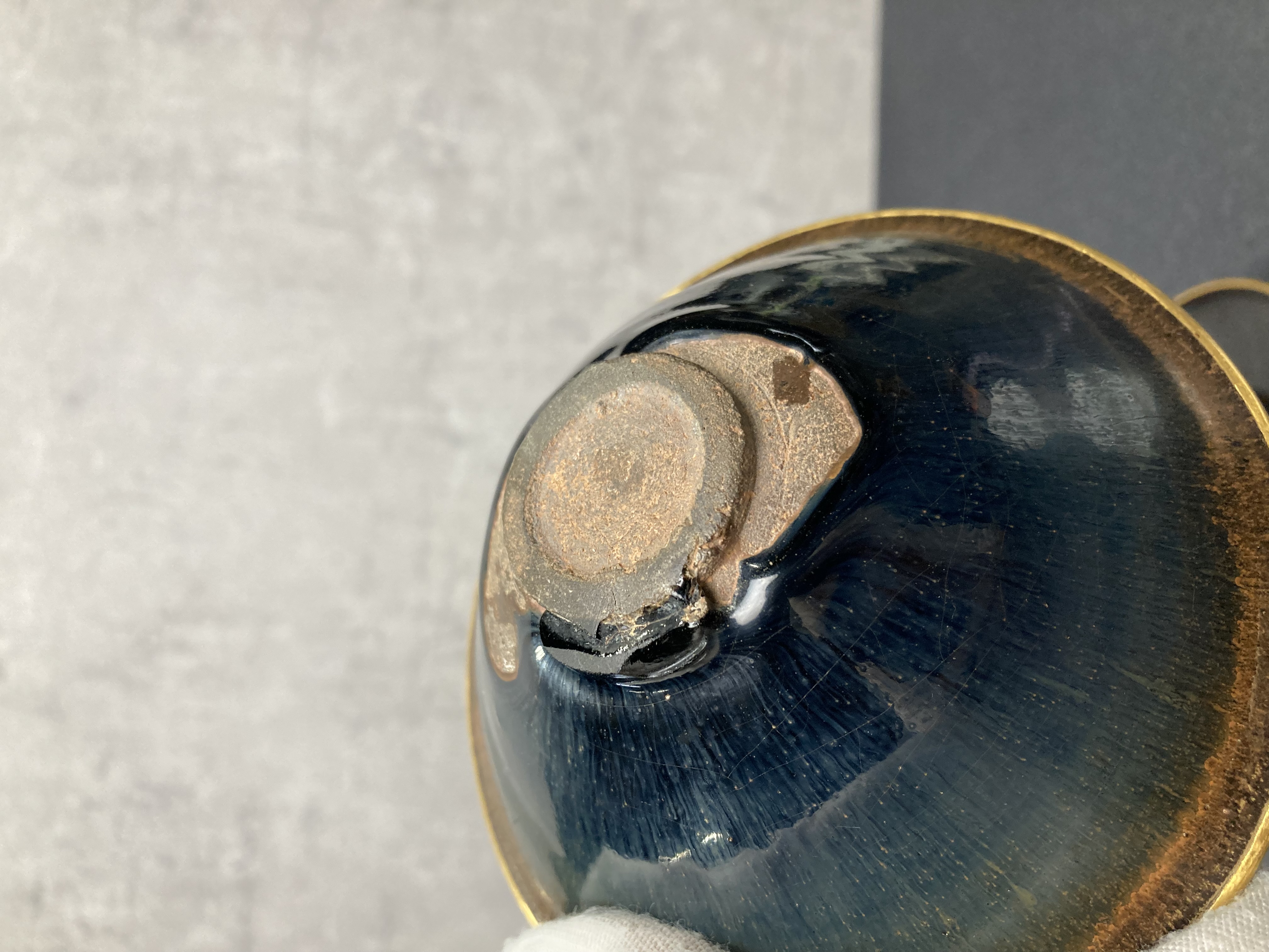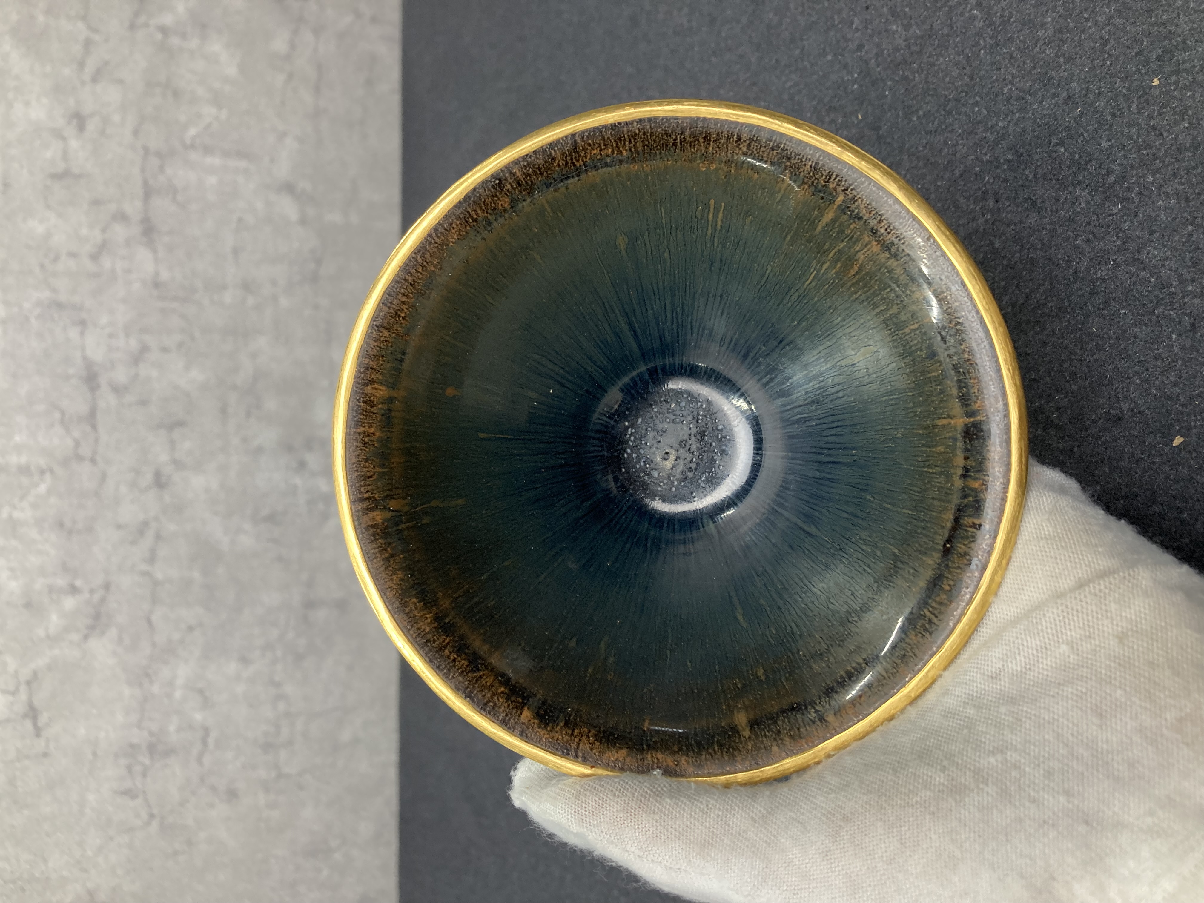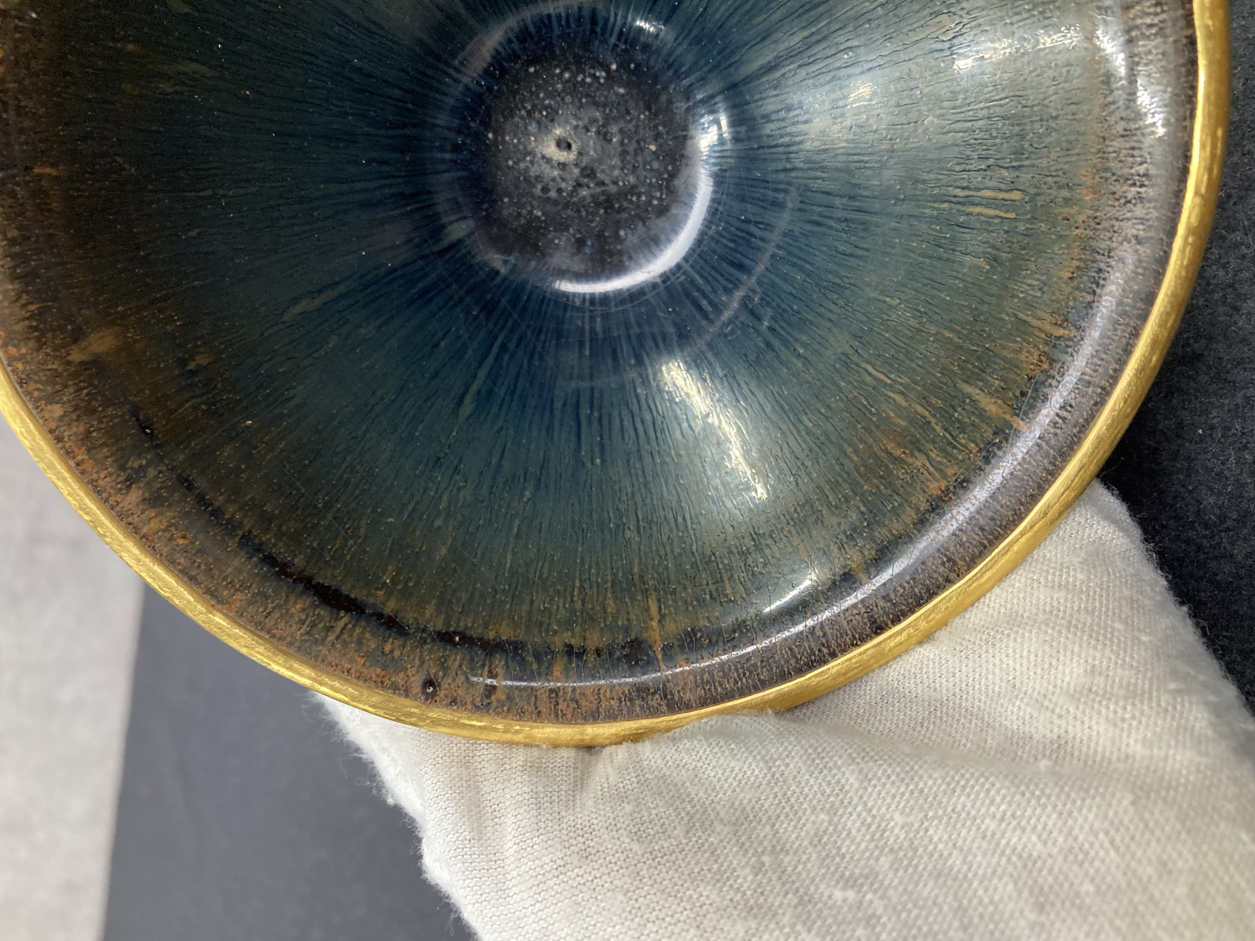 藏友好,这是一件黑釉斗笠盏,器型古朴,釉层肥厚,内部有窑变兔毫,底部胎体颜色深沉,整体看符合古代的特征,是一件宋代建盏,依据品相品级,市场价二至三万。
