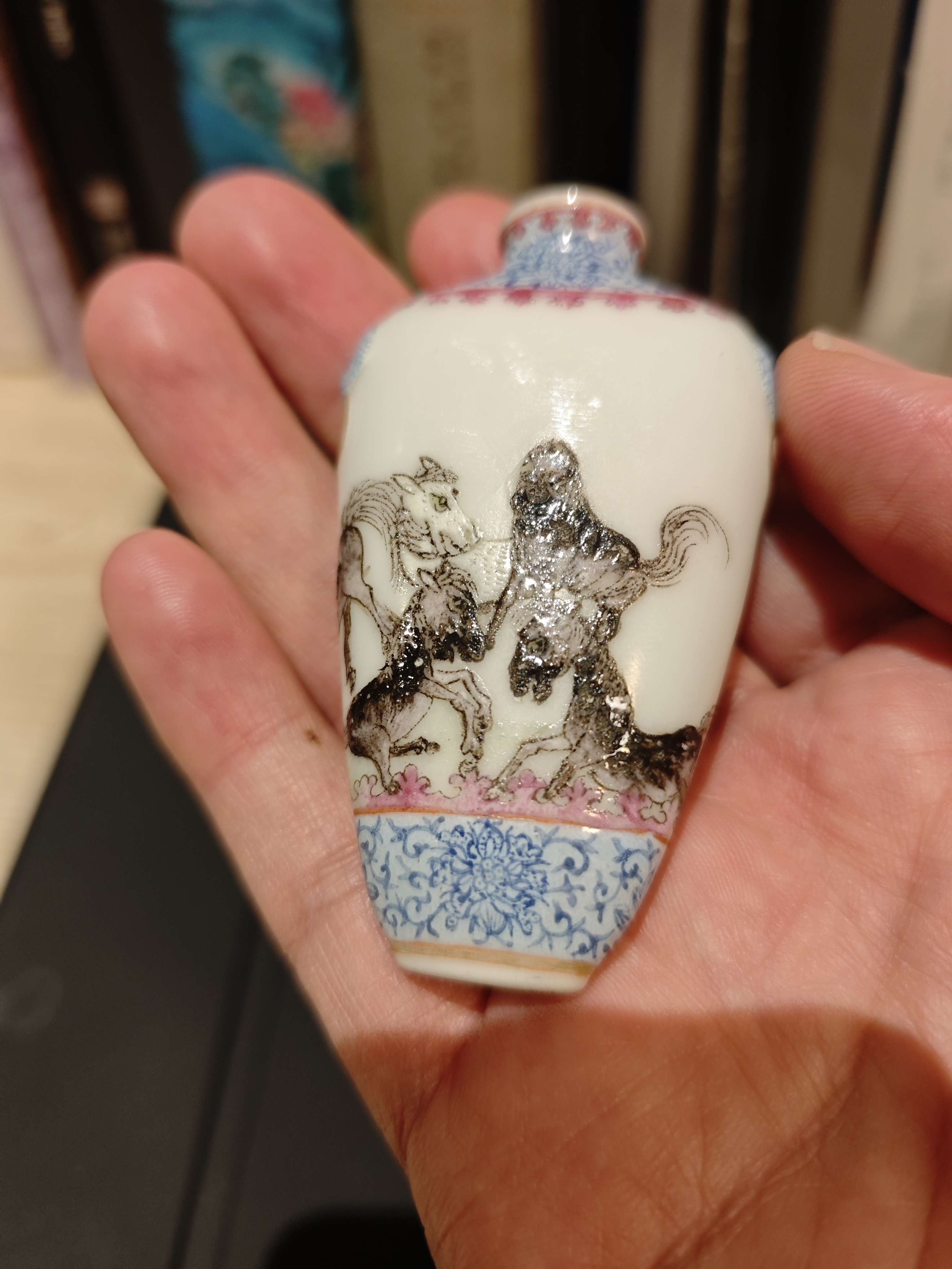 感谢藏友信任,这件料彩烟壶从照片上看确实有一定年份,但是以我个人经手的经验来看到不了清代,应该是民国时期,道光时期实际上是烟壶制作一个比较高峰的时段。那个时候的烟壶画工更细腻一些,而且彩料表面的老化程度以及写款的力度明显比藏友照片这件有差别。那么这件画工还是相对比较软弱的,也有民国彩的特点,包括它的铺首这个装饰也有晚期特征。综合各方面看,个人觉得还是一件民国时期的烟壶,仅供藏友参考。