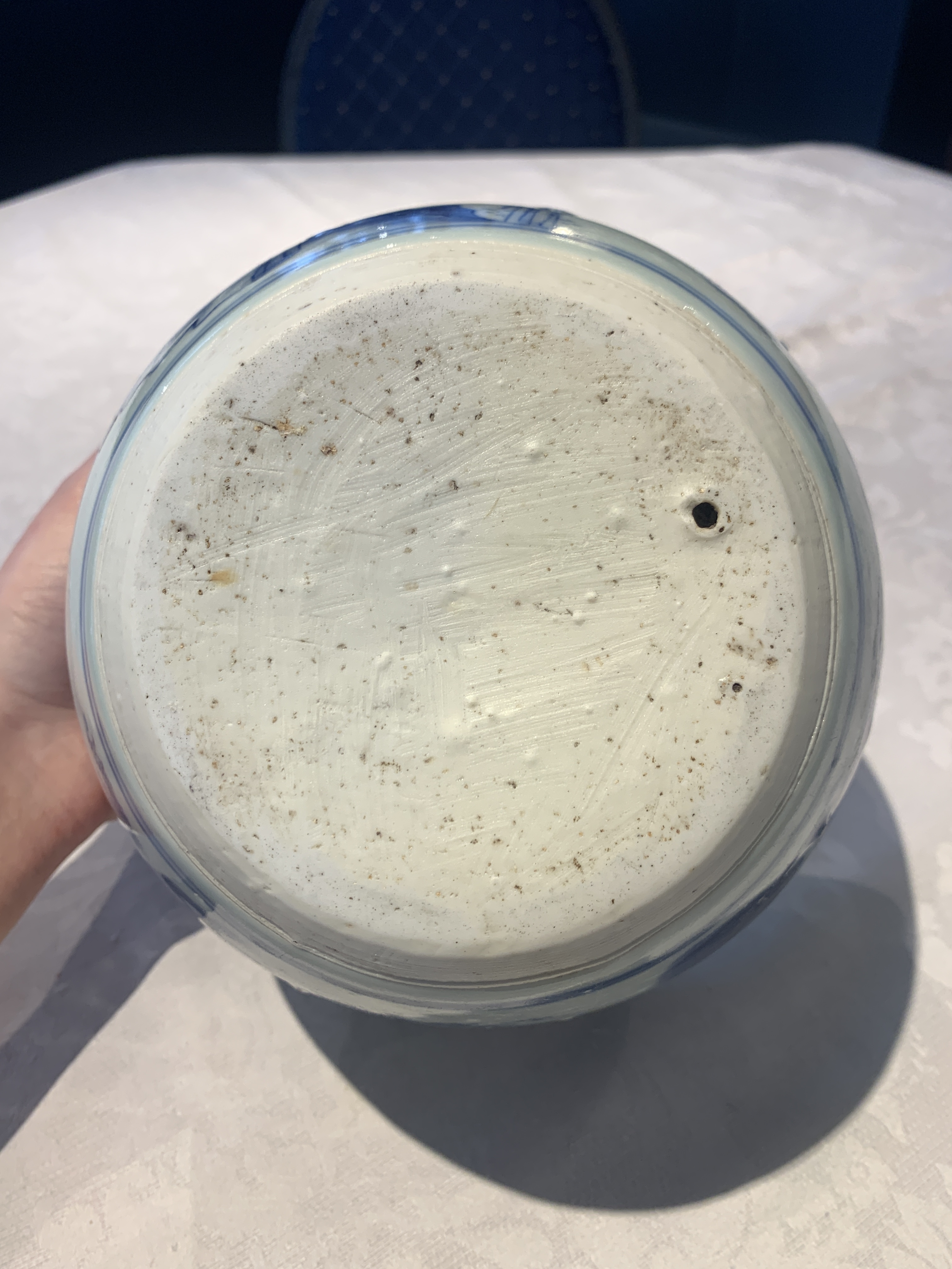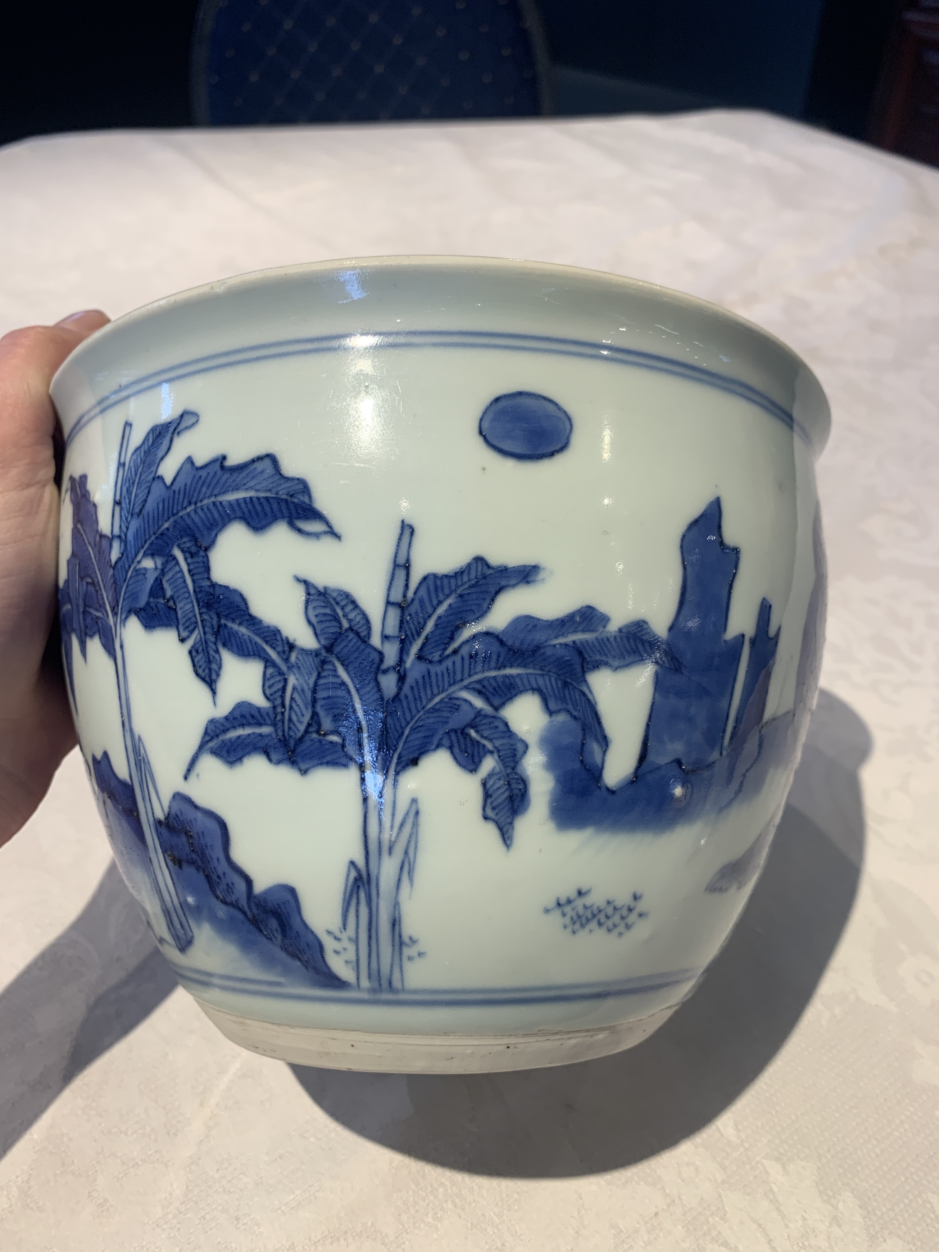 藏友您好,欢迎登录联拍在线,通过图片看这件青花山水瑞兽图卷缸。造型规整,口腹足直径和器物高度比例关系协调,鼓腹弧线到口沿束口到胫部内收都富有张力,造型有协调顺畅的美感。施釉肥厚,色感白中泛青灰,釉质莹润,传世使用痕迹比较自然。青花发色深沉稳定,层次色阶丰富,在每一个线条当中都有明显的沉浮感,聚料处也有明显的吃胎下沉感,而且机理通透纯净,是典型的崇祯时期矿物青花料。纹饰布局疏密得当,瑞兽绘画头身比例和姿势动作协调,神情生动,云气缭绕于山间,鱼鳞草的点缀,这都是崇祯绘画风格。底部和口沿修足修胎干净利落,有紧压胎表形成的平润感,胎釉交接线去釉工艺清晰明朗,胎质油润的糯感很强,是崇祯时期典型糯米胎特征,足端上细小的粘连痕迹符合崇祯时期垫烧工艺,有相对磨损平面,有沉淀下来的老旧脏色,这都是传世使用痕迹。口沿和内膛没有细节图片。通过以上分析判断这是一件明代晚期崇祯时期真品,可以收藏,以上为图片鉴定意见,仅供参考,感谢信任。