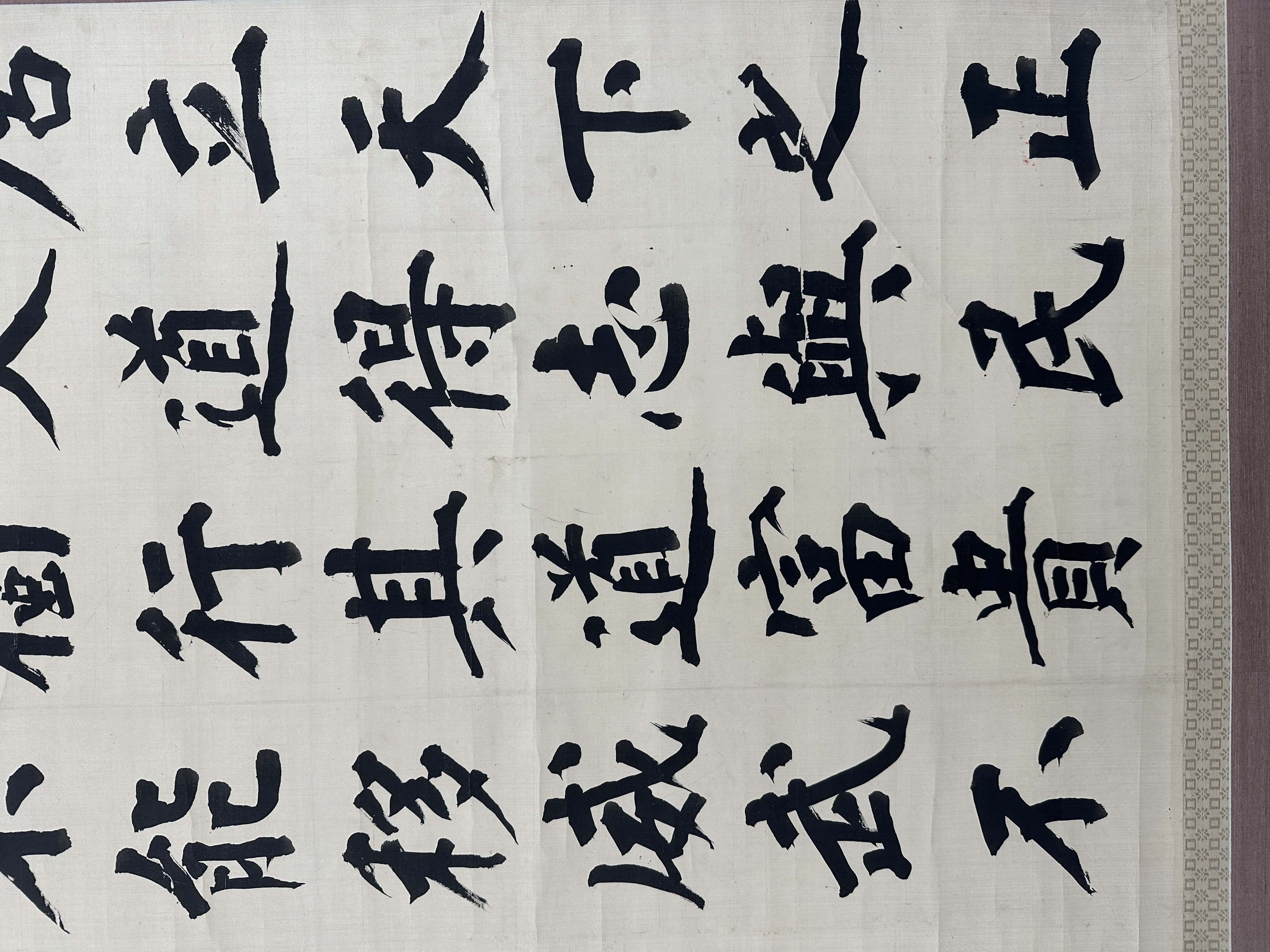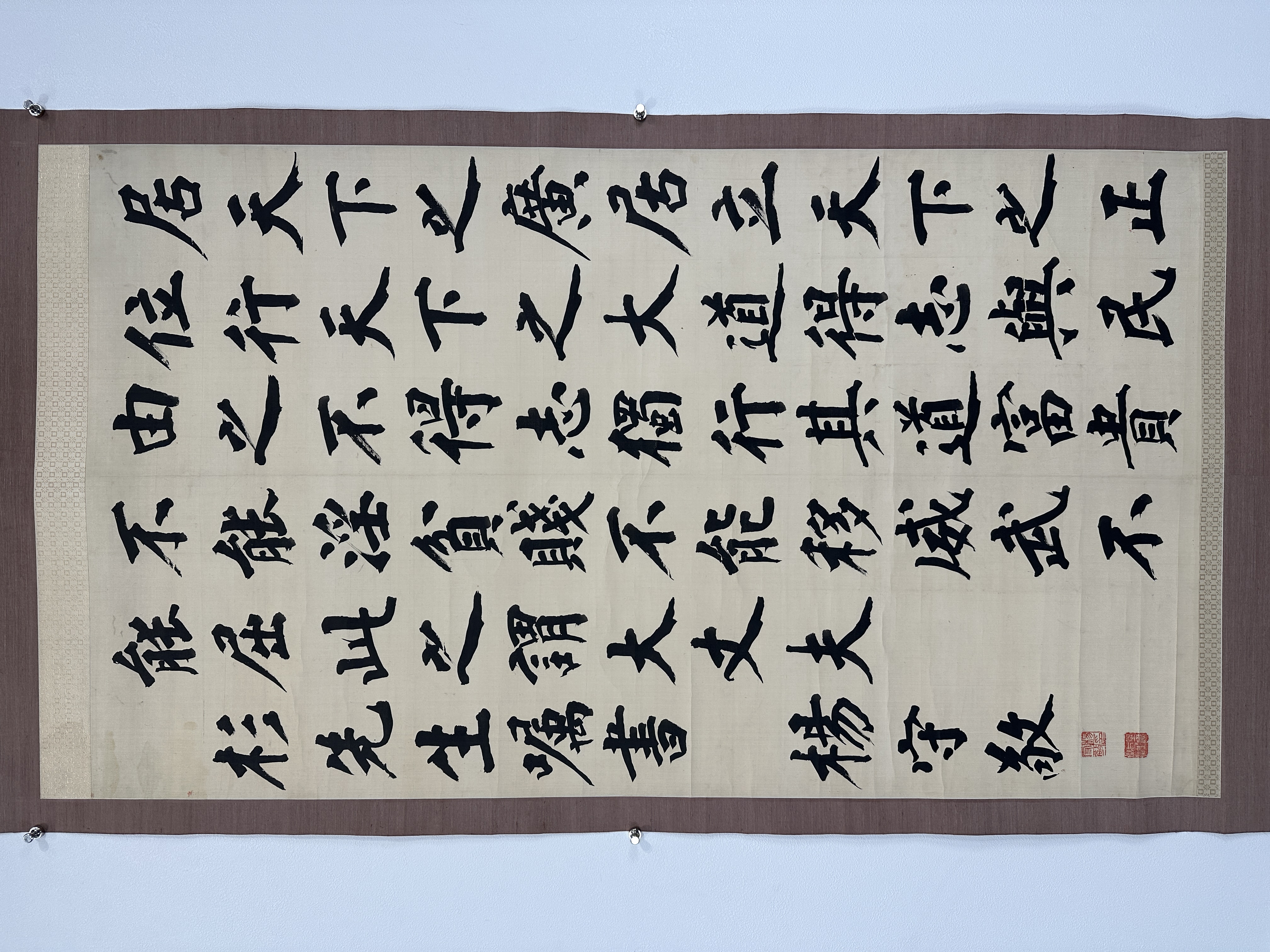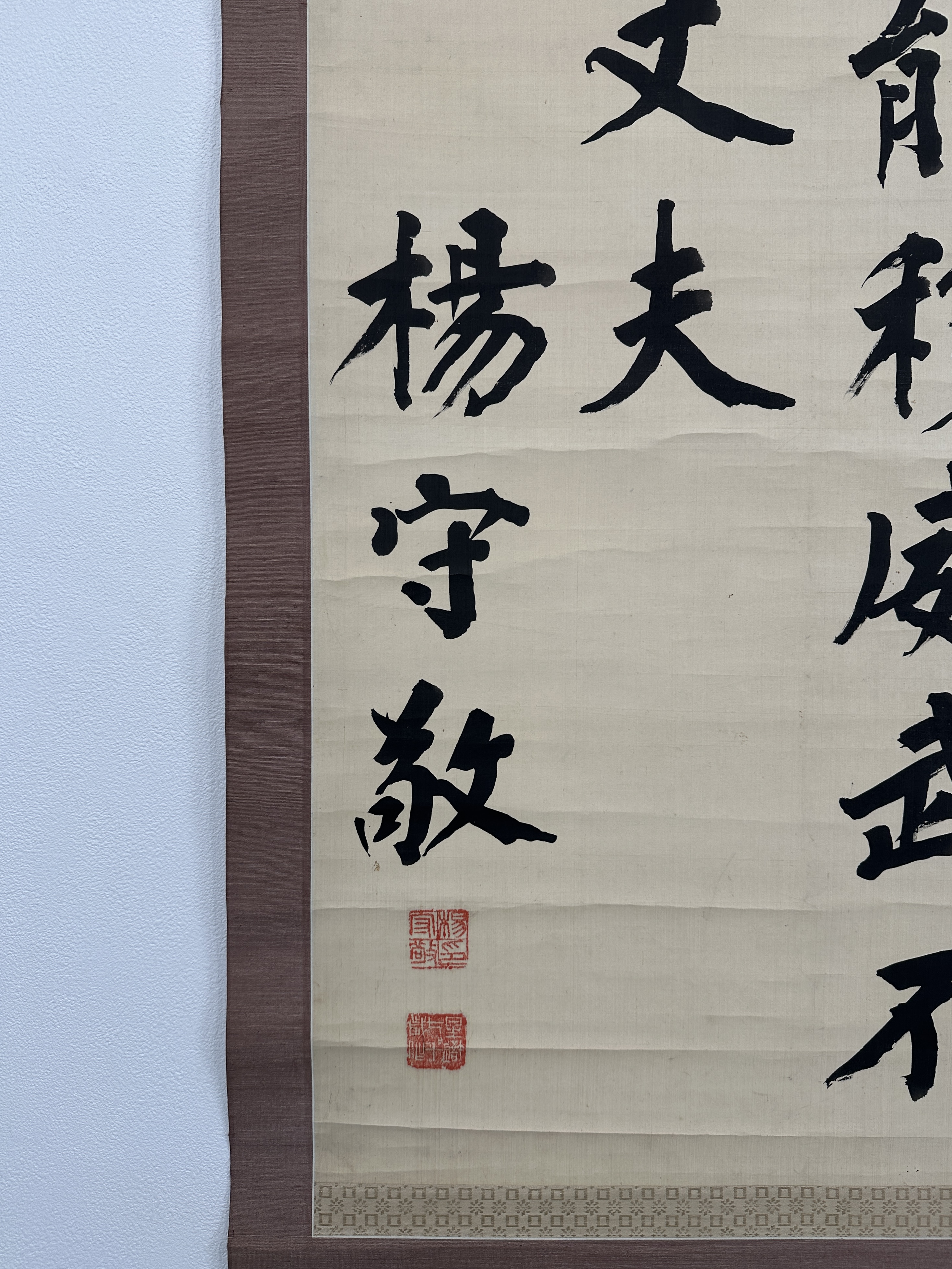 清末民初的书法家杨守敬,行、草、楷书皆擅,行书传世较多,其楷书市场价值相对颇高,他曾著述《楷法溯源》主张书法要“变”,变即是创新。并且明确指出:后人的书法与前贤的书法“笔笔求肖,字字求合,终门外汉也”。此书法中堂结体方整严谨,笔画布势均匀横细竖粗,捺尾饱满。通篇结布局整密,重心平稳,是他书法作品中的上品,且是名人上款,值得收藏。