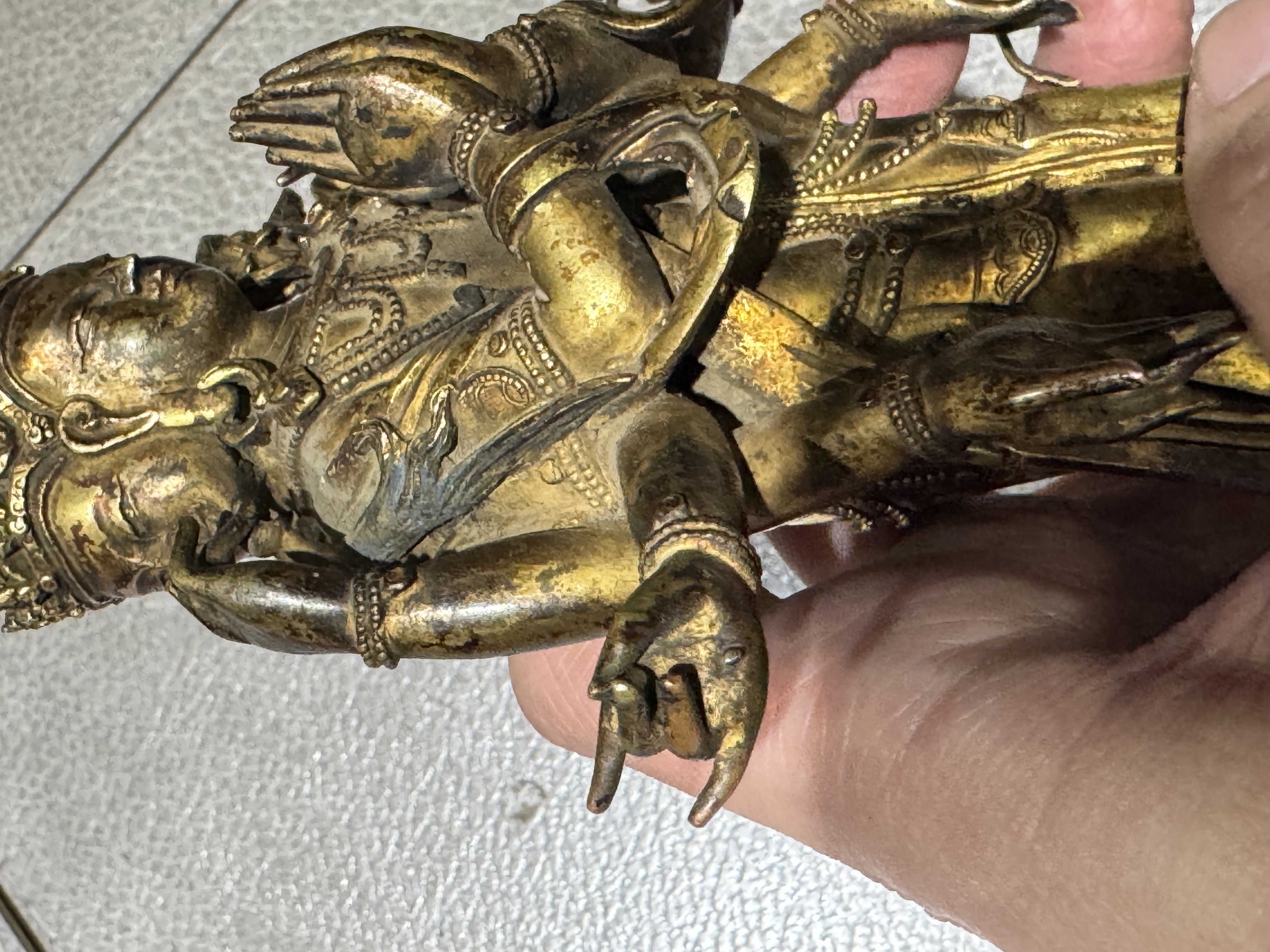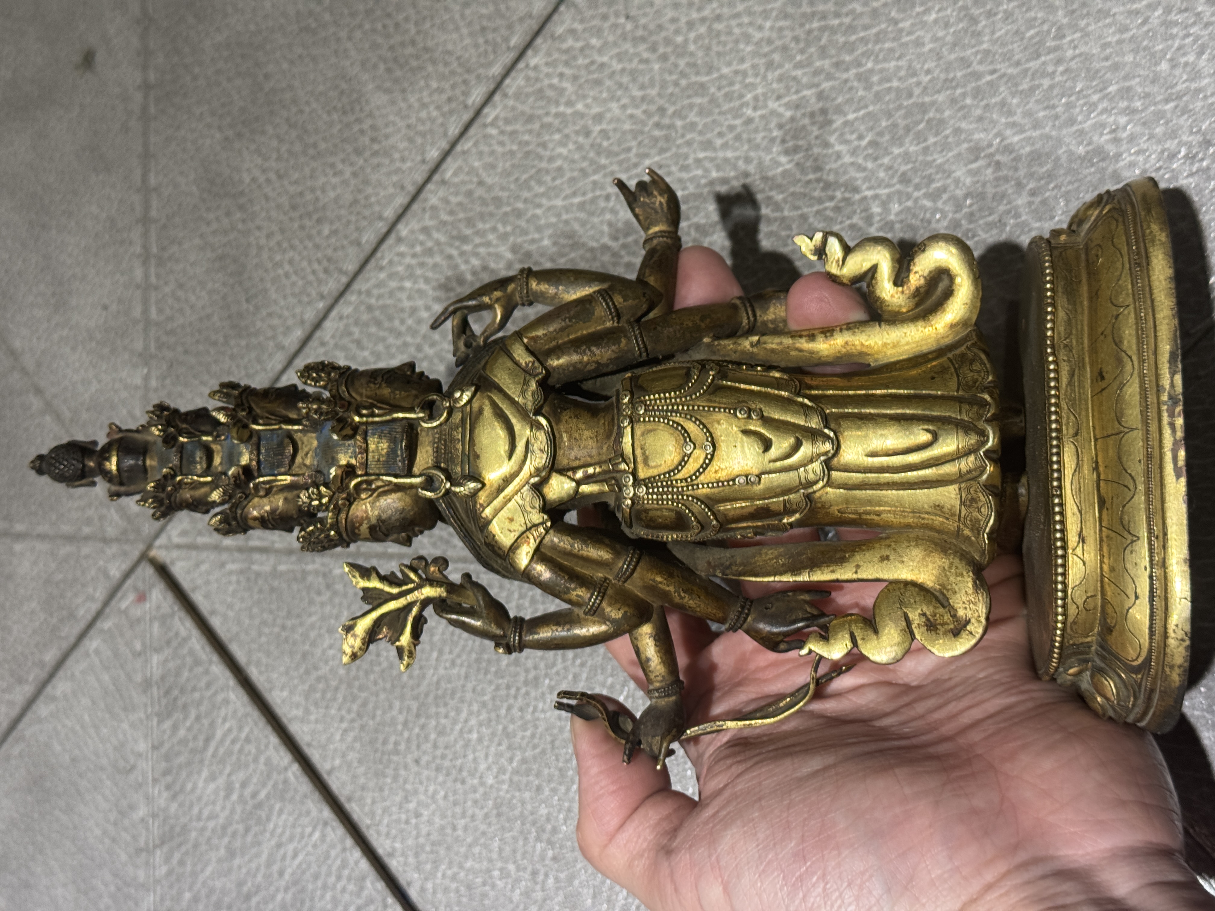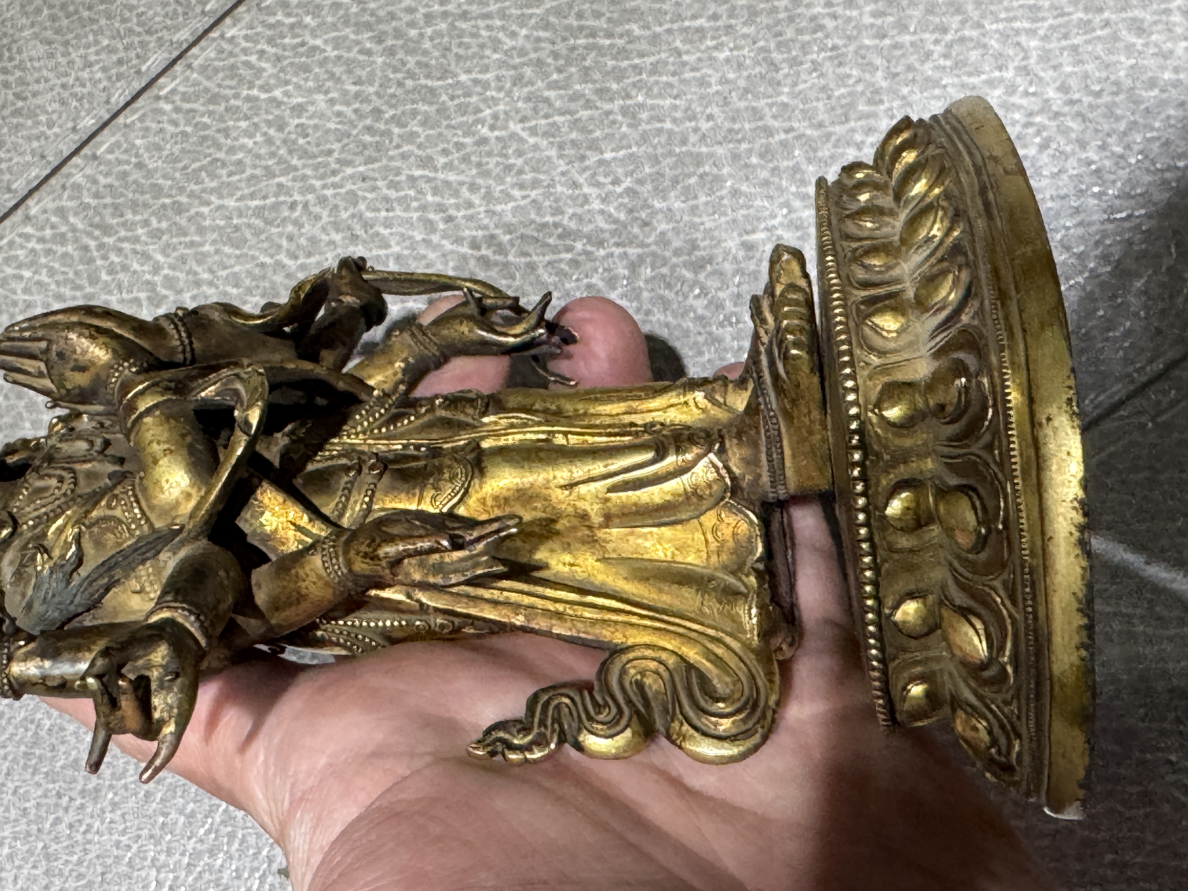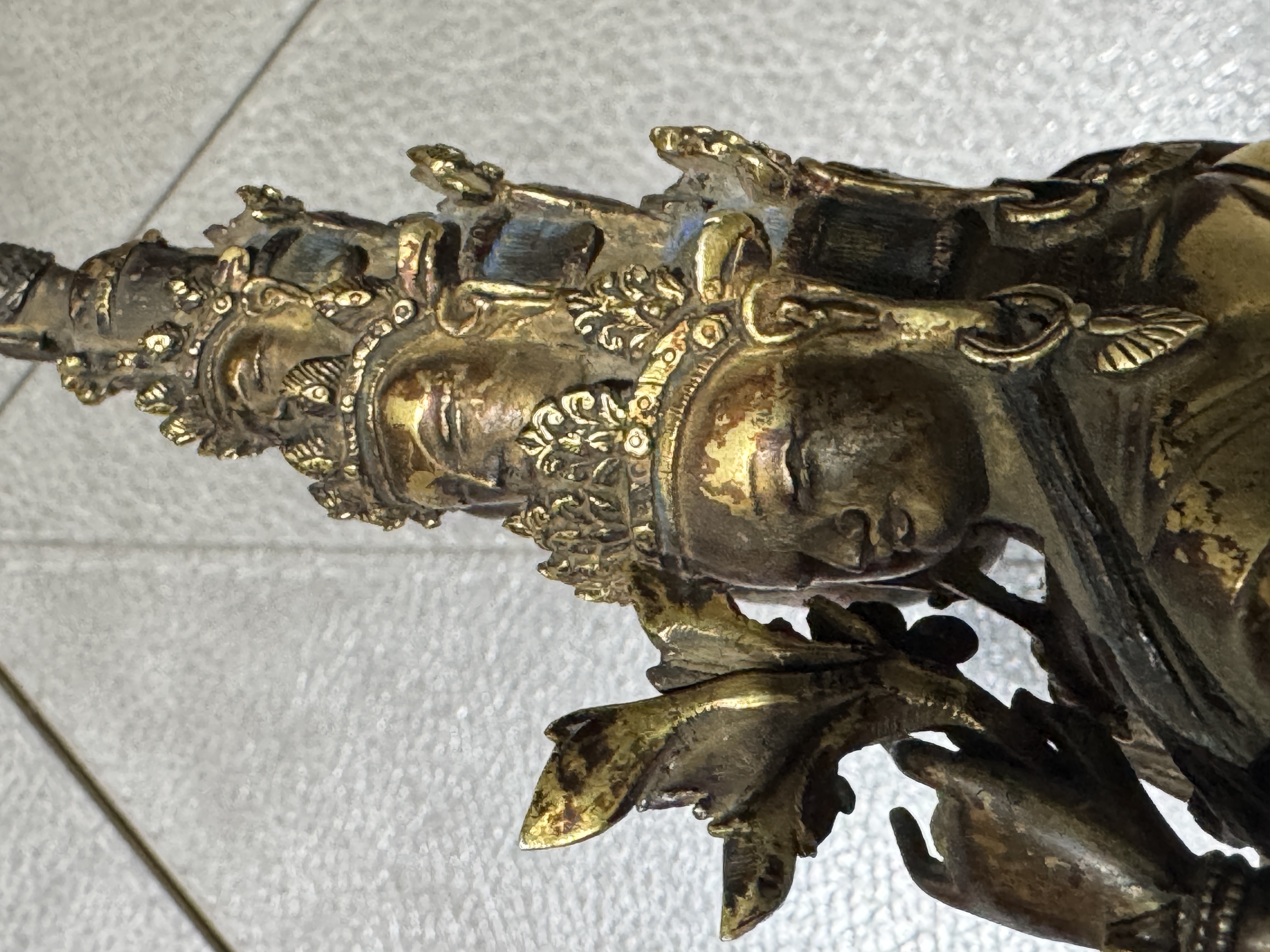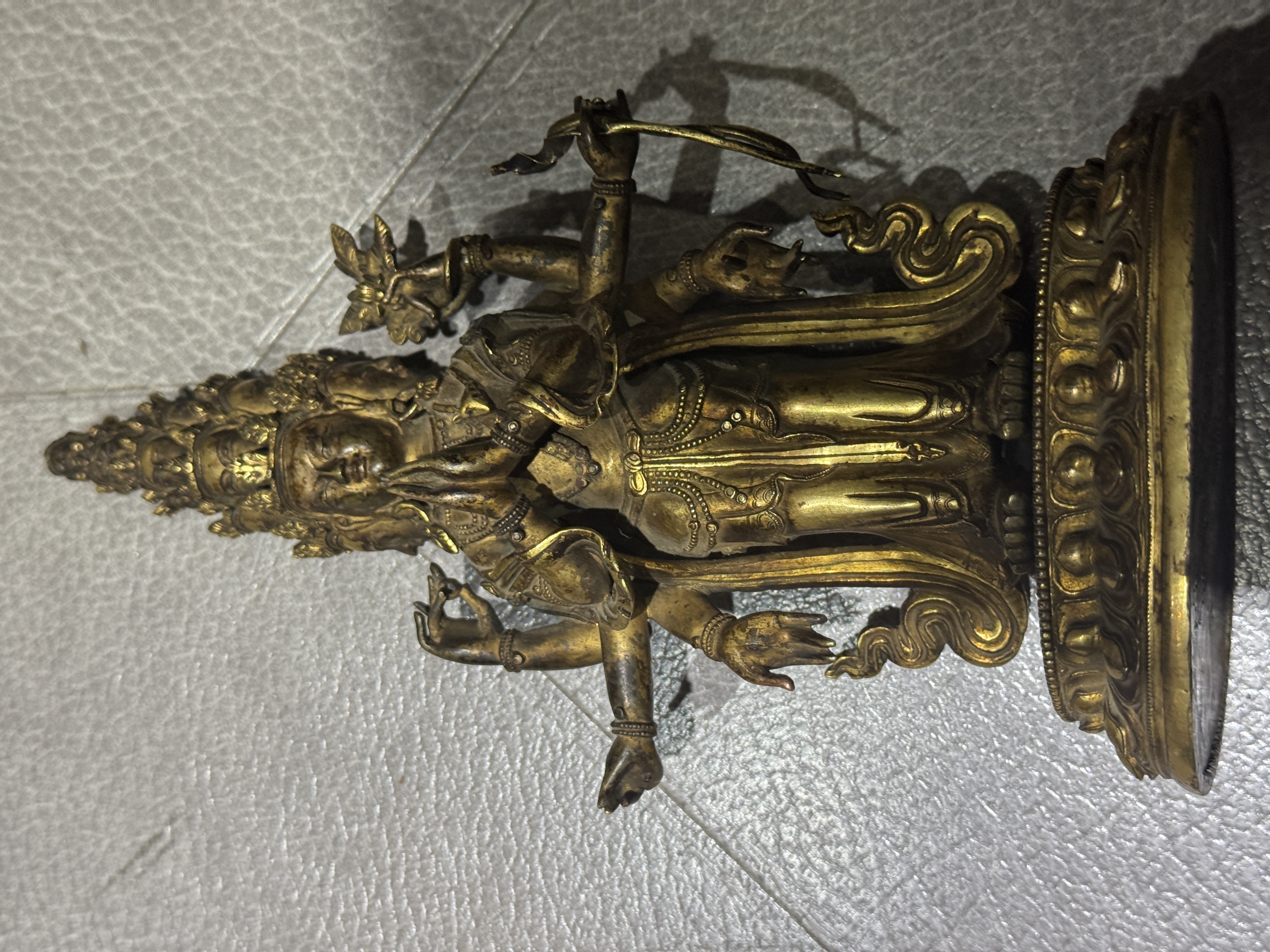 图片上的这尊造像是十一面八臂观音,整体造型精致,开脸生动,仔细观察细节工艺以及纹饰线条流畅,鎏金质感明亮,肢体灵动,底部圈足使用痕迹明显,结合铜质和制作工艺。综合判定为乾隆时期造像,有较高收藏价值