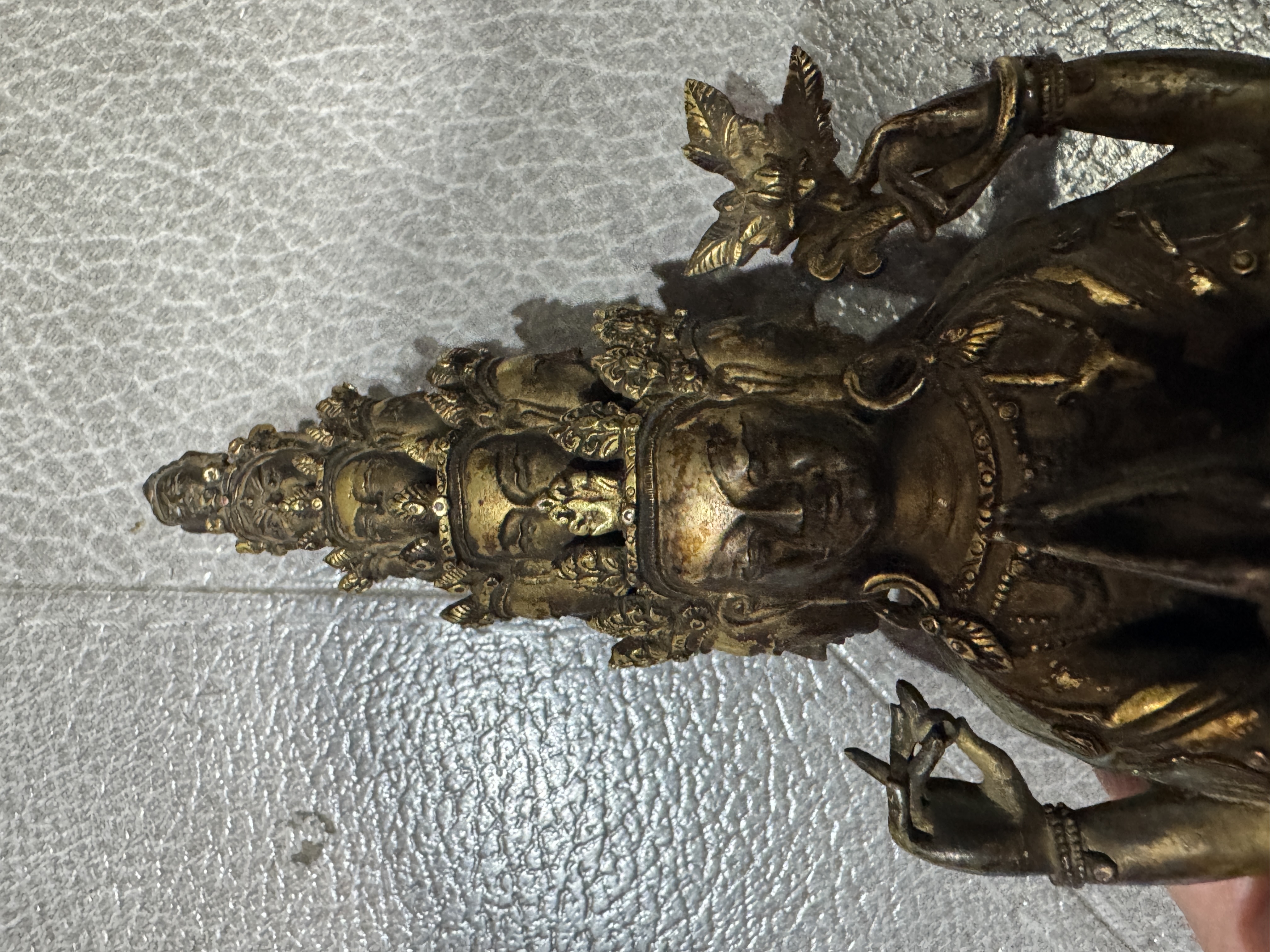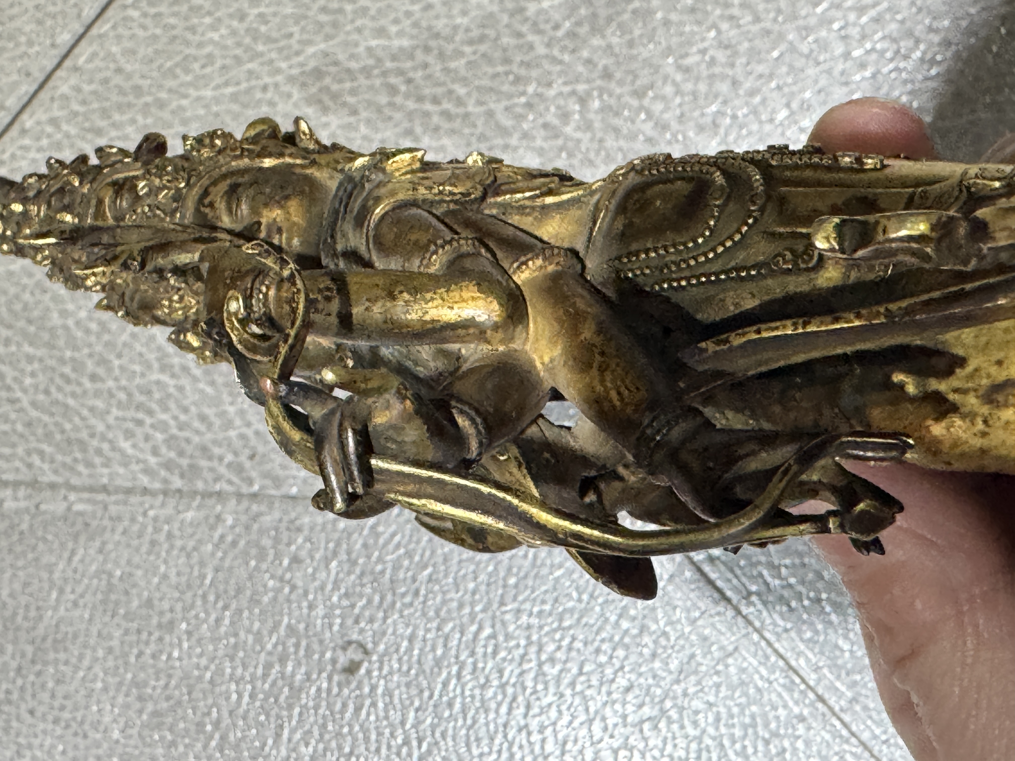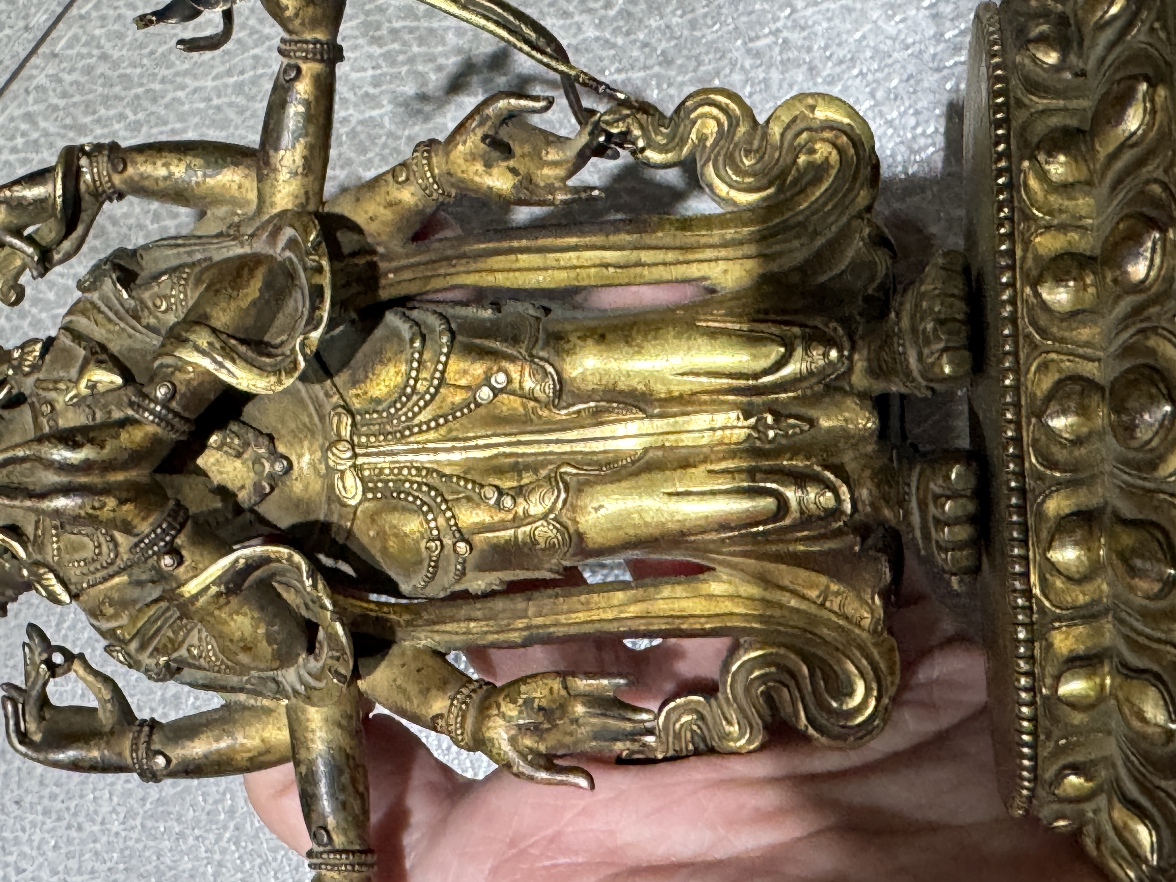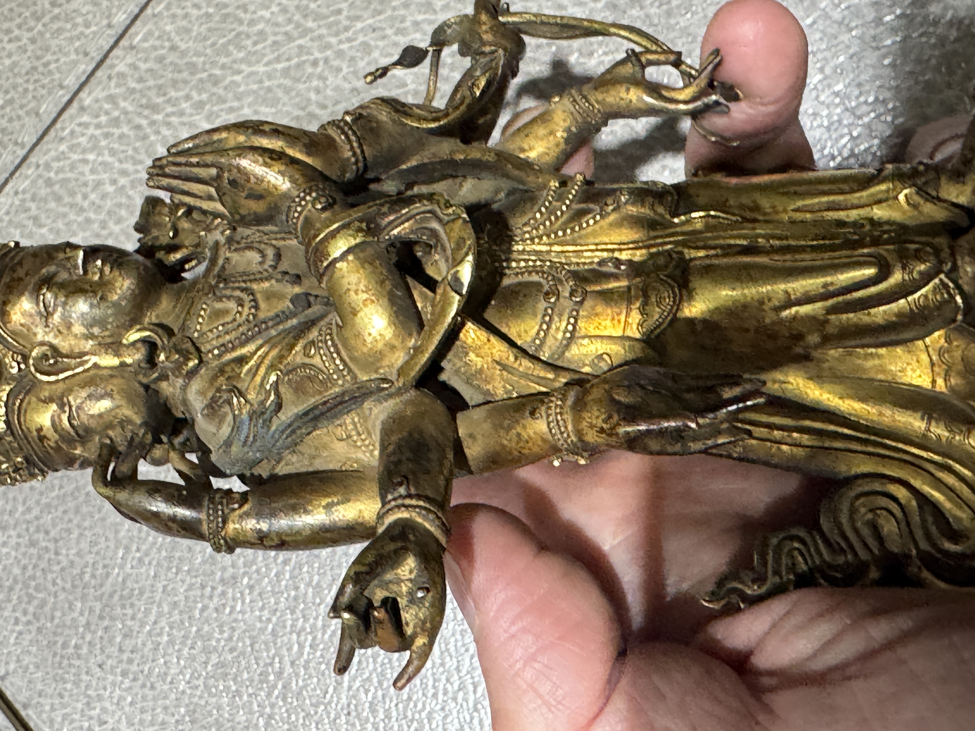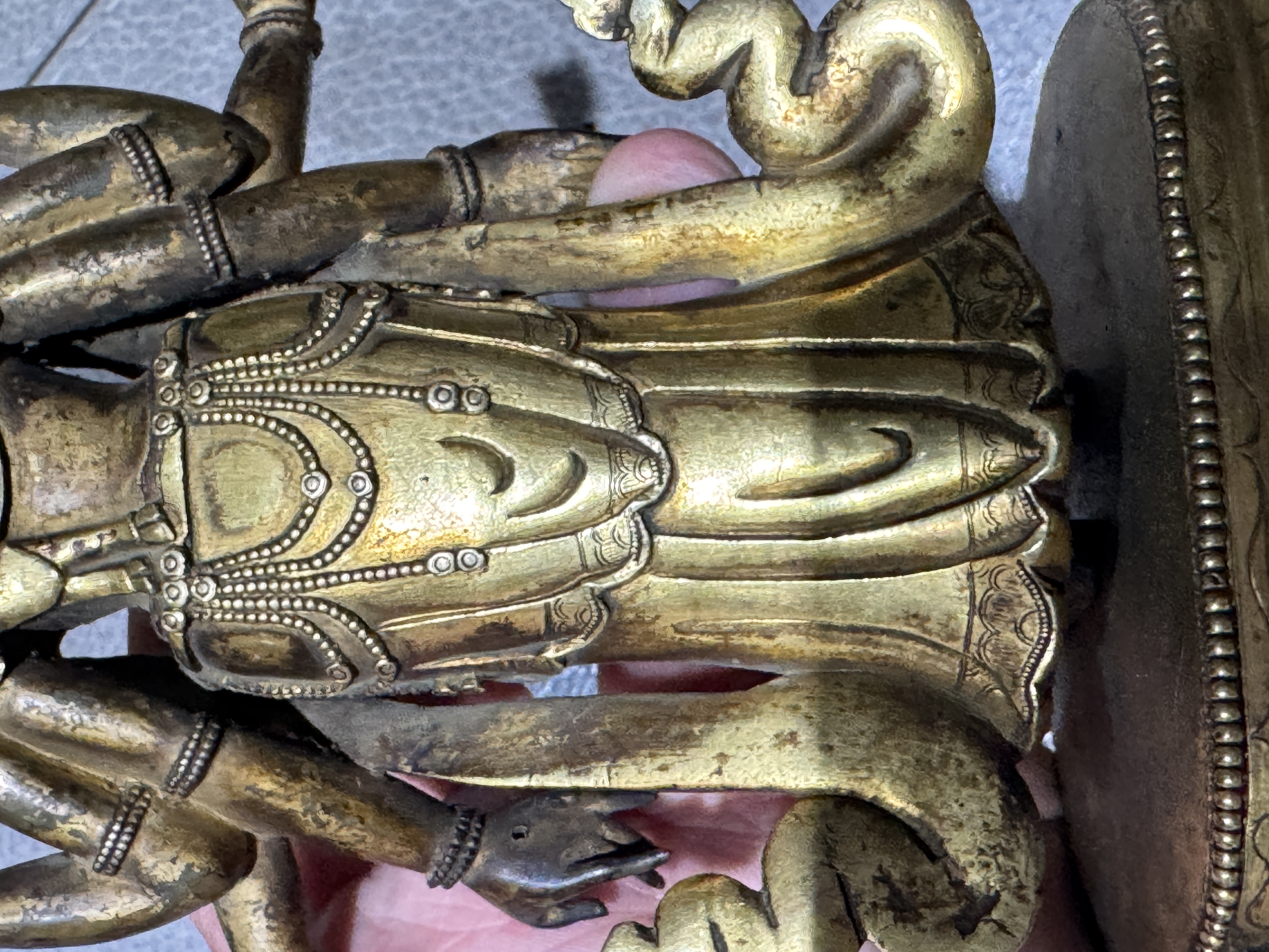 图片上的这尊造像是十一面八臂观音,整体造型精致,开脸生动,仔细观察细节工艺以及纹饰线条流畅,鎏金质感明亮,肢体灵动,底部圈足使用痕迹明显,结合铜质和制作工艺。综合判定为乾隆时期造像,有较高收藏价值