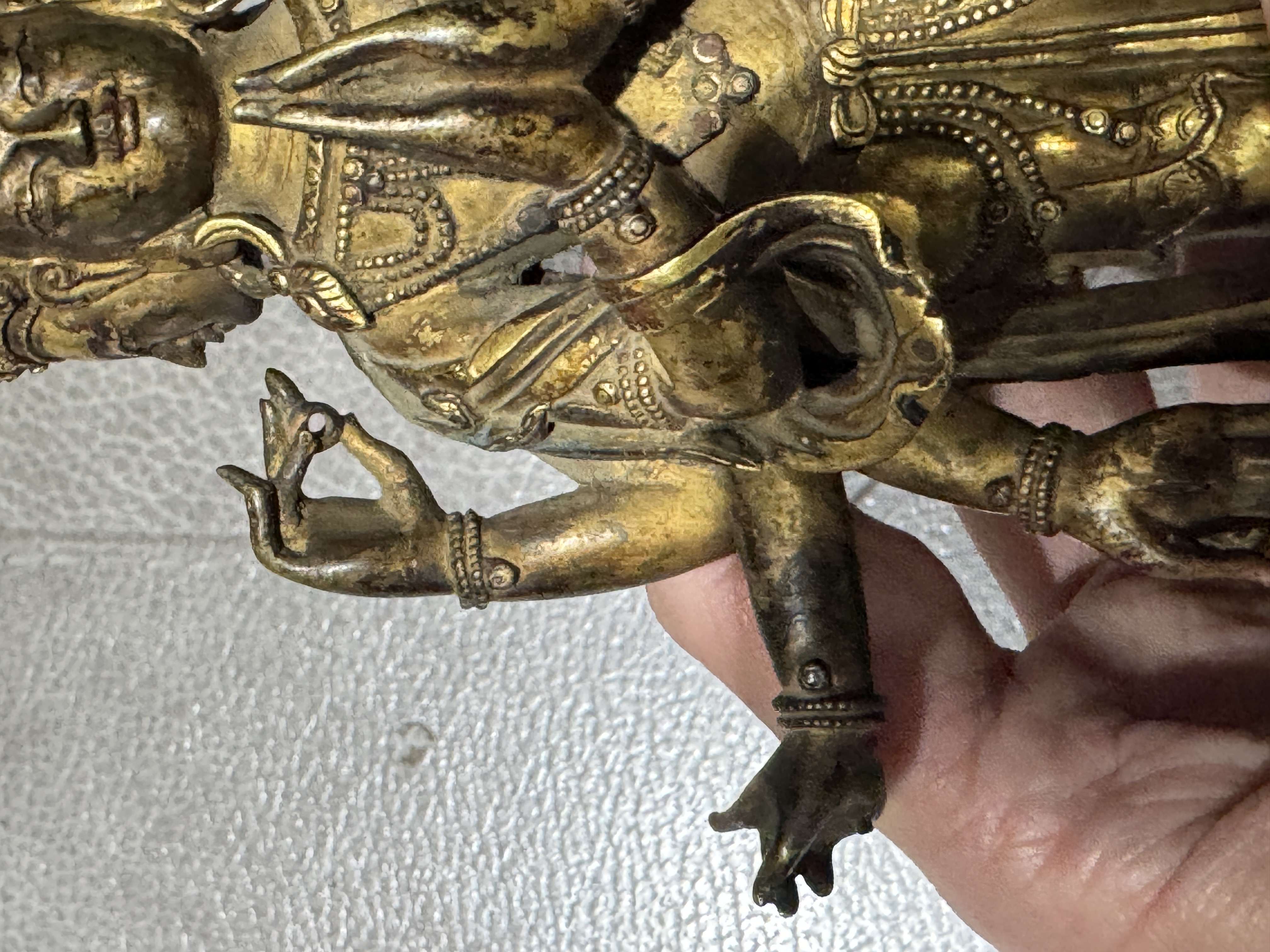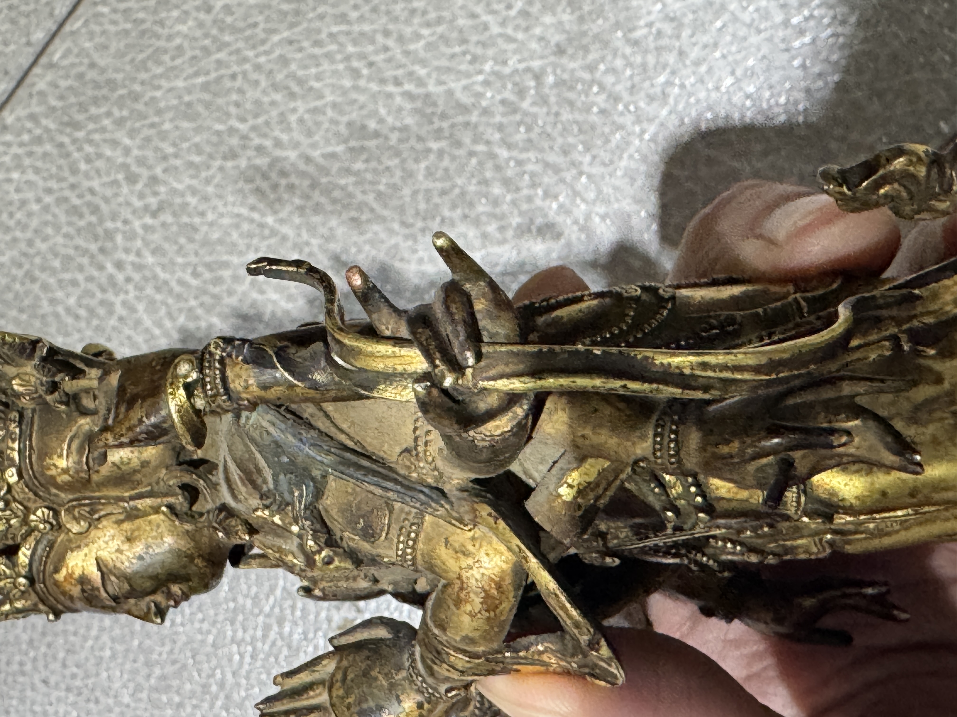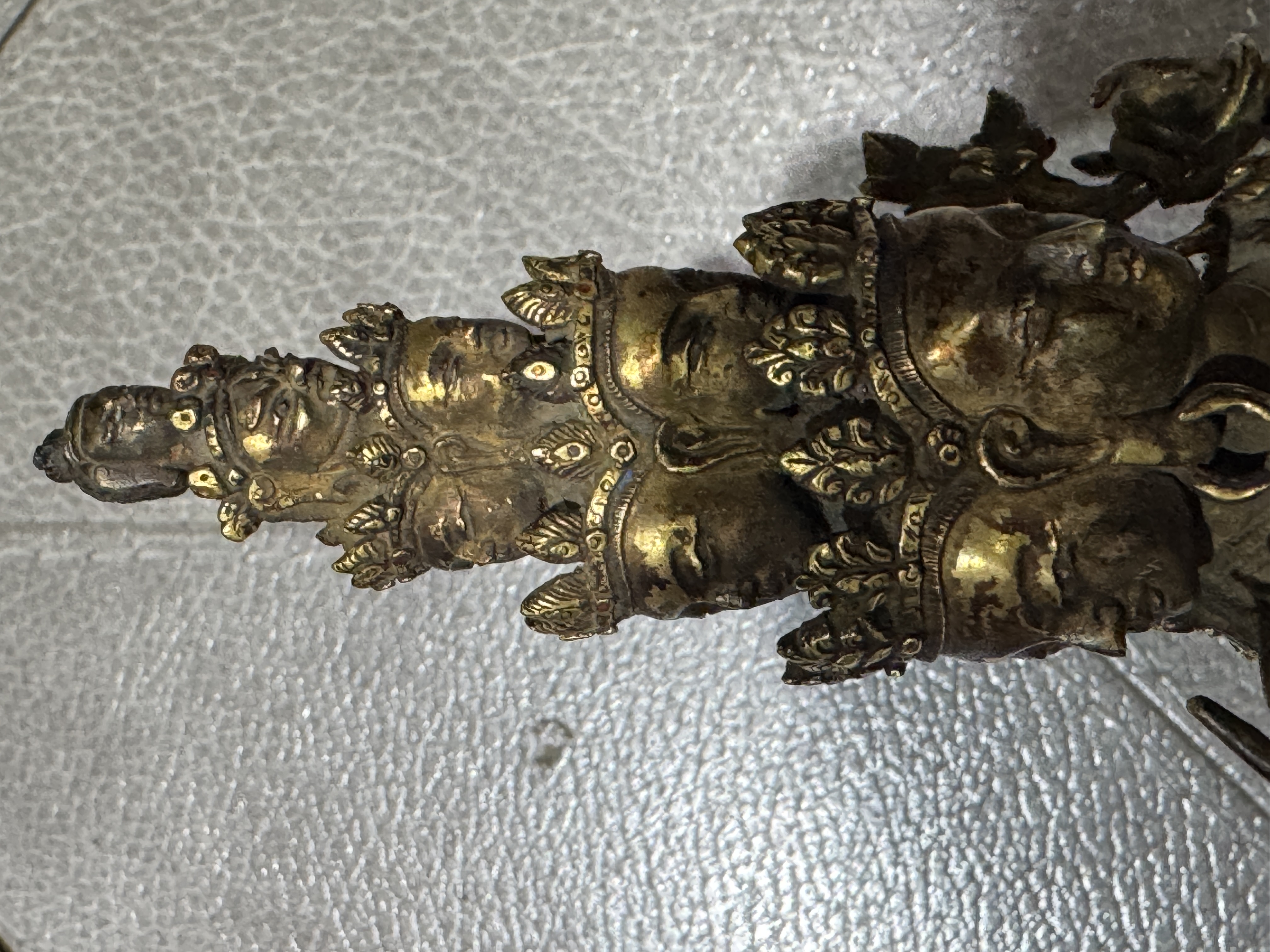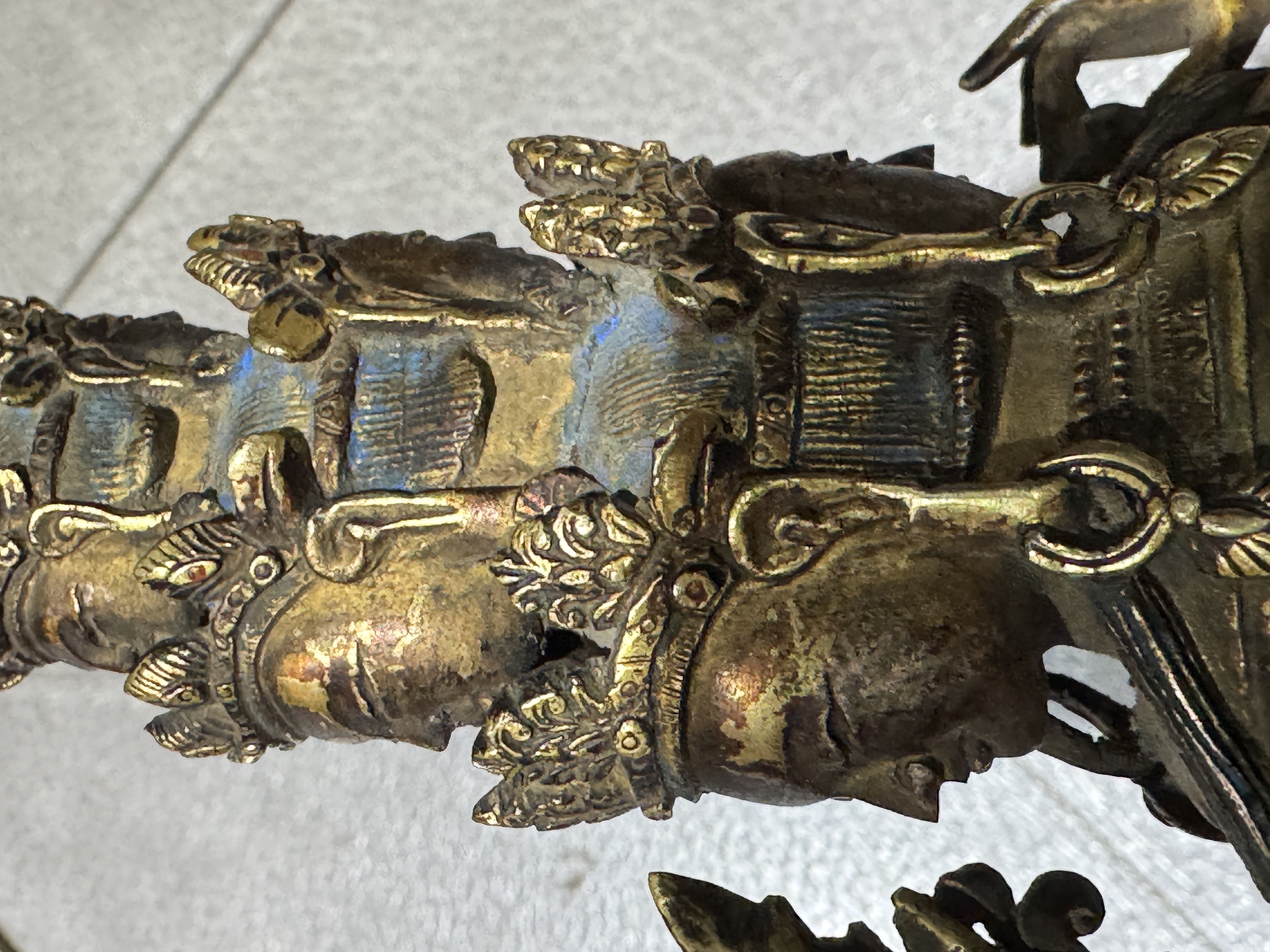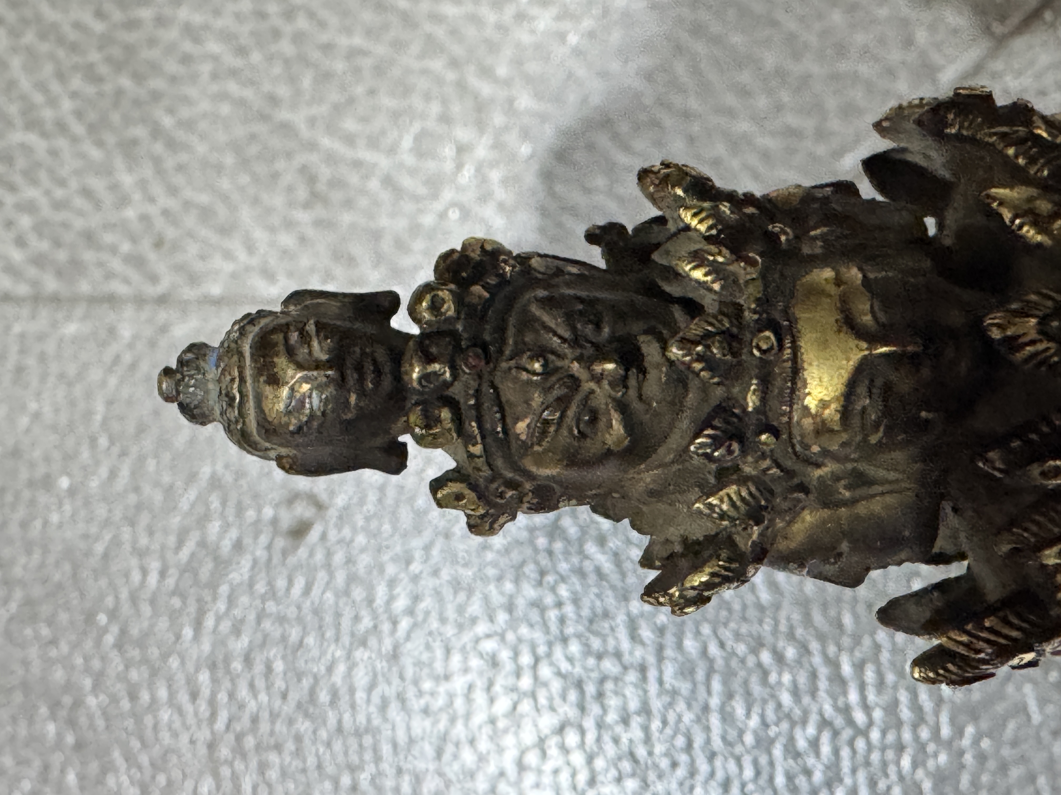图片上的这尊造像是十一面八臂观音,整体造型精致,开脸生动,仔细观察细节工艺以及纹饰线条流畅,鎏金质感明亮,肢体灵动,底部圈足使用痕迹明显,结合铜质和制作工艺。综合判定为乾隆时期造像,有较高收藏价值