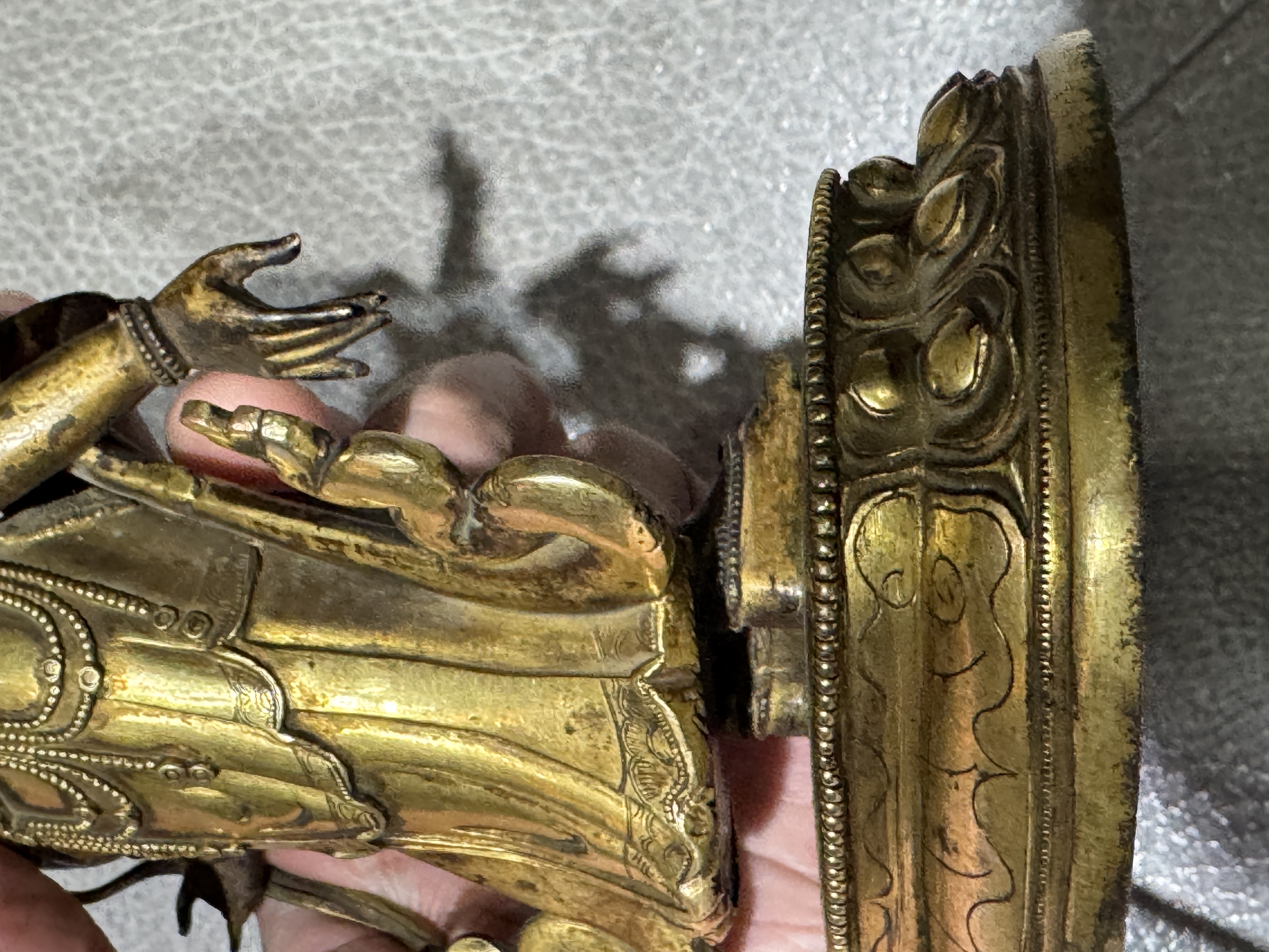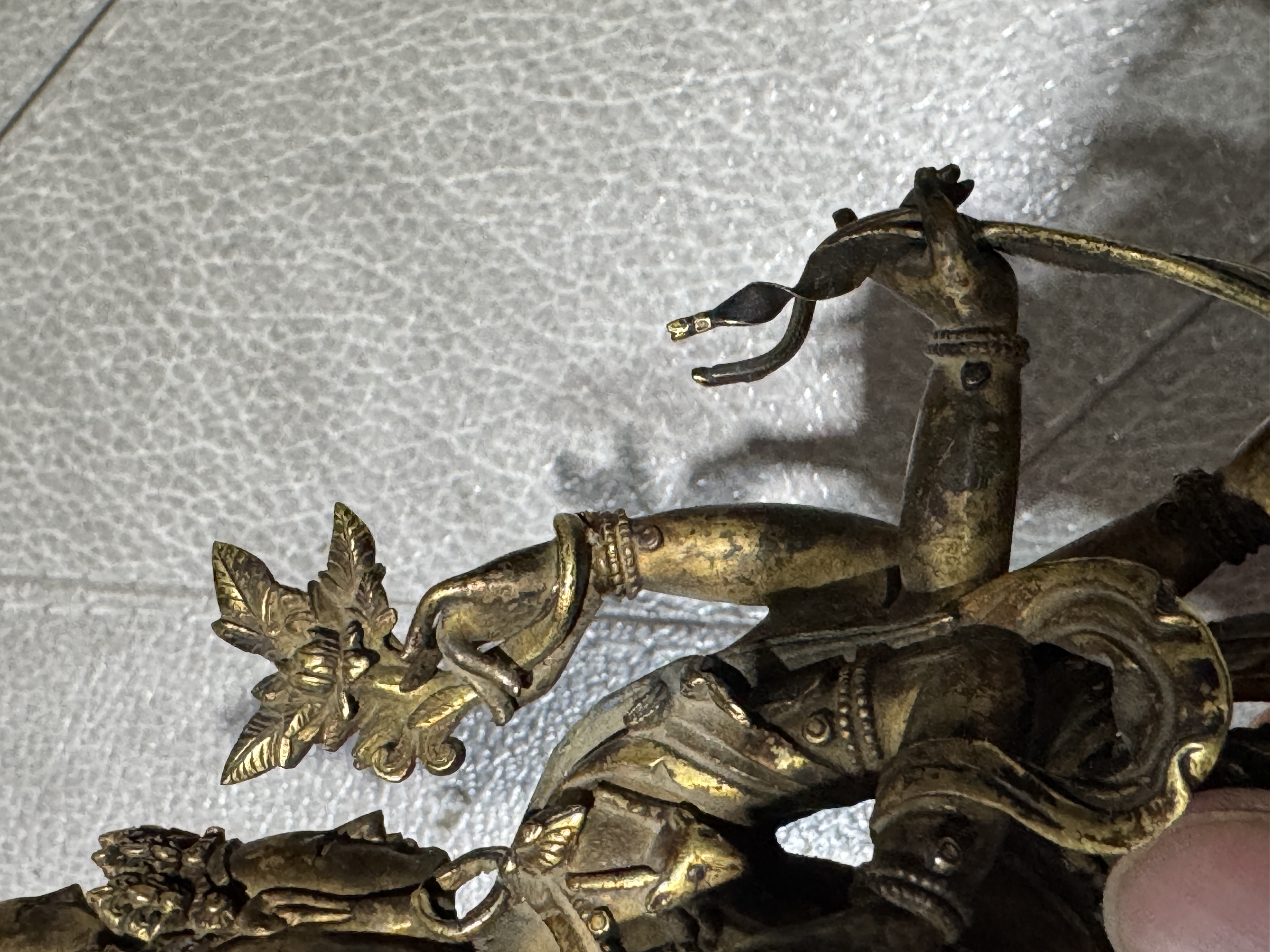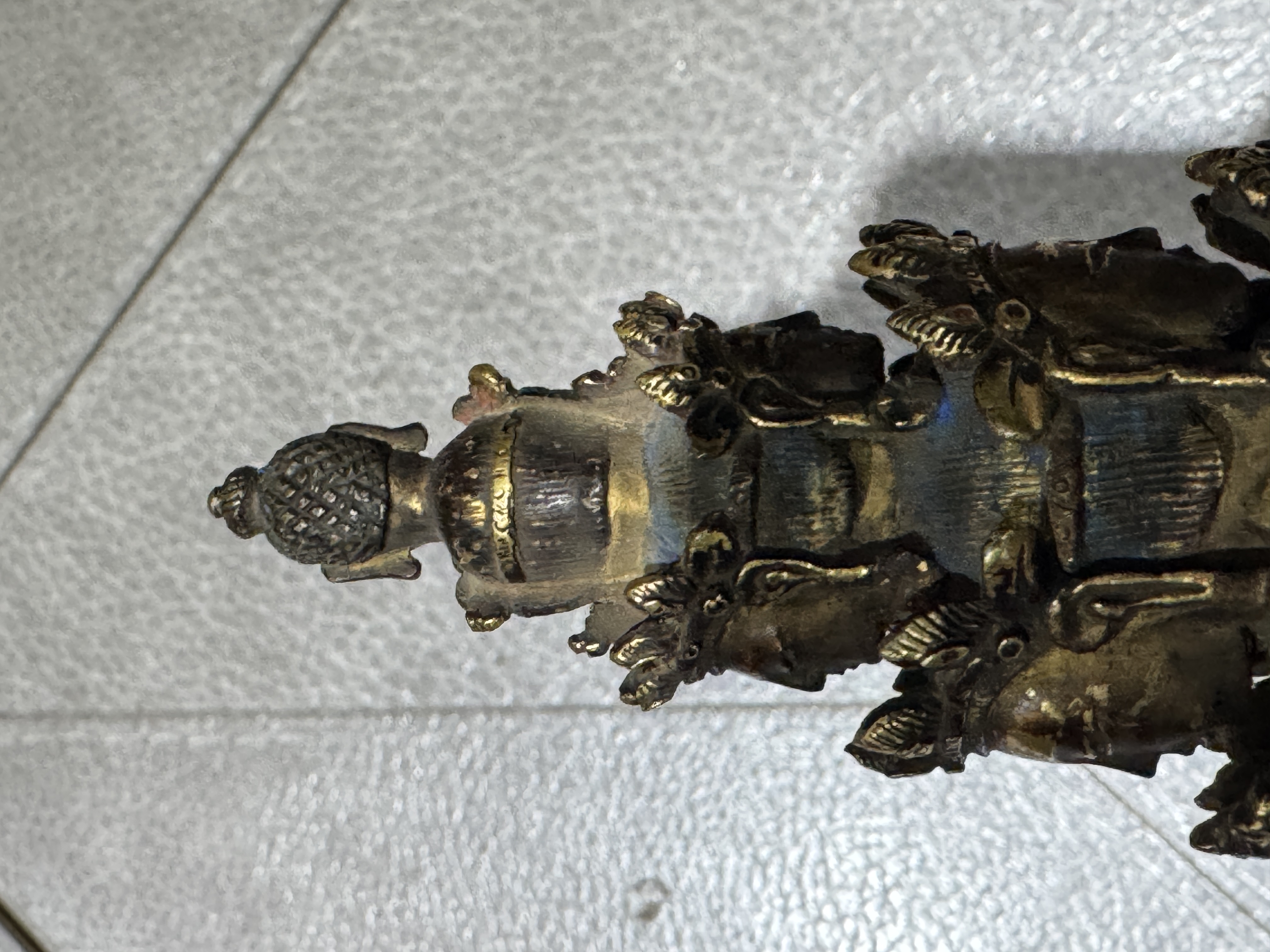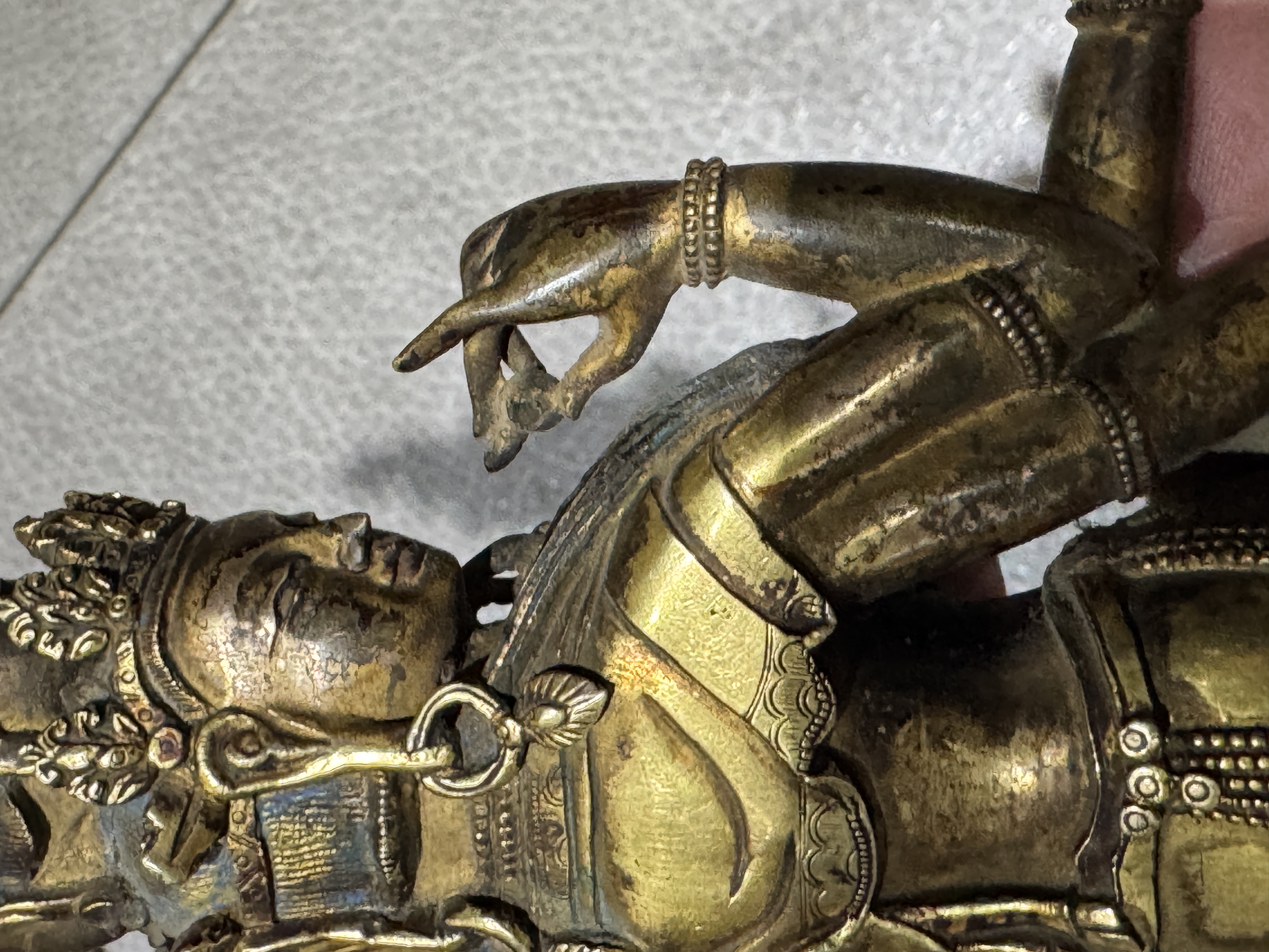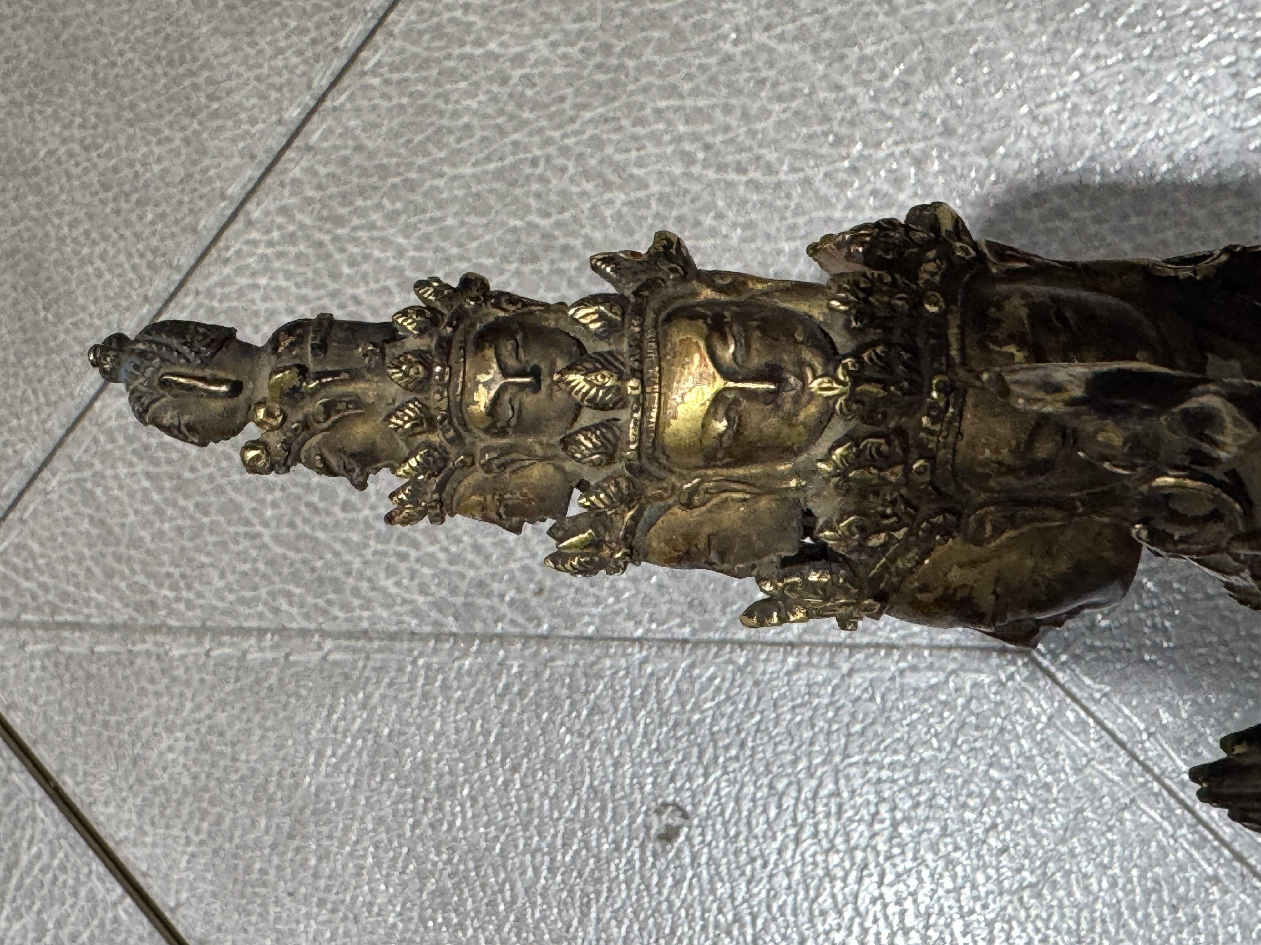 图片上的这尊造像是十一面八臂观音,整体造型精致,开脸生动,仔细观察细节工艺以及纹饰线条流畅,鎏金质感明亮,肢体灵动,底部圈足使用痕迹明显,结合铜质和制作工艺。综合判定为乾隆时期造像,有较高收藏价值