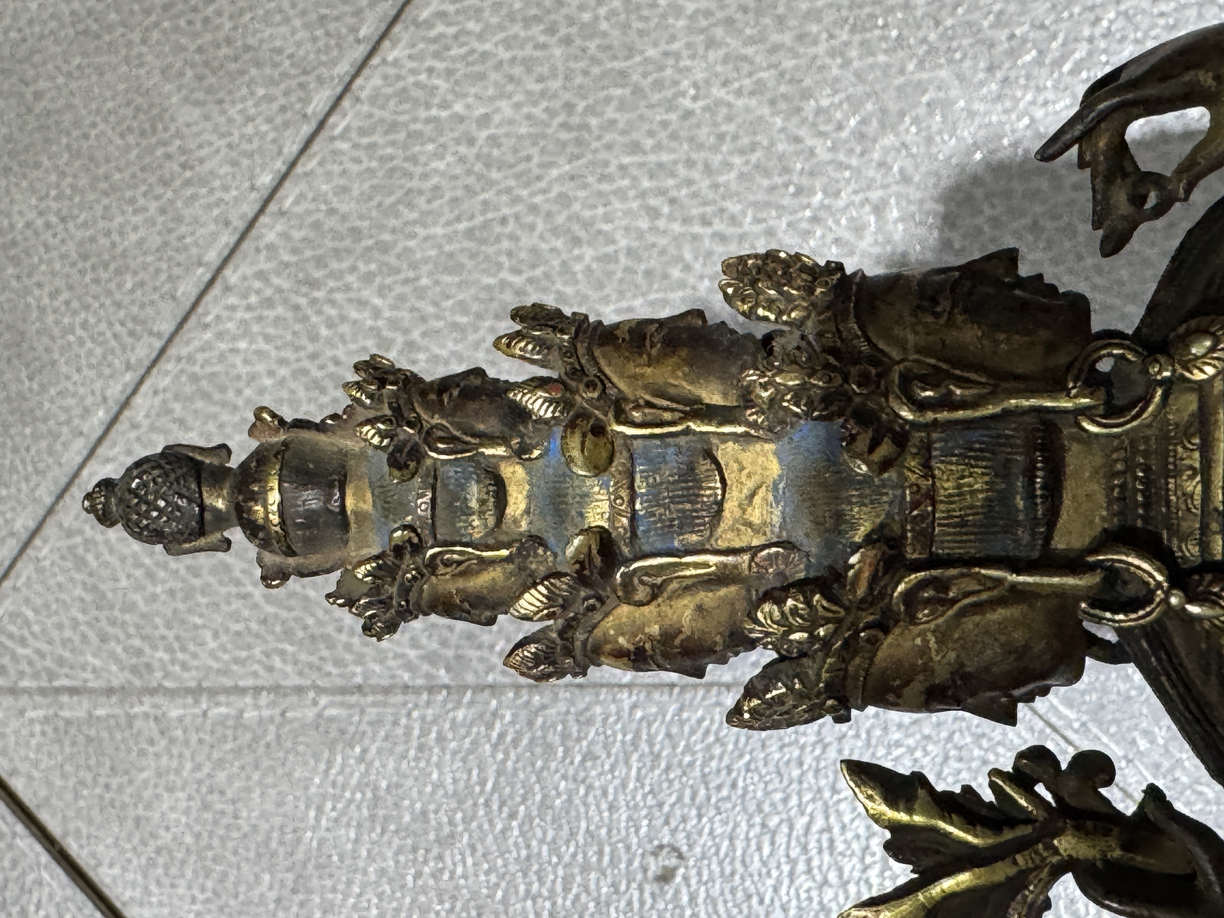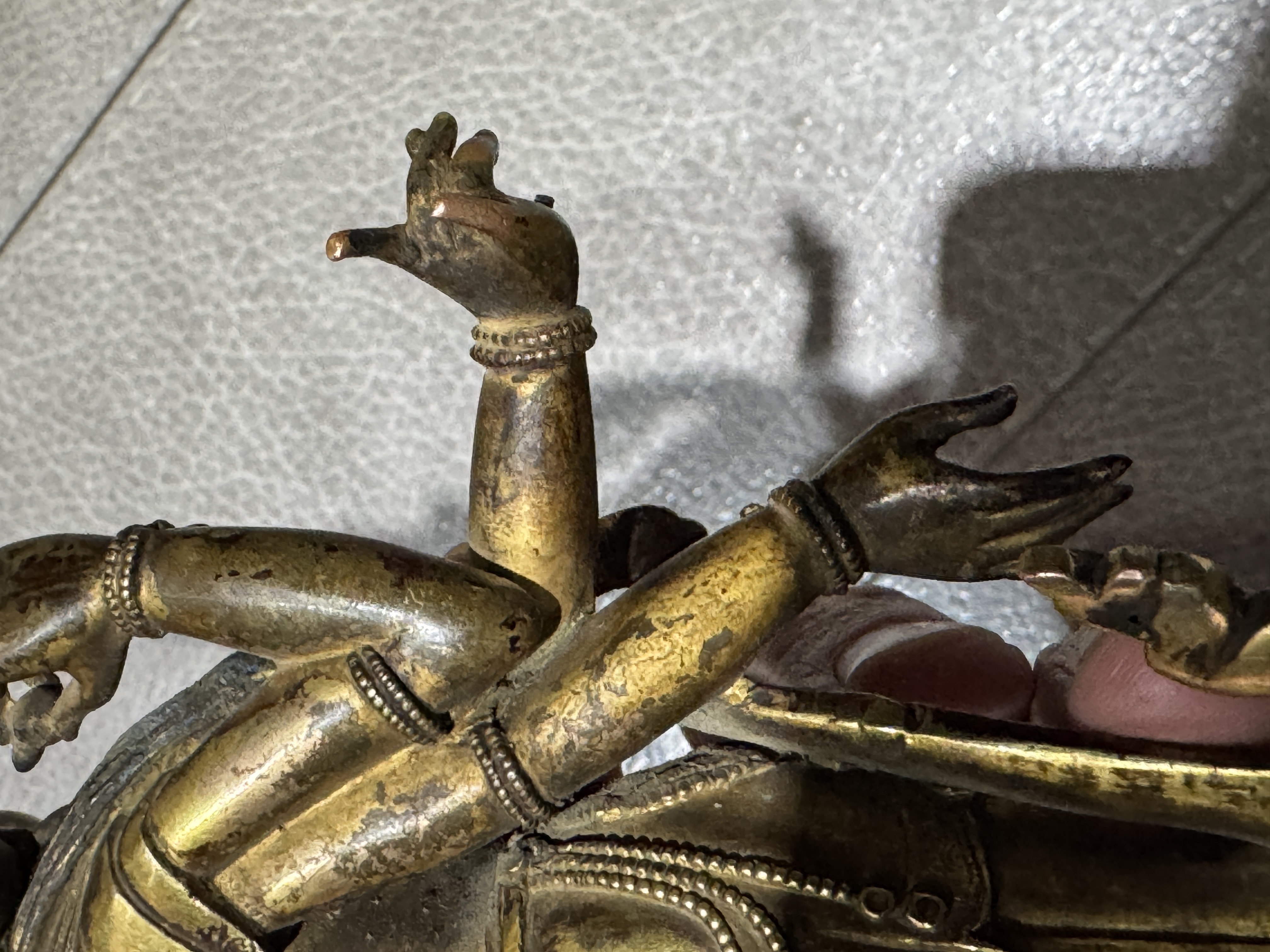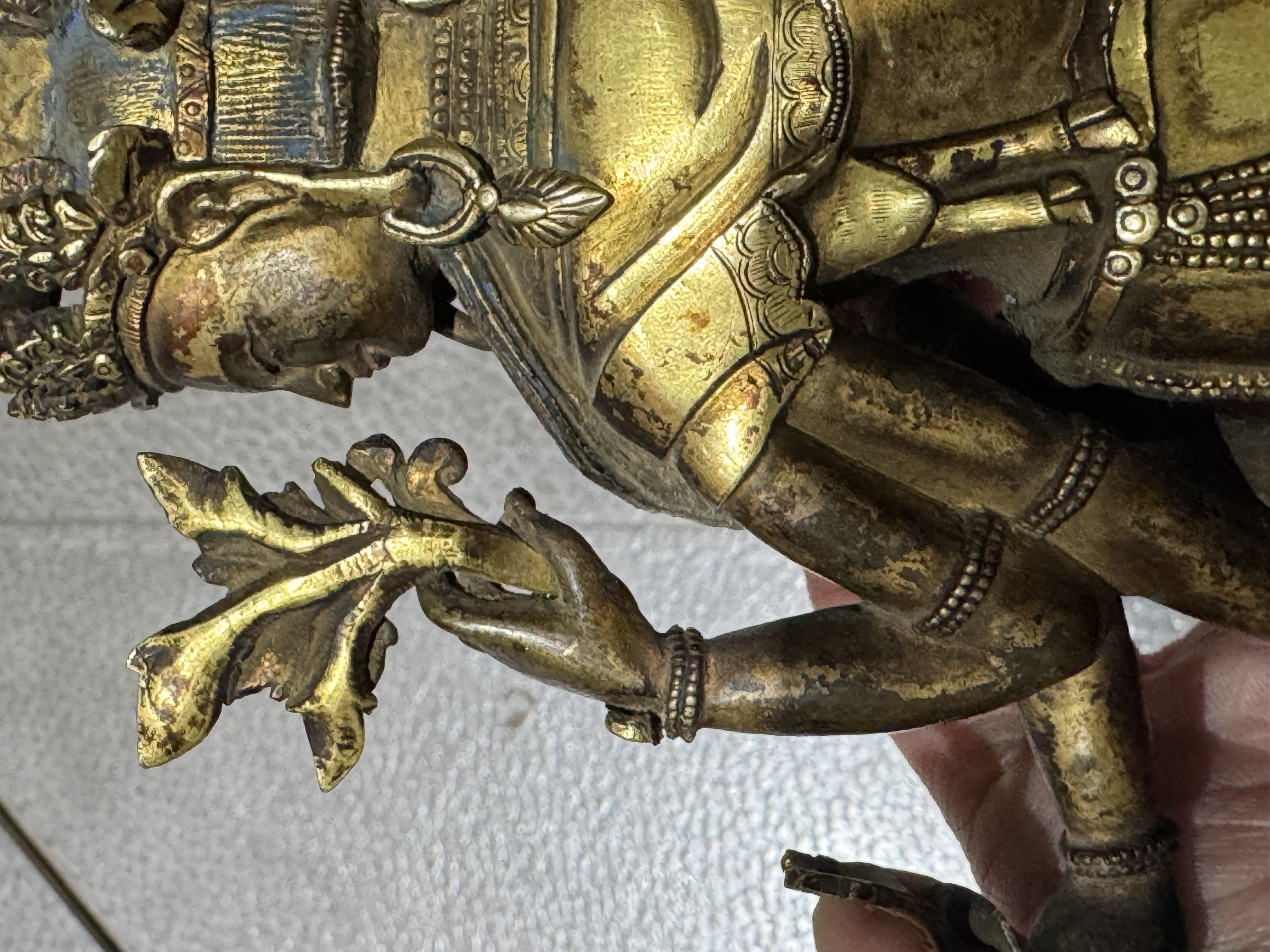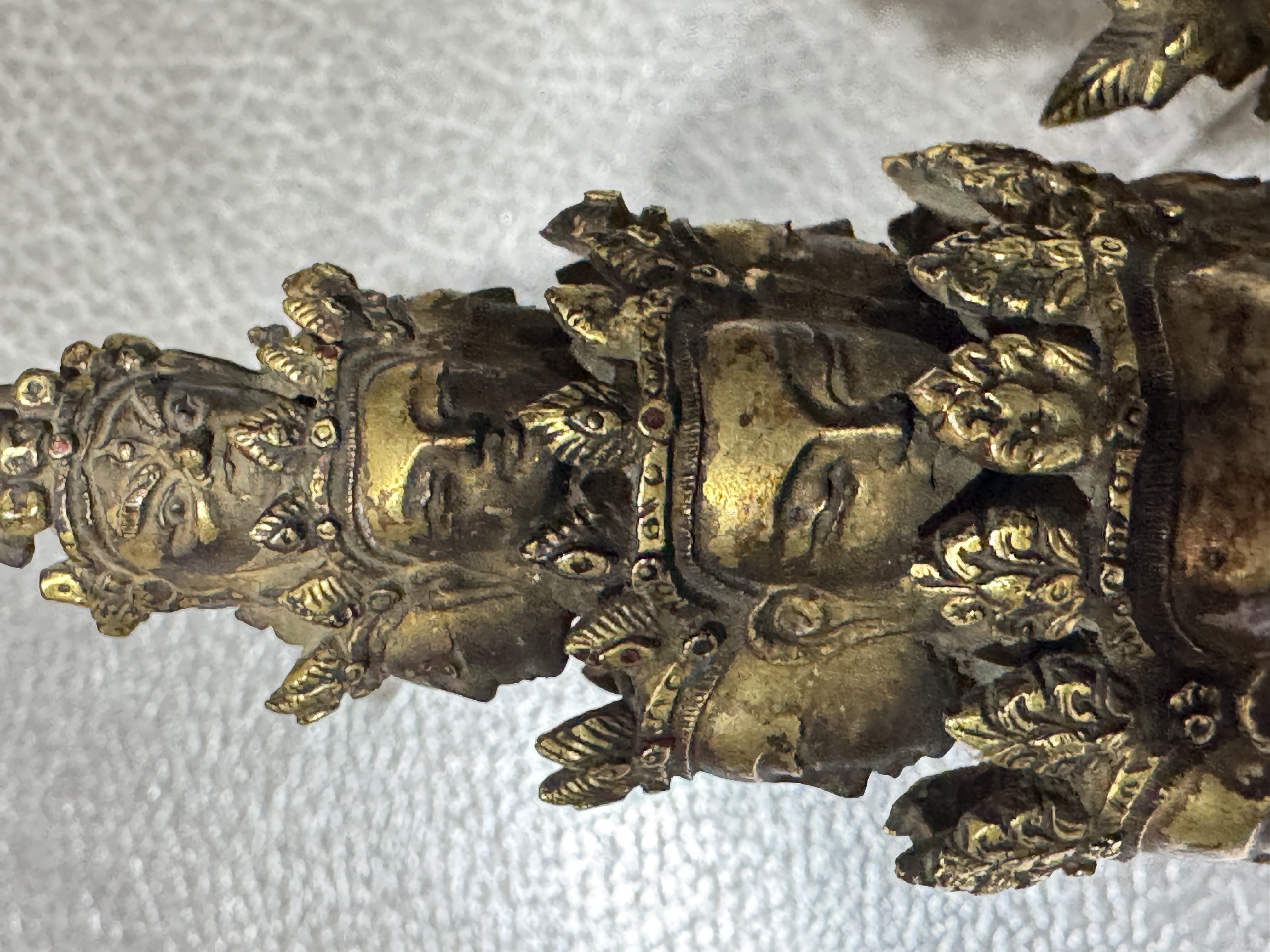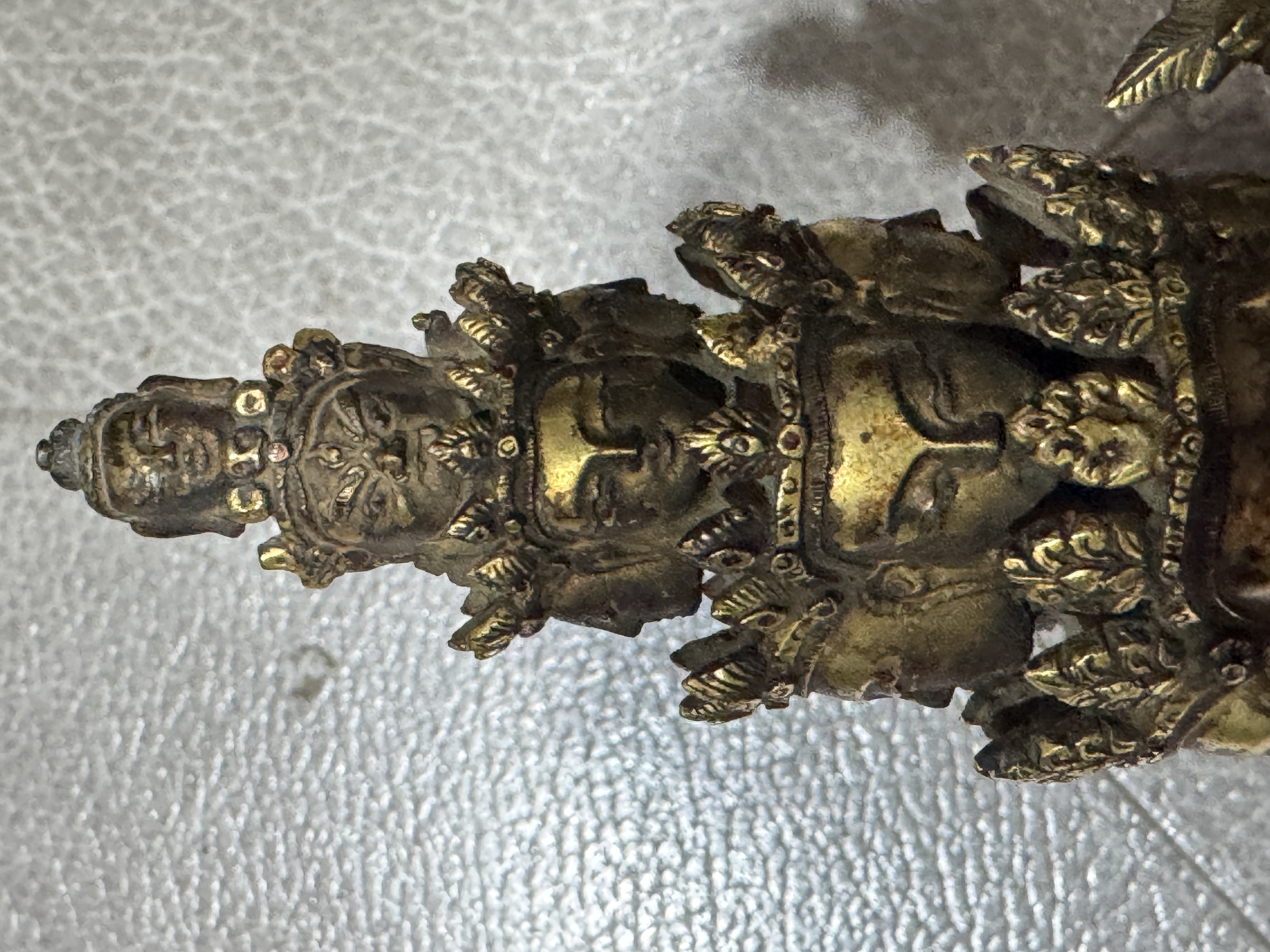图片上的这尊造像是十一面八臂观音,整体造型精致,开脸生动,仔细观察细节工艺以及纹饰线条流畅,鎏金质感明亮,肢体灵动,底部圈足使用痕迹明显,结合铜质和制作工艺。综合判定为乾隆时期造像,有较高收藏价值