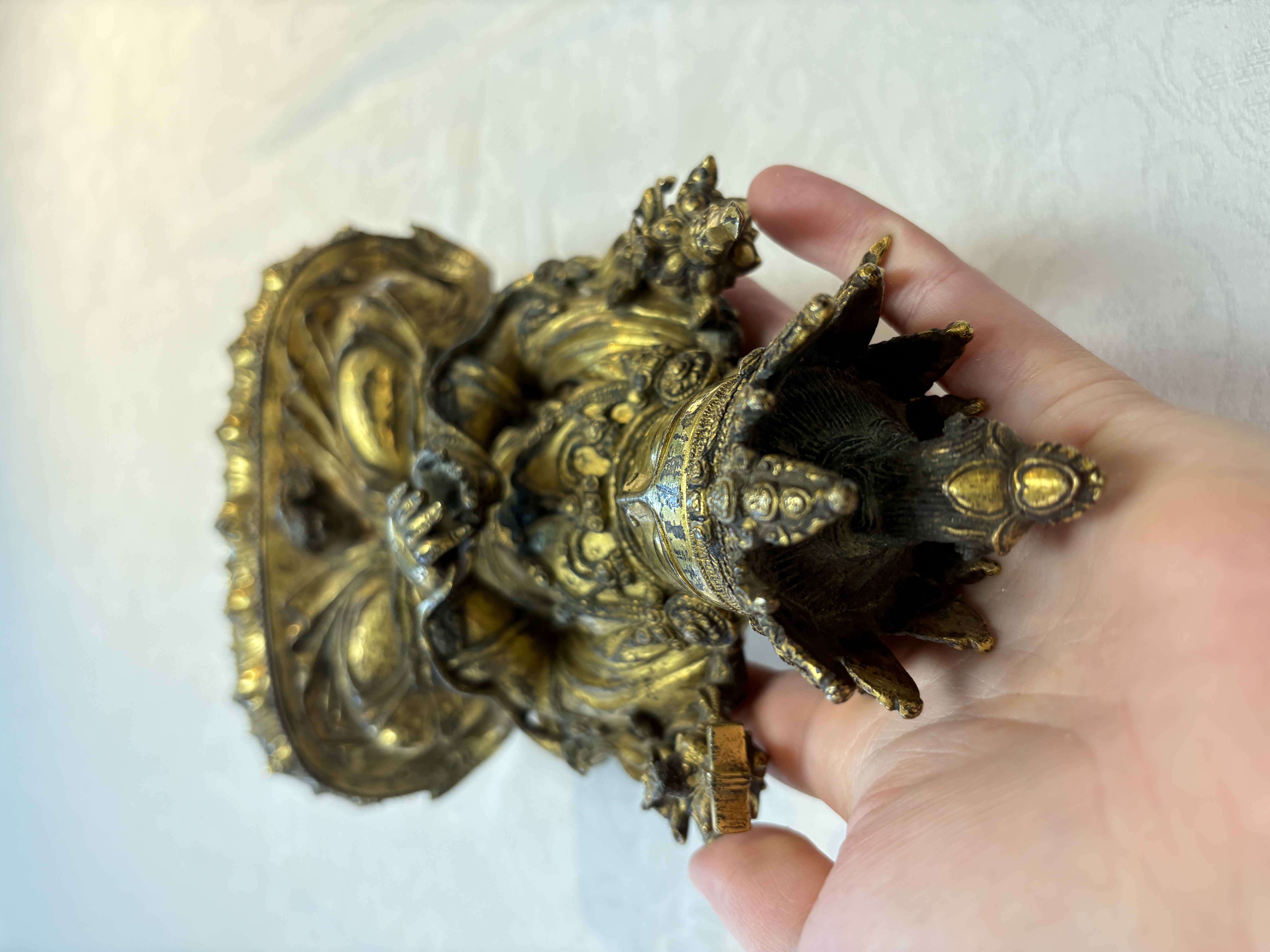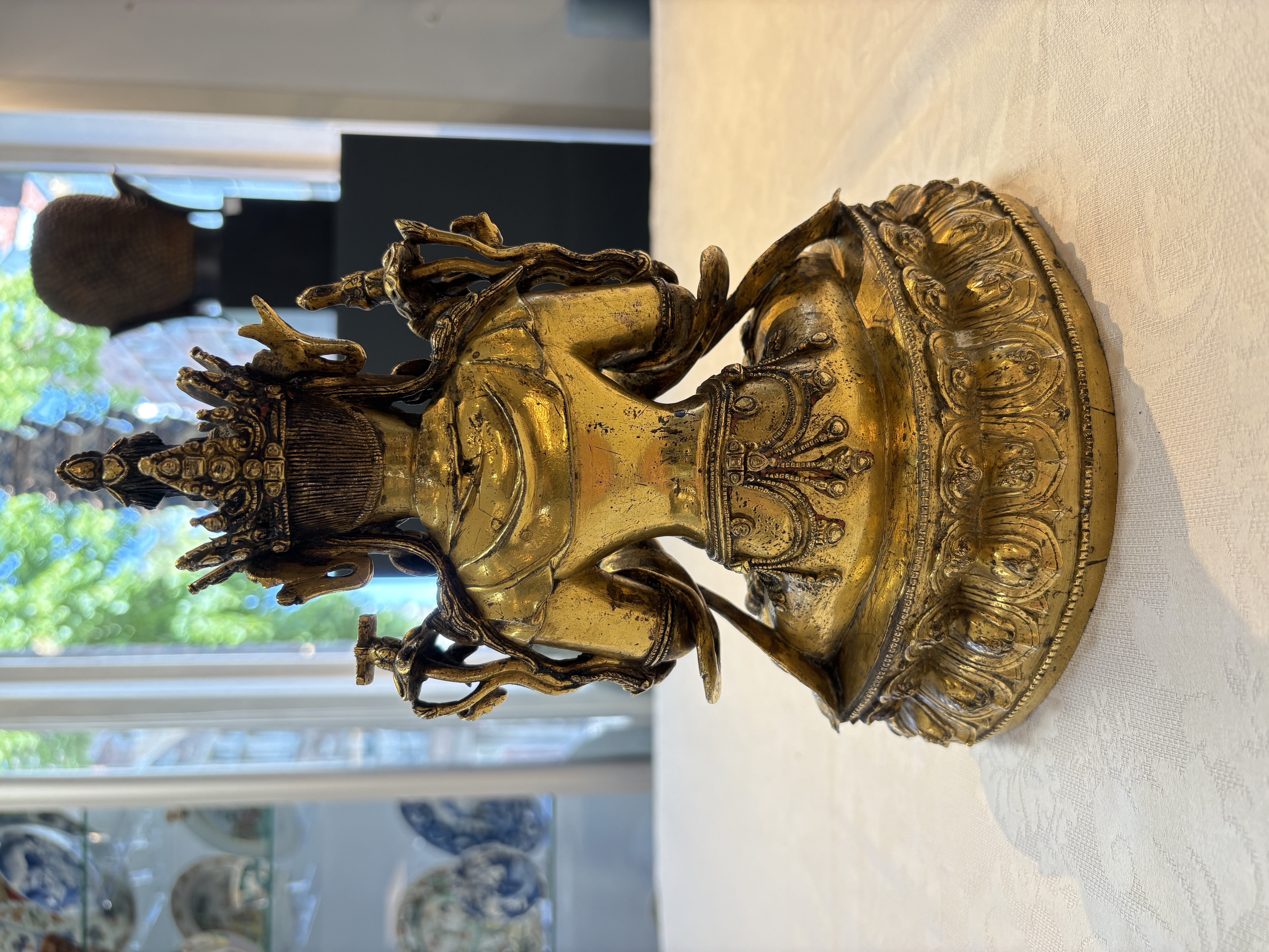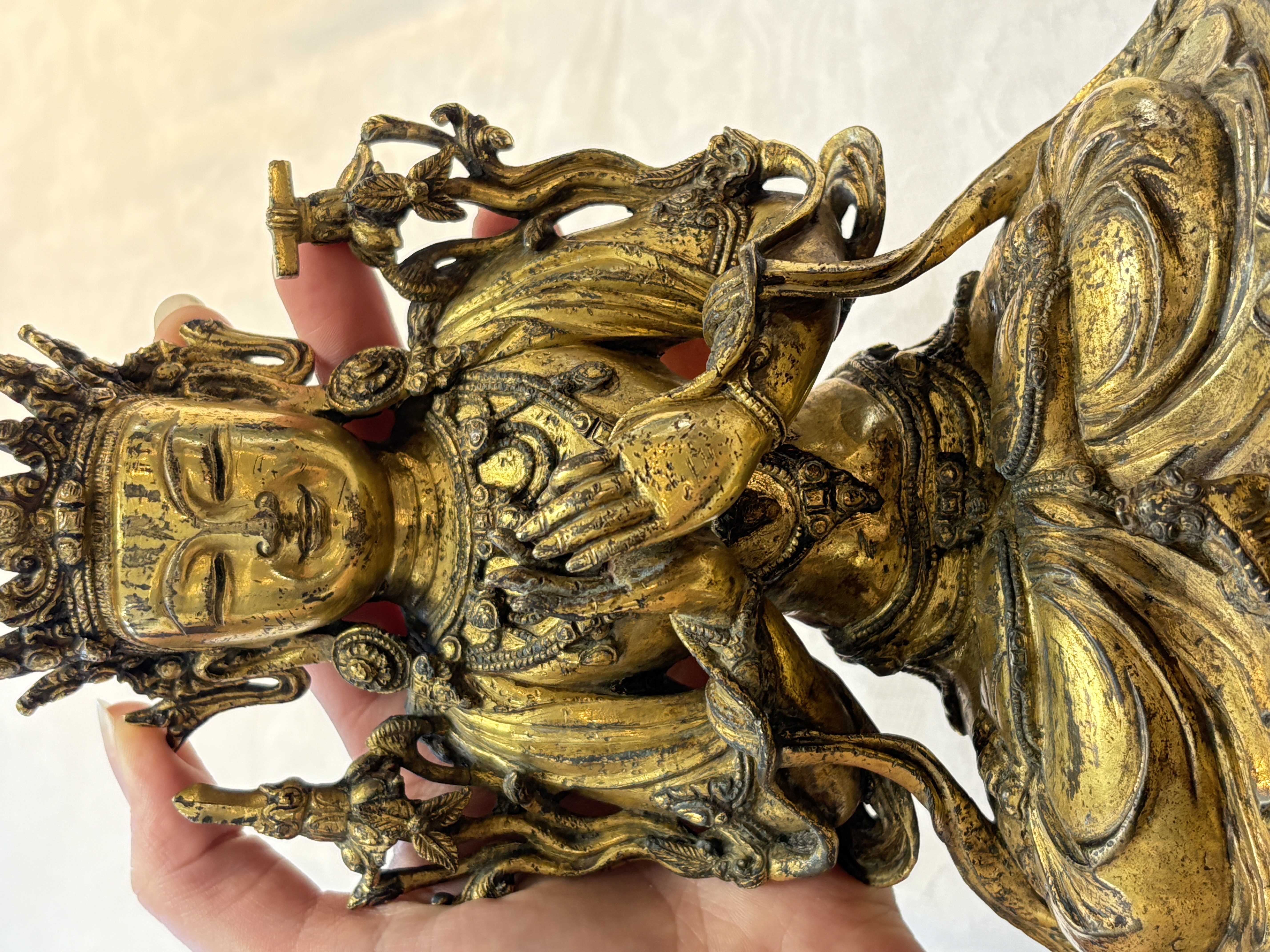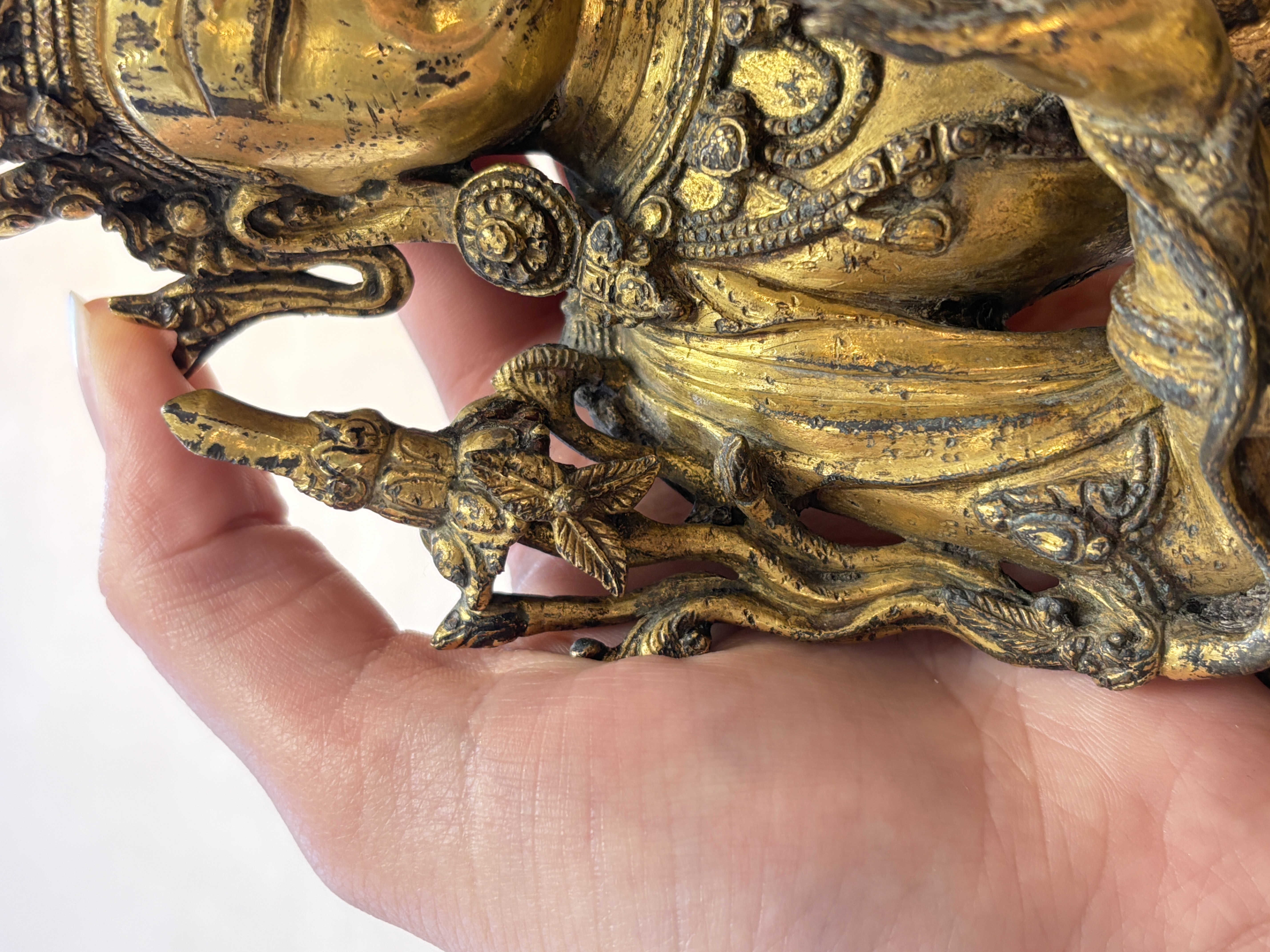 图片上的这尊造像是文殊菩萨,整体造型精致,开脸生动。仔细观察细节工艺以及纹饰,可见线条流畅,肢体有灵动感,鎏金质感明亮,左肩饰一本经书,右肩饰一把宝剑,底部圈足使用痕迹明显,刻款规整,内膛清爽,为明代永宣风格造像,有较高收藏价值。惜鎏金局部有磨损对价值略有影响。