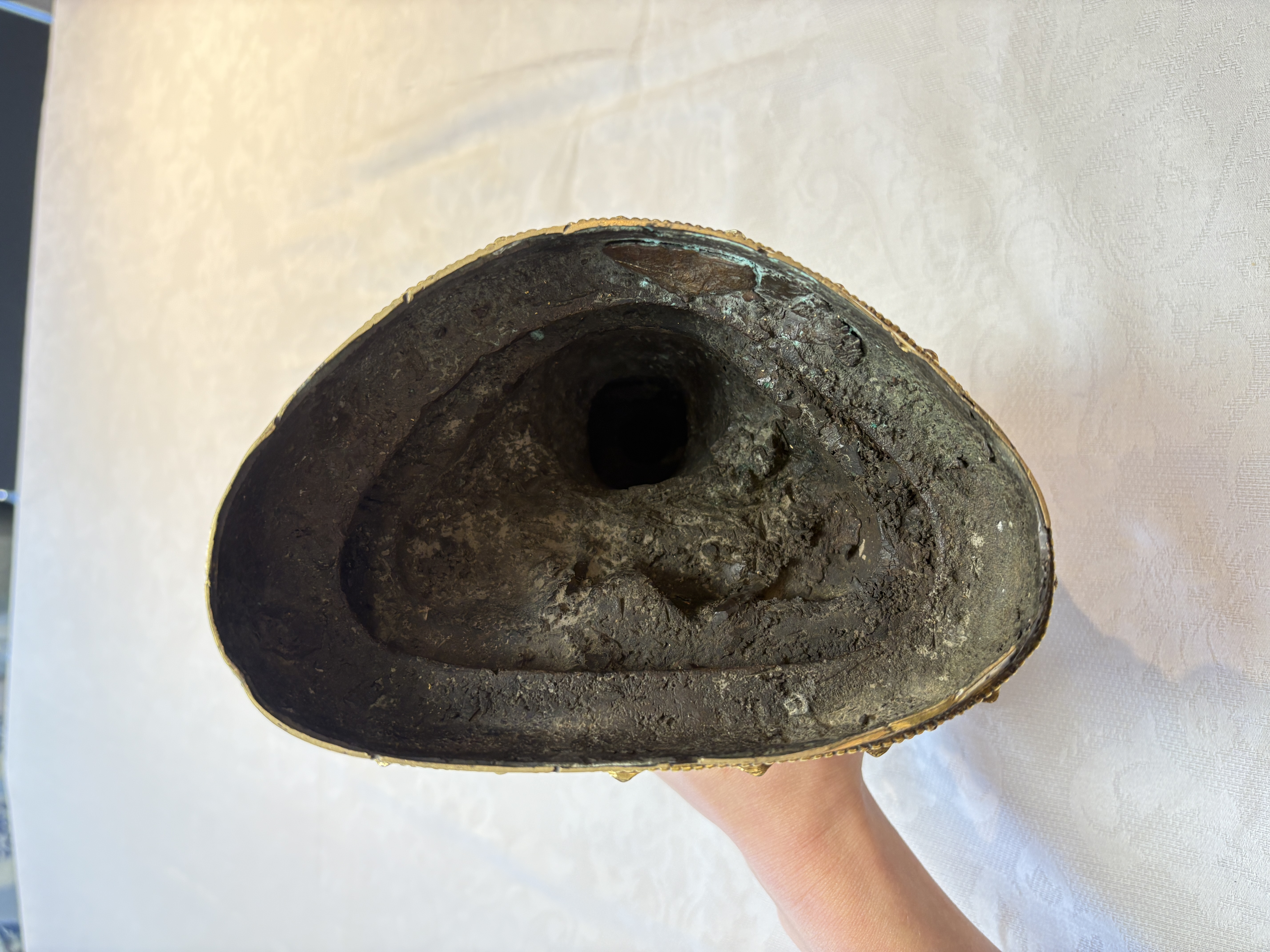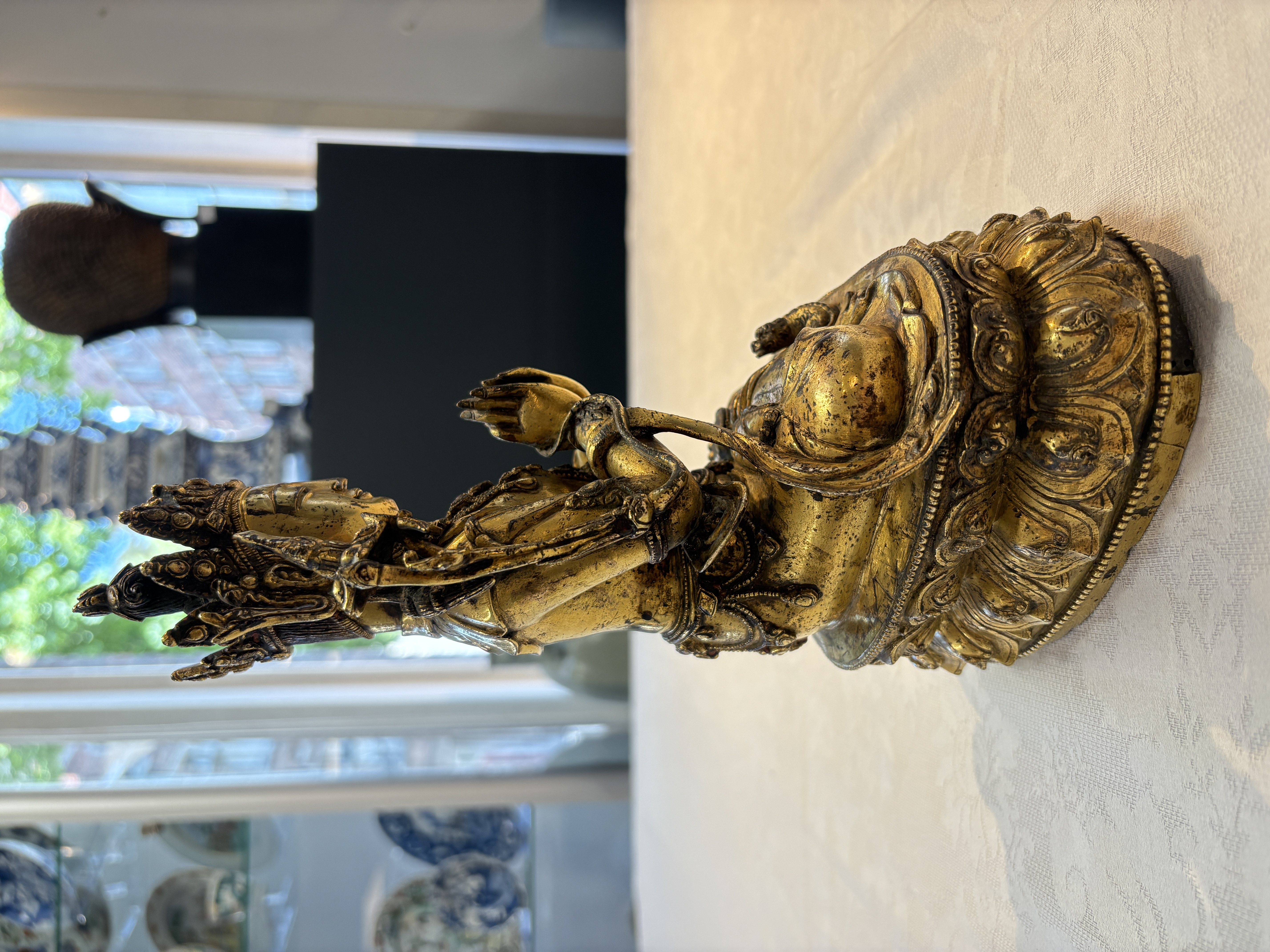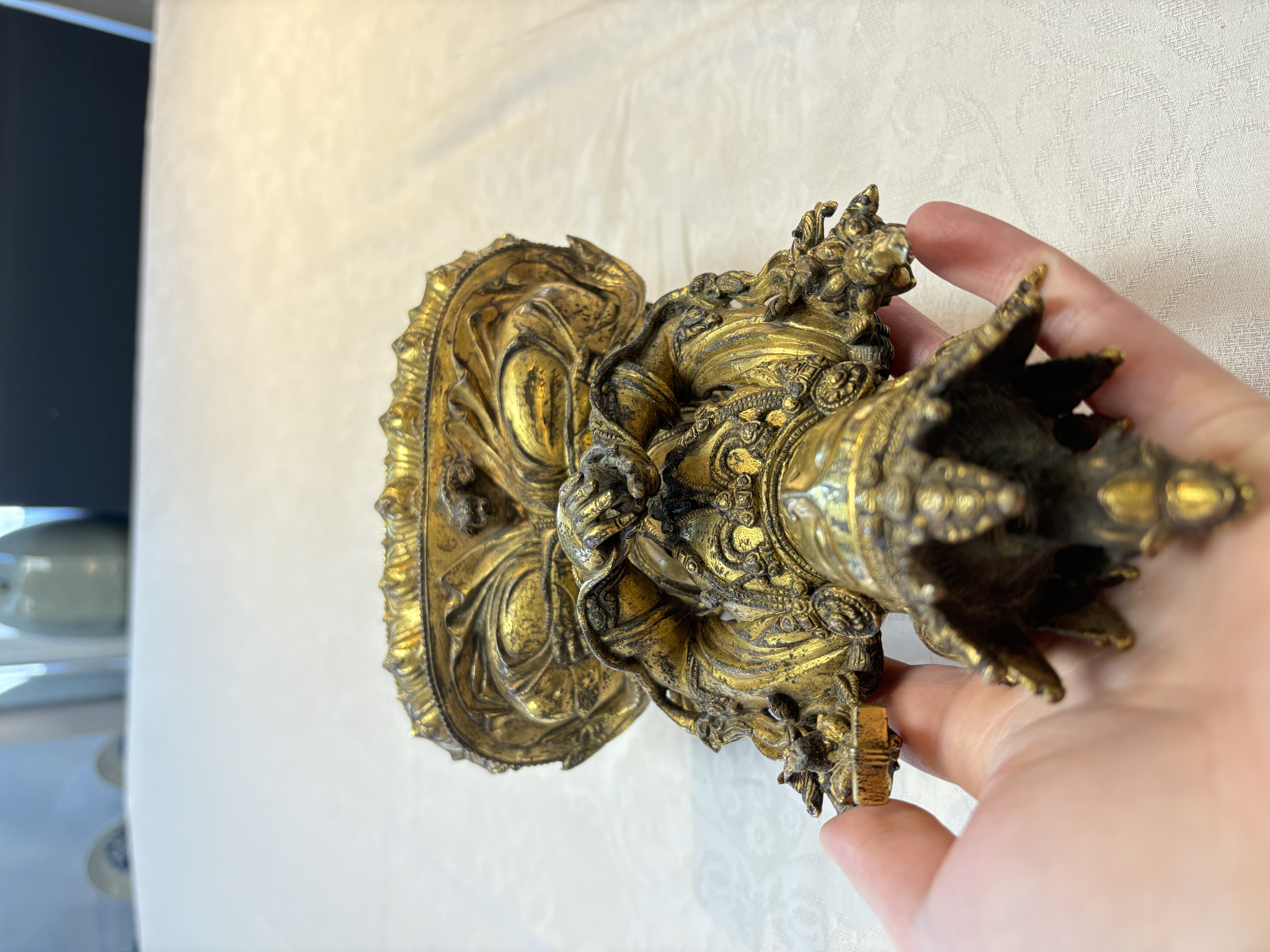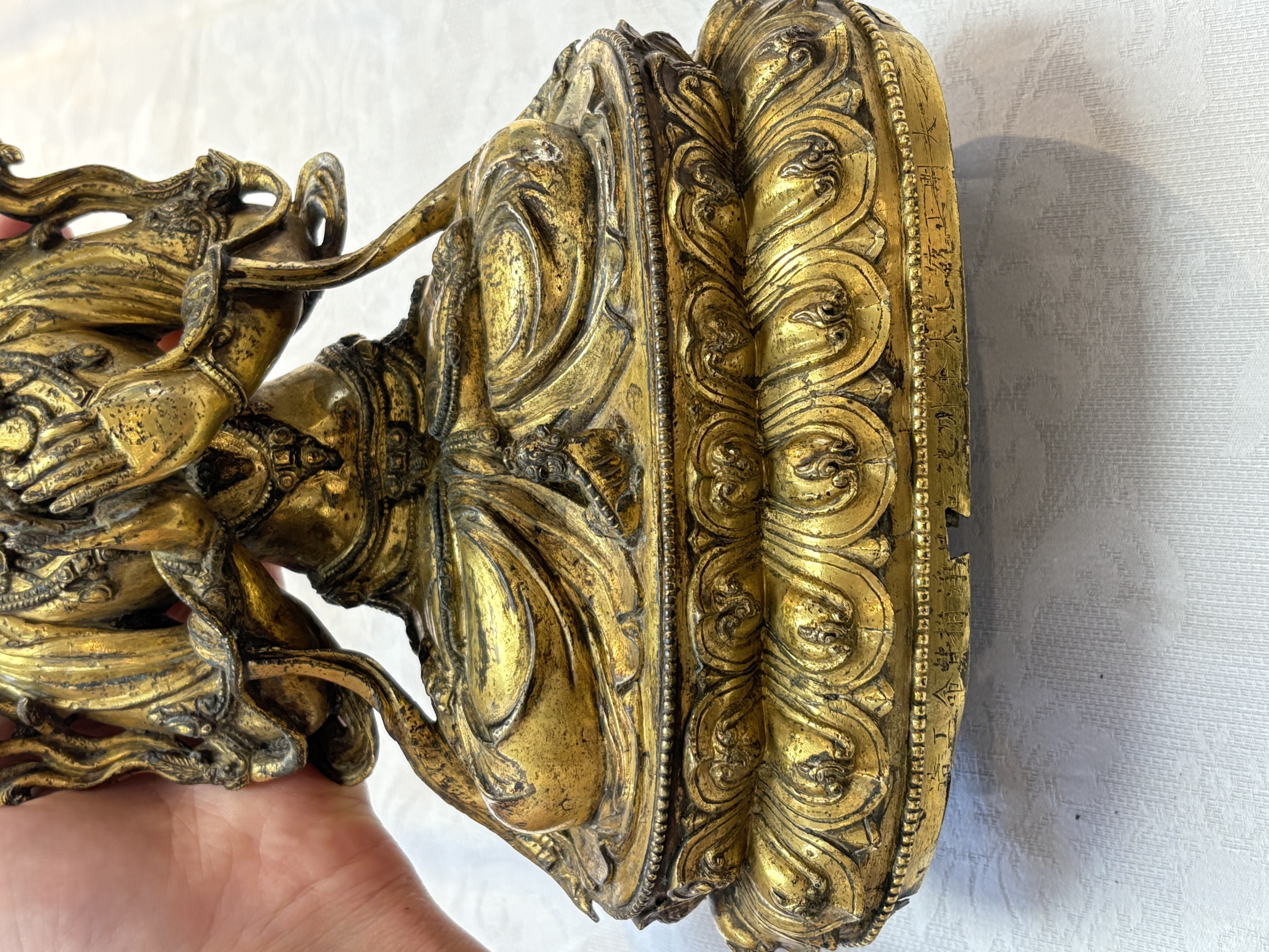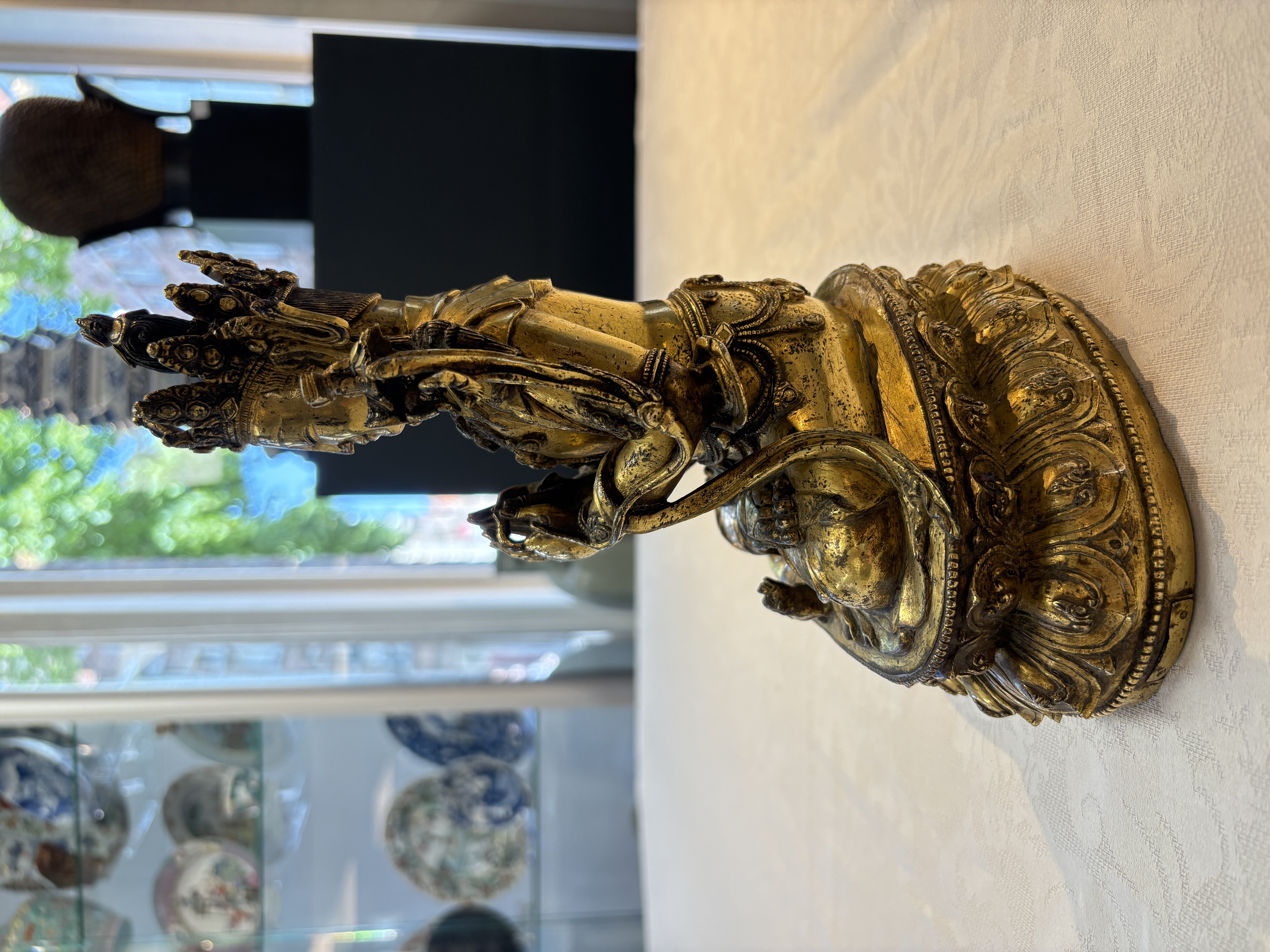 图片上的这尊造像是文殊菩萨,整体造型精致,开脸生动。仔细观察细节工艺以及纹饰,可见线条流畅,肢体有灵动感,鎏金质感明亮,左肩饰一本经书,右肩饰一把宝剑,底部圈足使用痕迹明显,刻款规整,内膛清爽,为明代永宣风格造像,有较高收藏价值。惜鎏金局部有磨损对价值略有影响。