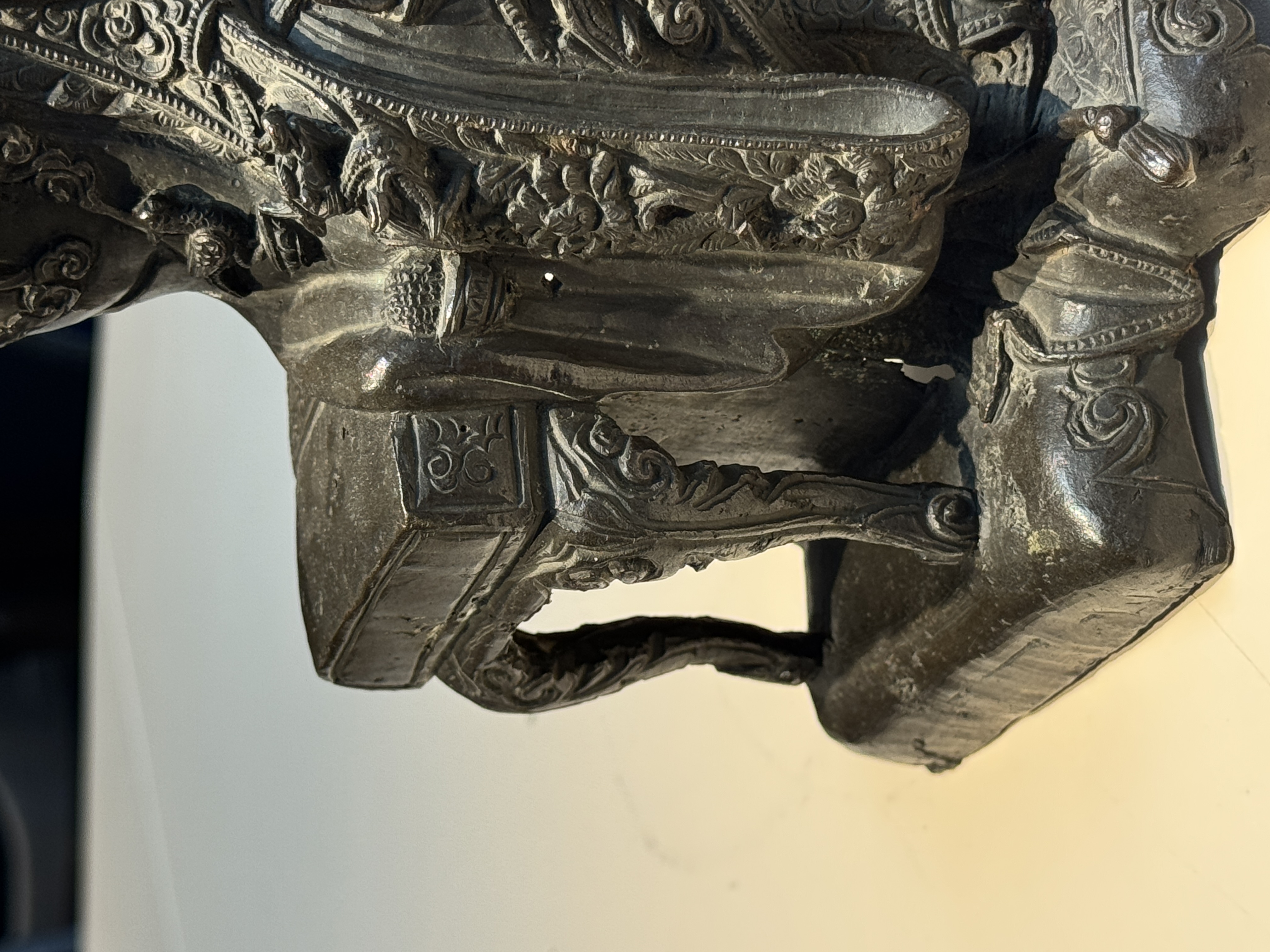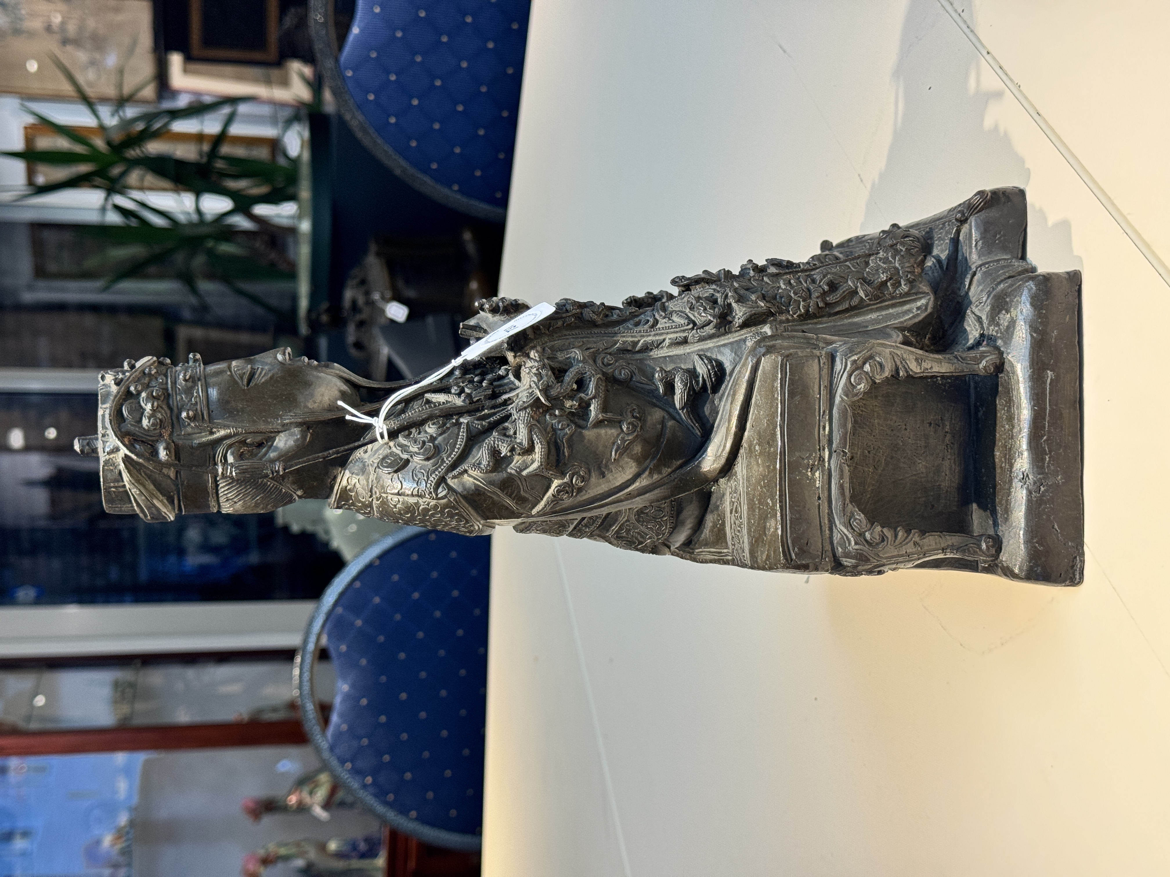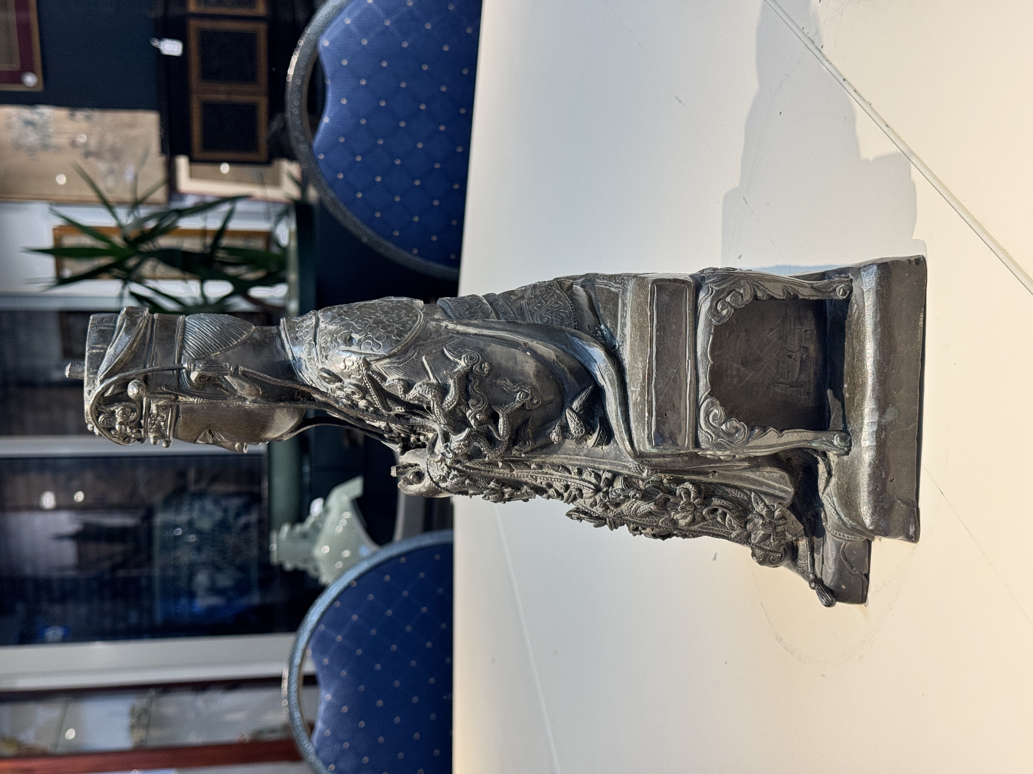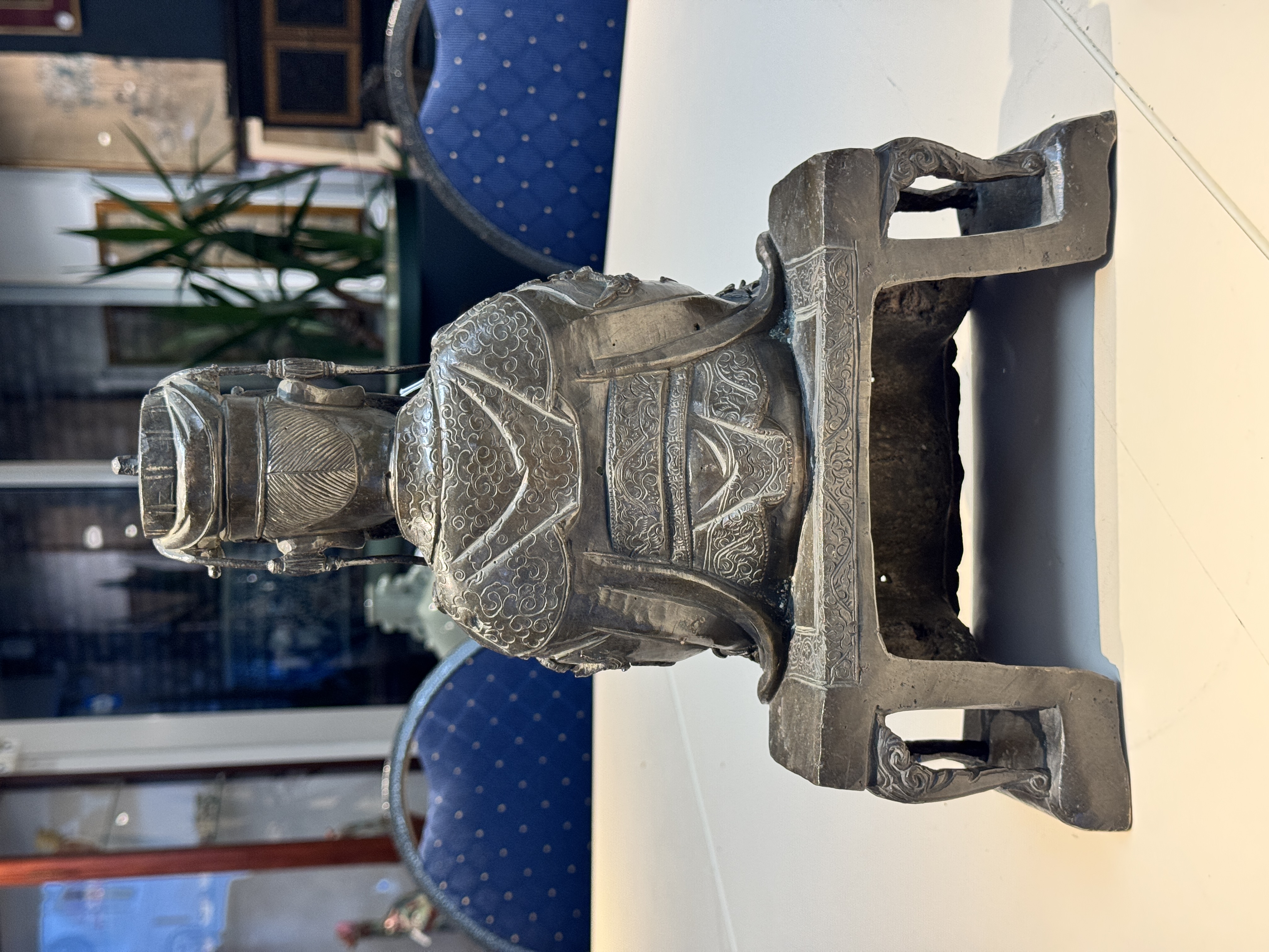 谢谢送鉴。这尊青铜文曲星造像为明晚期至清早期的风格样式,保存状况很好,皮壳十分干净,衣饰工艺细节非常丰富细腻,尤其三弯腿坐具样式非常独特,整体的铸造与錾刻工艺很不错,题材也比较少见,具有很好的收藏价值。看图估计市场价格为15万-20万人民币之间。