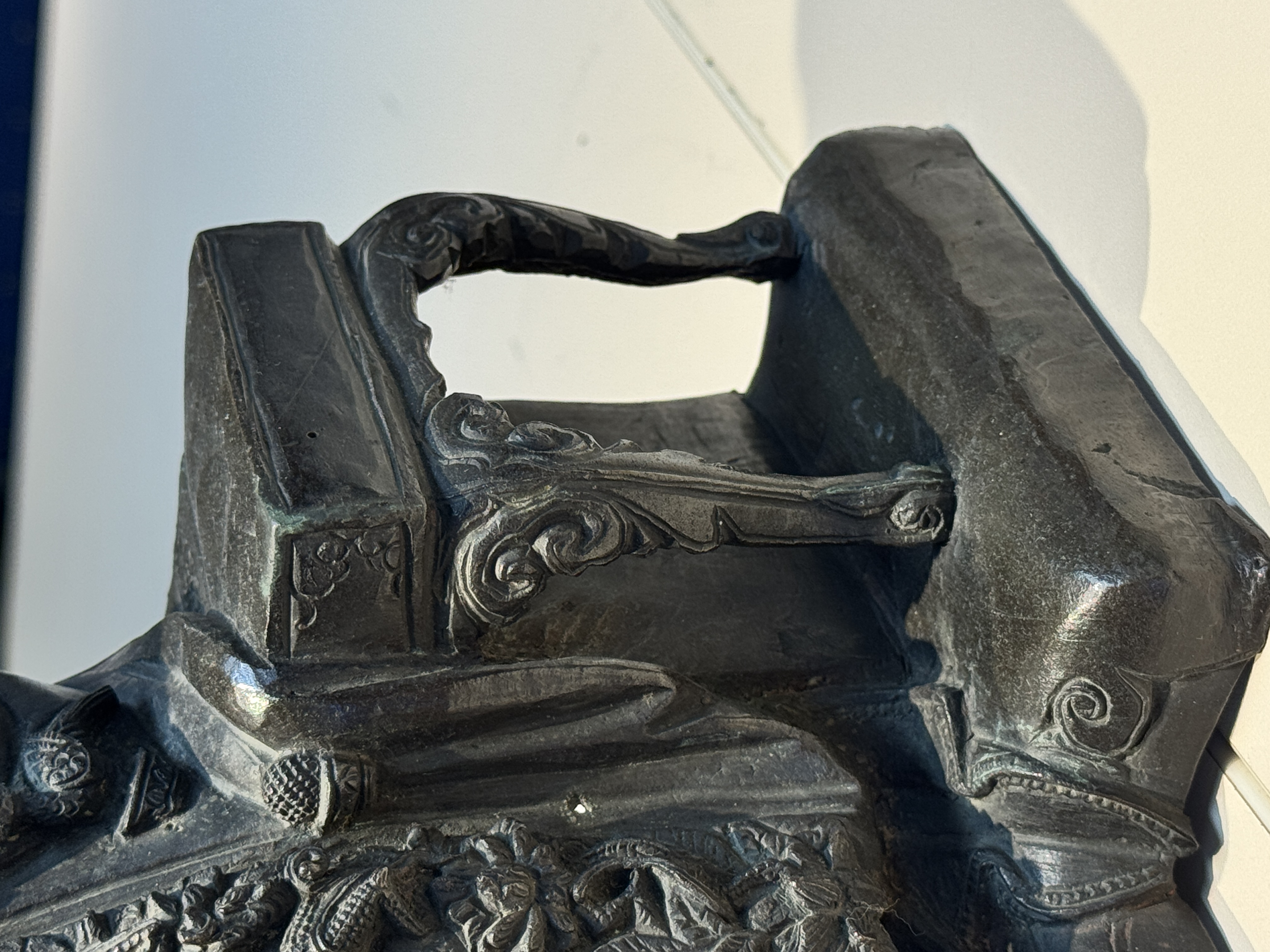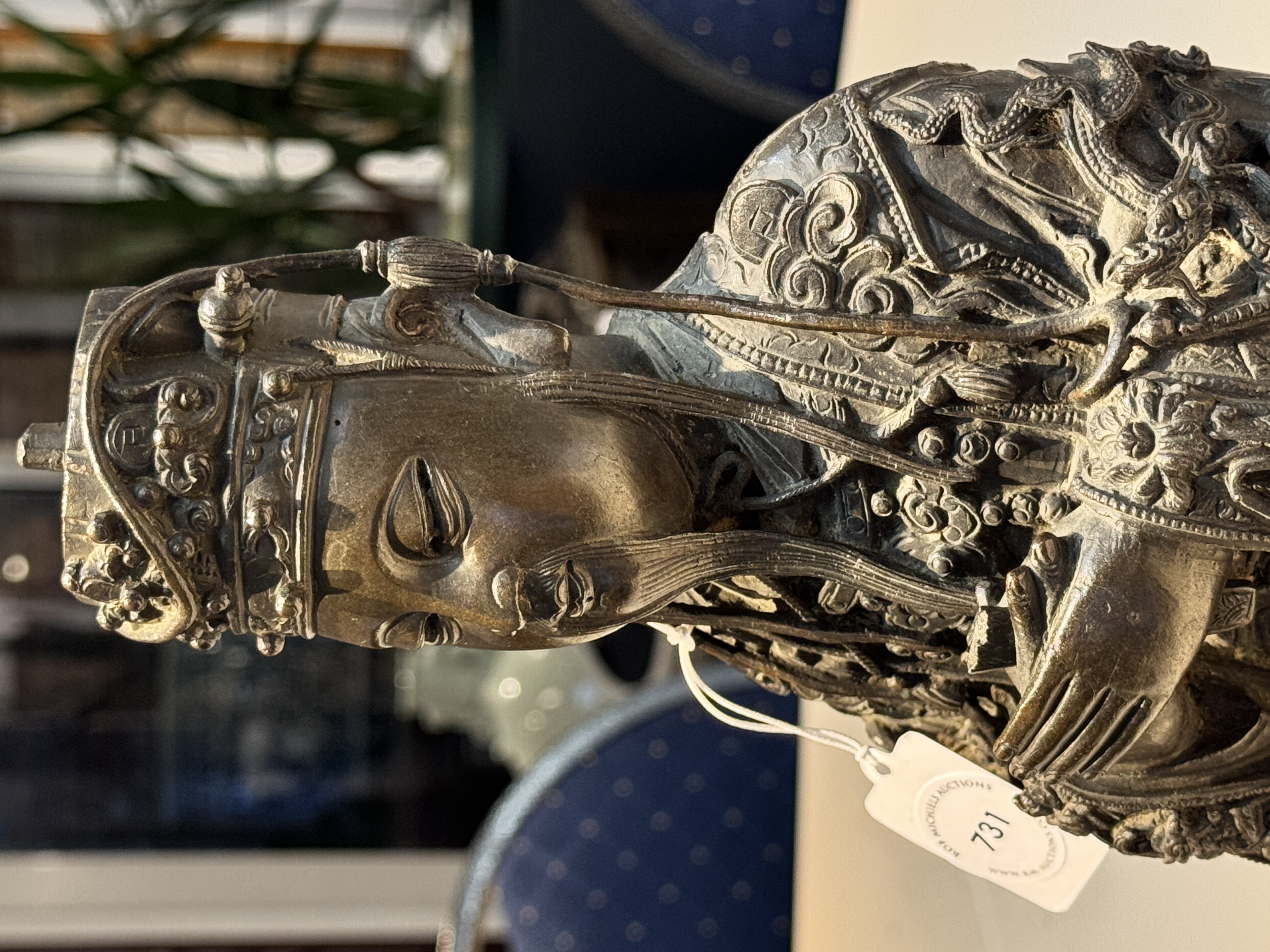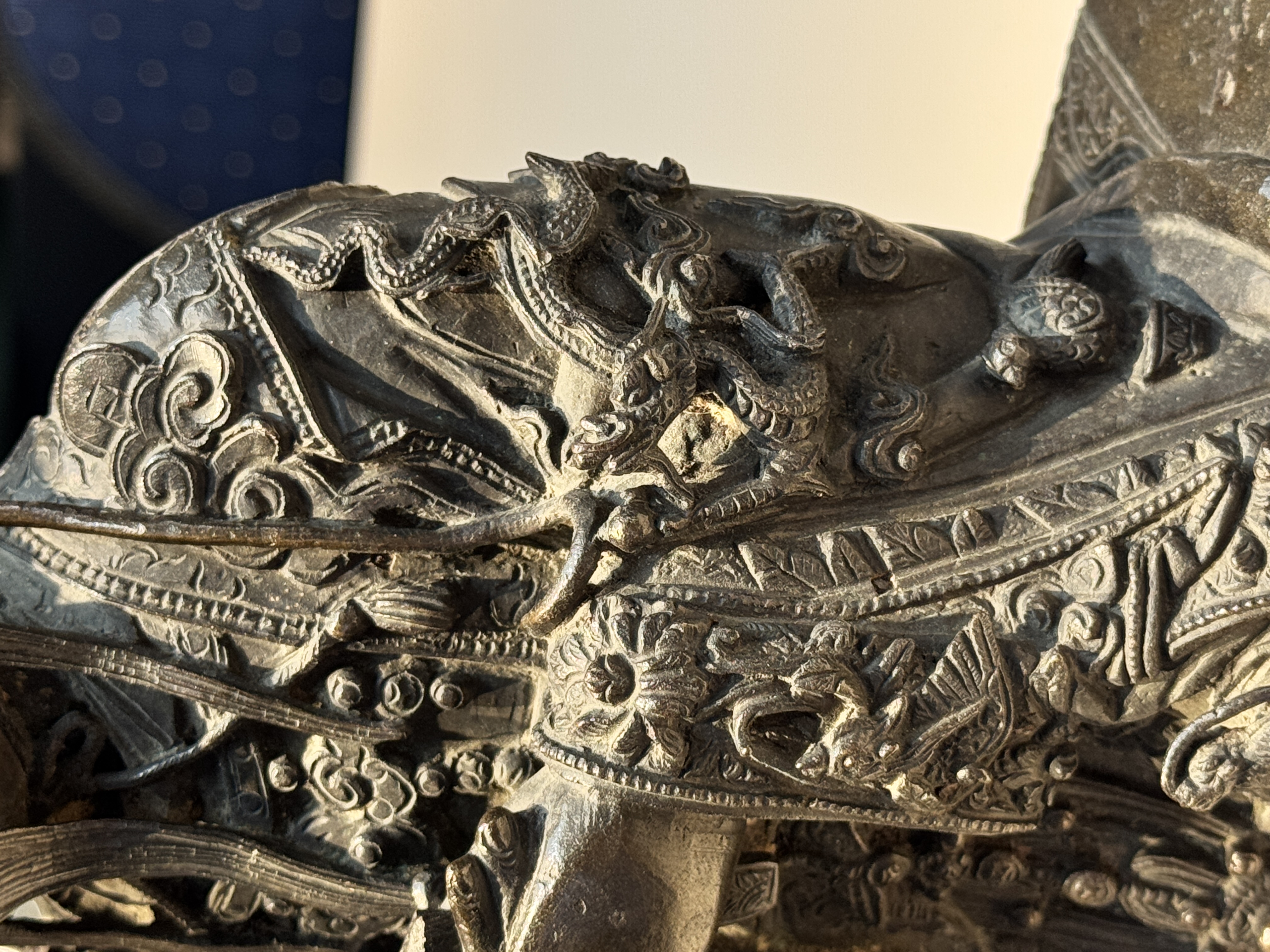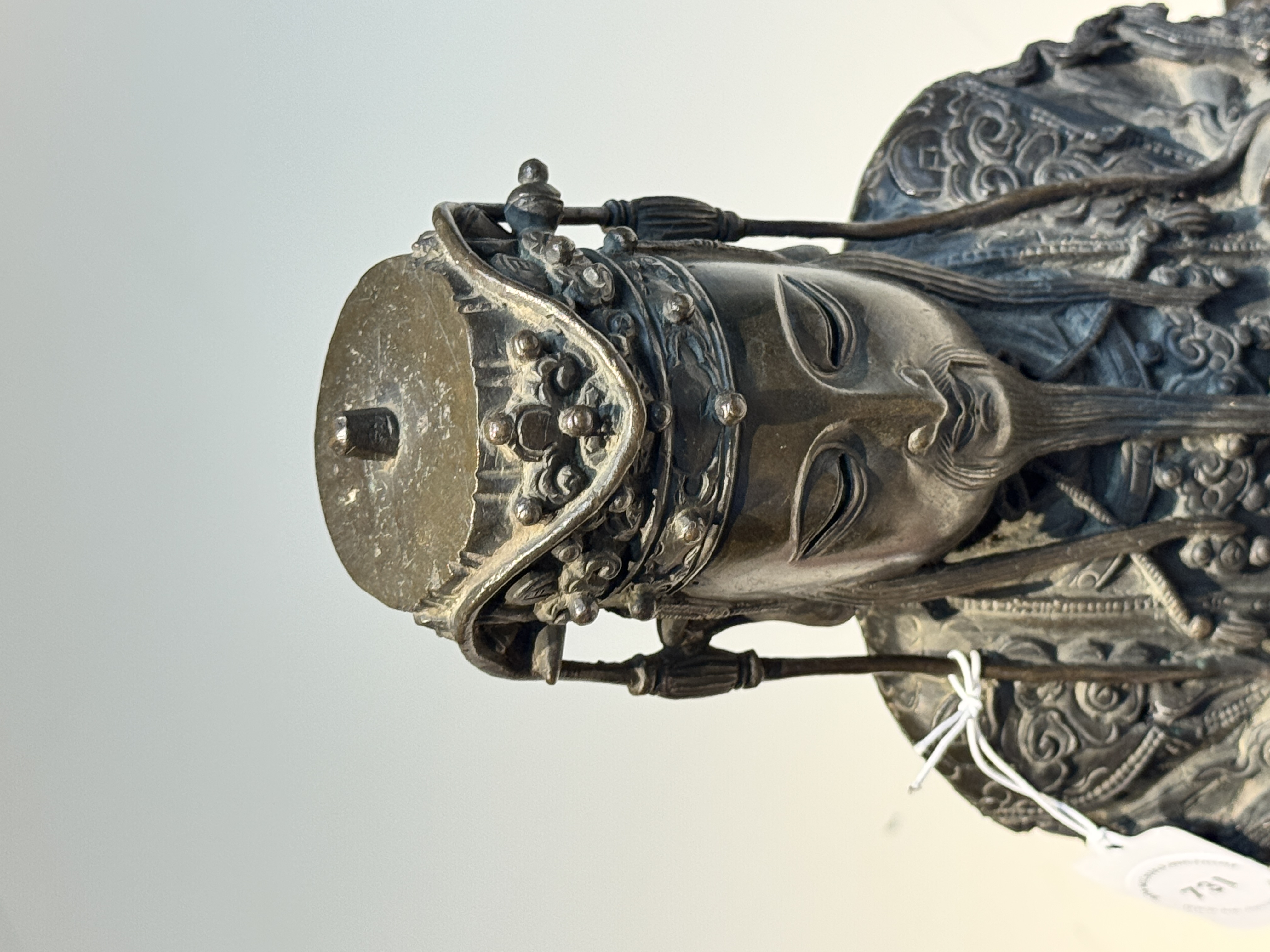 谢谢送鉴。这尊青铜文曲星造像为明晚期至清早期的风格样式,保存状况很好,皮壳十分干净,衣饰工艺细节非常丰富细腻,尤其三弯腿坐具样式非常独特,整体的铸造与錾刻工艺很不错,题材也比较少见,具有很好的收藏价值。看图估计市场价格为15万-20万人民币之间。