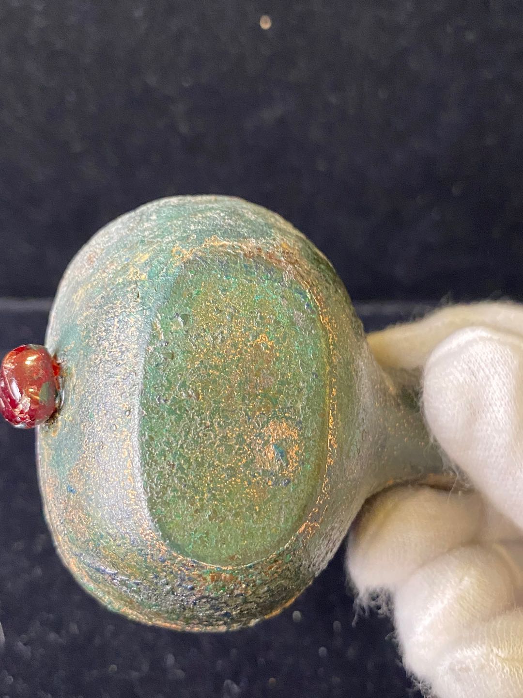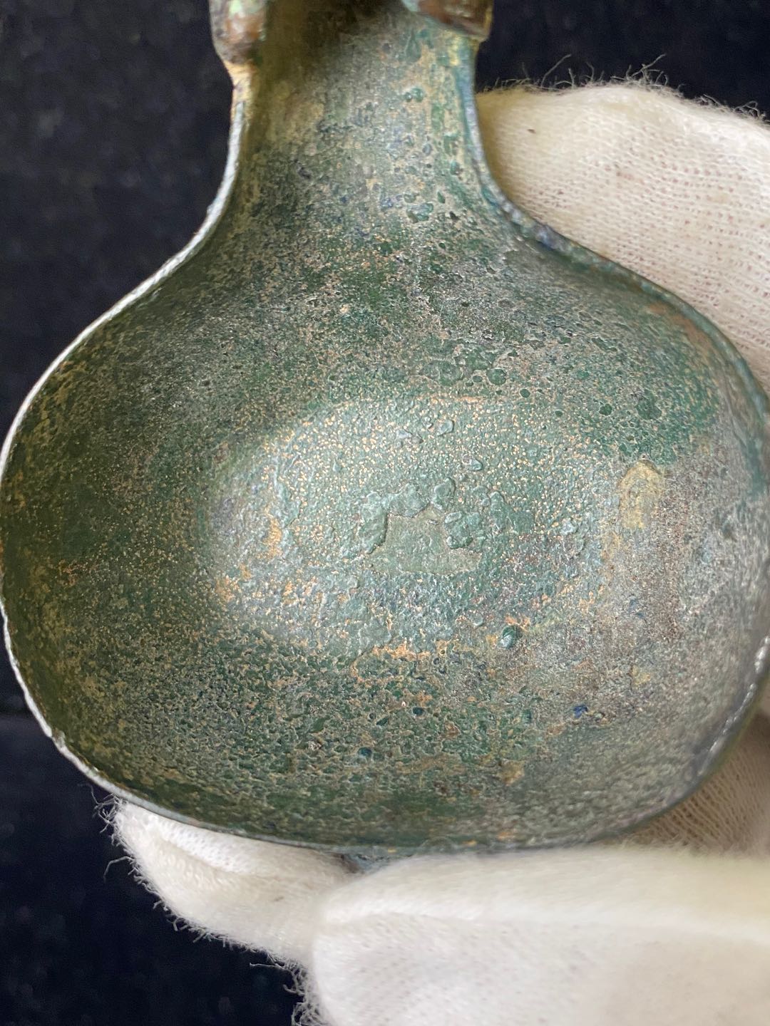 此器应该是一件改制的熏炉,底部是一件战国青铜匜(盛水器)锈色自然,后期人们配装了镂空的木质上盖,缀以黄玉兽钮,整器古为今用,雅趣横生、综合分析判断此器物真品无疑,因照片鉴定仅供参考!