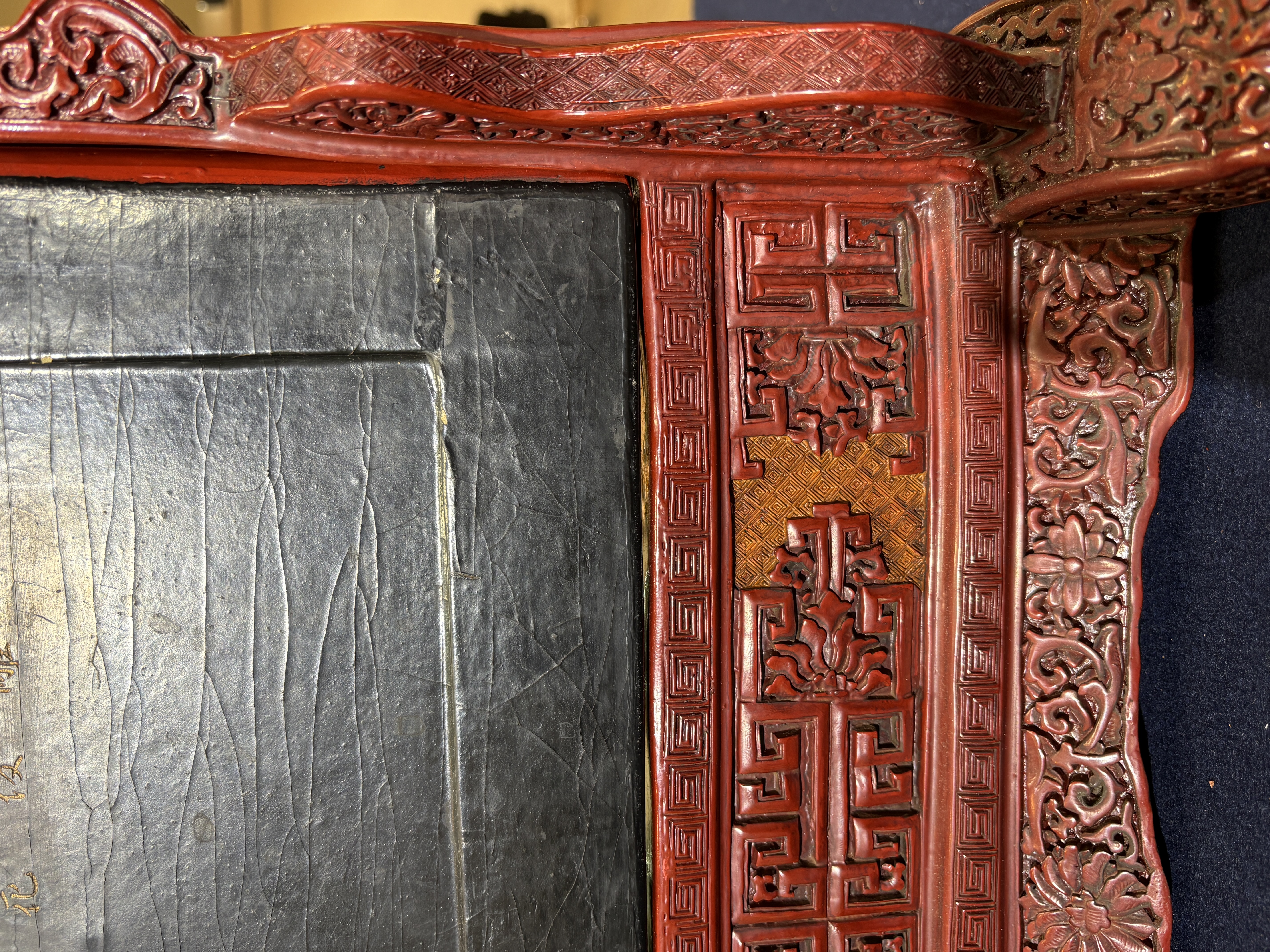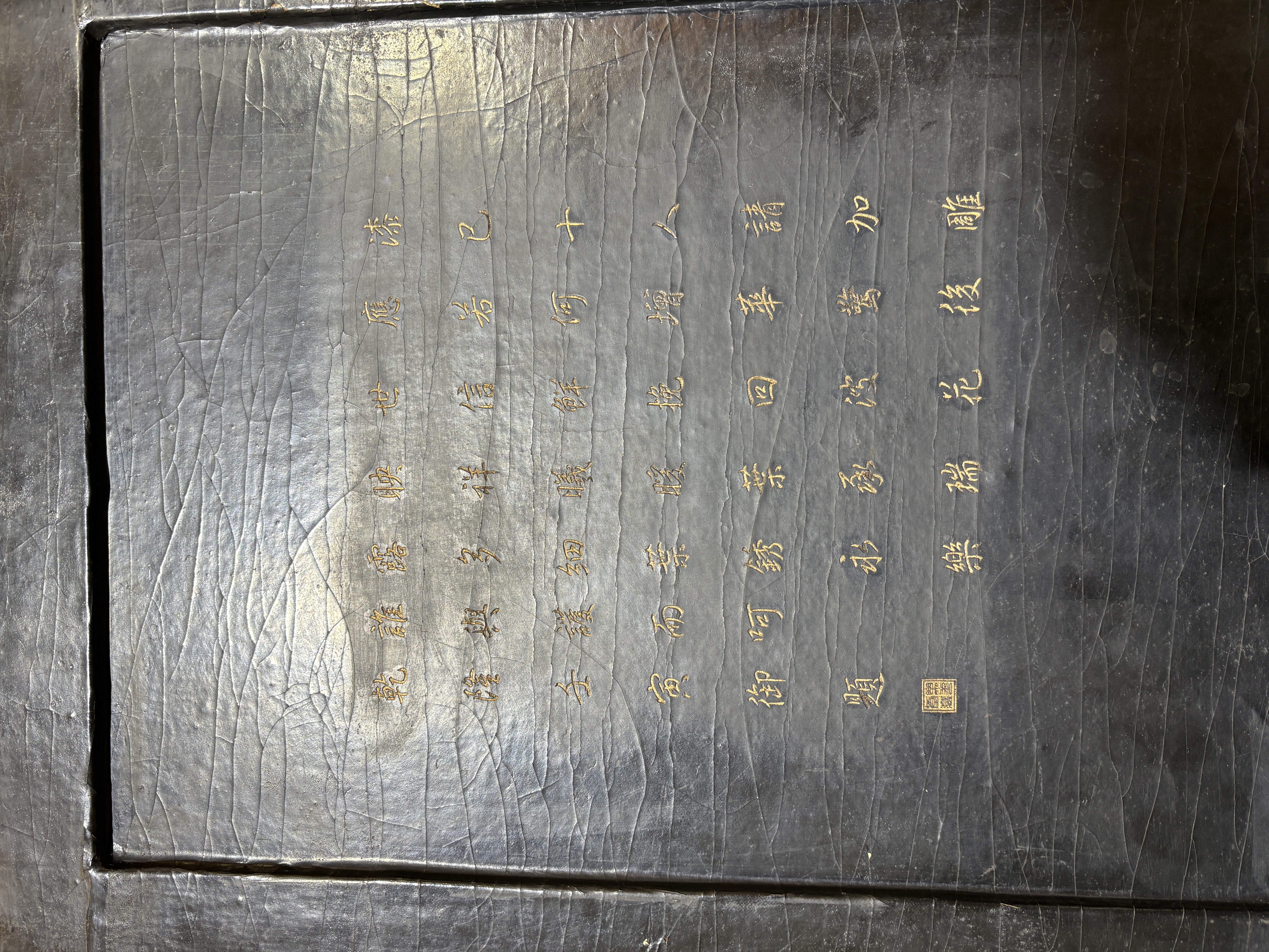 背后字填化学漆,正面山水楼亭上面山还有铸造时留下的沙痕。近现代工艺品。