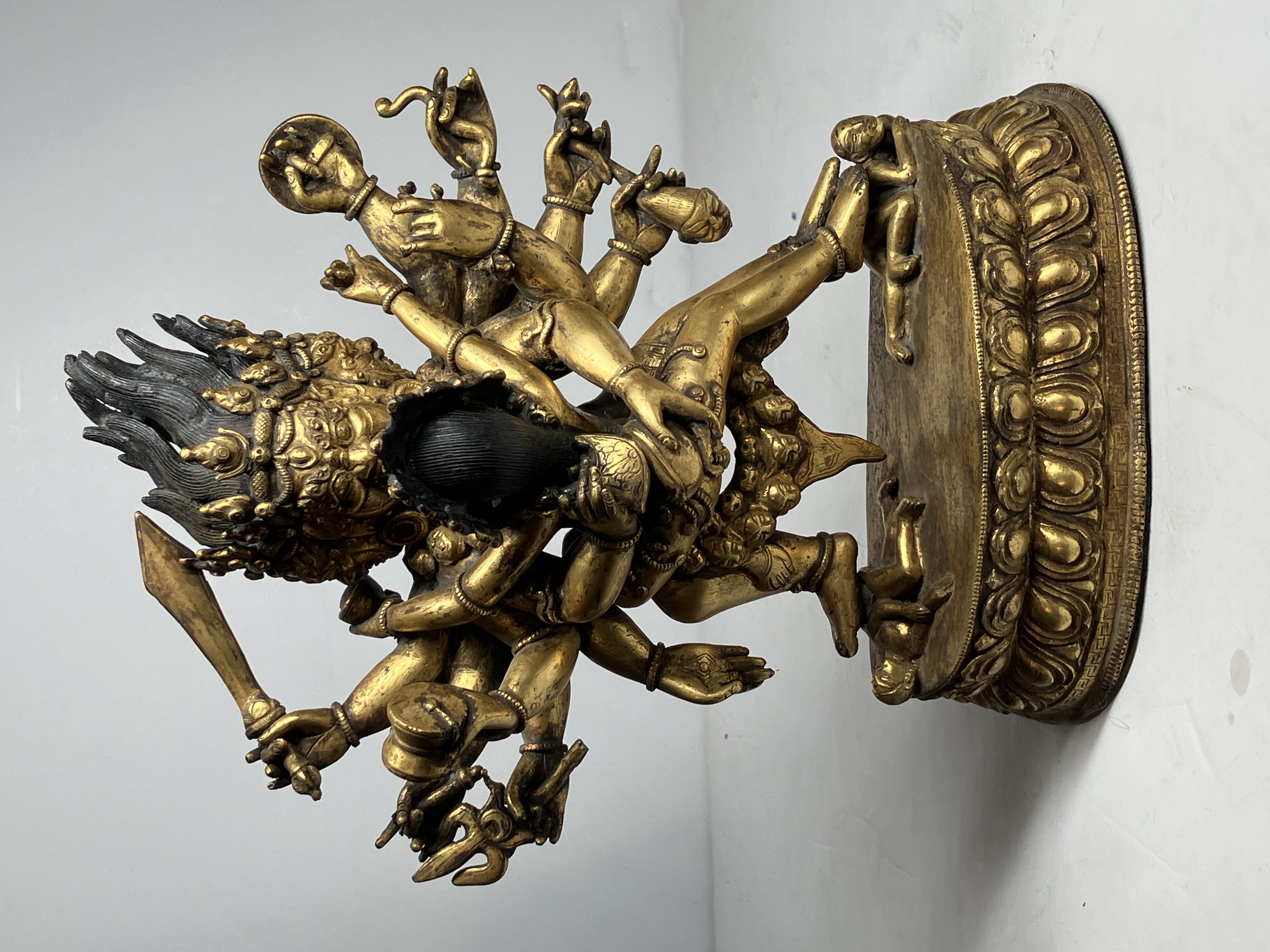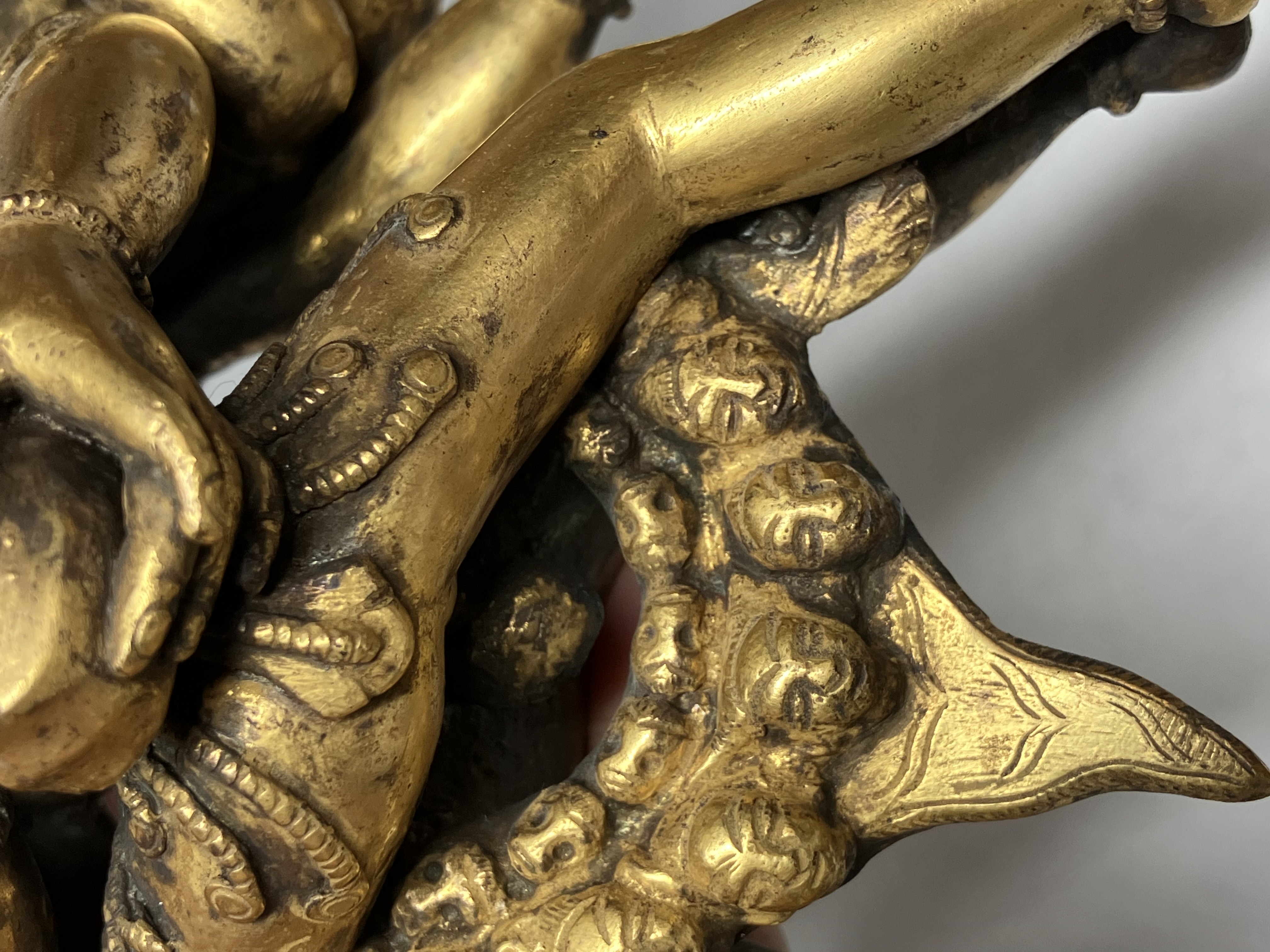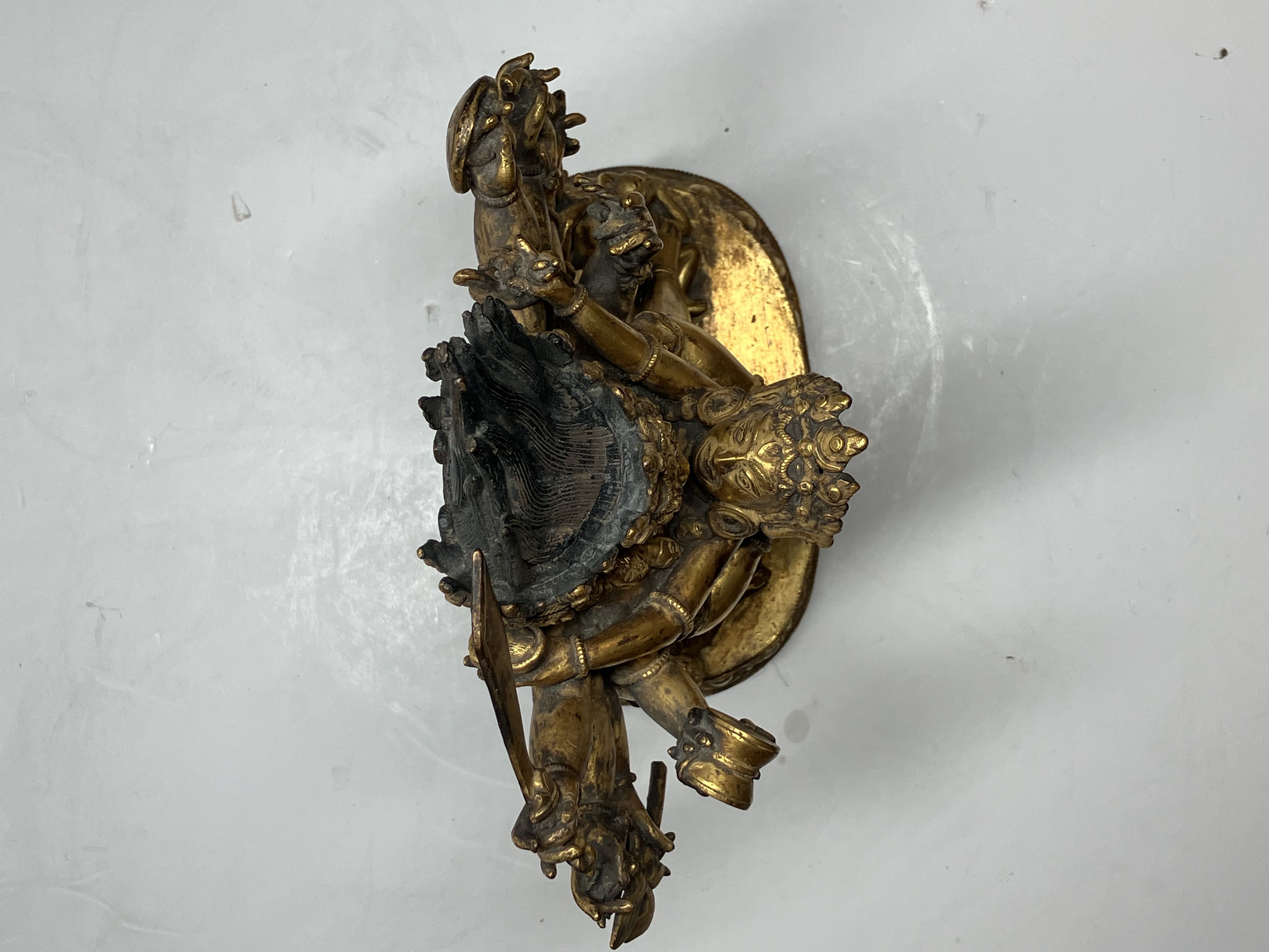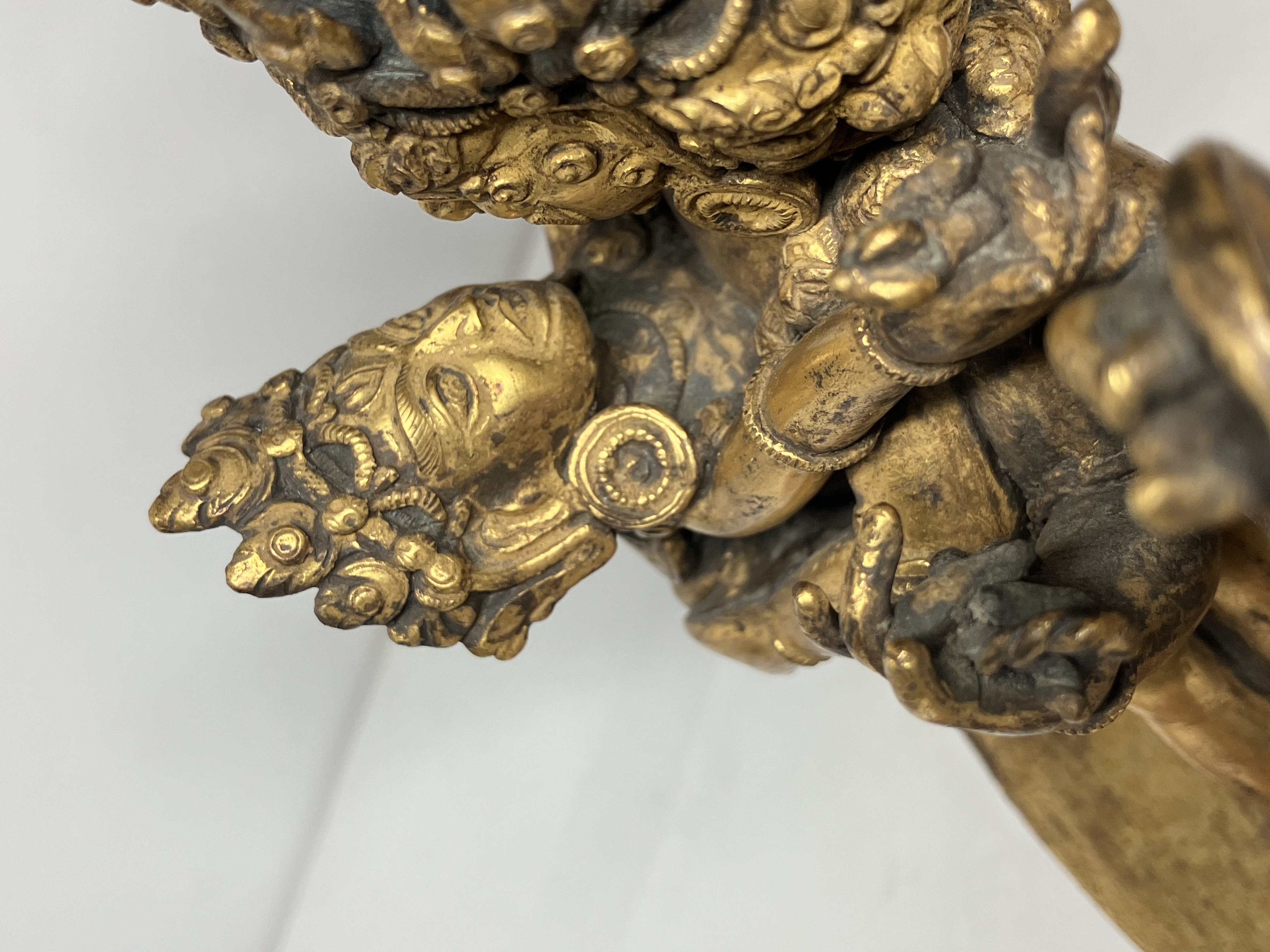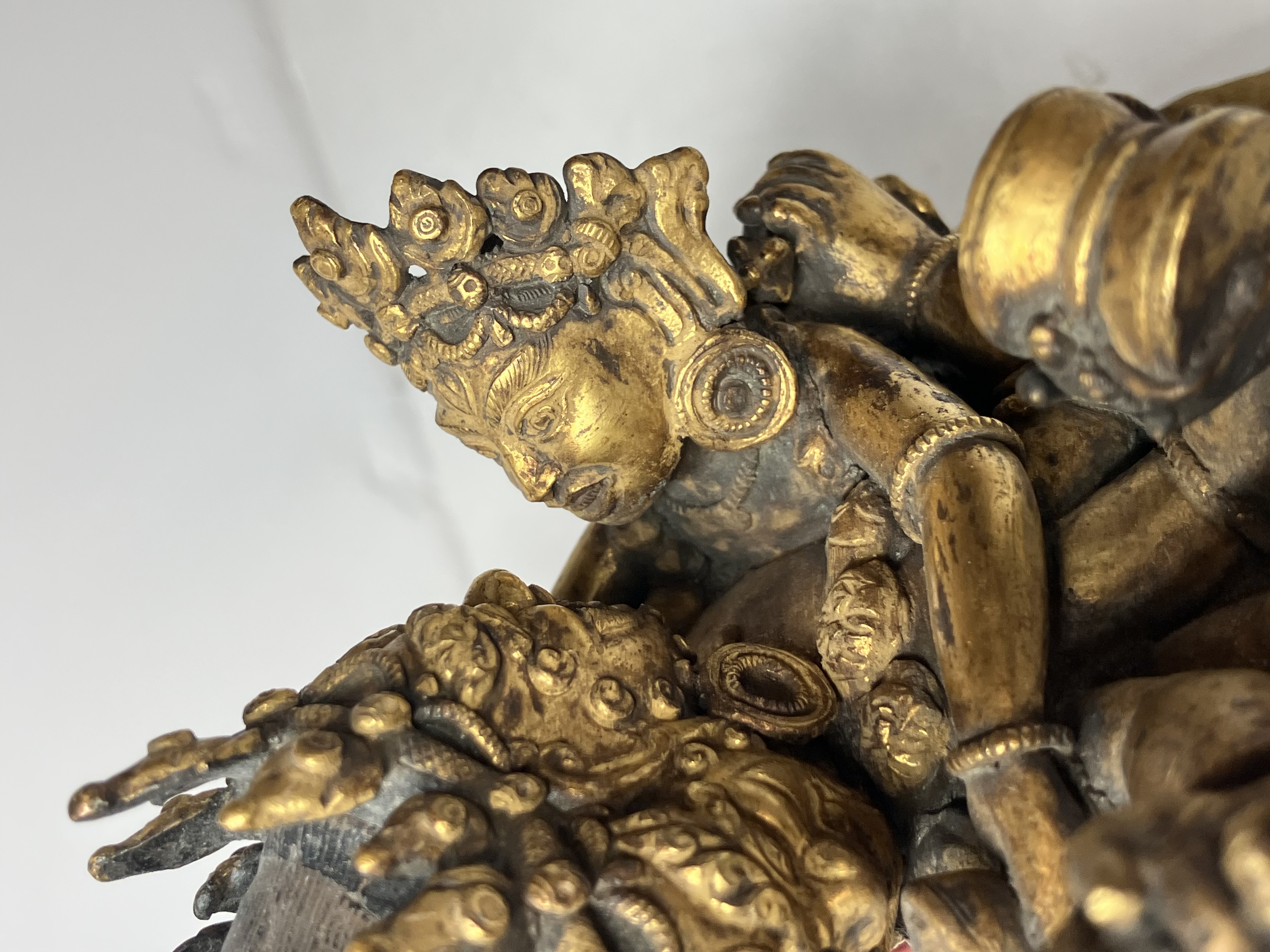 胜乐金刚佛造像。这尊佛造像整体铸造工艺精湛。整体鎏金完整,璎珞服饰及雕刻工艺精美。胜乐金刚是藏传佛教无上瑜伽本尊,被视为三世诸佛,也是藏密五大本尊之一。在密宗修行中尊称为“母续之王”。这尊佛像属藏区工艺风格,有供养和收藏价值。