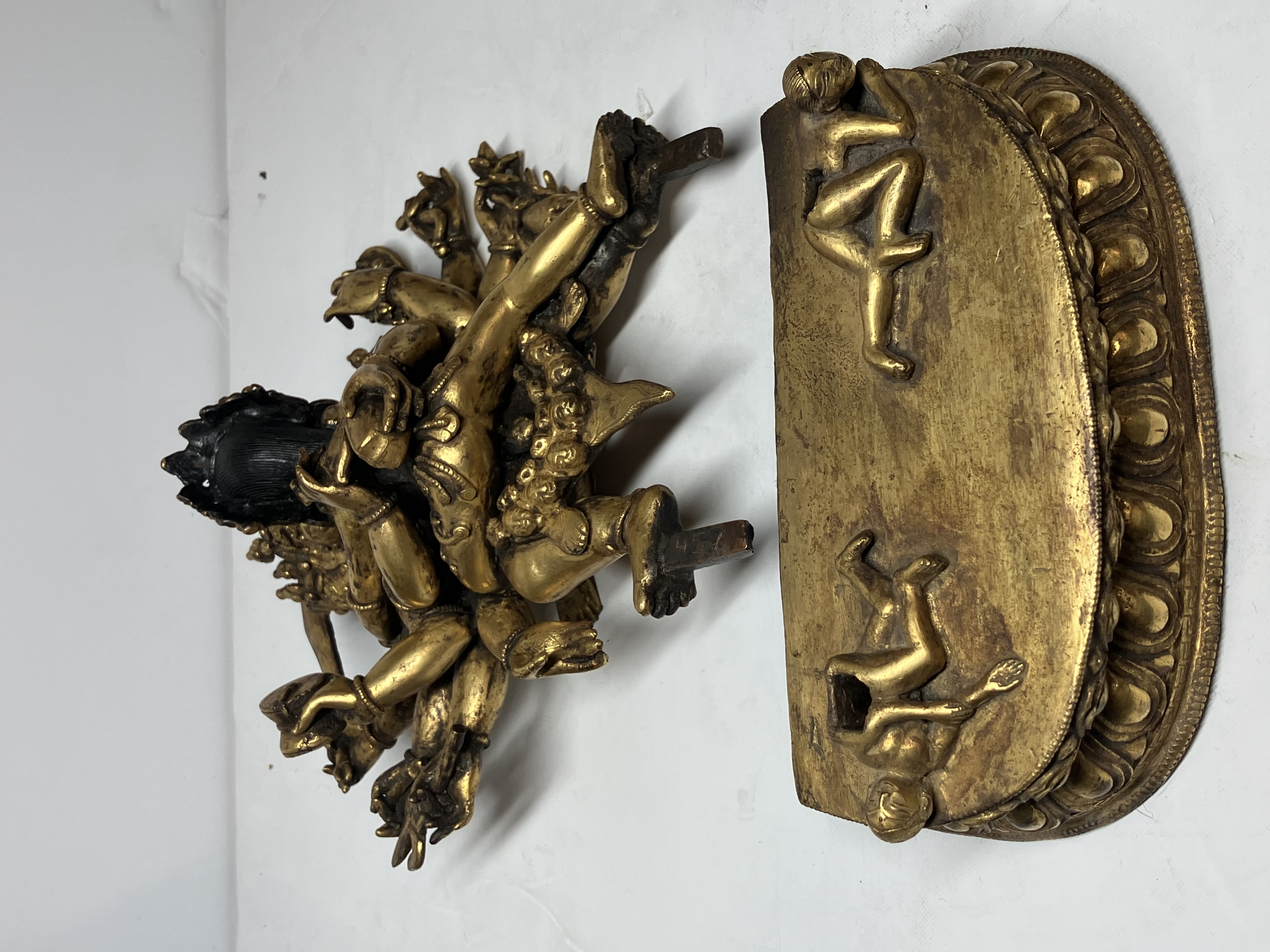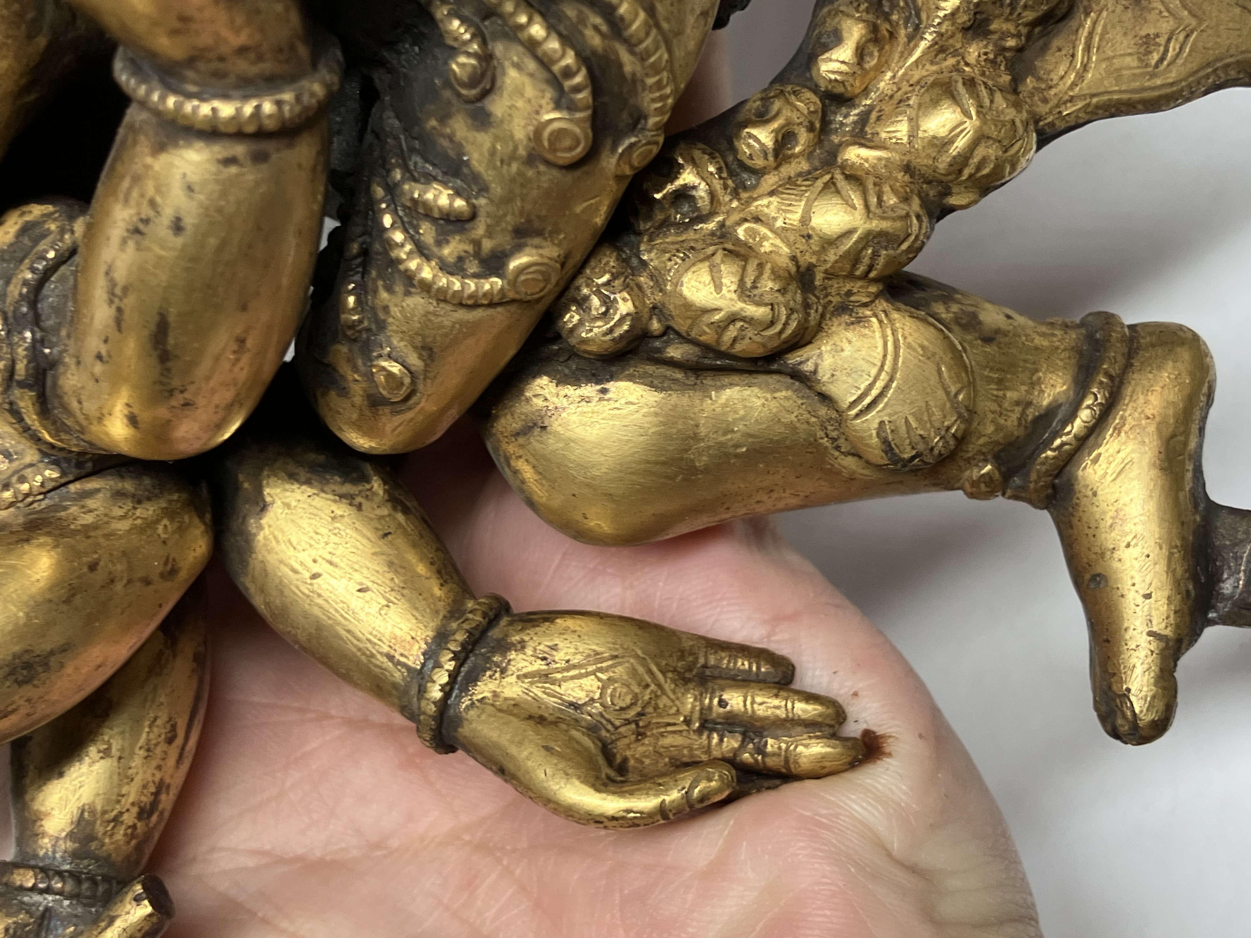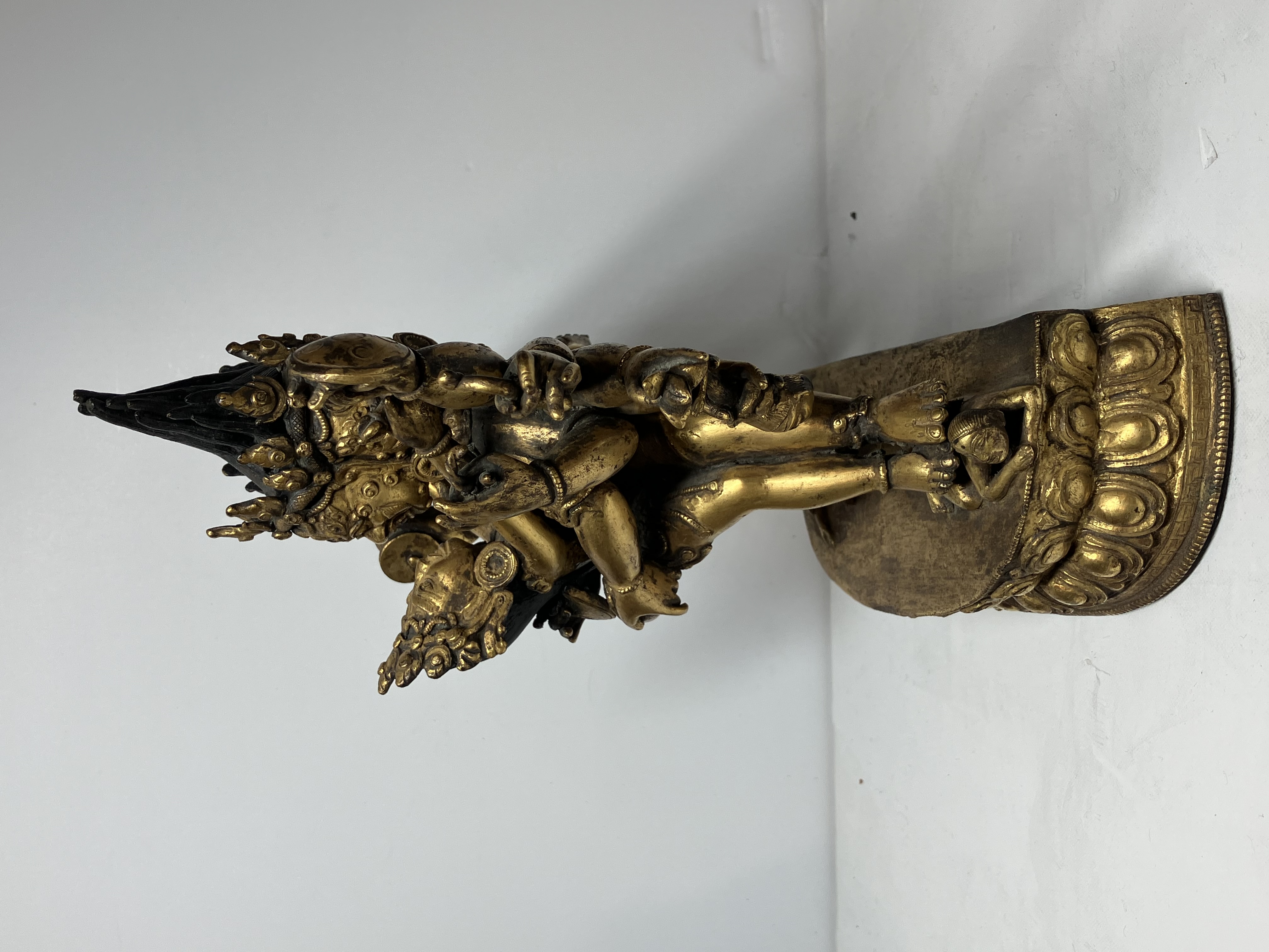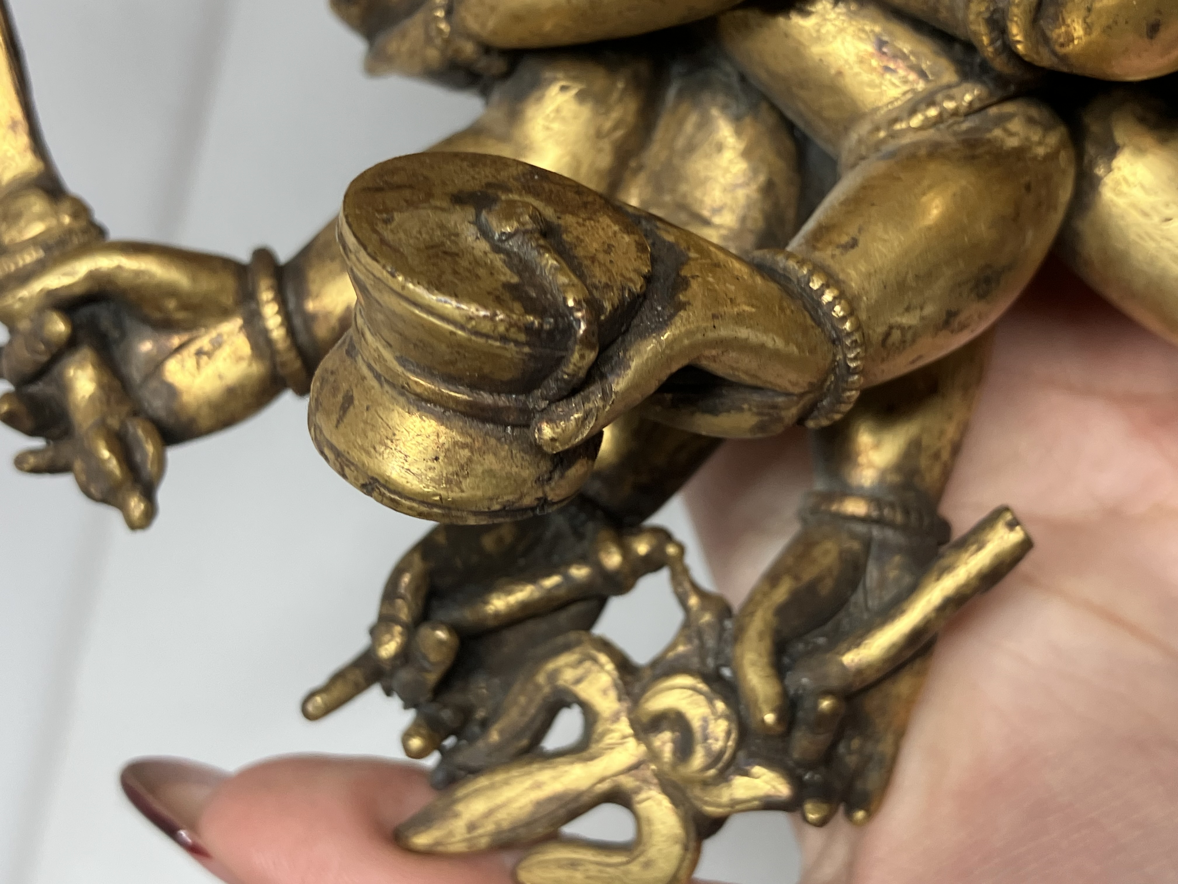 胜乐金刚佛造像。这尊佛造像整体铸造工艺精湛。整体鎏金完整,璎珞服饰及雕刻工艺精美。胜乐金刚是藏传佛教无上瑜伽本尊,被视为三世诸佛,也是藏密五大本尊之一。在密宗修行中尊称为“母续之王”。这尊佛像属藏区工艺风格,有供养和收藏价值。