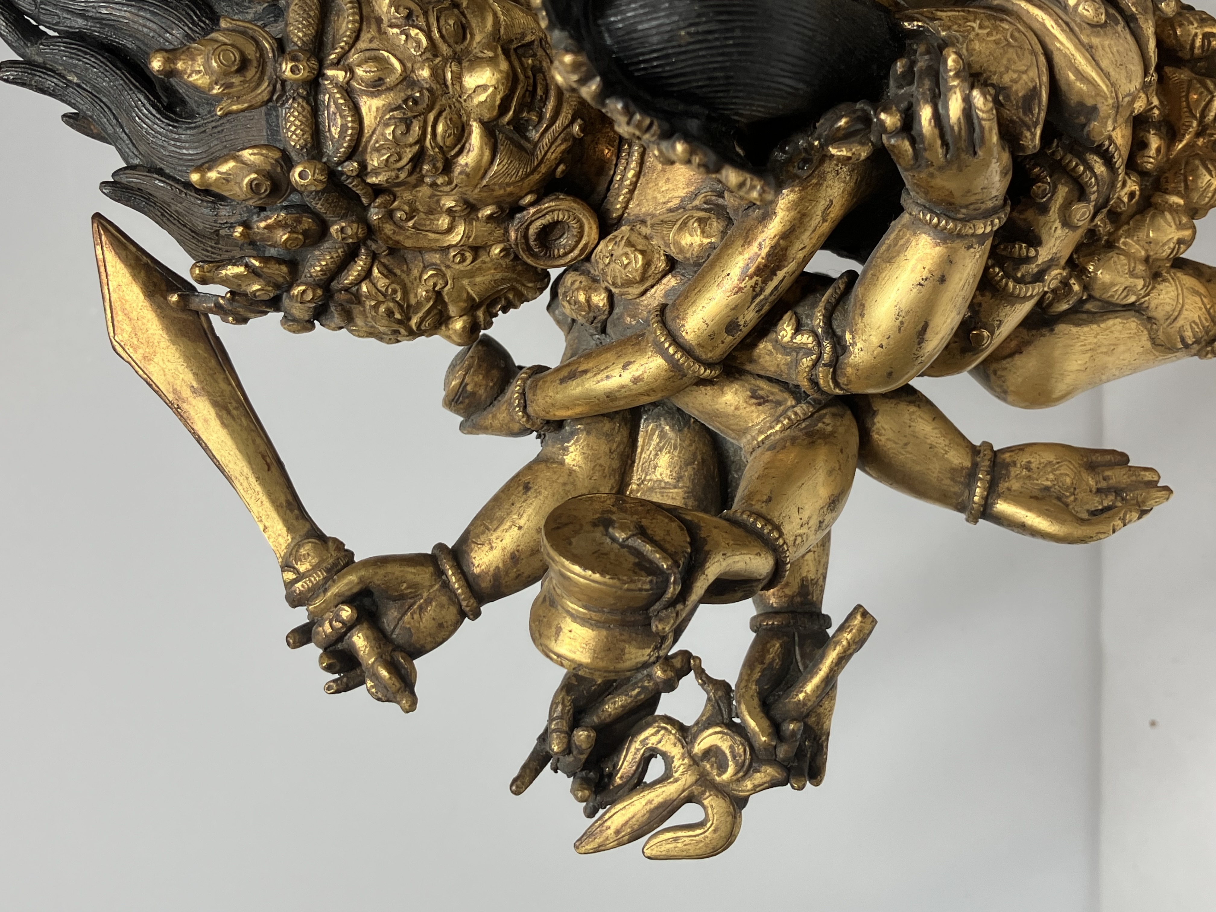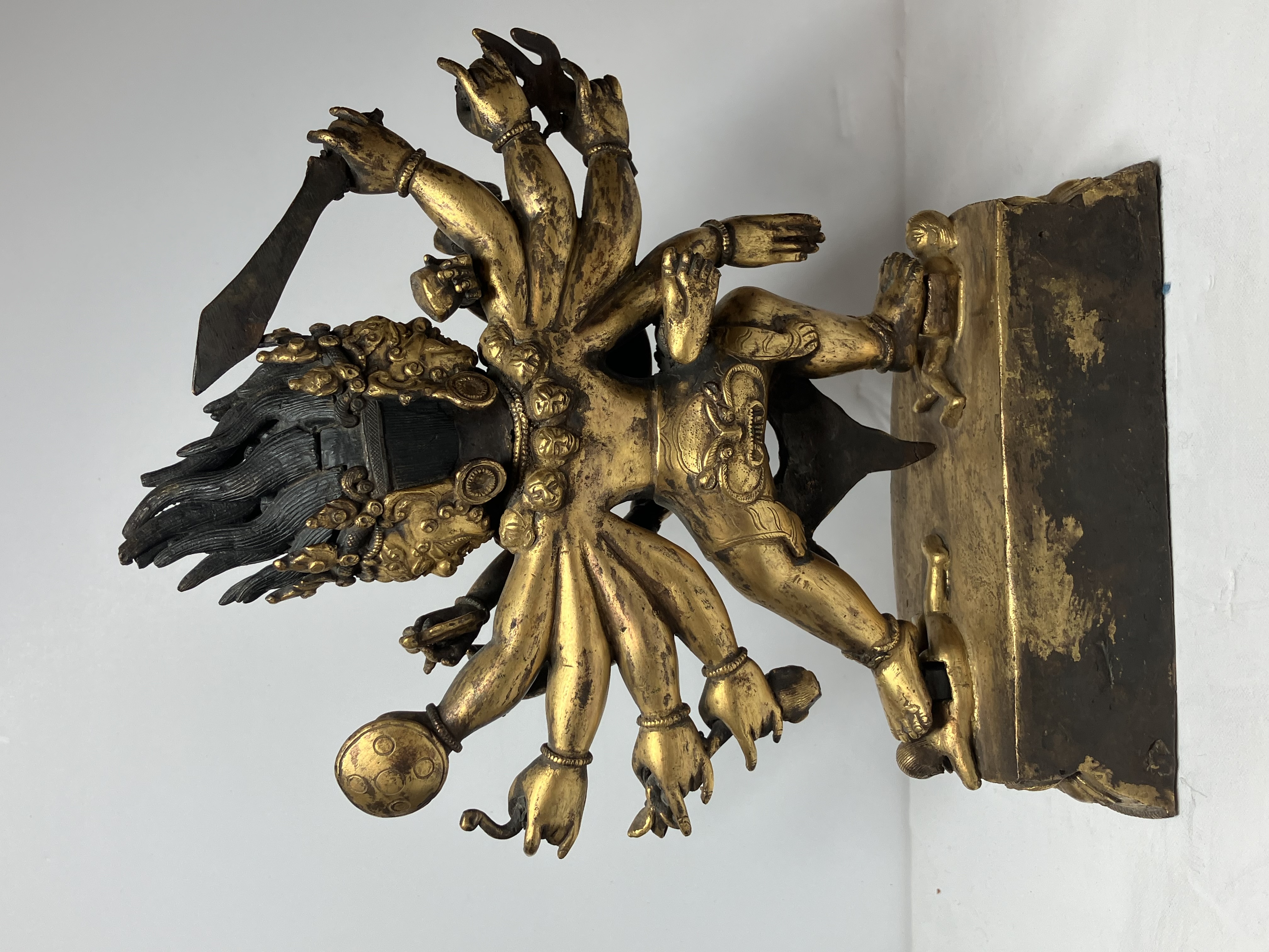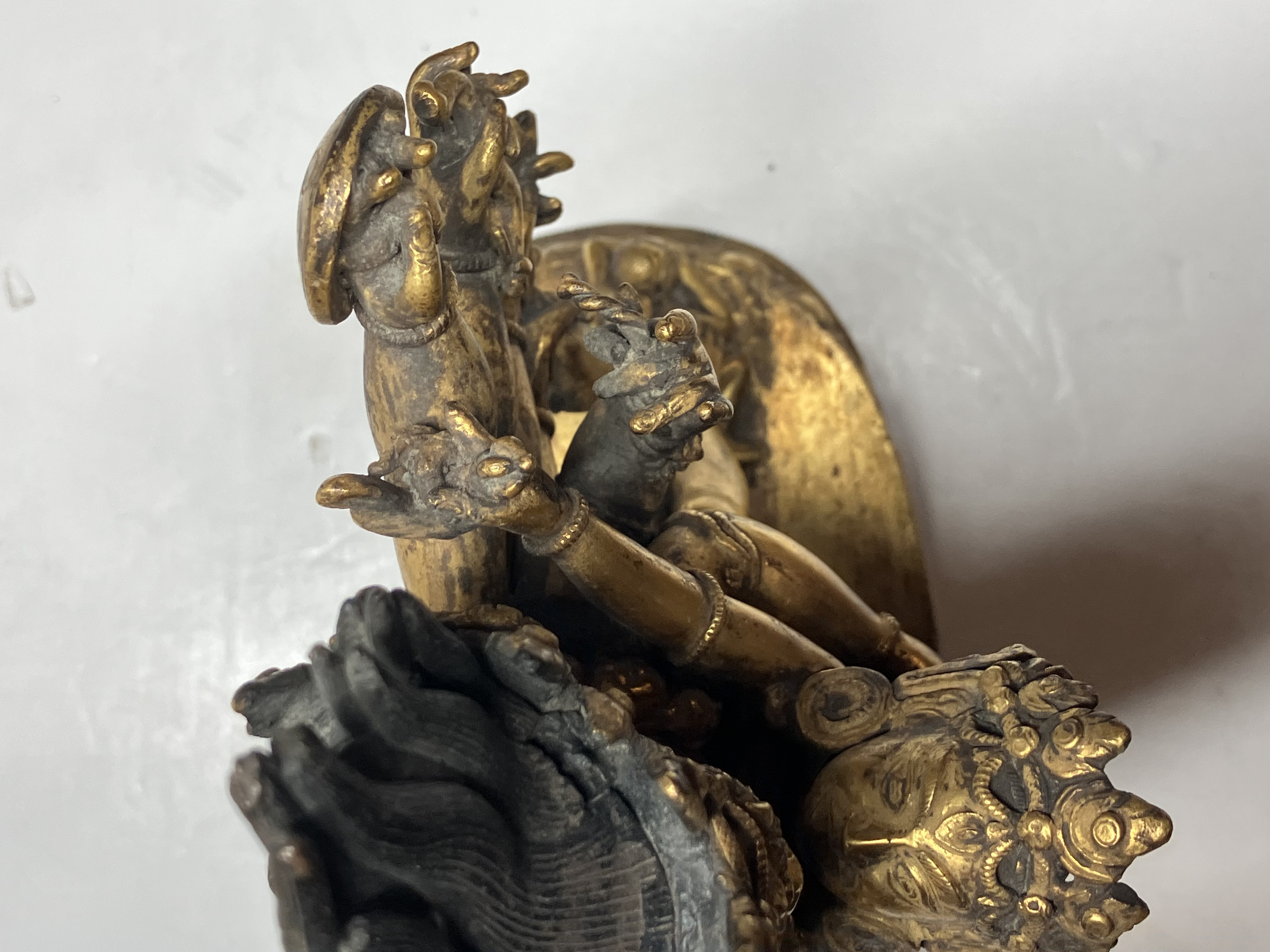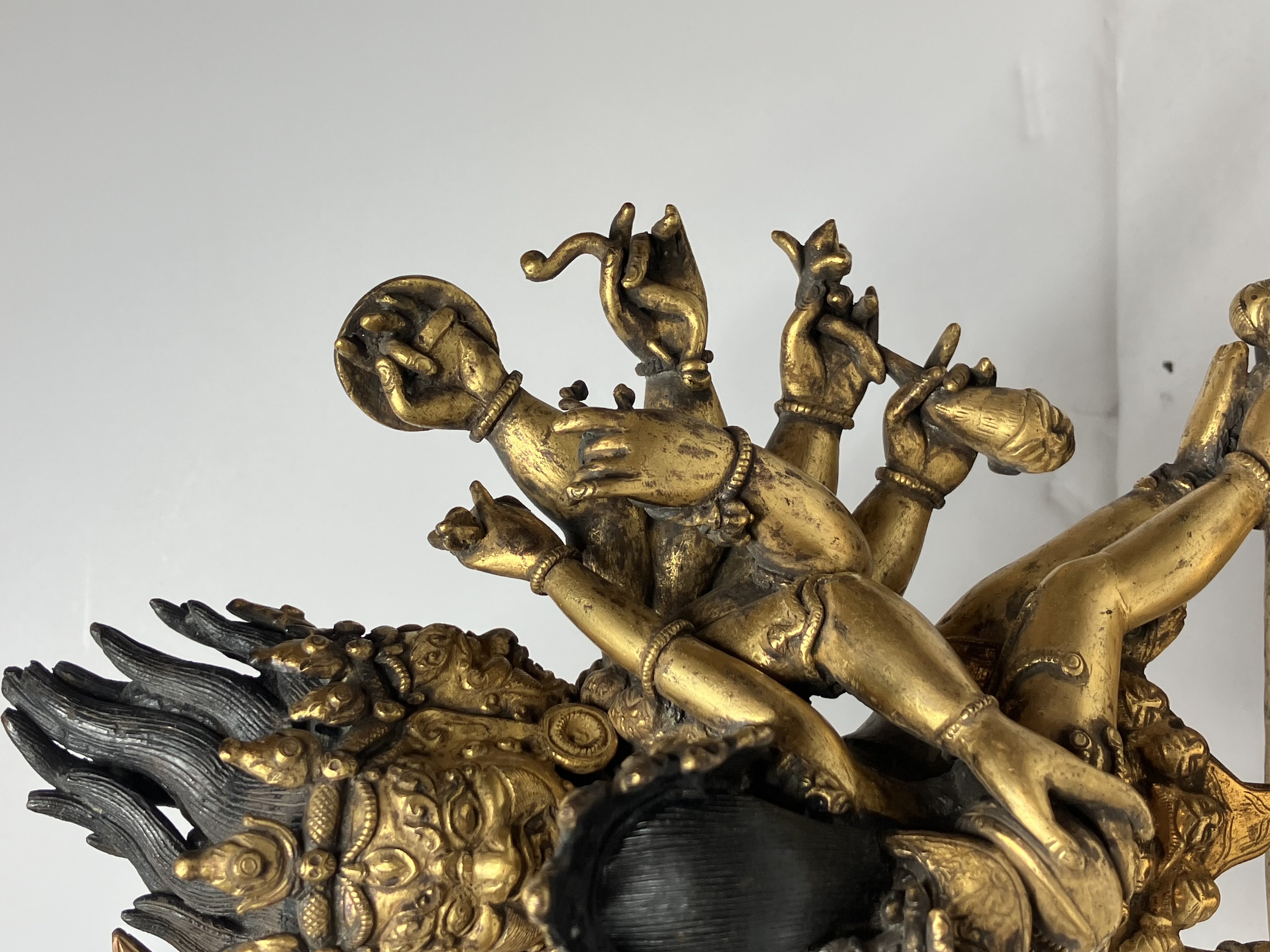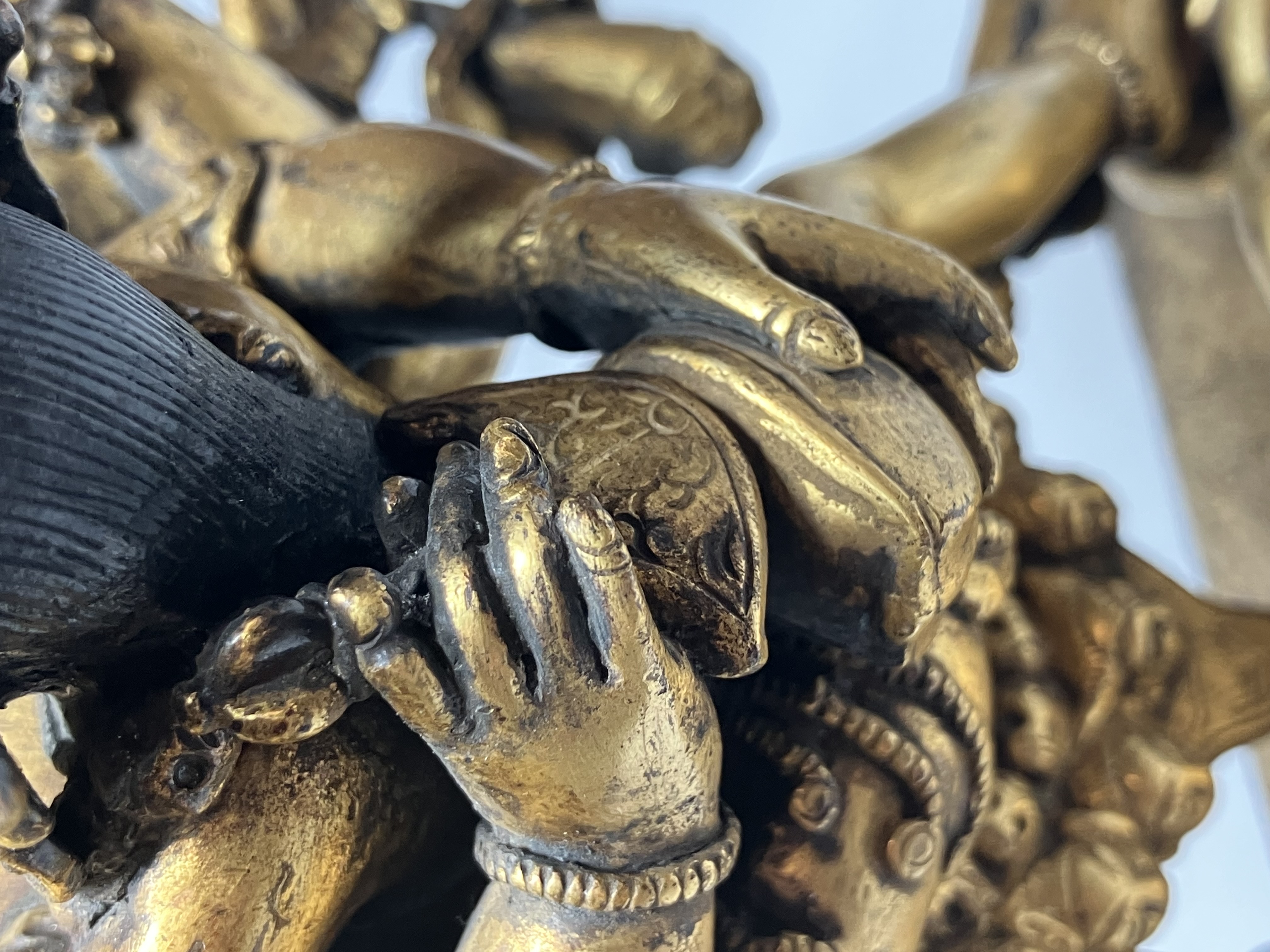 胜乐金刚佛造像。这尊佛造像整体铸造工艺精湛。整体鎏金完整,璎珞服饰及雕刻工艺精美。胜乐金刚是藏传佛教无上瑜伽本尊,被视为三世诸佛,也是藏密五大本尊之一。在密宗修行中尊称为“母续之王”。这尊佛像属藏区工艺风格,有供养和收藏价值。