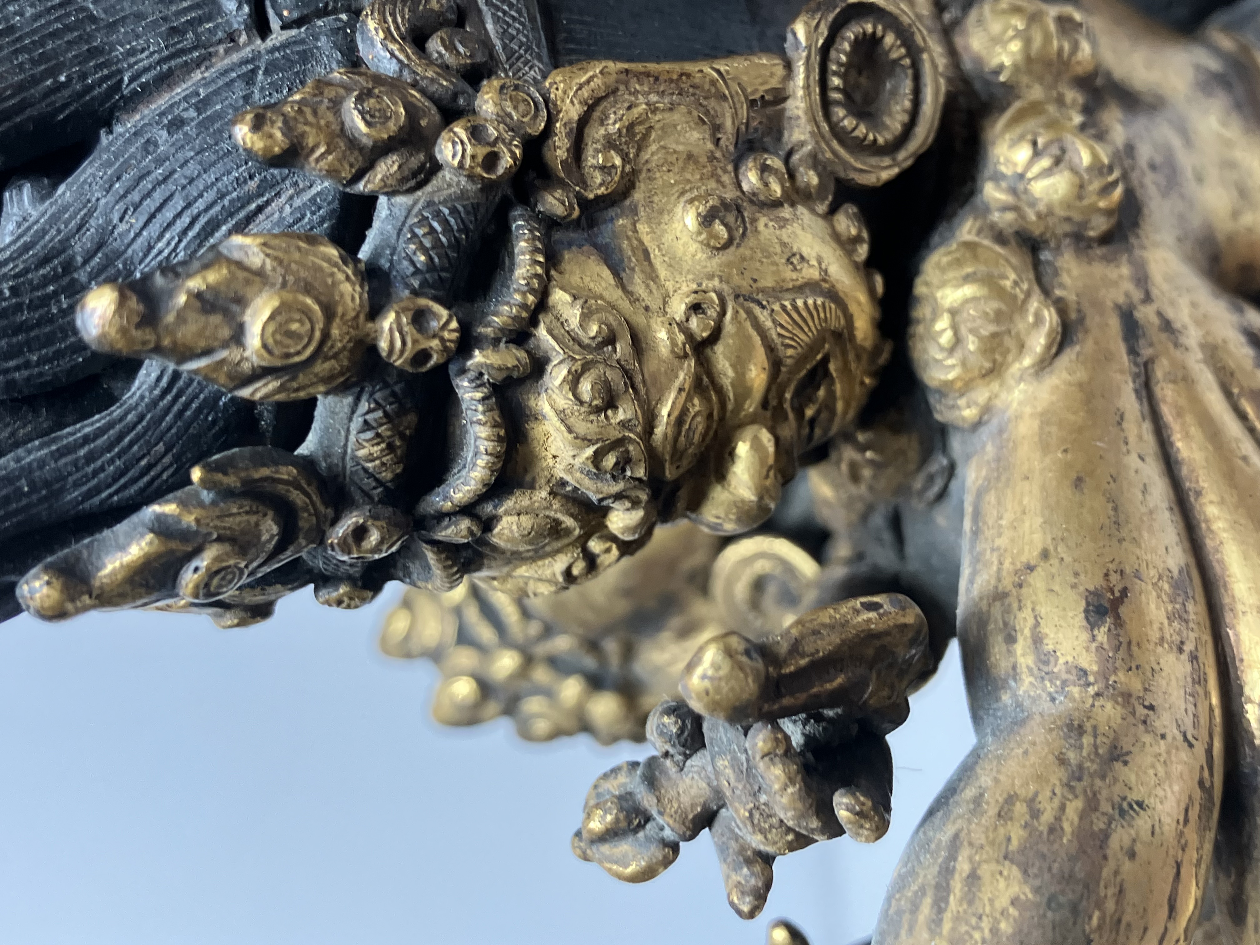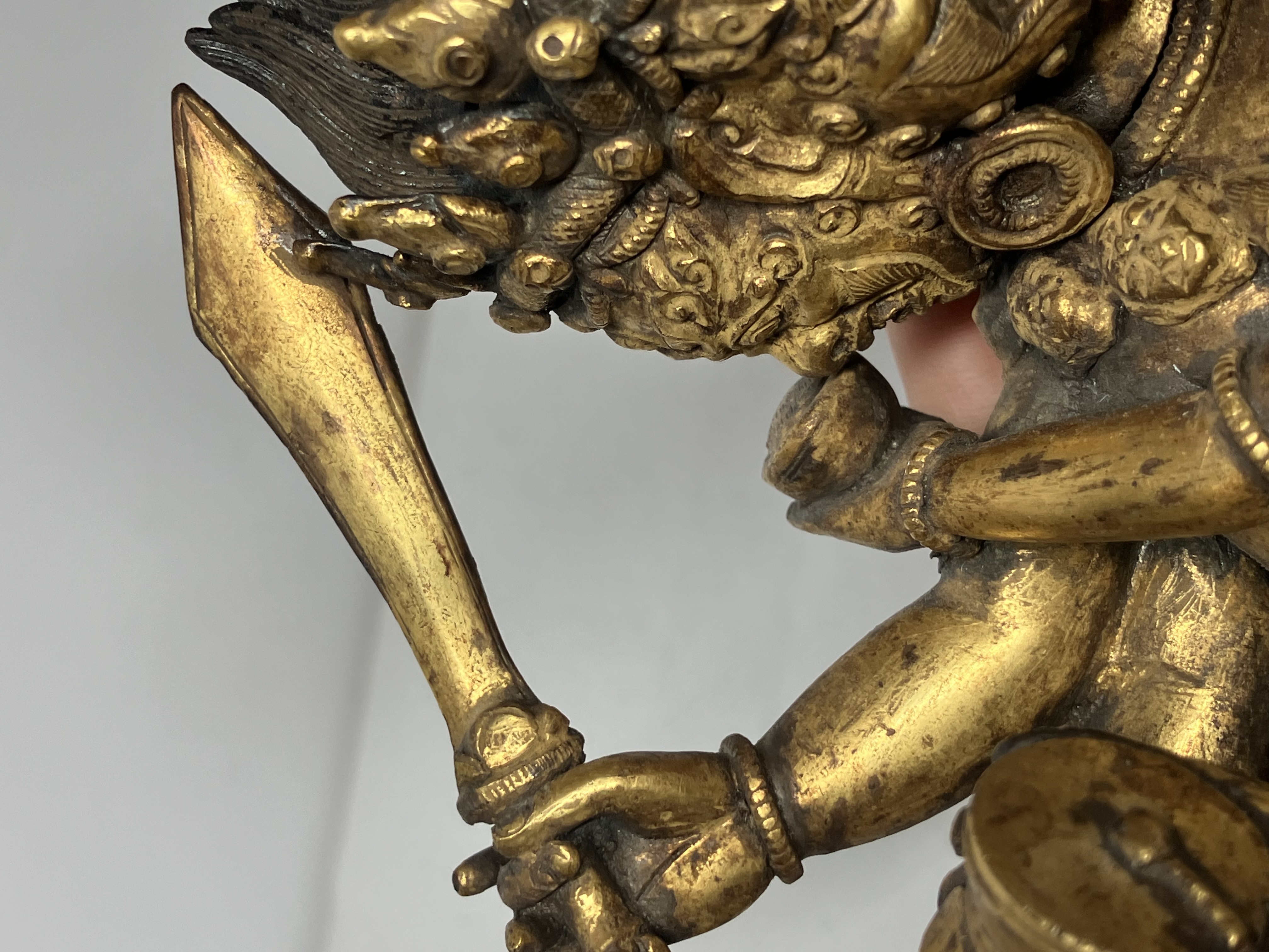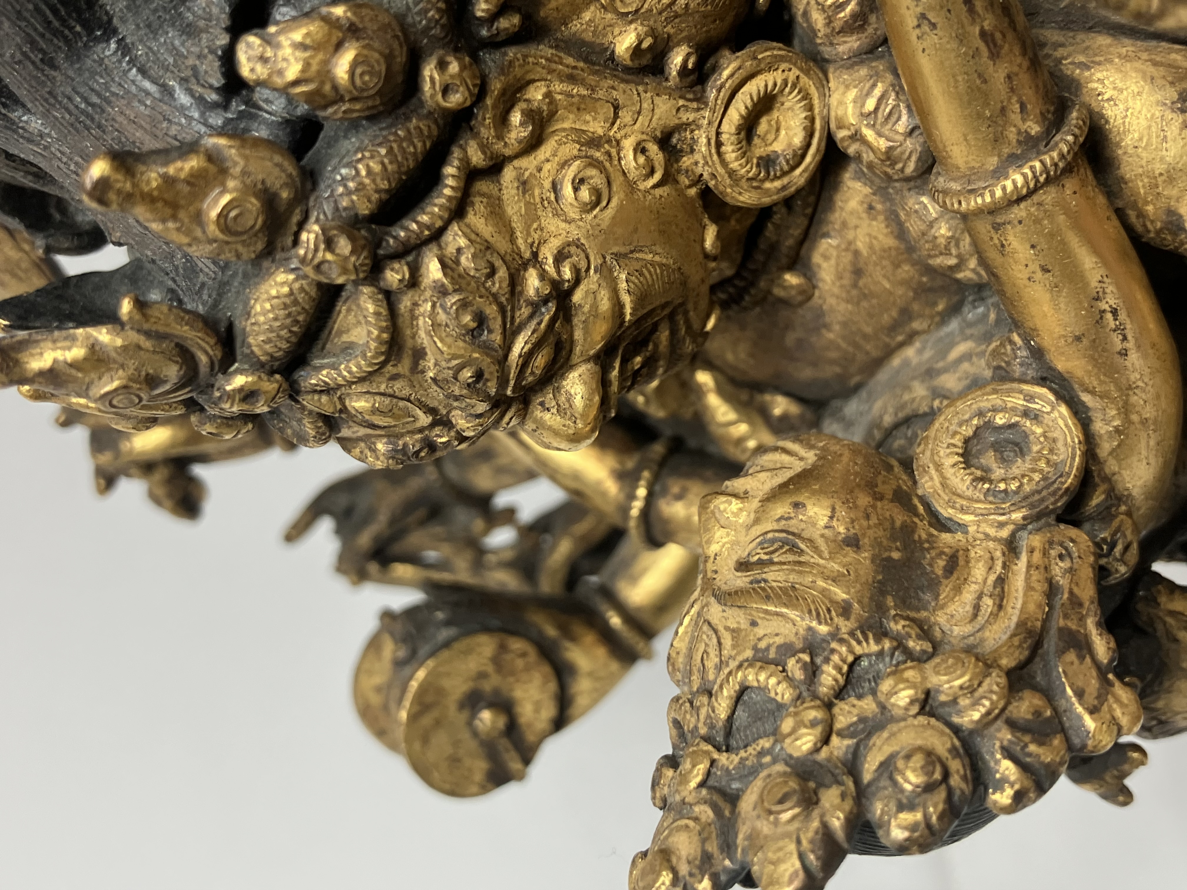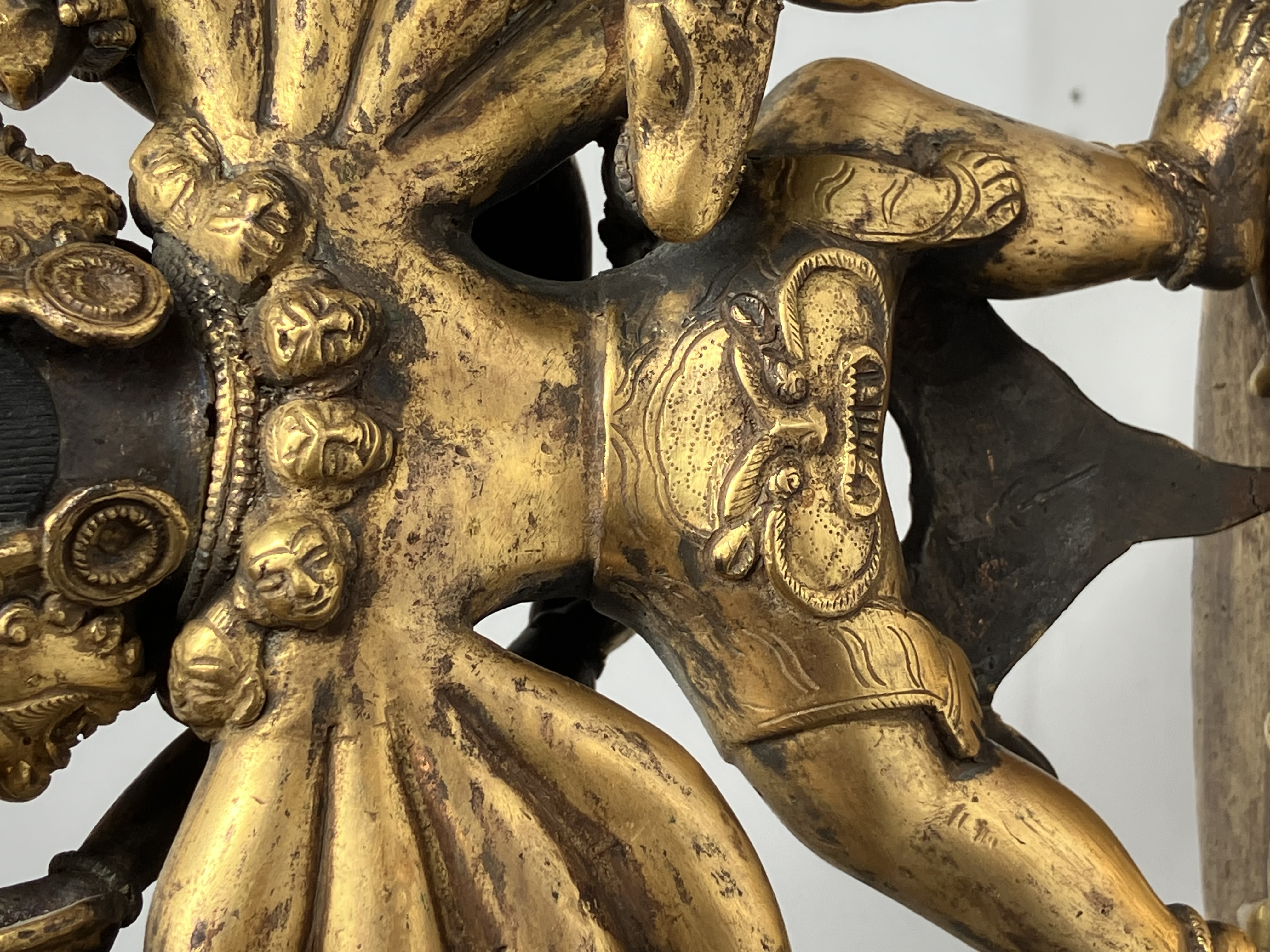 胜乐金刚佛造像。这尊佛造像整体铸造工艺精湛。整体鎏金完整,璎珞服饰及雕刻工艺精美。胜乐金刚是藏传佛教无上瑜伽本尊,被视为三世诸佛,也是藏密五大本尊之一。在密宗修行中尊称为“母续之王”。这尊佛像属藏区工艺风格,有供养和收藏价值。