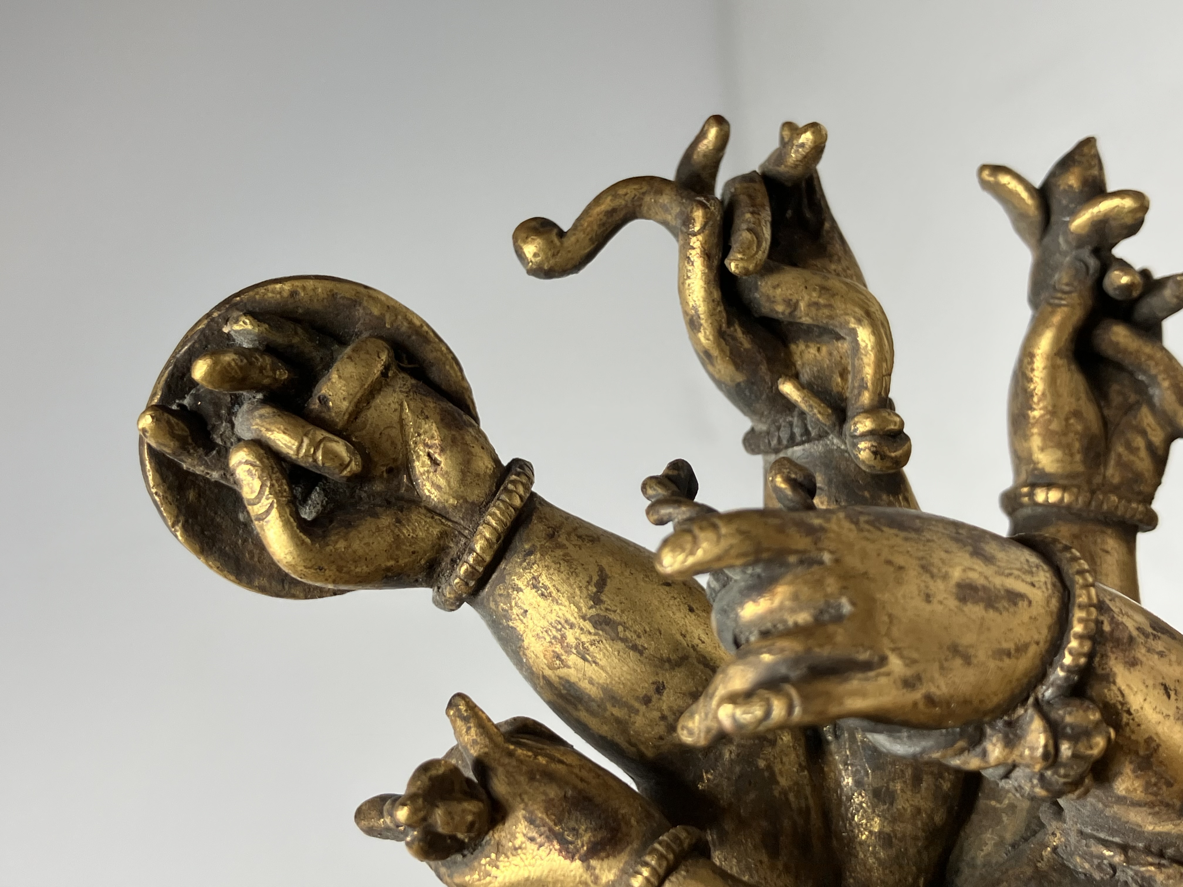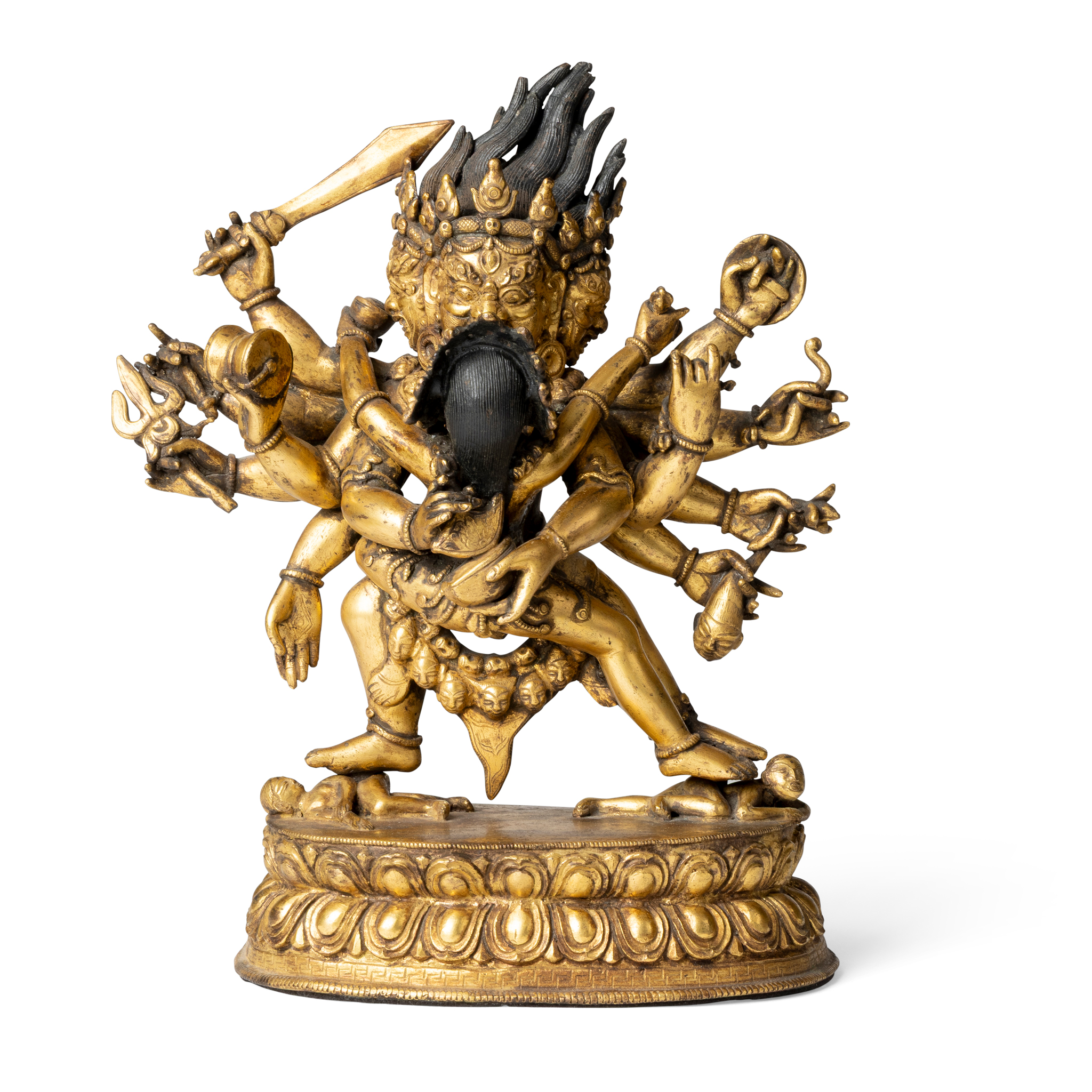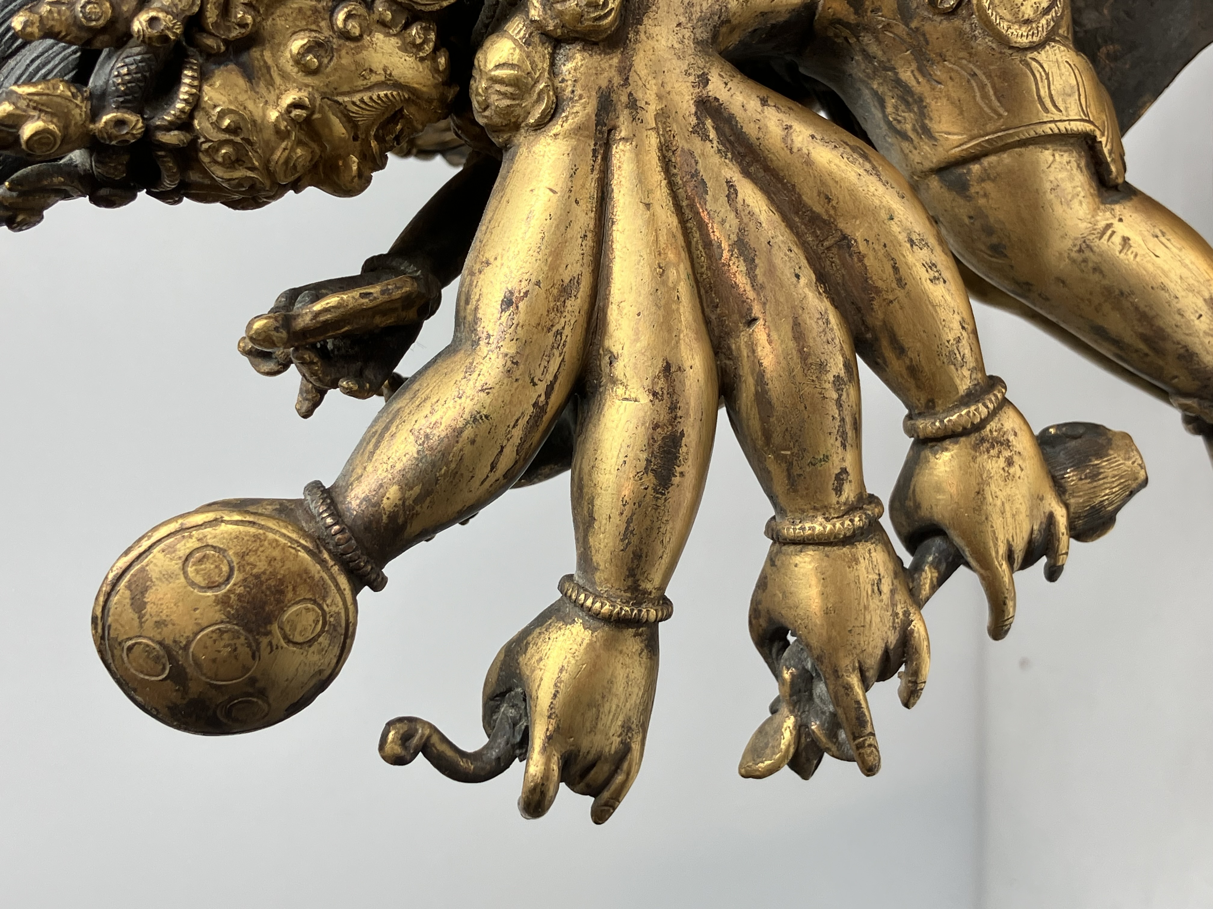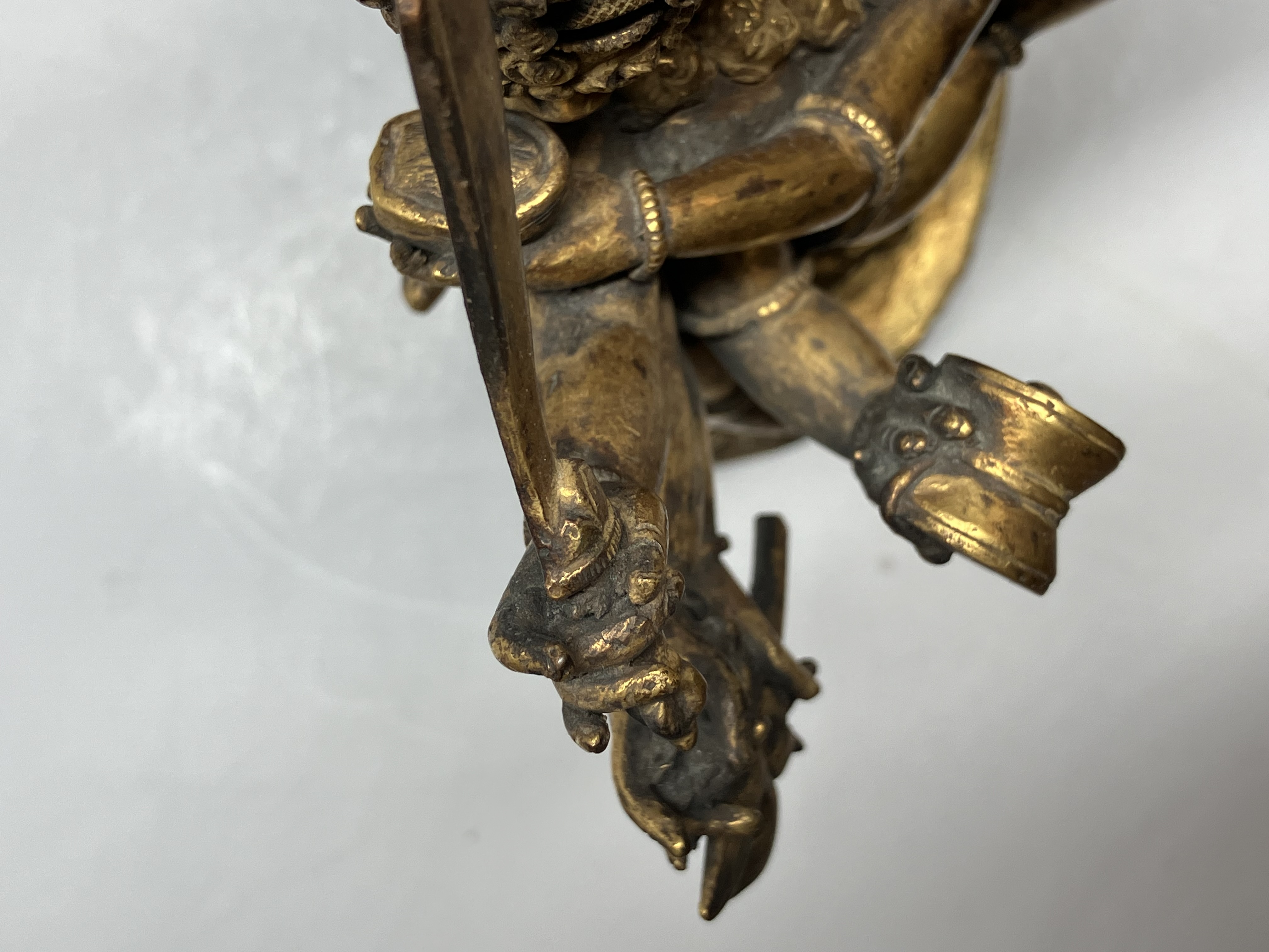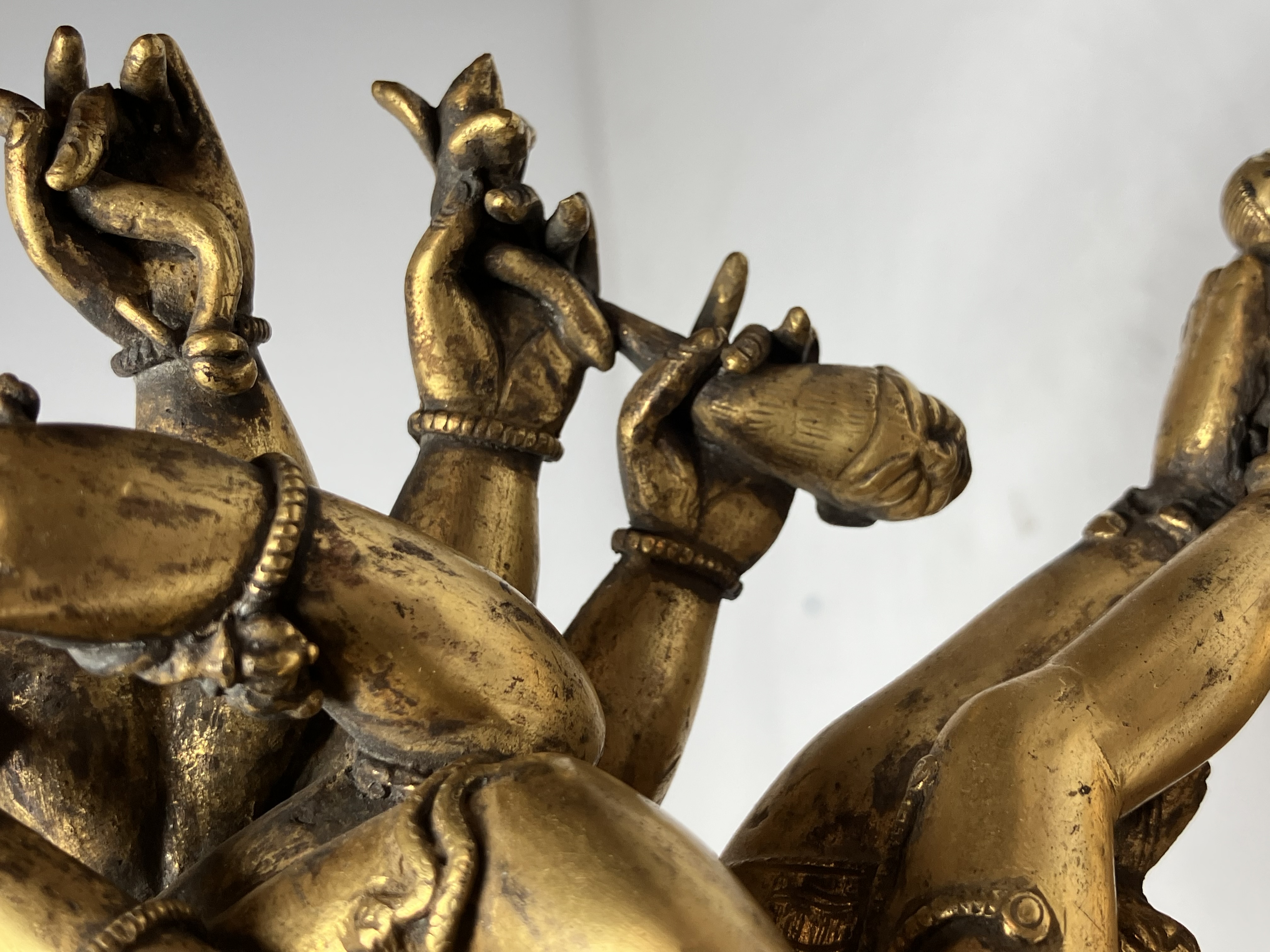 胜乐金刚佛造像。这尊佛造像整体铸造工艺精湛。整体鎏金完整,璎珞服饰及雕刻工艺精美。胜乐金刚是藏传佛教无上瑜伽本尊,被视为三世诸佛,也是藏密五大本尊之一。在密宗修行中尊称为“母续之王”。这尊佛像属藏区工艺风格,有供养和收藏价值。