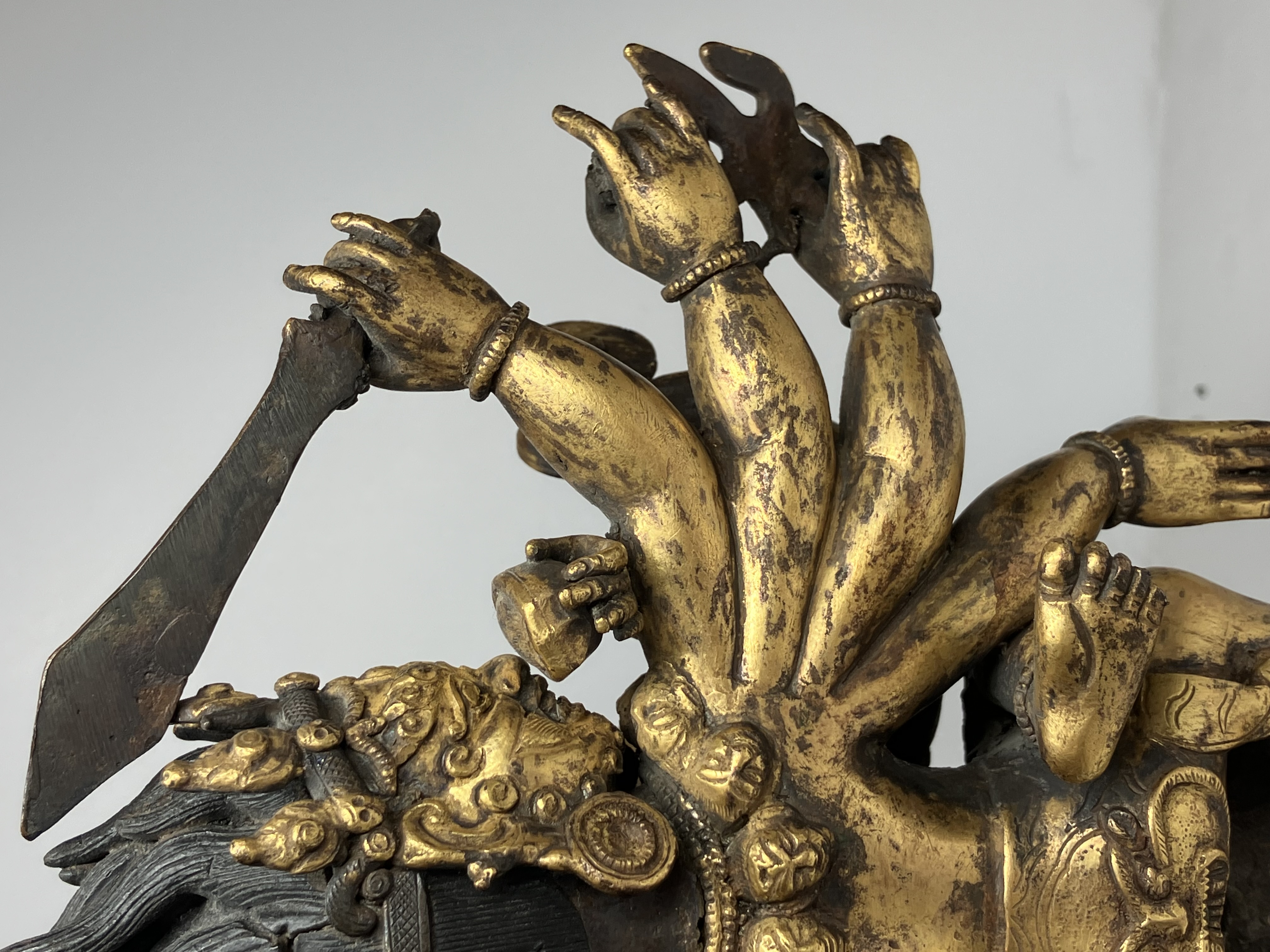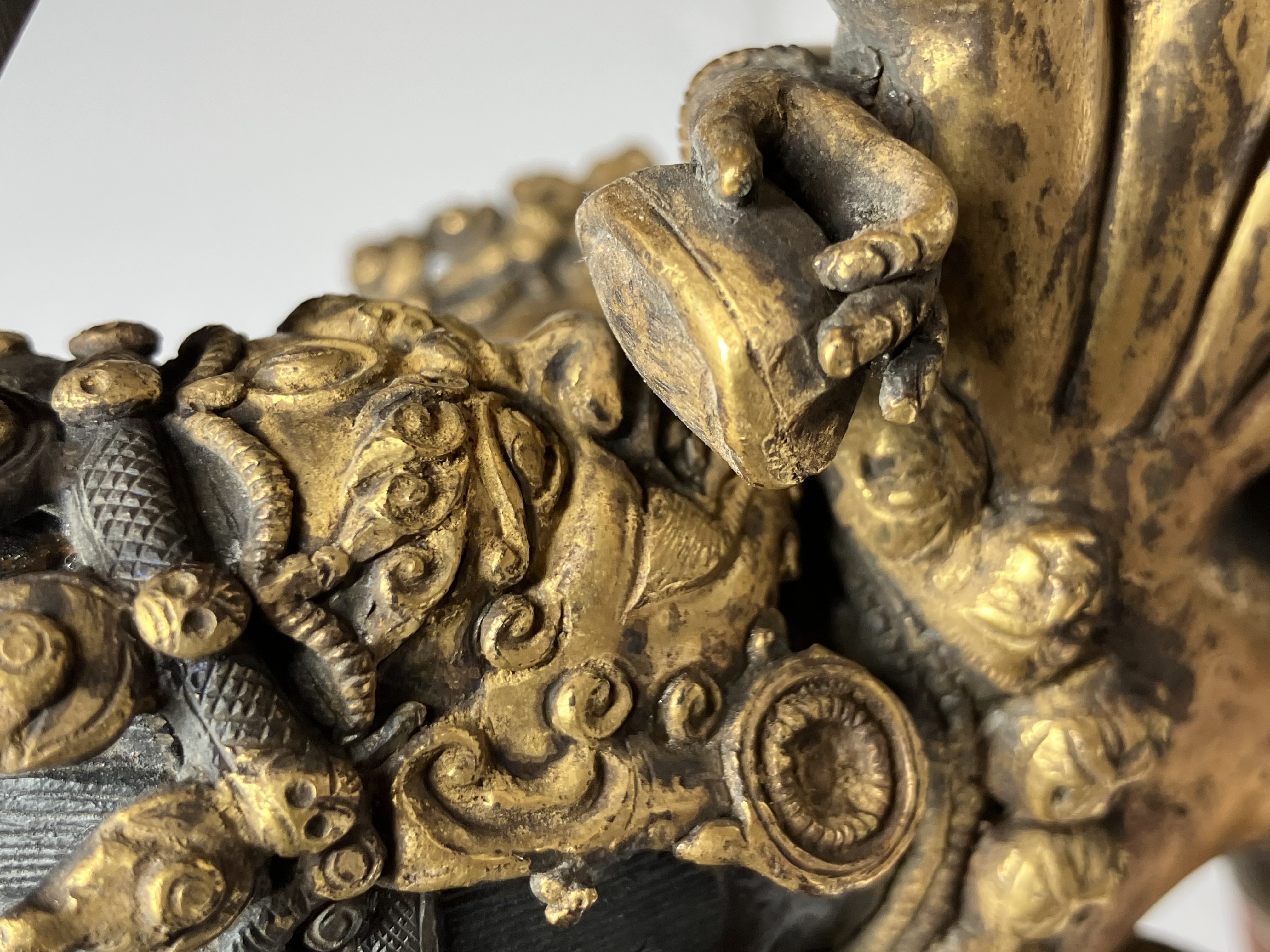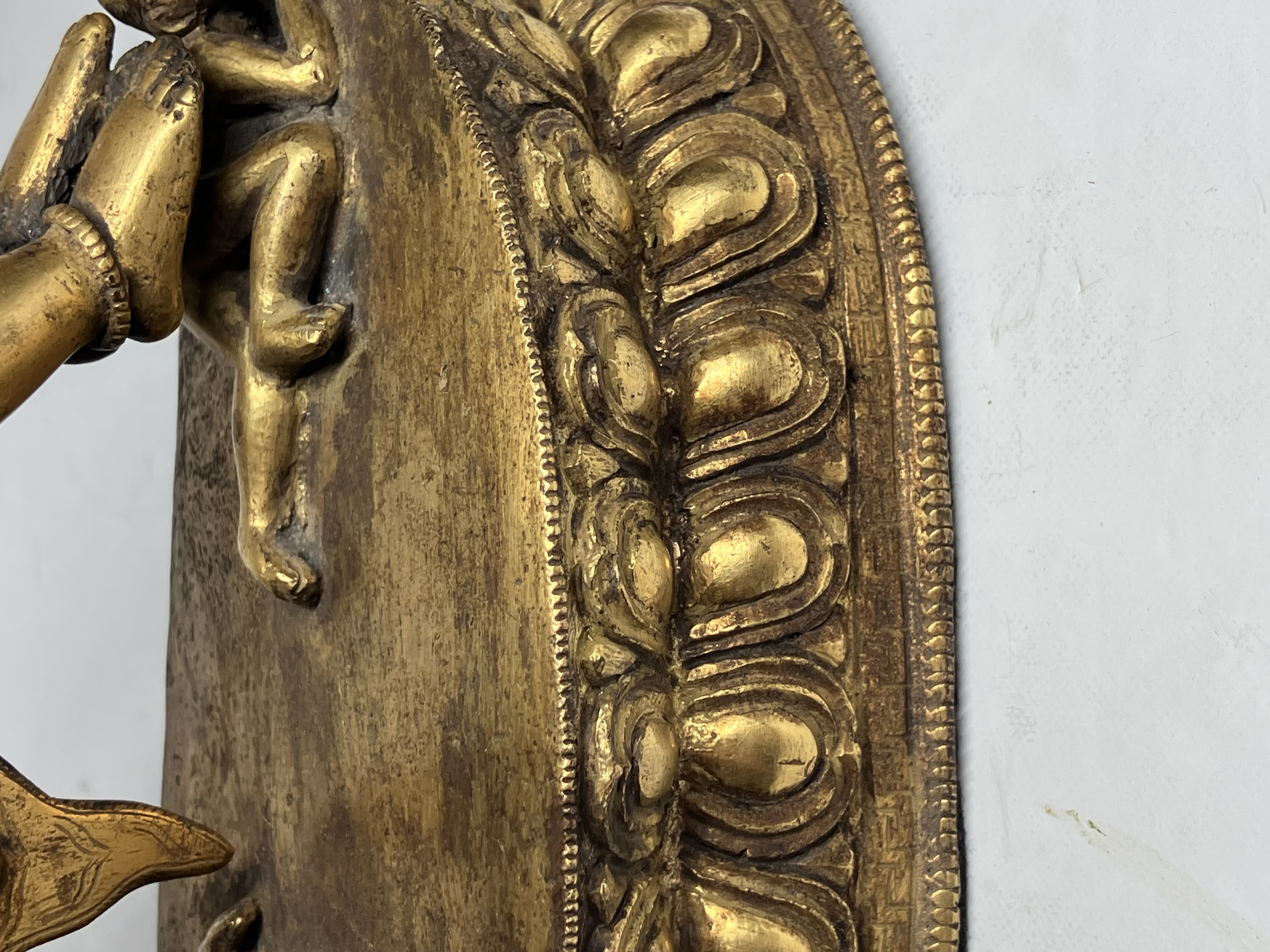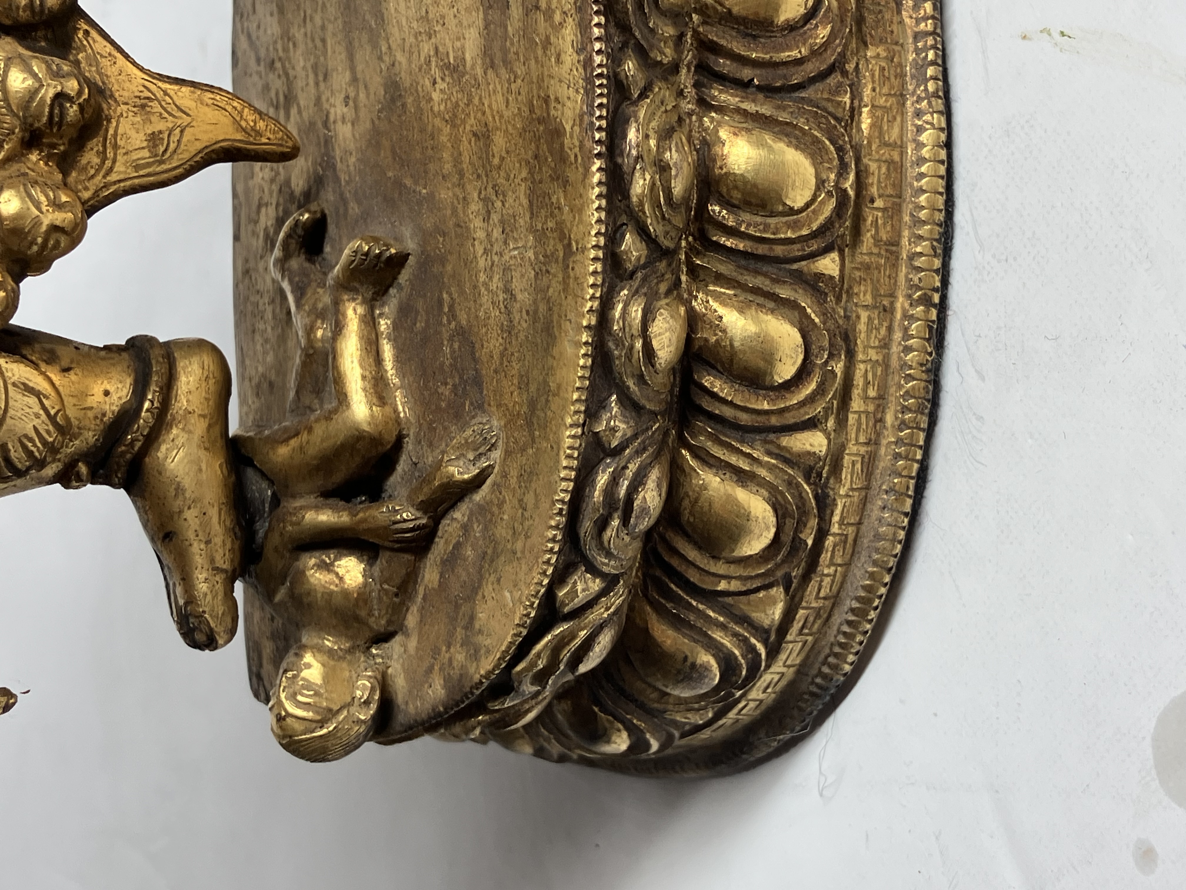 胜乐金刚佛造像。这尊佛造像整体铸造工艺精湛。整体鎏金完整,璎珞服饰及雕刻工艺精美。胜乐金刚是藏传佛教无上瑜伽本尊,被视为三世诸佛,也是藏密五大本尊之一。在密宗修行中尊称为“母续之王”。这尊佛像属藏区工艺风格,有供养和收藏价值。