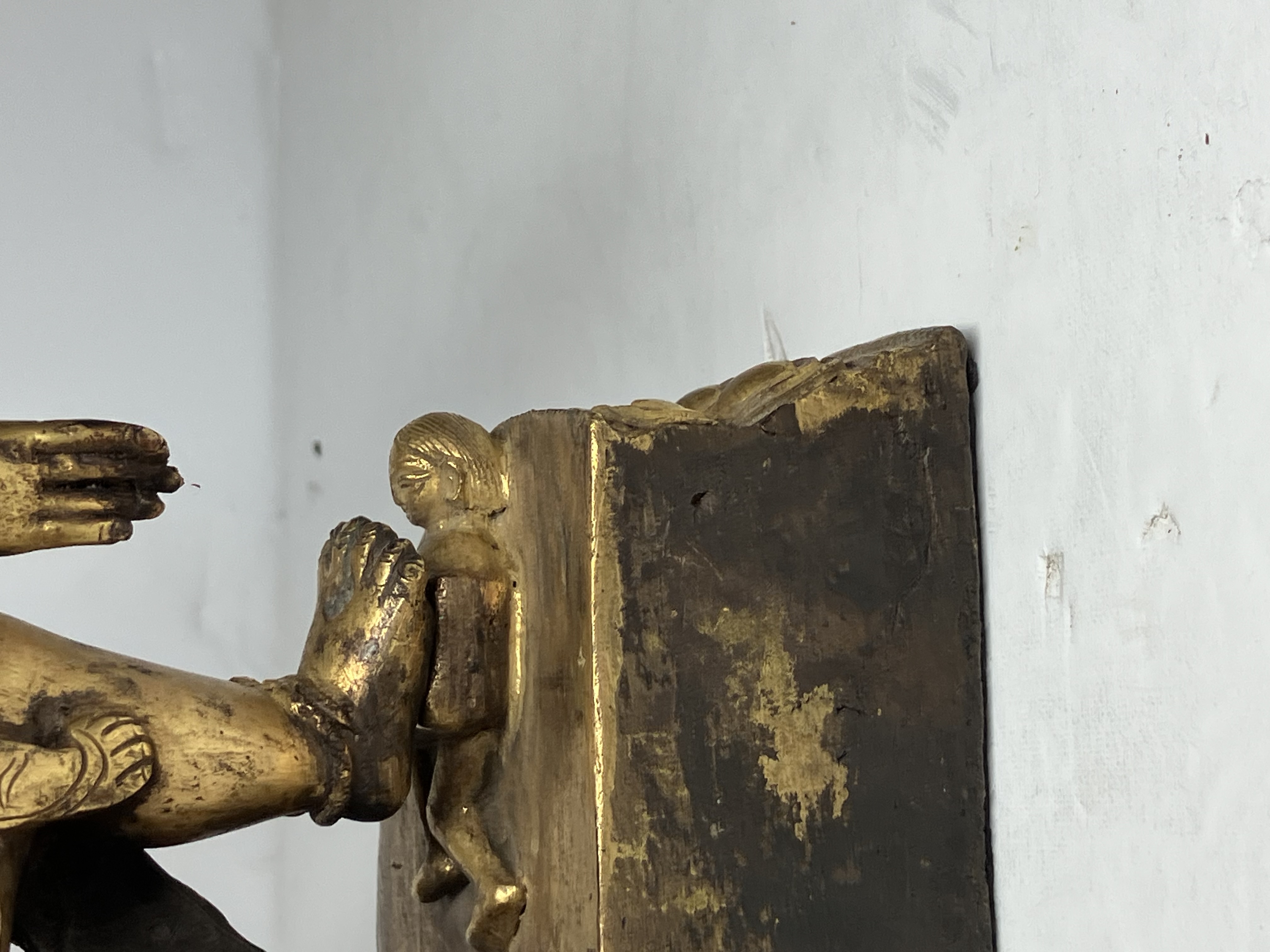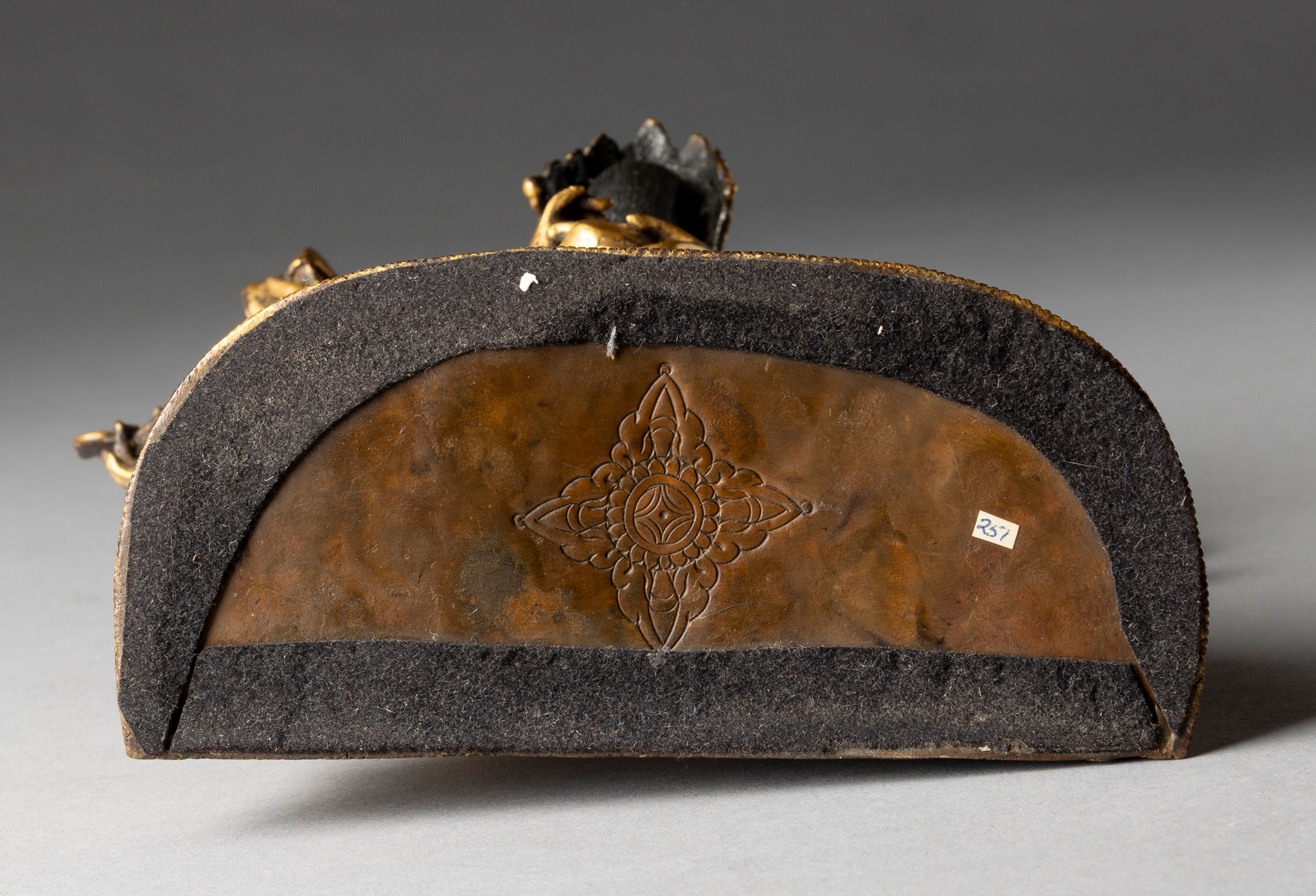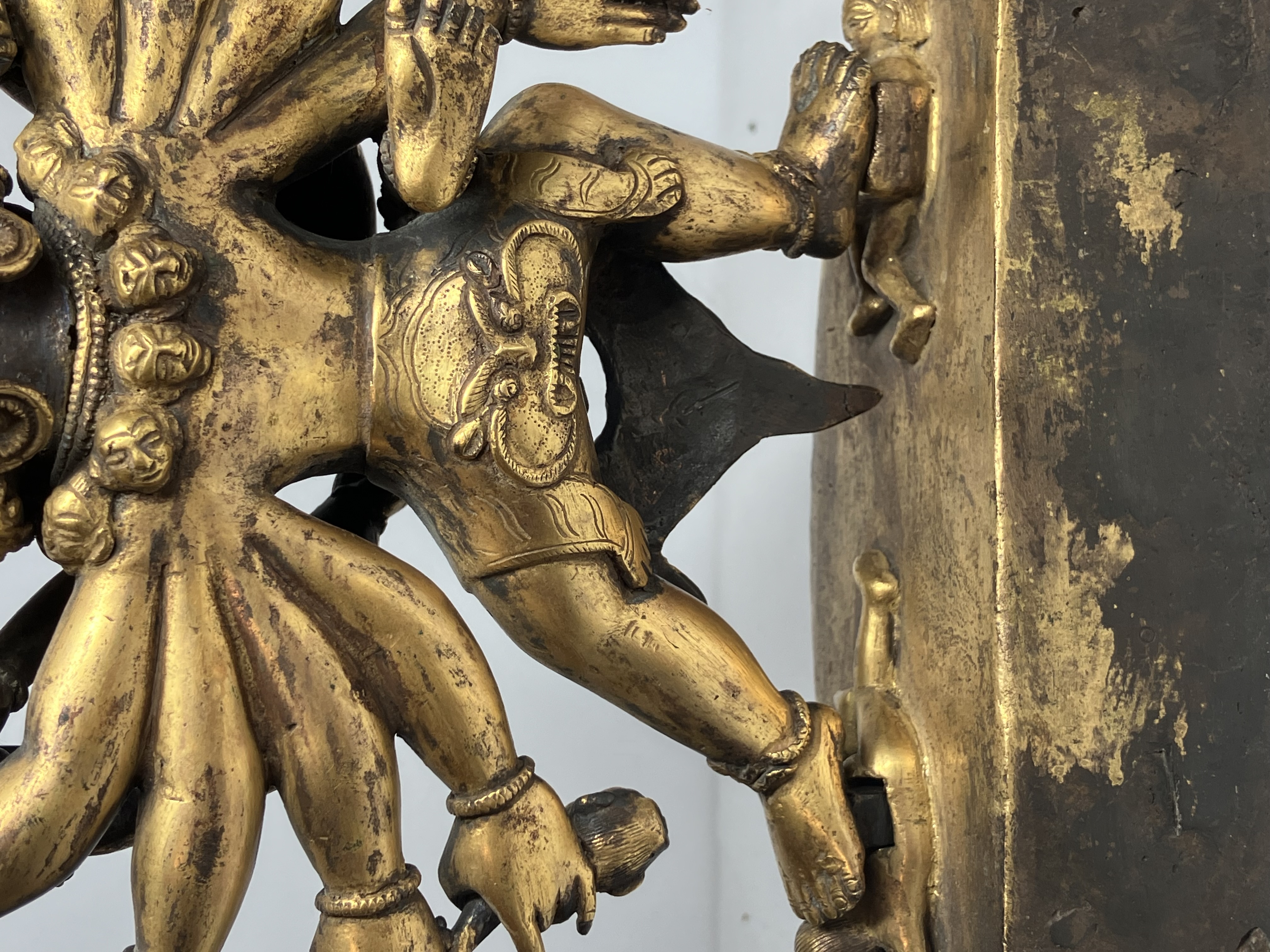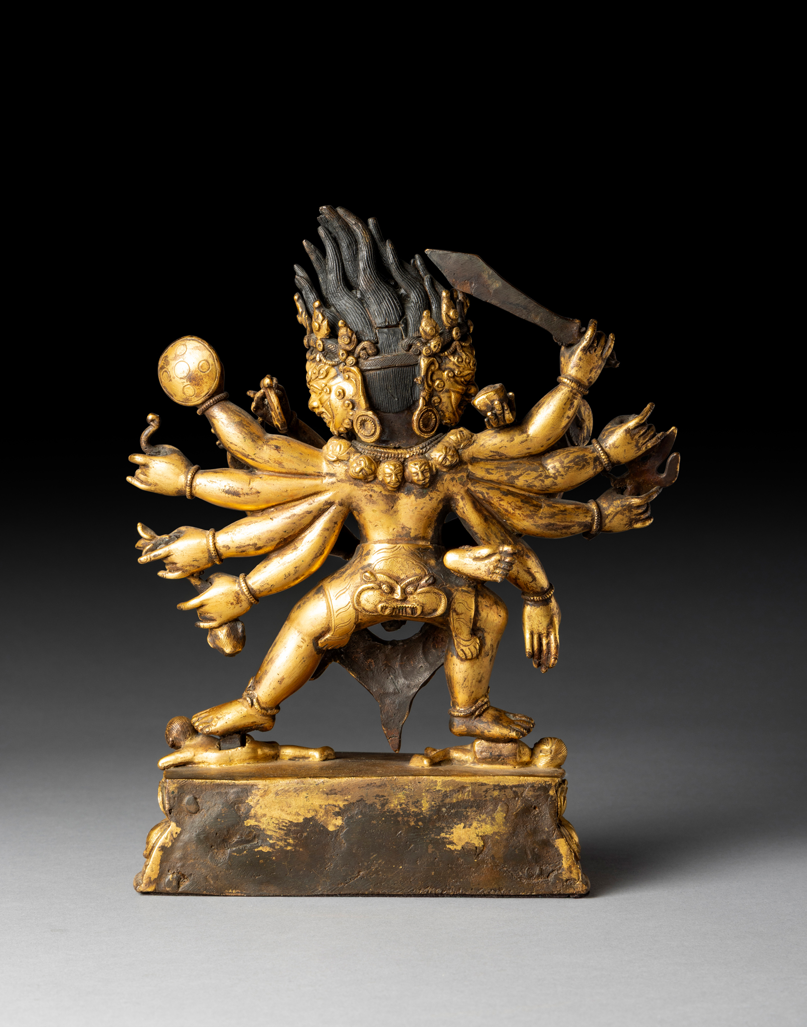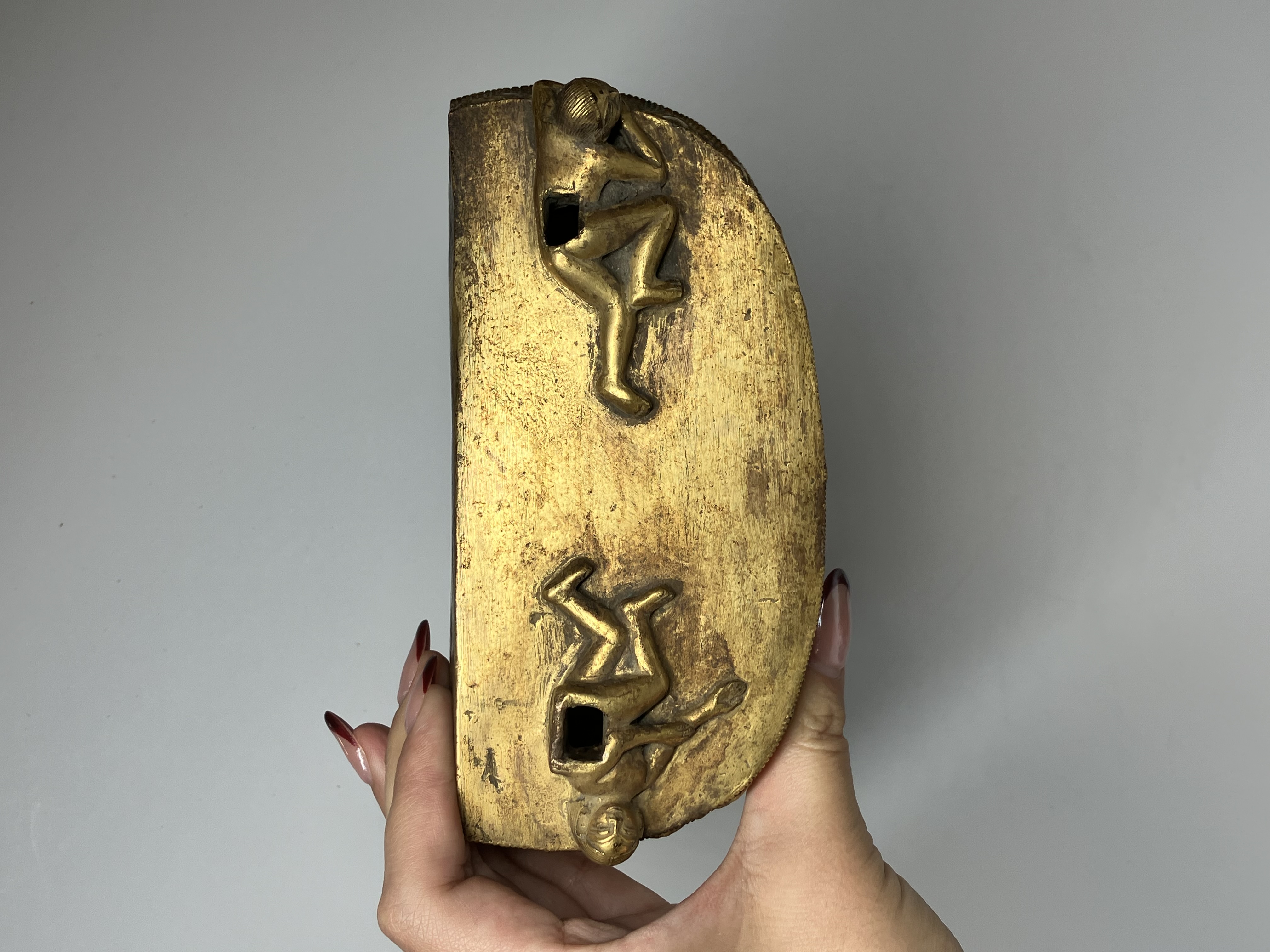 胜乐金刚佛造像。这尊佛造像整体铸造工艺精湛。整体鎏金完整,璎珞服饰及雕刻工艺精美。胜乐金刚是藏传佛教无上瑜伽本尊,被视为三世诸佛,也是藏密五大本尊之一。在密宗修行中尊称为“母续之王”。这尊佛像属藏区工艺风格,有供养和收藏价值。