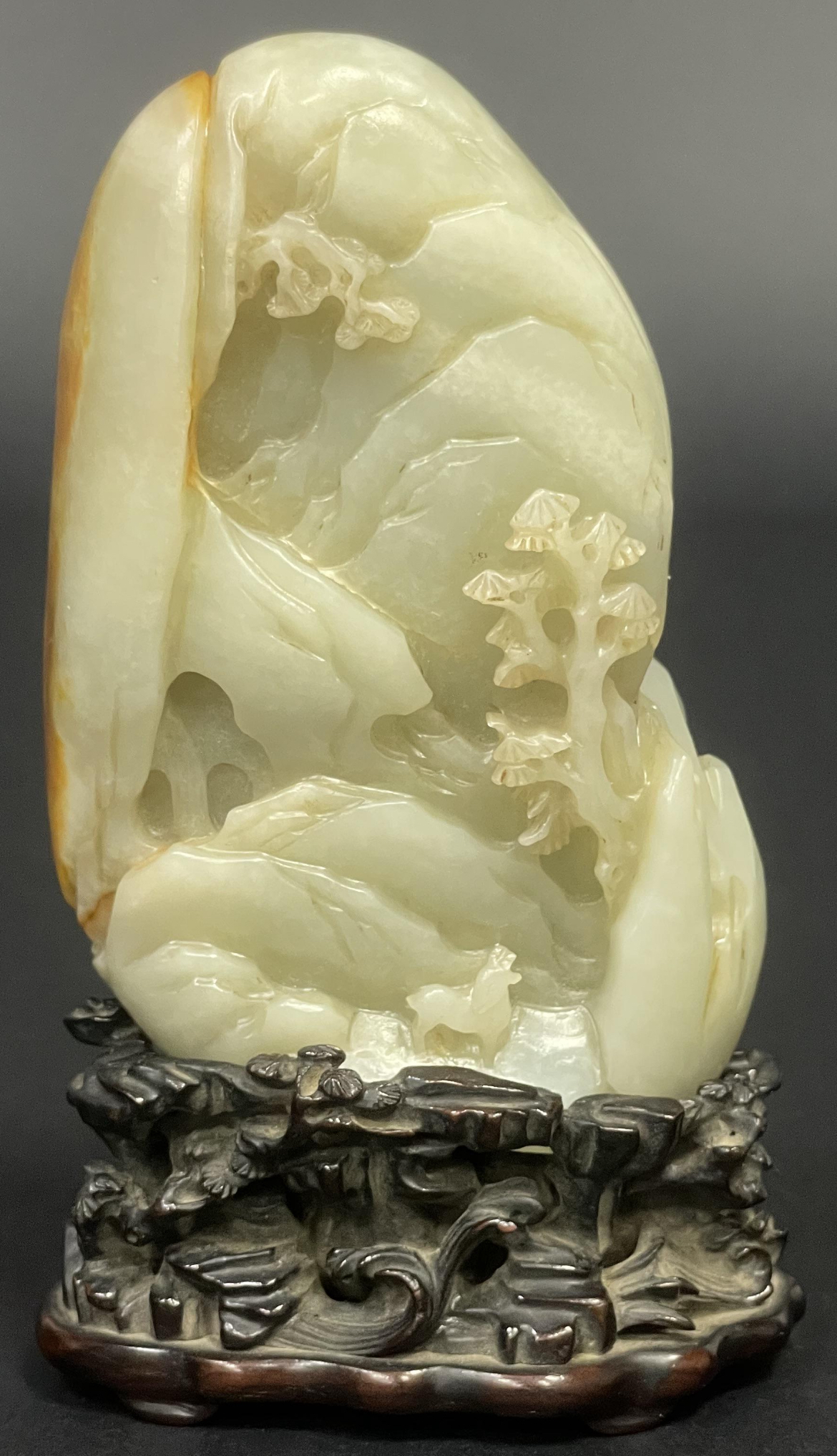 藏友你好,您发来的这个山子摆件,整体采用和田材质,镂空雕刻了山石树木,古装人物骑马打猎,属于清代风格,但是看图阴刻线条拘谨,表面打磨稍显油腻,应该属于近几十年雕刻,市场价值一般,根据自己喜好酌情考虑。就图而言仅代表个人观点,供参考。