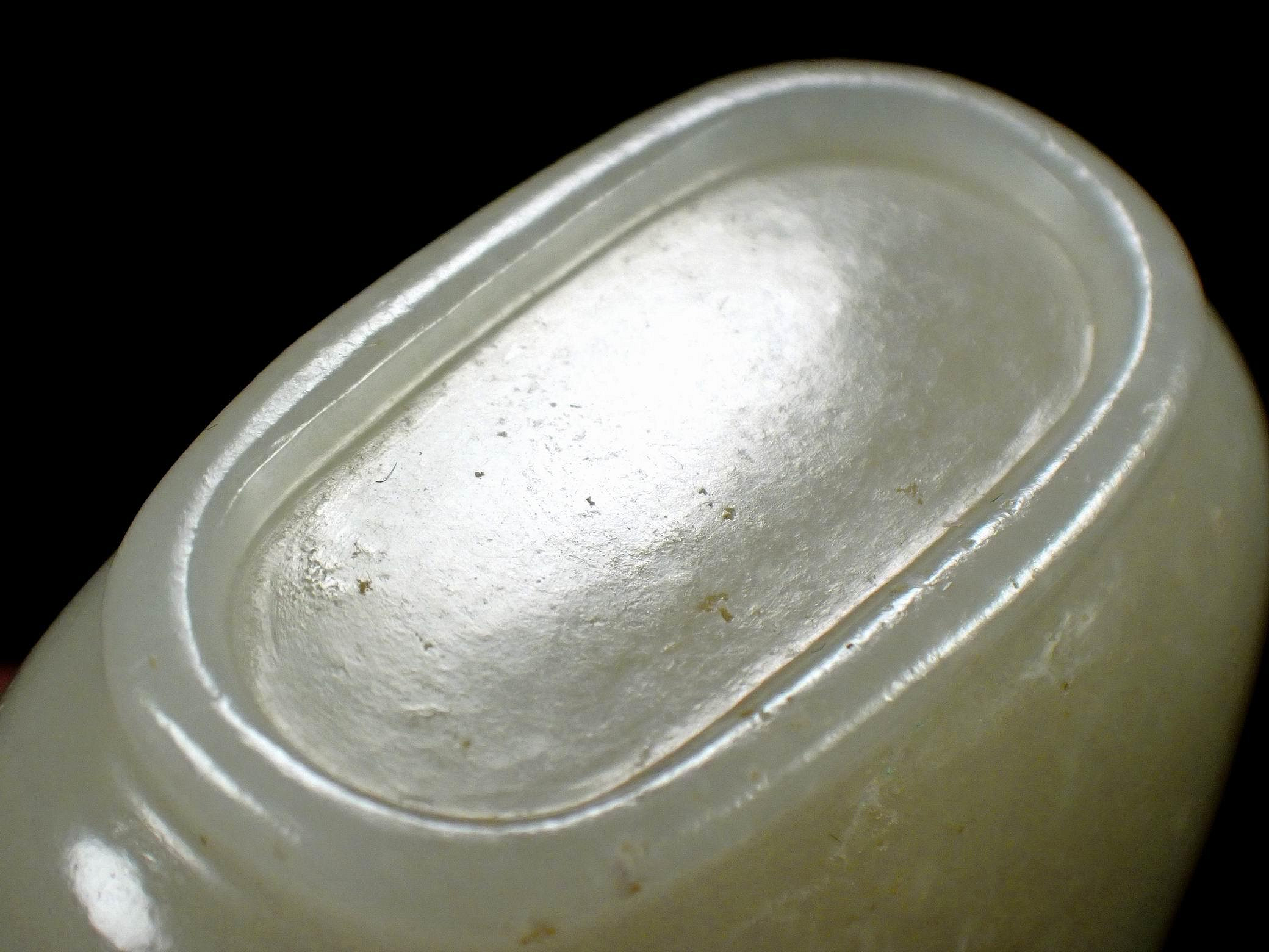 这是清晚期的鼻烟壶,青玉质,杂质较多,红皮色非原色,应为人工染色仿皮色。