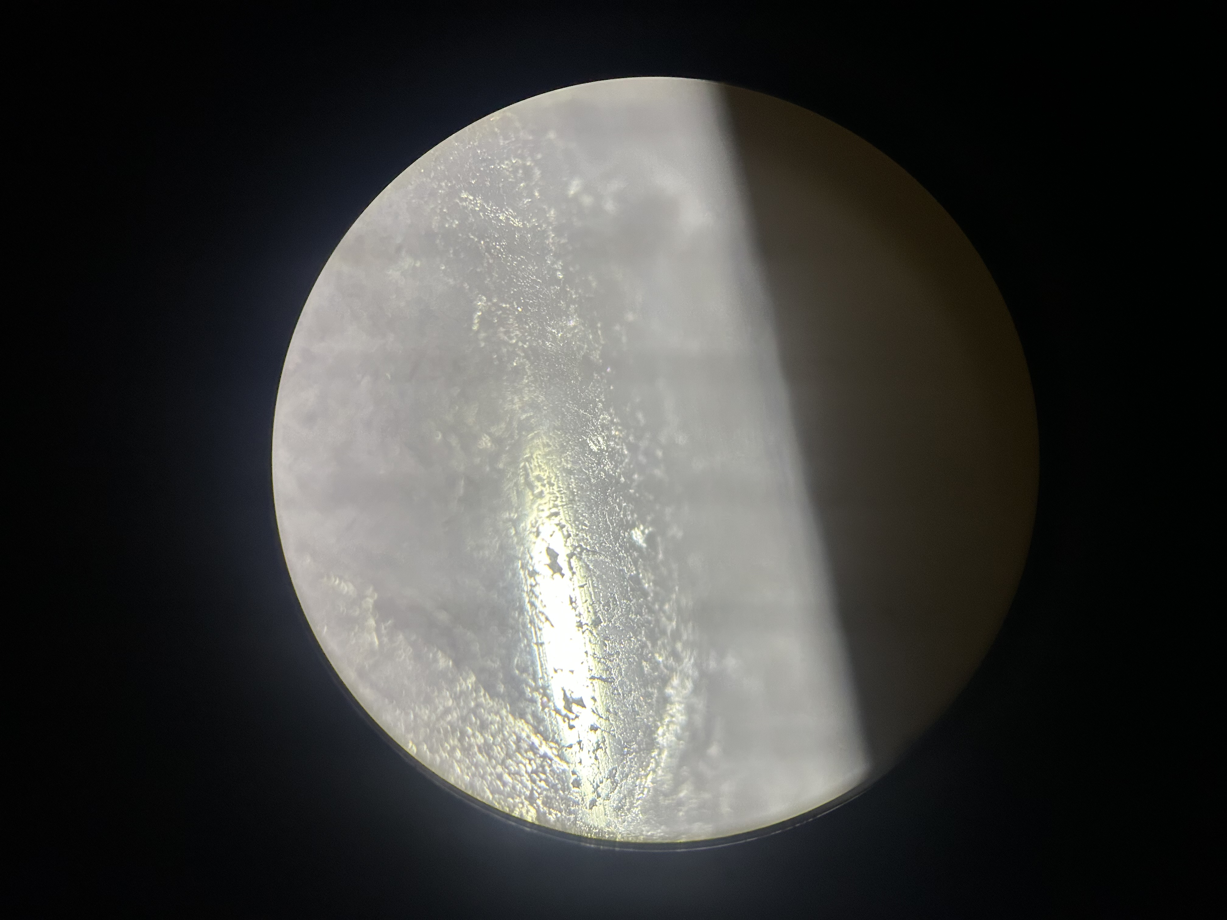 此手镯为天然石英岩质玉,无人工上色、充填处理,色泽为材质天然白色调。50倍镜下的长条形打磨痕是当代机械加工痕迹,自然磨损痕为后期使用形成,结合工艺与磨损特征,判定为近现代制品。该石英岩质玉手镯属大众饰品,市场参考价数百元(依品相、尺寸略有浮动),与翡翠(硬玉)成分、质地有明显区别。 另外,拍摄此类翡翠或石英岩玉件时,无需打灯、拍微距,只需在自然光下用手拿着拍摄清晰细图即可,这样能更真实呈现器物的材质与色泽。